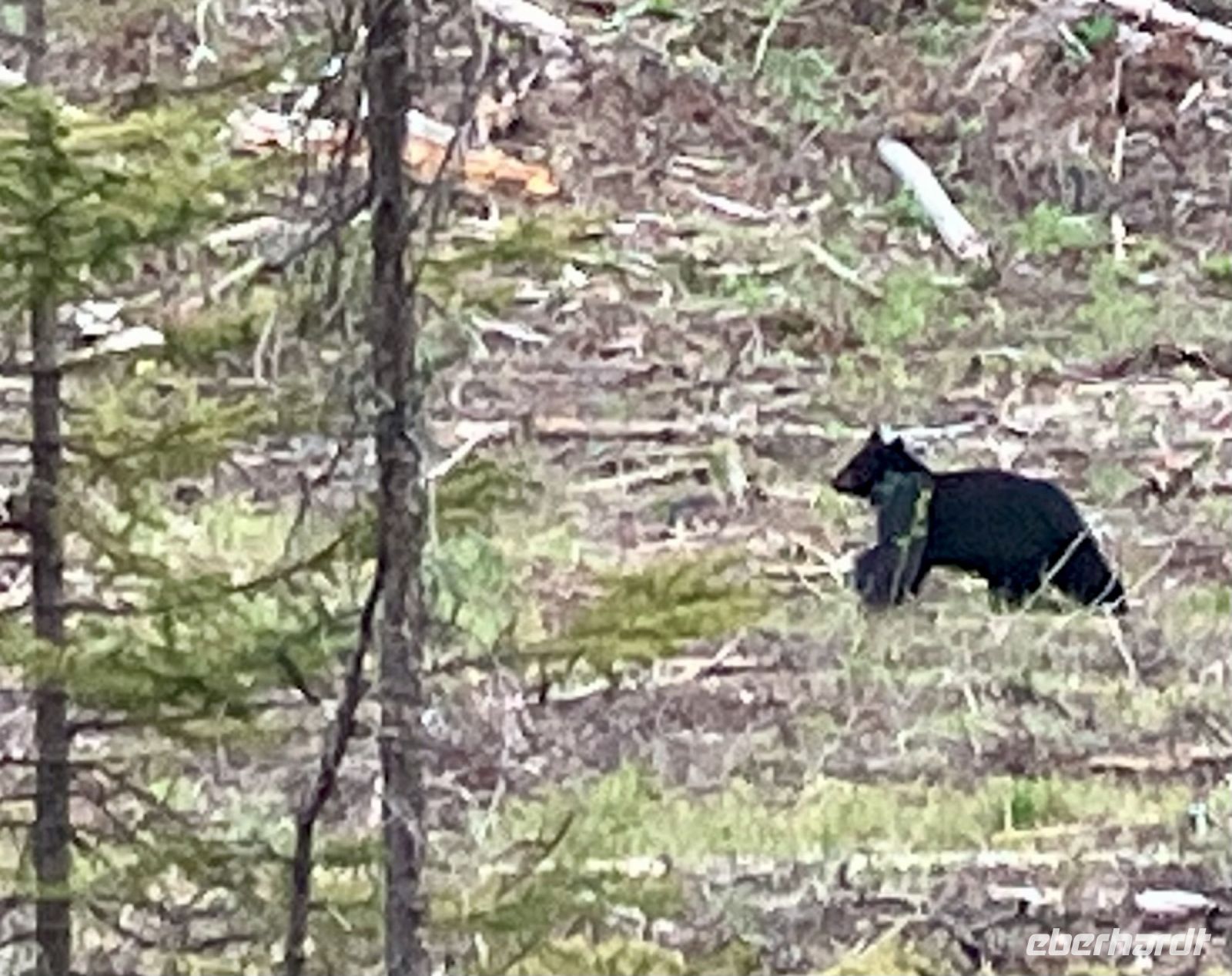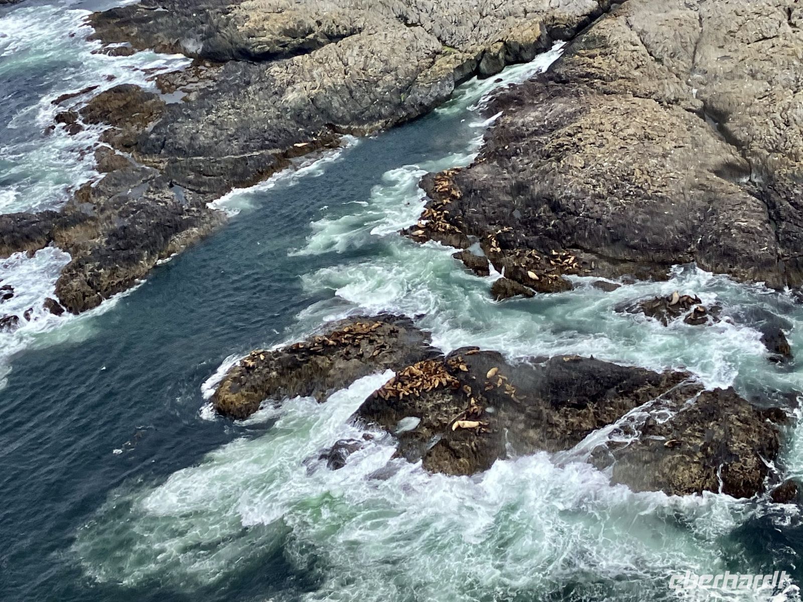Wieder zurueck in Tofino, gibts jetzt etwas Freizeit und einige haben sich entschieden eine tolle Fahrt mit einem Zodiak auf Baerenbeobachtung zu buchen. Rasant kurven sie um die Inselchen herum, gekleidet in dicke, warme, rote Ueberzuege. Ganz nahe, am Strand, sehen sie auch einen Baer, wie er gerade grosse Steine, fast kleine Felsen rollt, damit die Muscheln und kleinen Garnelen erreichbar werden. Ein anderer Baer, zeigt sich er ist pechschwarz und rennt dem Strand entlang. Aber auch Adler, Seehunde und Seeloewen gegluecken die Gruppe.