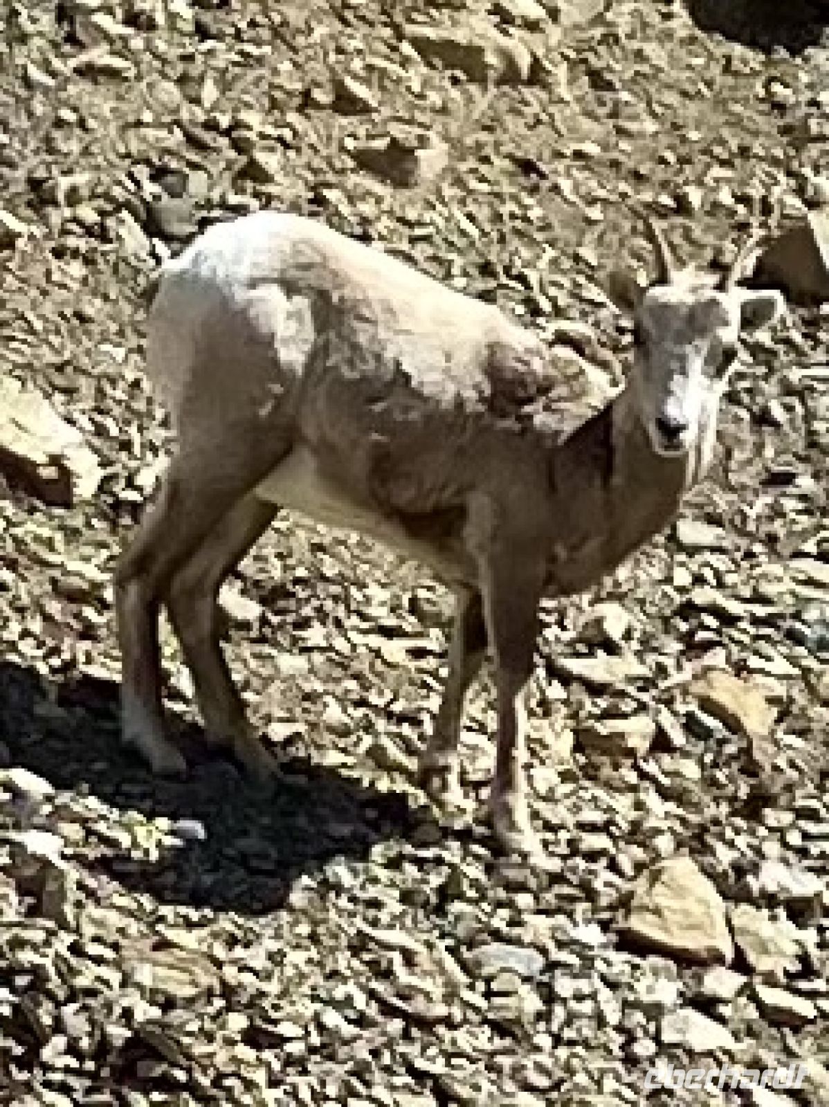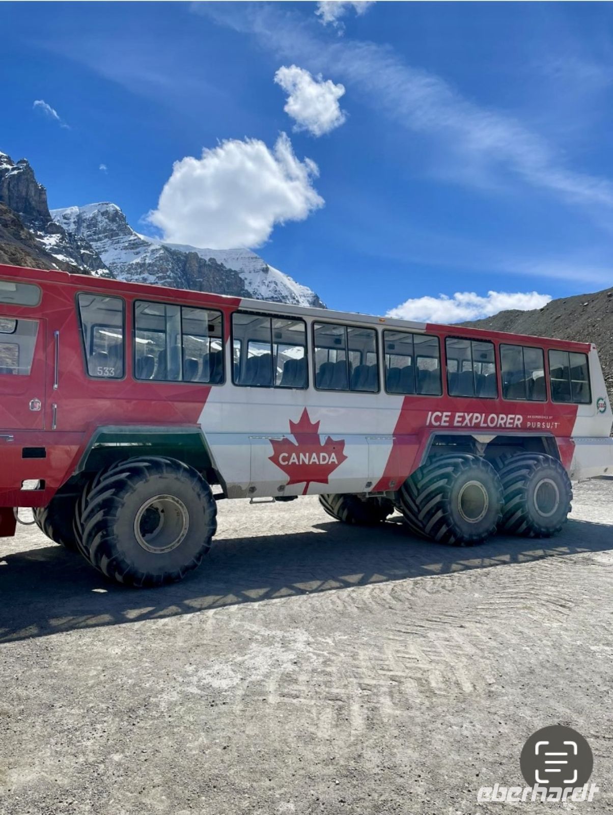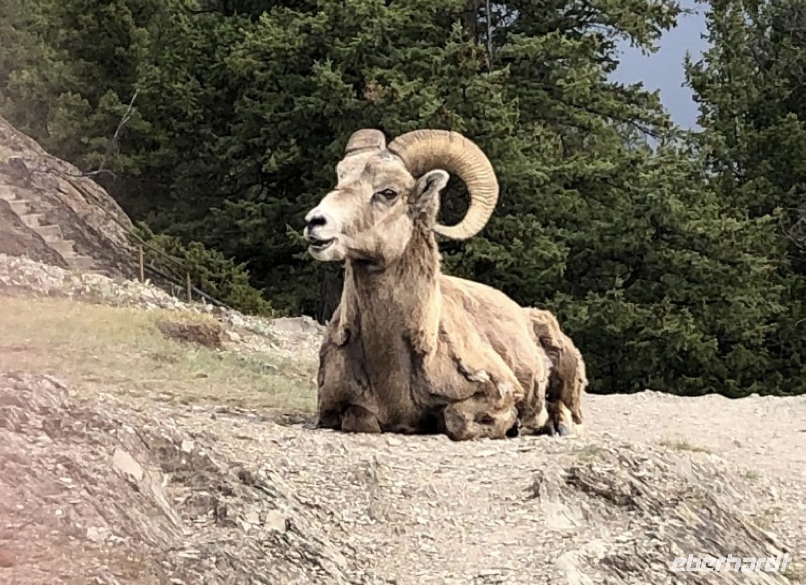 Es scheint die Sonne wieder, oh wie schoen sind in der Frueh die Berge beleuchtet und der rosa Himmel passt wunderbar dazu. Nach dem Schlemmer-Fruehstueck fahren wir mit beladenem Bus nach Lake Louise. Diesen See mit seinem eigenen Schlosshotel, Chateau Lake Louise, wollen wir gebuehrend geniessen. Es ist noch frueh, also sind kaum Touristen da. Wir spazieren dem Ufer entlang, reden, geniessen die Aussicht und sind einfach froh, dass es uns so gut geht. Ein Blick ins Hotel spaeter, sitzen wir wieder im Bus und fahren auf der beruehmten Gletscher-Strasse in Richtung Jasper. Alle Berge sind weiss gepudert, der Himmel ist blau mit einigen Photowolken verziert, die Sonne strahlt dahinter hervor und wir bewundern einfach diese gigantische Bergwelt. Es gibt viele Anekdoten und Geschichten zu den Bergen, Seen und Gletscher. Wir halten auch beim Crowfoot Glacier, und beim Bow See an. Beim Howse Lookout gibts dann die grosse Ueberraschung fuer unser heutiges Geburtstagskind. Mit schoenem Prosecco, leckeren Chips und vielen Geschenken, Versen und Gesang wird hier mit herrlicher Aussicht gefeiert. Schoen ist es mit einer liebevollen Gruppe gemeinsam Kanada kennenzulernen. Bei Saskatchewan River Crossing essen wir dann noch ein kleines Mittagessen ehe wir uns wieder auf der Parkstrasse Richtung Columbia Eisfeld befinden. Wir haben heute noch was tolles vor. Wir fahren mit dem Eis-Cruiser auf den Athabasca Gletscher. Auch wieder ein schoener Ausflug mit angenehmer Temperatur wobei wir doch auf tausend Jahre altem Eis stehen. In der Nacht war es hier wohl unter Null, denn die kleinen Baeche mit dem Verjuengungs-wasserl sind alle eingefroren. Ob das gecrushte Eis wohl auch hilft ? Auf dem Weg zurueck zu unserem Bus, sehen wir auf der Anhoehe gleich 4 Krummhornschafe. Es sind alles Weibchen ohne das toll gerollte Horn aber sie legen gerade ihr Winterfell ab und schauen etwas zottelig aus.
