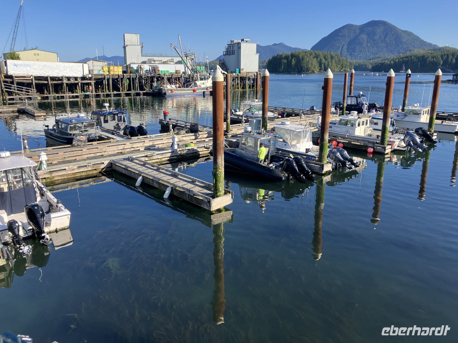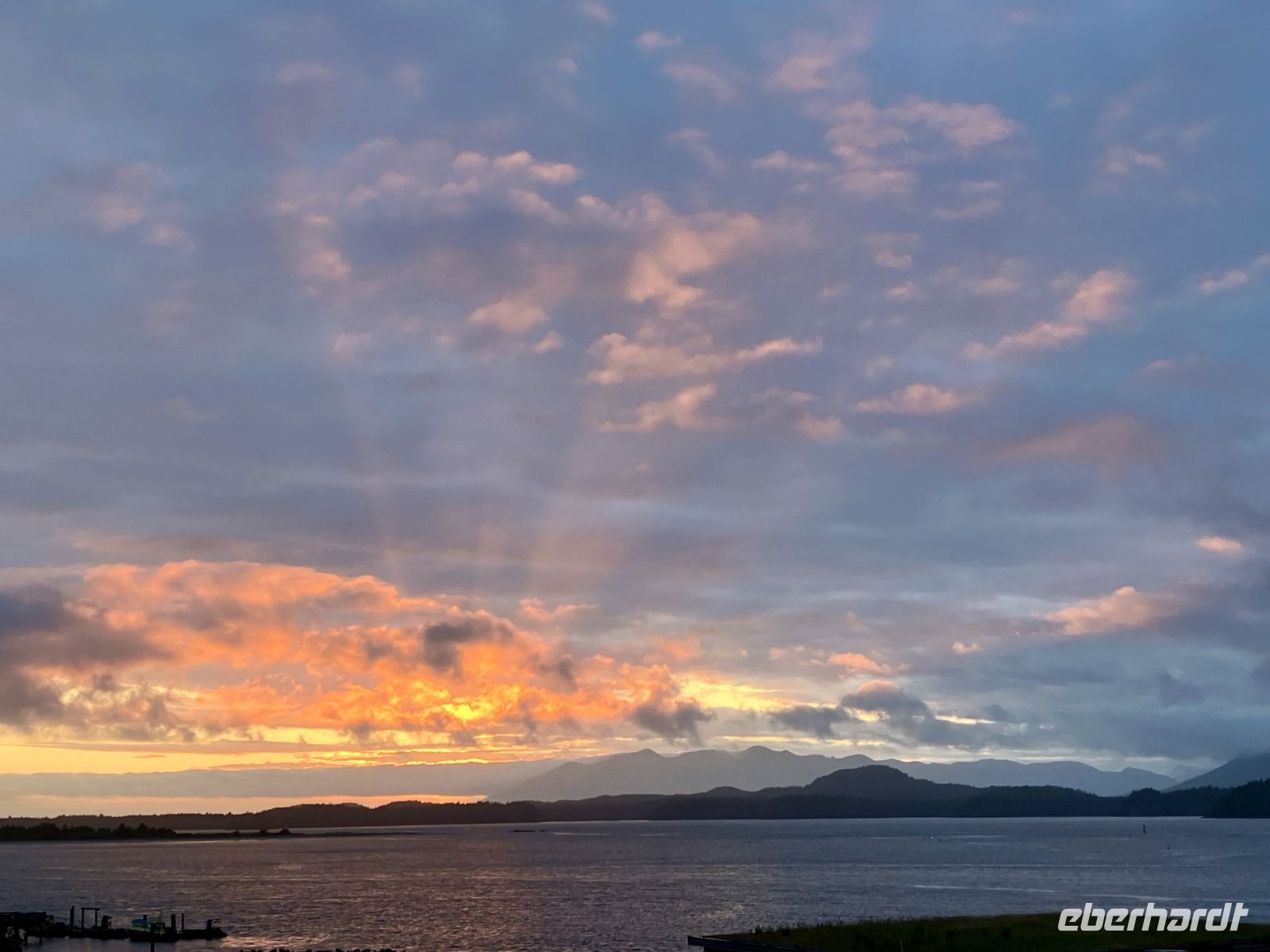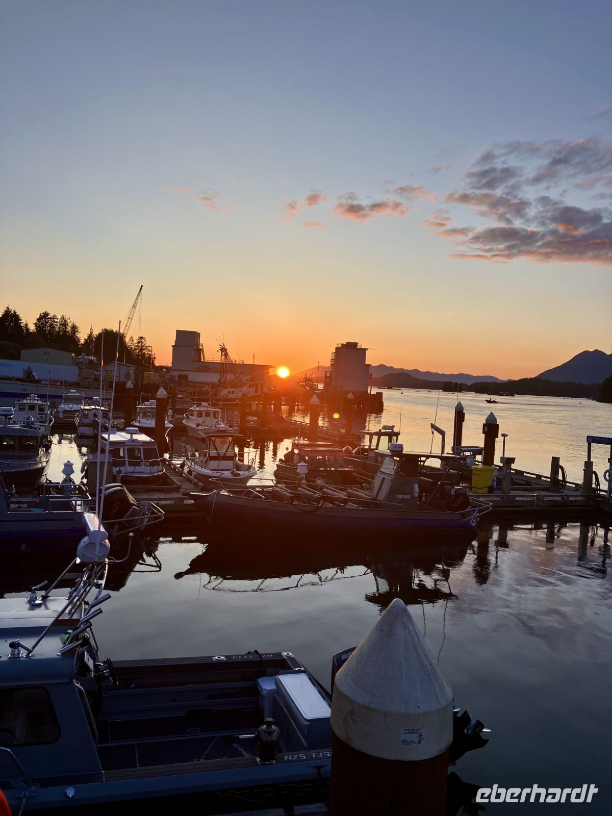 Am Abend um 19:30 treffen wir uns allesamt wieder zum Abendessen. Wir sitzen wunderschoen in diesem noblen Restaurant. Es ist am Wasser gelegen, mit Sicht auf den Sonnenuntergang in einem kleinen Hafen. Das Essen ist vorzueglich und die Bedienung wieder so nett. Hier in Tofino schlaeft man einfach super. Was fuer Tag, so ein Tag der sollte nie vergehen. Das Rauschen des Ozeans begleitet uns in die Traumwelt des Schlafes.