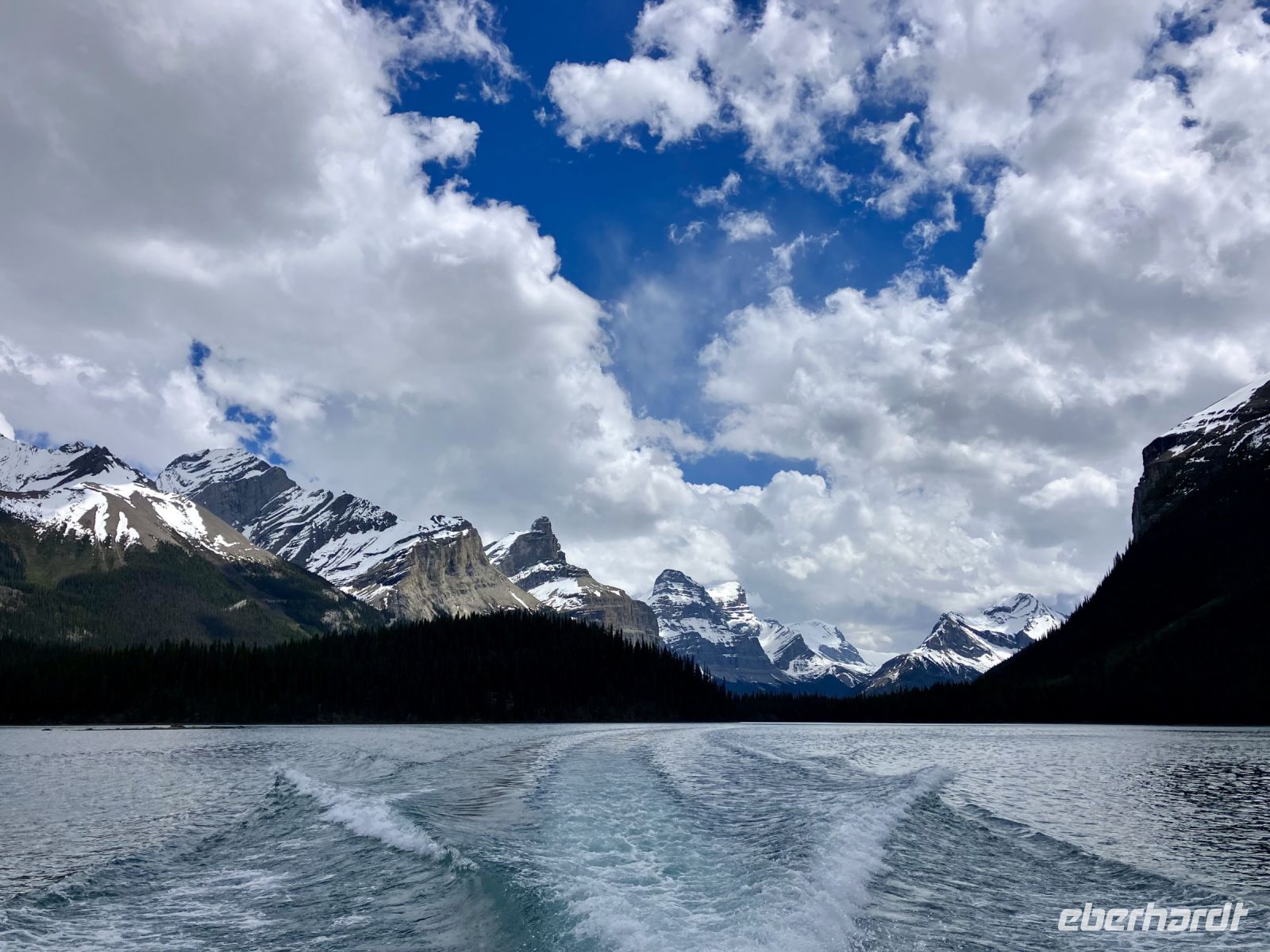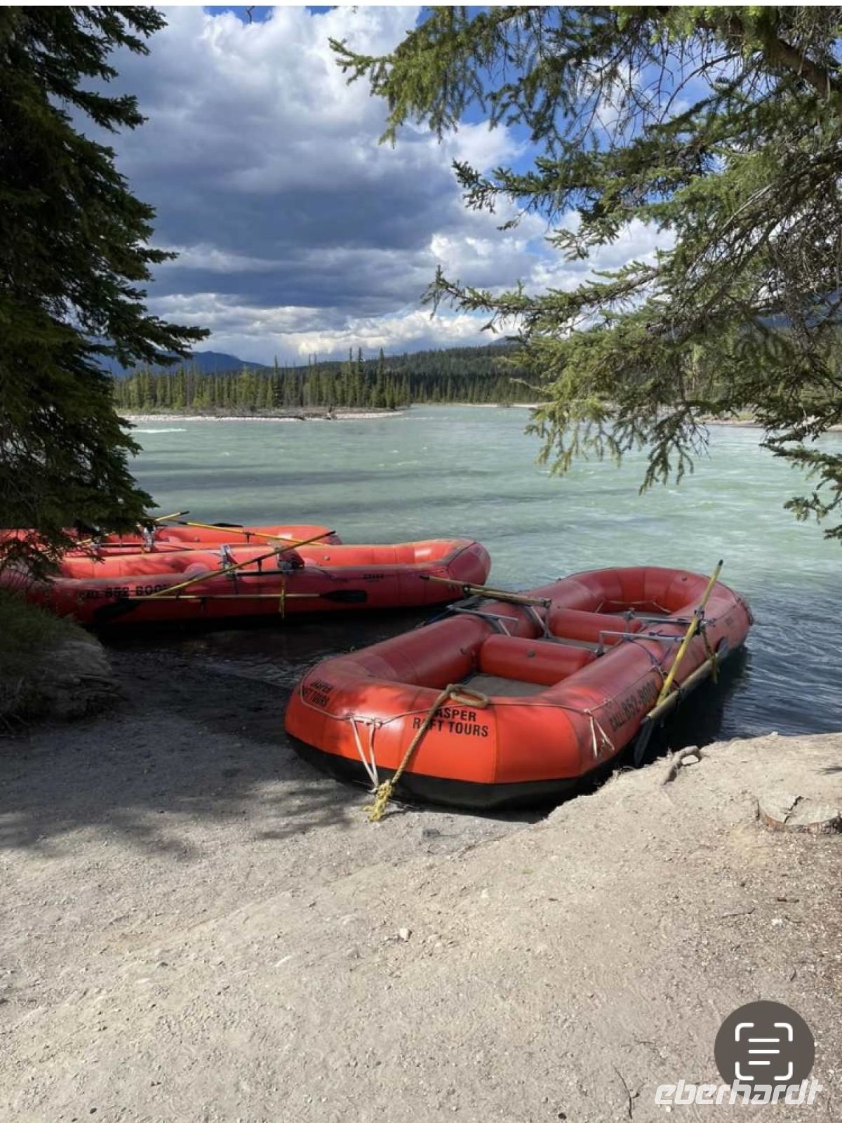 Weiter gehts zum Maligne See. Ach ja, der Weisskopfadler sitzt wieder in seinem grossen Nest und bruetet. Der Ehepartner ist nicht zu sehen und wir versuchen ein schoenes Foto zu ergattern. Bei Maligne See angekommen machen wir nun Mittagspause damit wir um 13:45 aufs Schiff gehen koennen. In einem voll beladenen Boot fahren 3/4 Stunde hinaus bis wir nicht bei der weltberuehmten Spirit Island anlegen. Wie wunderbar, alles spielt mit, umgeben von lieben Reisefreunden knipsen wir fleissig Fotos voneinander und von der herrlichen Berg und See Landschaft. Das Wasser ist hier tuerkisfarben und der See ist umgeben von riesigen allein stehenden Bergen die fast wie Throne ausschauen. Die kleine Halbinsel sitzt posierlich im Vordergrund des Bildes. Der Himmel ist mit Wolken durchzogen und das Blau blitzt dazwischen hervor. Postkartenmaessig. Gluecklich fahren wir wieder zurueck zur Landebucht, machen nochmals kurz eine Pause und fahren danach Richtung Jasper. Jetzt aber schnell unser Mittagsschlaefchen, denn bald sind wir bereits wieder in Jasper wo wir uns doch das Doerfchen in Ruhe anschauen wollen. Es ist viel kleiner und niedlicher als Banff. Viel natuerlicher und sportlicher. Einige unter uns nutzen diese Jasper-Zeit um eine Rafting Tour mitzumachen. Sie fahren mit einem roten Gummiboot auf dem Athabasca Fluss hinunter, bei Becker’s Chalets vorbei bis nach Jasper. Es ist ein schoenes kleines Abenteuer, denn der Wind, blaest das Boot flussaufwaerts und der Rafting-Guide muss fest den Fluss hinunter paddeln. Er ist todmuede bei Ankunft und wir, Rafter sind super gut drauf nach der schoenen Tour. Der Rest der Gruppe erwartet uns bereits beim Ziel. Sie haben unterdessen auch ganz tolle Krummhornschafe gesehen und fotografiert. Wiedervereint fahren wir nun ins Hotel zurueck und sehen doch tatsaechlich denselben Grizzly wieder aber dieses Mal mit seinem Jungen. Also ist das eine Grizzly-Mama. Natuerlich schauen wir den beiden zu, was fuer ein riesen Glueck. Nach dem feinen Abendessen fallen wir in einen Tiefschlaf. Was fuer ein voller, toller Tag.