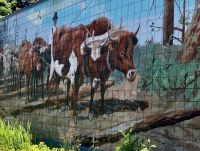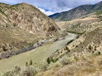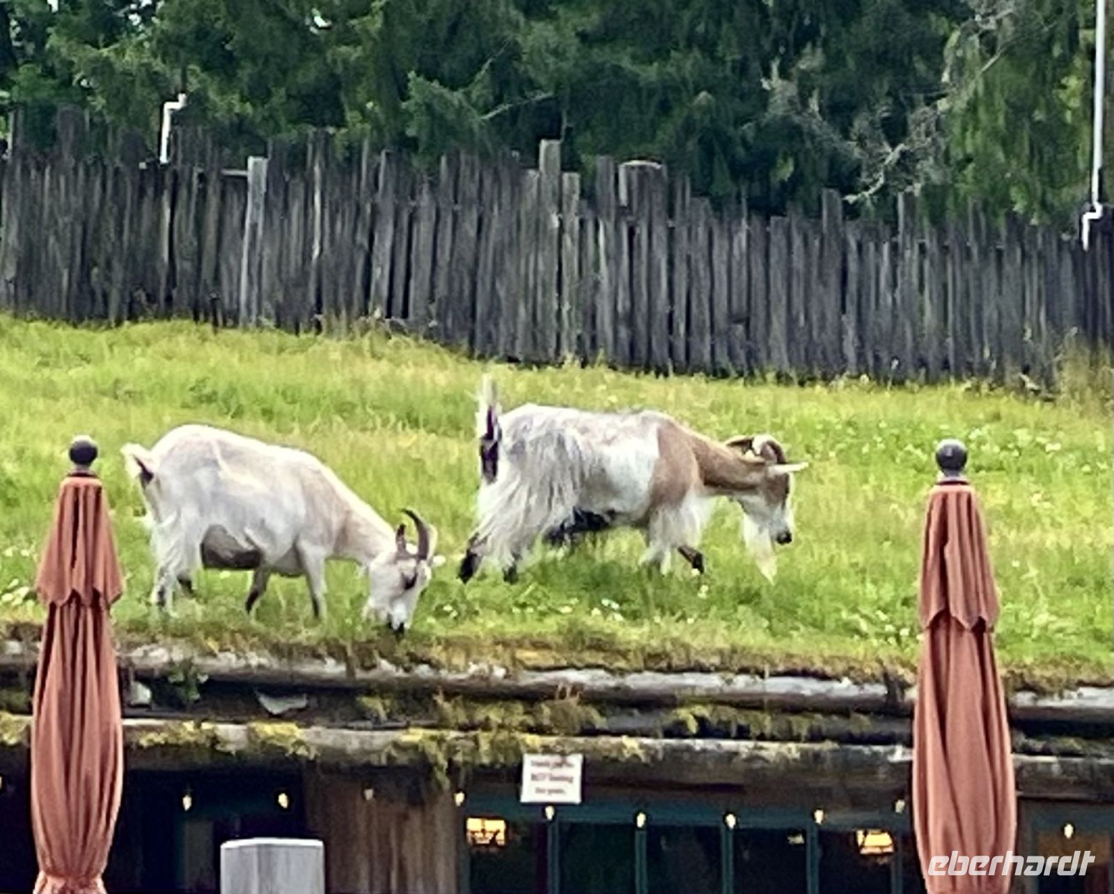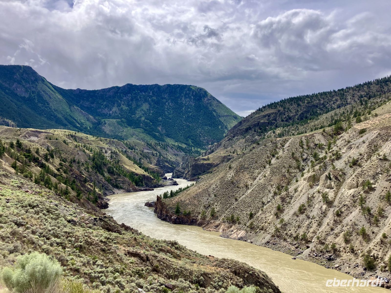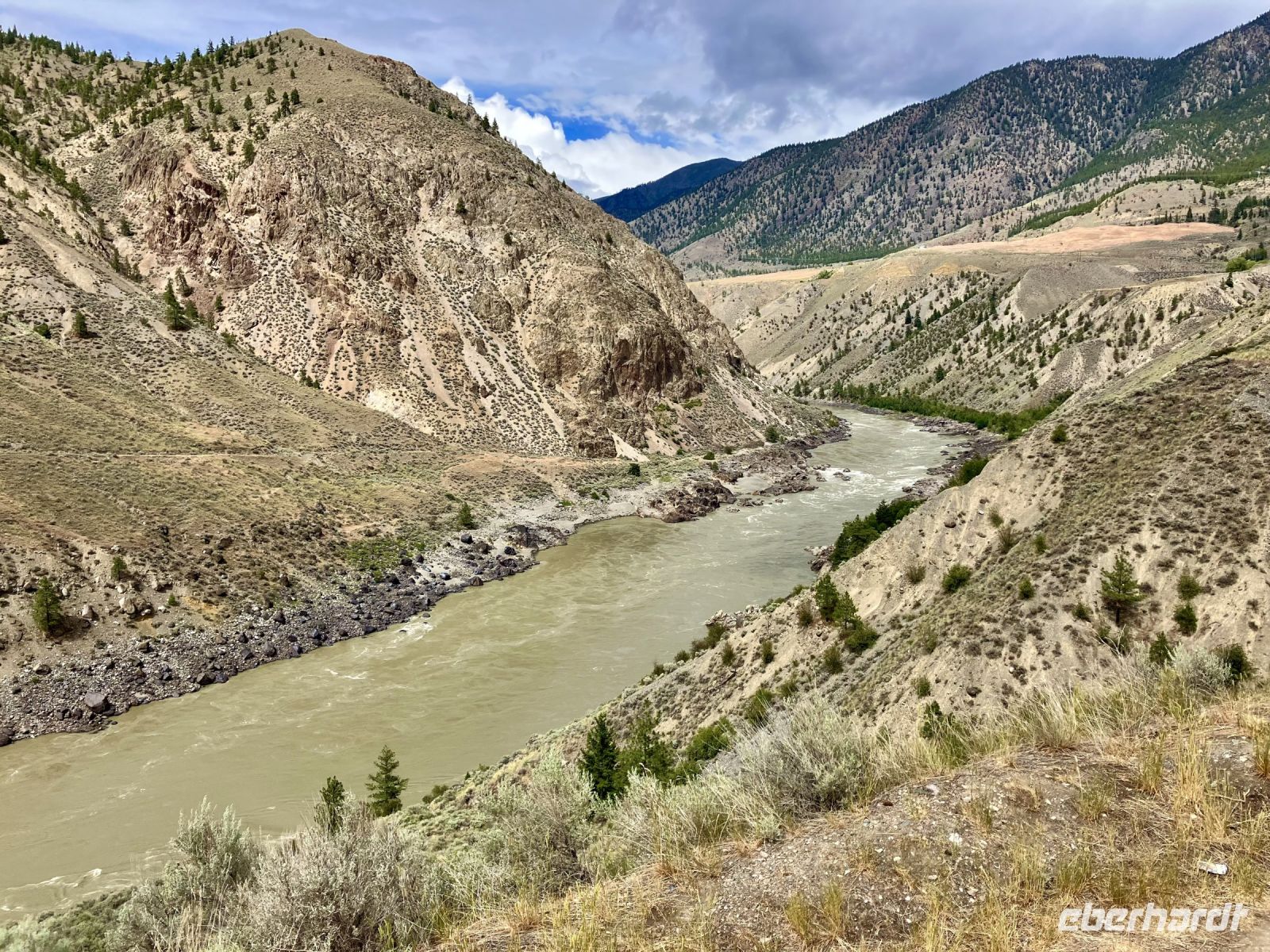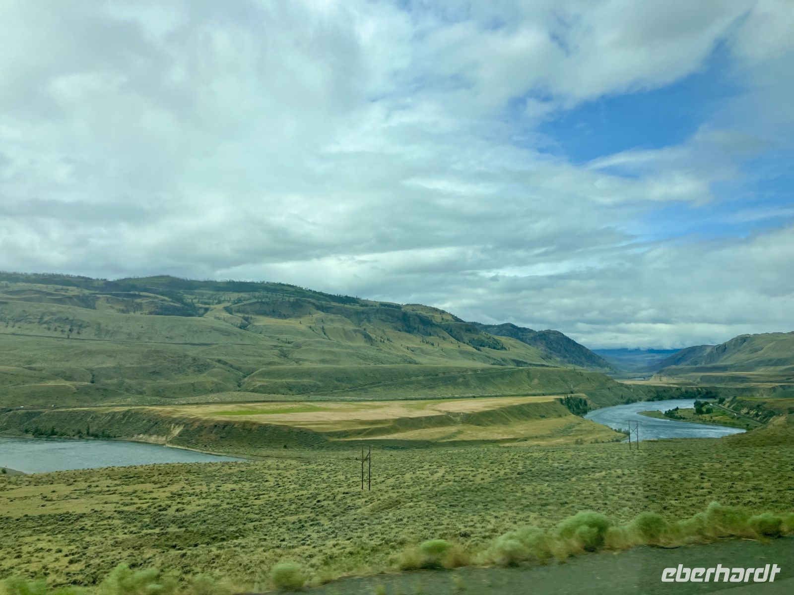 orhang zurueckgeschoben rausgeschaut und gleich wieder ins Bett verschwunden….wer will schon bei “bewoelkt” aufwachen. Nur gut, dass es auch im Badezimmer gutes Licht gibt, es schaut da fast wie Sonnenschein aus. Zum Fruehstueck ein Ei, sunny side up, und schon ist fuer gute Laune gesorgt. Das Fruehstueck hier ist Haubenkoch-wuerdig. Es gibt unter anderem auch geraeucherten Lachs, viele Kaesesorten und Aufschnitt sowie frisches Obst und sogar eine Schuessel voll Blaubeeren mit Erdbeeren gemischt. Koestlich. Unsere heutige Route fuehrt uns vorerst nach Kamloops. Vieles wird ueber Simon Fraser und David Thompson gesprochen. Viele Wissenswertes ueber die Kultur, Sprache, Gepflogenheiten, Schule, Medizin der Ersten Nation wird bekanntgegeben. Am Kamloops See machen wir auf einer Anhoehe auch Pause und geniessen die Aussicht. Weiter geht es nun zur Hat Creek Ranch. Das historische Posthotel liegt an der Cariboo Wagenstrasse.
