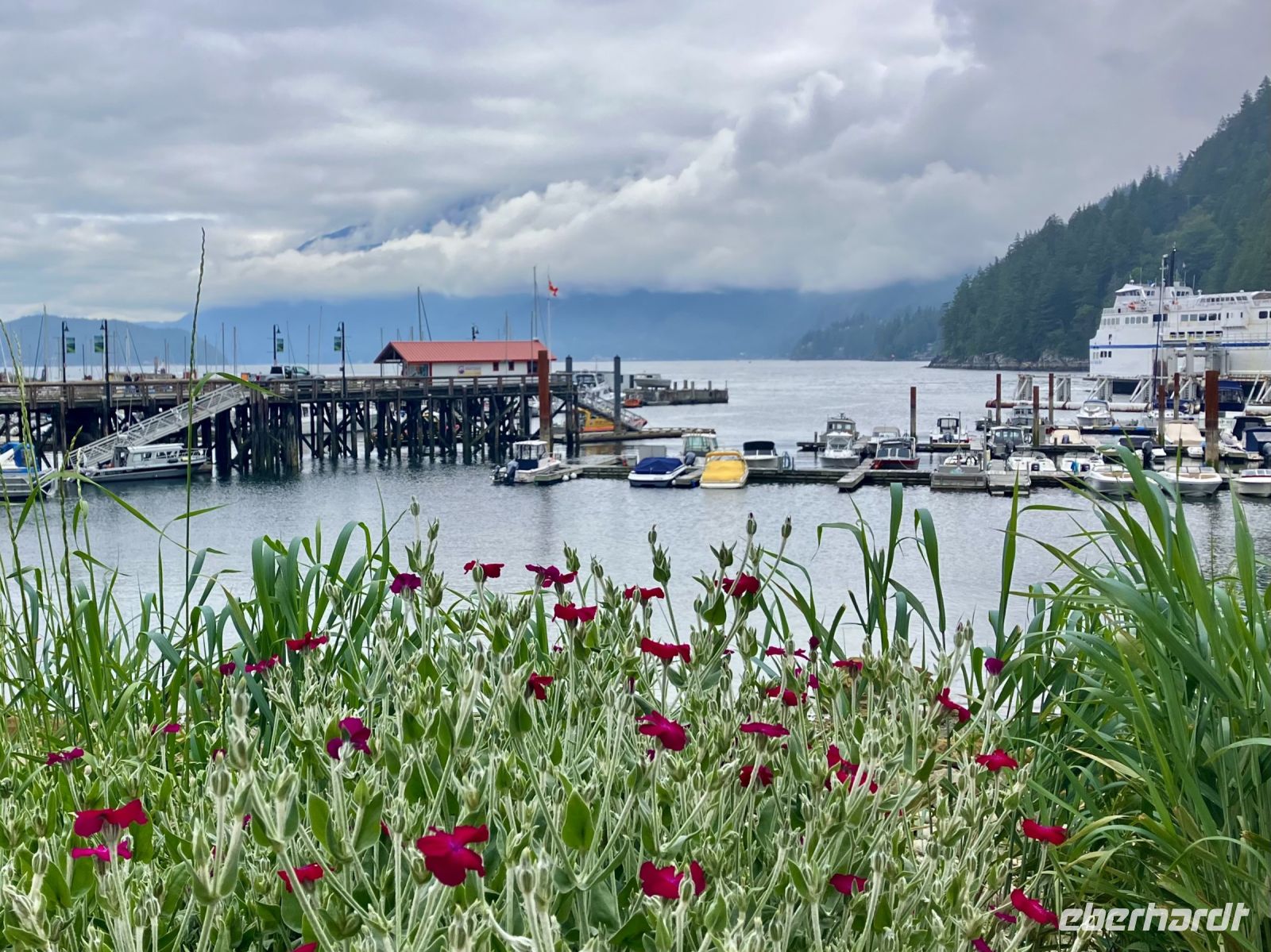 Heute in der Frueh holt uns unser Handy und das Haustelefon wie immer um 6:30 aus dem Traumland. Mal schauen wo der Mond steht und wie es draussen ausschaut. Mond nicht sichtbar, Sicht bloss 2/3 der Berge. Aber das Fruehstueck mit den feinen Eggs Benedict macht das Wetter wett. Um 8:30 fahren wir ab da die Faehre in Horseshoe Bay nicht auf uns warten wird. So kurven wir auf der tollen Sea 2 Sky Highway durch Squamish und dann dem Fjord entlang nach Lions Bay (wo E gewohnt hat) um nach Horseshoe Bay zu gelangen. Wir sind zeitig da und schauen uns deshalb kurz das kleine Dorf mit seinem Hafen an, ehe wir mit dem Bus auf die Faehre fahren wollen. UUUps, der Bus faehrt auf die Faehre und wir stehen da. Nachdem alle Autos und Laster geladen sind, duerfen auch wir Fussgaenger auf die Faehre. Wir holen noch die 7 Sachen aus dem Bus die wir fuer diese Ueberfahrt auf Vancouver Island brauchen und gehen gleich hinauf aufs oberste Deck. Nun kommt auch wieder der Sonnenschein und wir sitzen draussen. Wir sind gut verpflegt mit einem feinen Kaffee in der Hand und habe Sicht auf schoenen Inseln und Schiffe die bei uns vorbeiziehen. Bald erreichen wir Nanaimo. Hier werden von der Fähre freigesprochen und rollen auf diese grosse Insel. Auf der Island Highway vorerst in Richtung Norden und danach in den Westen. Alsobald machen wir auch einen Halt und Pause in Coombs. In dem grossen Markt wo die Ziegen auf dem Dach grasen kaufen wir alles moegliche ein. Heute Abend ist das Abendessen nicht inkludiert und Morgen wollen wir einen Picknick an einem wilden Strand machen. Auf der Fahrt nach Tofino halten wir in einem tollen Urwald. Es heisst Cathedral Grove und wir stehen hier inmitten Urbaeume. Zedern, Hemlock Tannen, Duglasien sowie Ahorn ueberragen das Unterholz und den Wald auf halber Hoehe. Schoene Wege fuehren durch das Dickicht. Viele Photo spaeter und stark beeindruckt, feiern wir heute die Silberne Hochzeit eines Paeaerchens genau hier. Impromptu werden kurze Reden gehalten, Bubbely Wein getrunken und wir lassen die beiden Hochleben. Bald darauf fahren wir weiter an die Kueste. Noch einen kleinen Stop im Liquour Store und einen tollen ersten Eindruck am Wickanninish Strand, und schon sind wir in Tofino angekommen. Herrlich ist die Luft hier . Die Kombination von Meer und Wald ist sehr wohltuend und so spazieren nun auch die meisten ins Doerfchen hinein um auch noch den tollen Sonnenuntergang zu erleben. So ein schoener Abend, so eine gute Nacht.