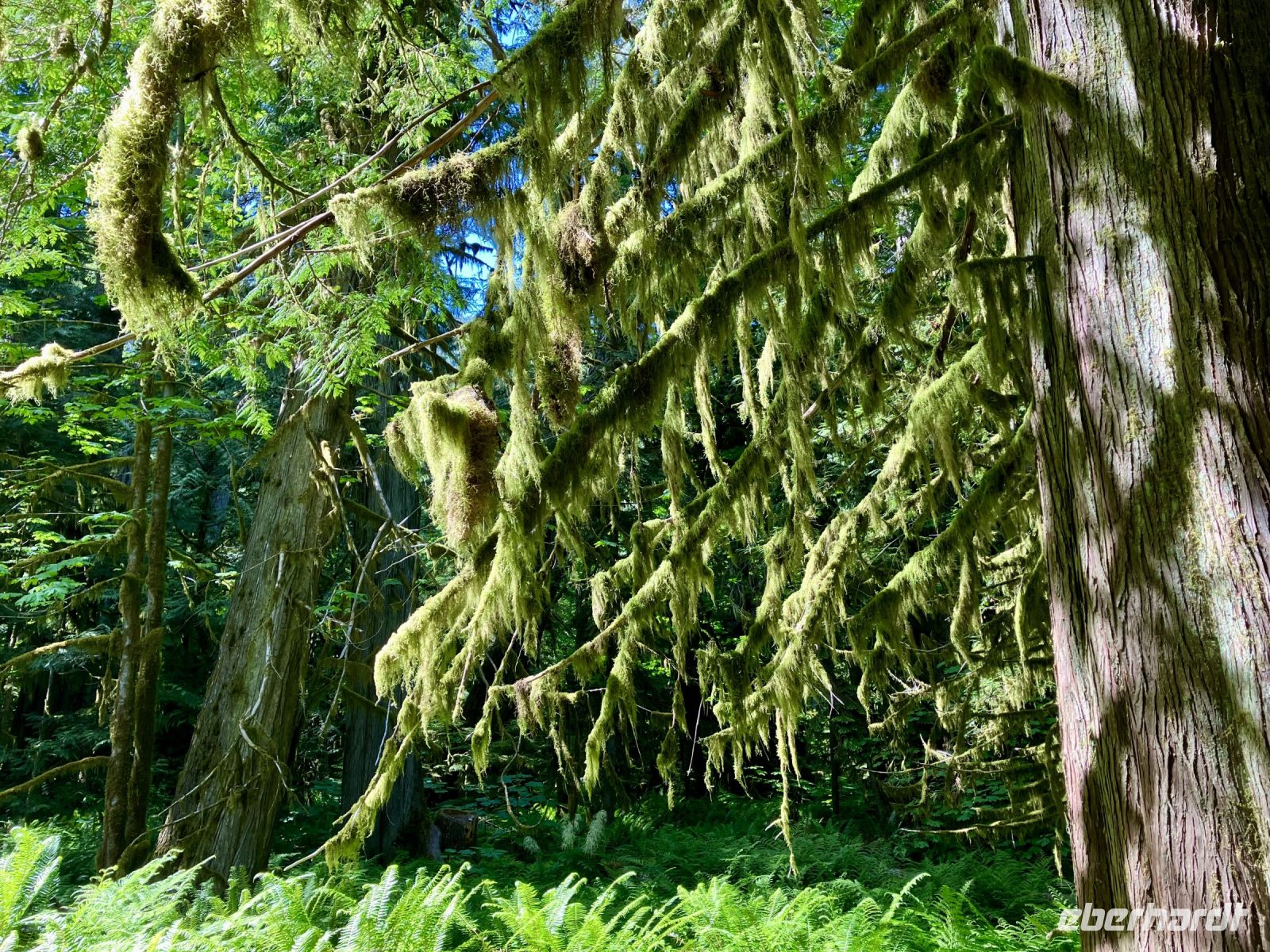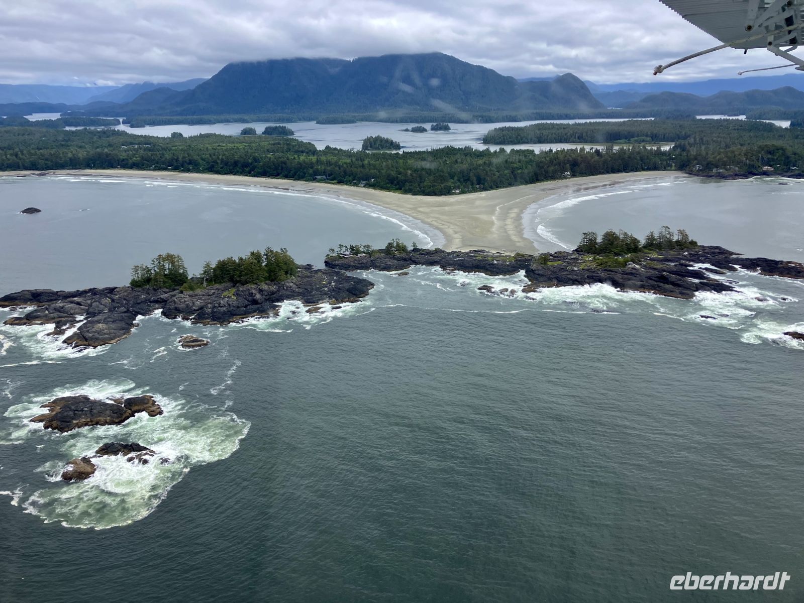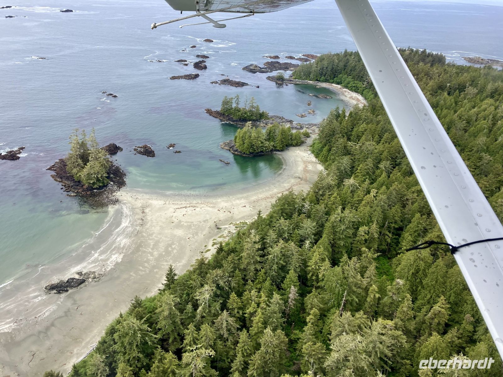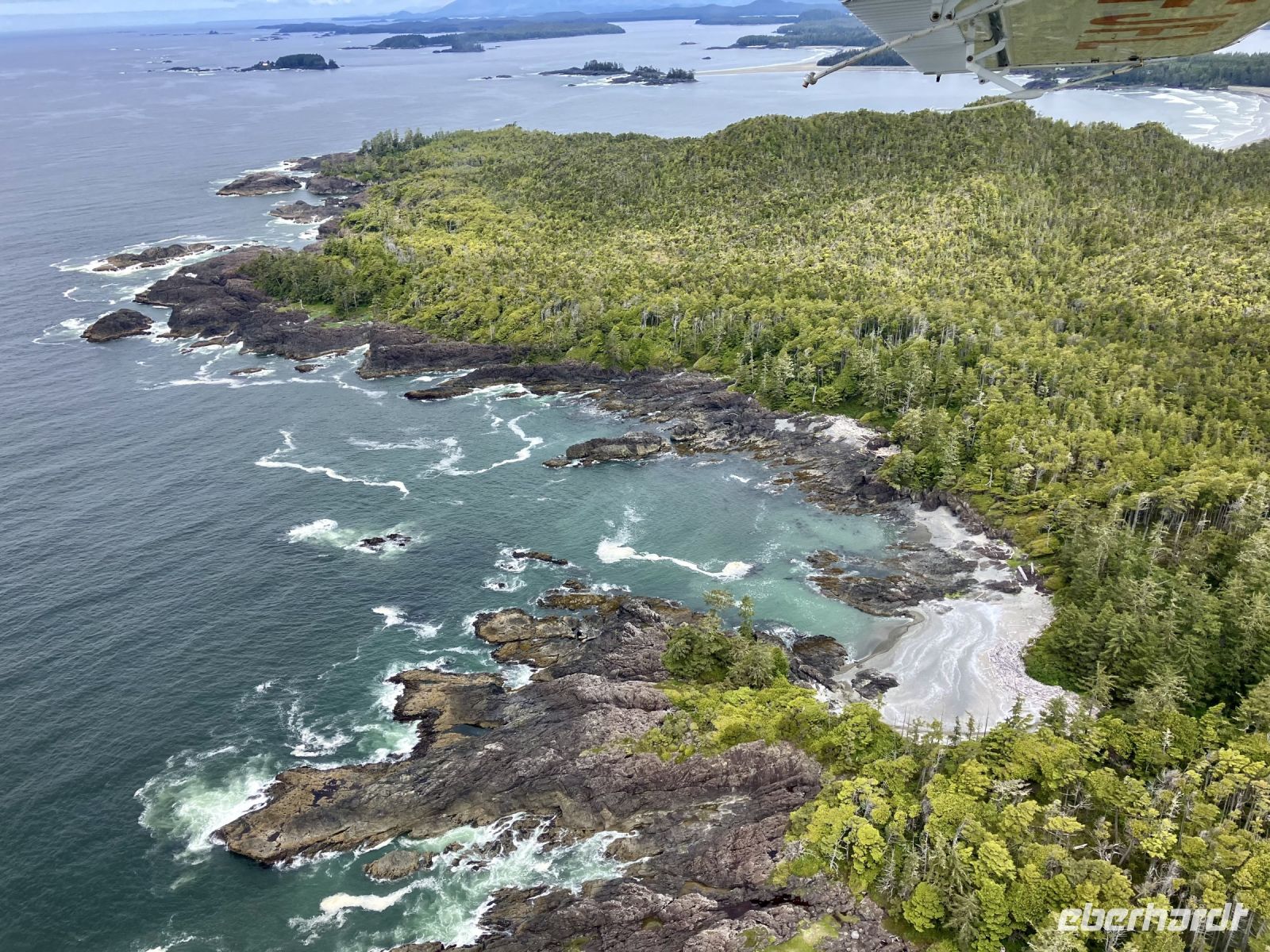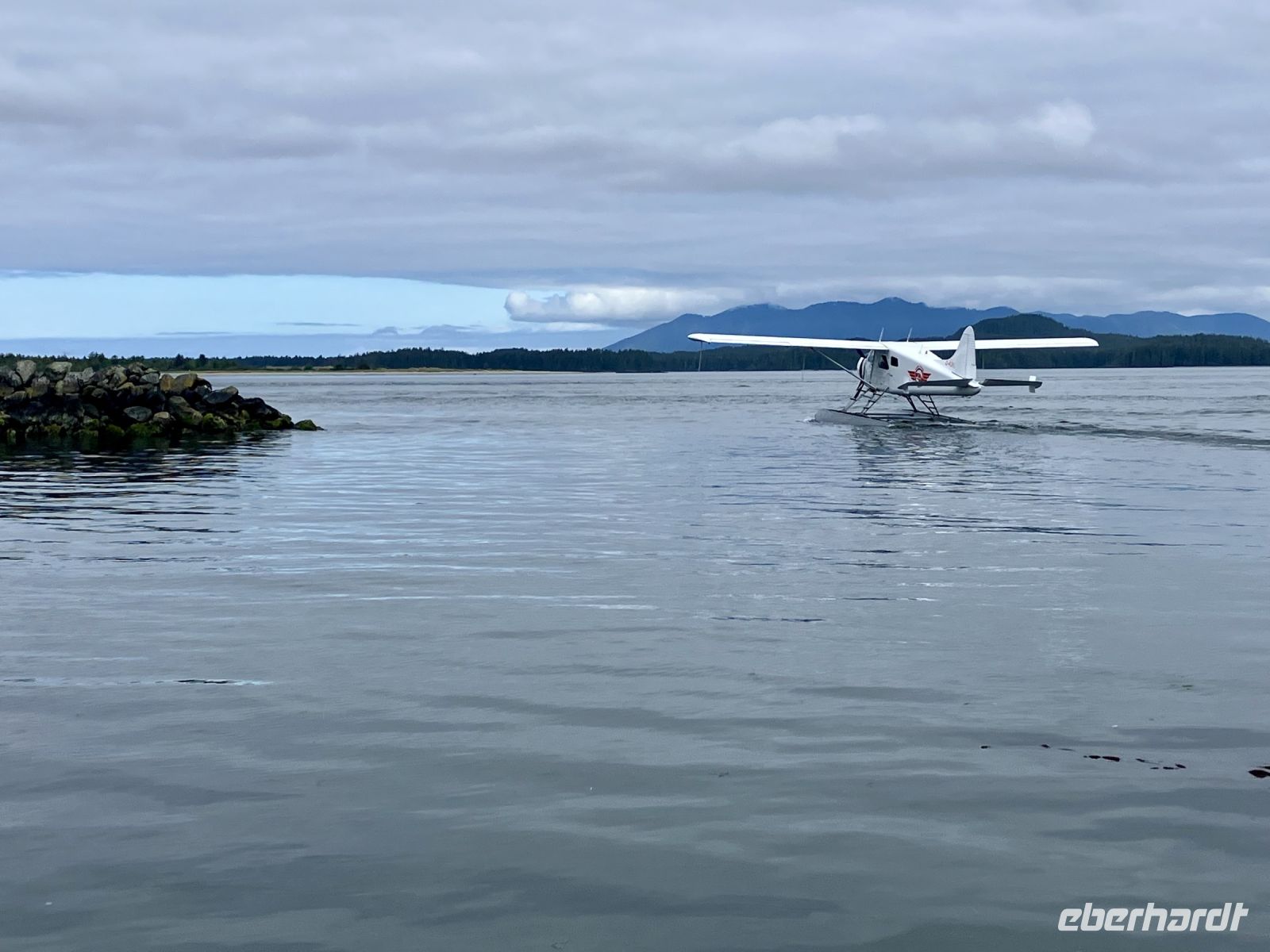 Heute ist unser freier Tag im Regenwald und er wird voll ausgenuetzt, wenn man das moechte. Einfach Seele baumeln lassen geht auch. Aber keiner dieser Gruppe hat sich dafuer entschieden. Also, Morgends nach dem Fruehstueck mit Meerblick fahren wir gleich zu unserem ersten Abenteuer. Alle haben sich zu einem Flug mit einem Wasserflugzeug entschieden und der gecharterte Beaver und die Chessna werden 4 mal eingesetzt. So ist der Plan; aber leider ist die 3-sititzige Chessna ausser Betrieb also fliegen wir alle in 5er Gruppen mit dem Beaver. Jeder hat ein Fensterplatz. Das Wetter ist perfekt, es ist ruhig. Die Inselwelt von Tofino zeigt sich von der allerbesten Seite. Weisse Sandstraende, aus dem Meer ragende Felsen wo sich die Wellen schlagen, tiefgruenen Urwald und ein echt Stiller Ozean. So geniesst jeder seine 1/2 Stunde in der Luft. Abheben und Landen geschieht vor unseren Augen gleich in dem natuerlichen Hafen von Tofino. Nun aber auf zu unserer kleiner Wanderung zum Strand. Der Weg dahin geht durch den Regenwald und ist bloss 1 Km lang aber wir sind eine geschlagene Stunde unterwegs. Wir kommen aus dem Staunen und Knipsen gar nicht weiter. Um jedes Eck steht ein Urbaum hinter, neben oder vor einem Urkollegen, tolle Farne und ab und zu auch Mikadospiele fuer Giganten, alles maerchen- fast hexenhaft. Nun sind wir an dem Strand und setzen uns auf die Felsen. Die Sonne lacht und jemand zieht sich sogar um und springt mal kurz in den Ozean. Es sei gar nicht so kalt sagt sie und zieht sich schleunigst alle Klamotten wieder an !!!
