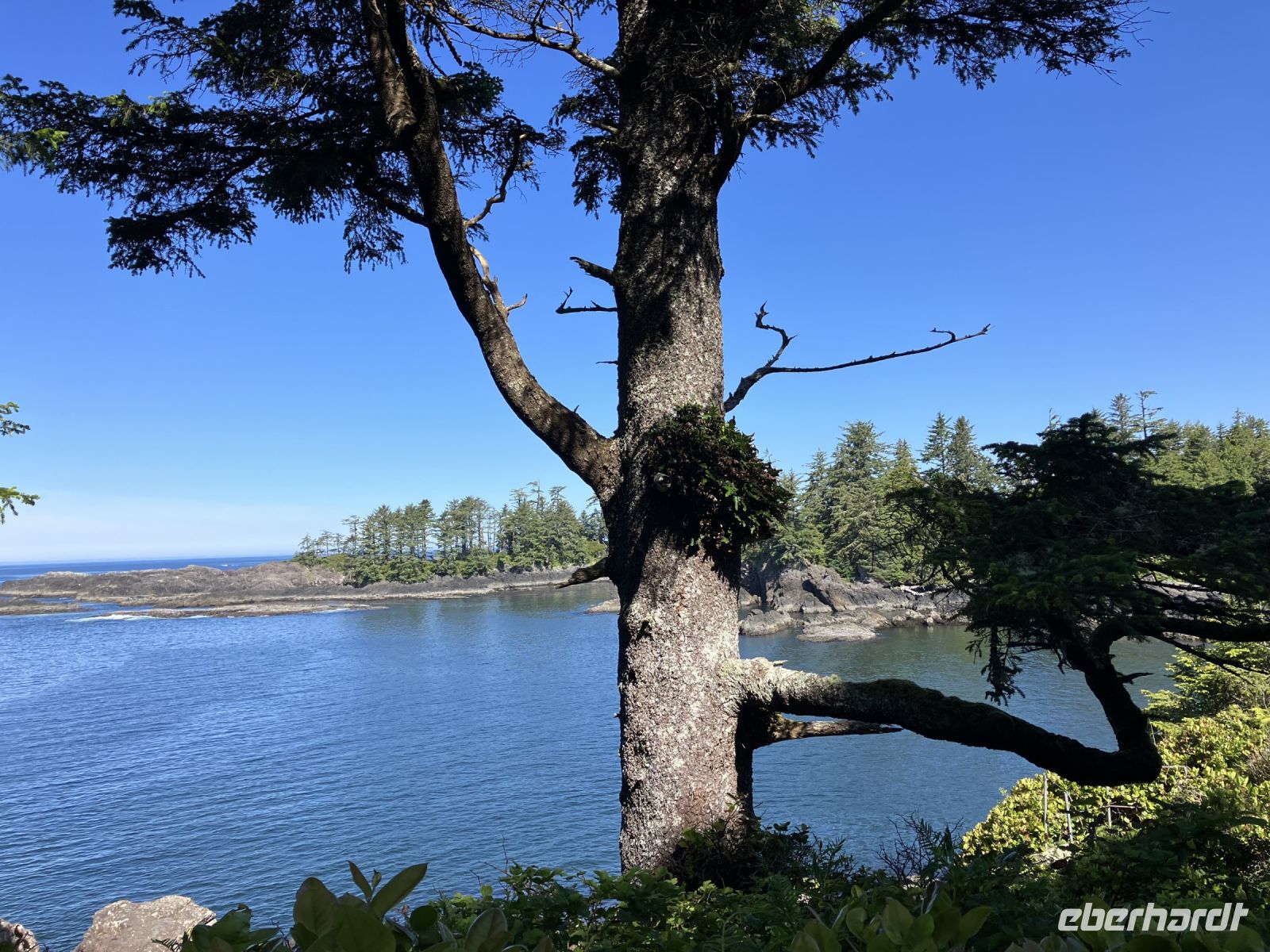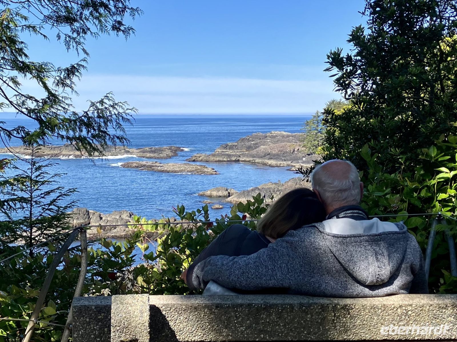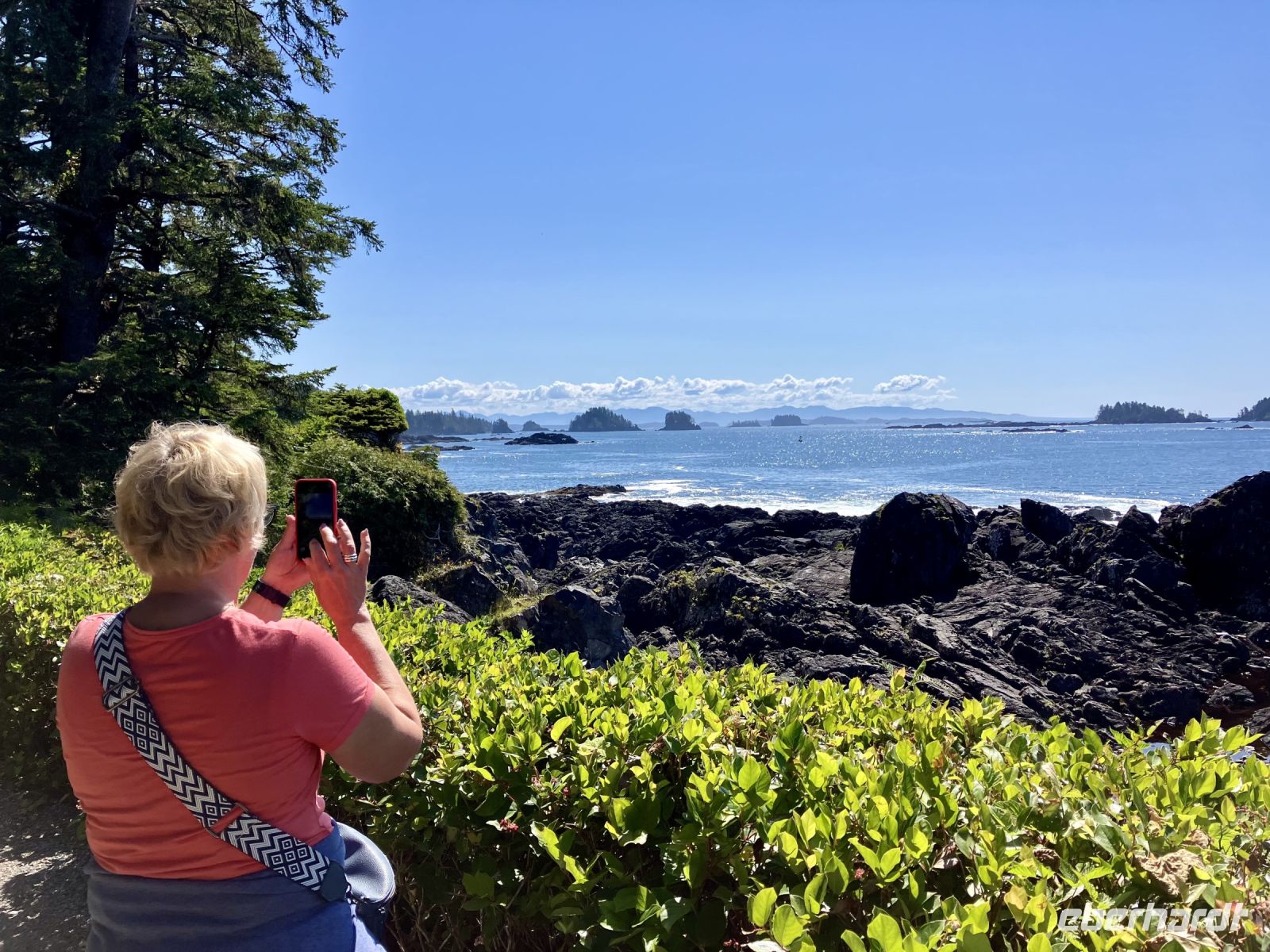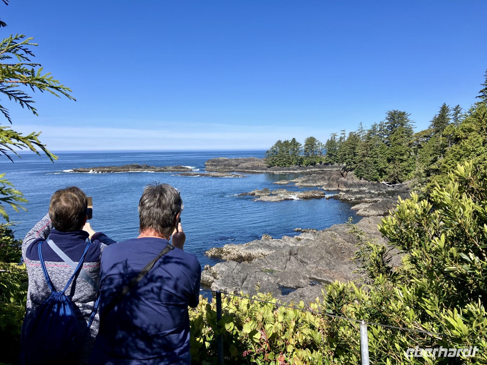 Oh wie schoen, die Sonne lacht. Das Fruehstueck wird wie gestern auf dem Teller serviert und die feinen Speisen reichen auch gleich fuer Mittagessen. Nachdem jeder seinen gewuenschten Kaffe oder Tee gekostet und konsumiert hat, treffen wir uns im Bus. Die Koffer werden wieder versttaut und bald sind wir unterwegs zum “romantischen Wanderweg”. Wir fahren nach Ucluelet. Es wird liebevoll auch Uki genannt. Dort spazieren wir einer wilden Kueste mit ausserordentlichen Aussichten entlang. Schaut Euch die Photos an. Es ist traumhaft, Urwald, Ozean, Inselchen, Schaeren, die Broken Islands und auch der Leuchtturm nehmen uns in ihr Bann. Ein schoener Abschied vom Westen der Vancouver Island.
