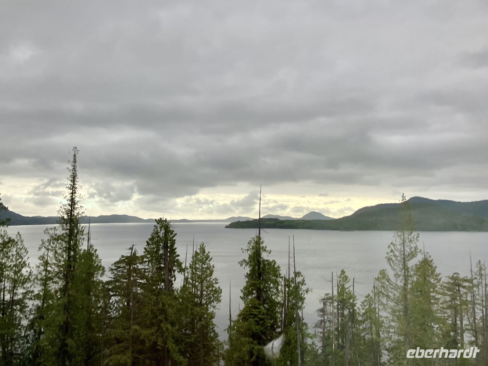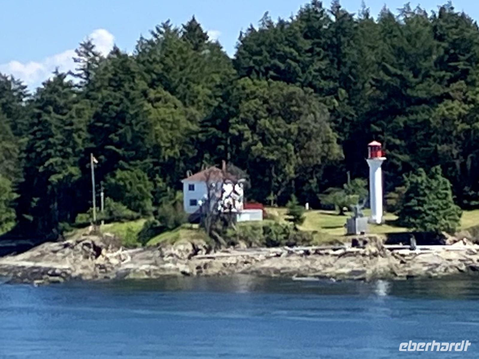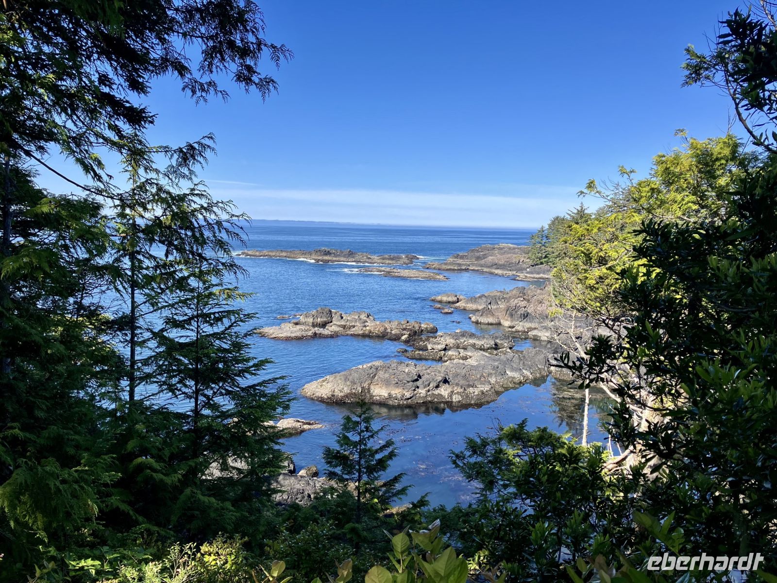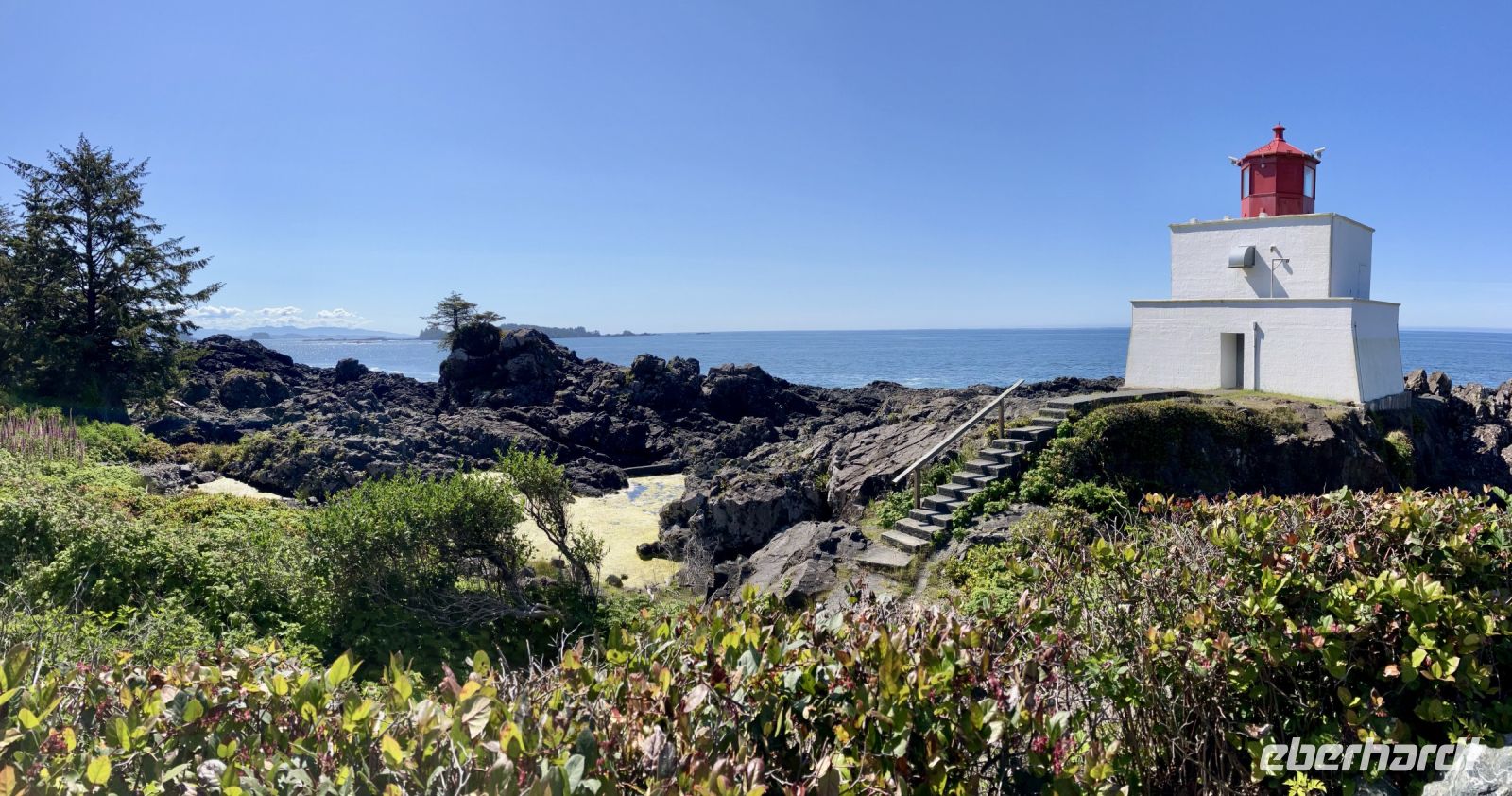 Oh wie schoen, die Sonne lacht. Das Fruehstueck wird wie gestern auf dem Teller serviert und die feinen Speisen reichen auch gleich fuer Mittagessen. Nachdem jeder seinen gewuenschten Kaffe oder Tee gekostet und konsumiert hat, treffen wir uns im Bus. Die Koffer werden wieder versttaut und bald sind wir unterwegs zum “romantischen Wanderweg”. Wir fahren nach Ucluelet. Es wird liebevoll auch Uki genannt. Dort spazieren wir einer wilden Kueste mit ausserordentlichen Aussichten entlang. Schaut Euch die Photos an. Es ist traumhaft, Urwald, Ozean, Inselchen, Schaeren, die Broken Islands und auch der Leuchtturm nehmen uns in ihr Bann. Ein schoener Abschied vom Westen der Vancouver Island.