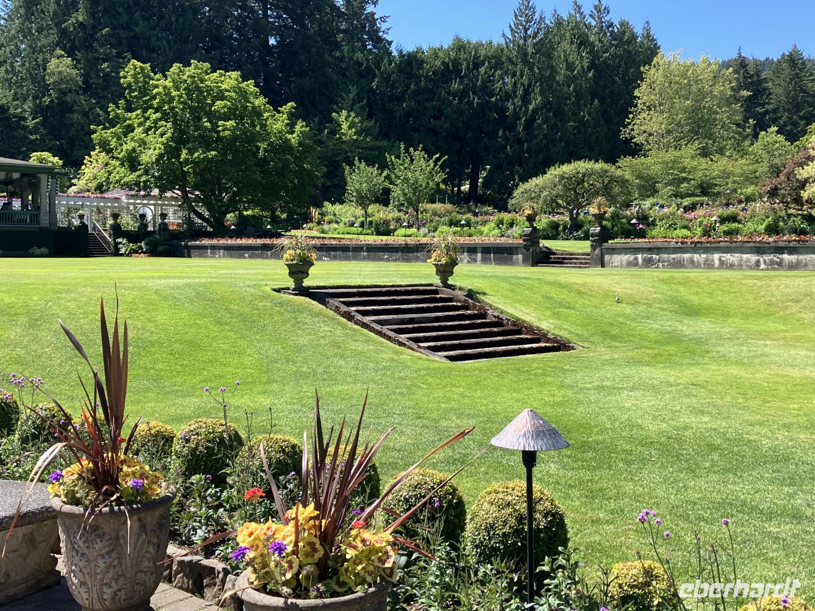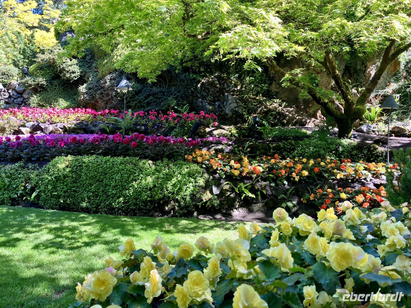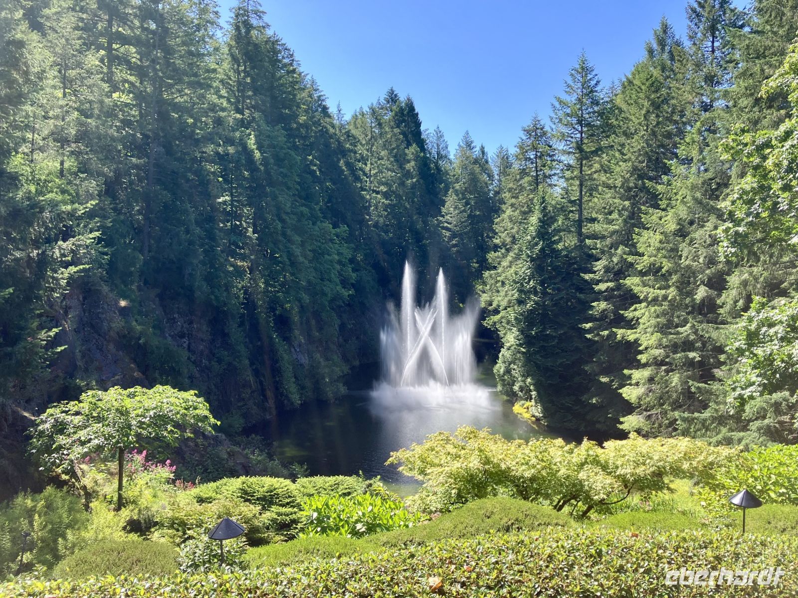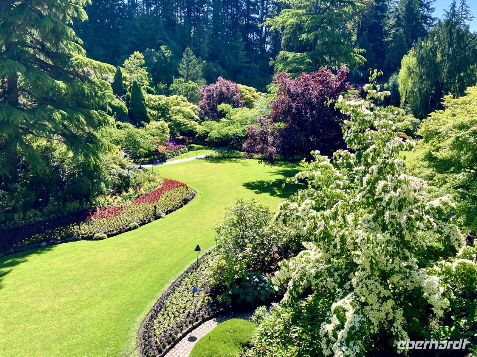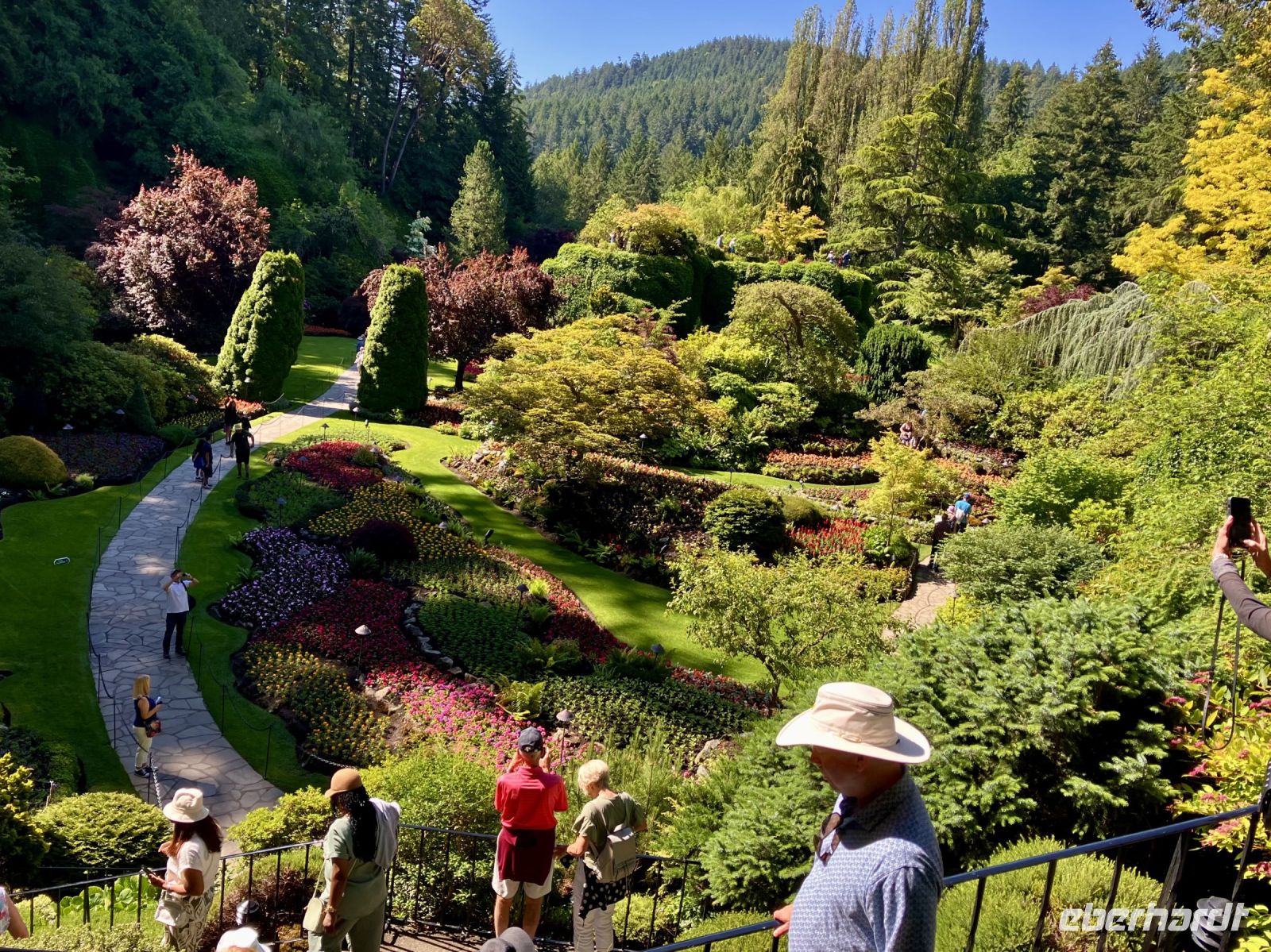 Vorhang auf, uuuui schon wieder Sonnenschein, gut, kurz und tief geschlafen wachen wir in Victoria auf. Ja wo ist denn hier das Badezimmer, die Zimmer in diesem alt-englischen Hotel sind riesengross, mit Kueche, Esszimmer, Wohnzimmer, Schlafzimmer, Badezimmer und sogar einer Abstellkammer. Ich lande natuerlich schlaftrunken gleich in der Abstellkammer und stehe vor einem Staubsauger, Buegeleisen und Buegelbrett. Denke ich sei hier in einem falschen Film, dreh mich um und verschwinde schnellstens wieder ins Schlafzimmer wo ich mich auskenne. Ha, noch mal gut ausgegangen. Kurz ins Bett gelegt, Augen nochmals geoeffnet und der Tag kann beginnen. Nach dem schoenen Fruehstueck faehrt uns Genesis vorerst beim Parlament vorbei auf den letzten Teil der Highway no 1. Diese Strasse fuehrt direkt ans Meer und dort ist auch die Mile 0 der fast 8000 Km langen Highway no 1die durch ganz Kanada fuehrt. Nach dem obligaten Photo gehts weiter der Kueste entlang. Schoene Villen saeumen den Weg. Die Herrschaftshaeuser und ihre Gaerten werden mit jedem Kilometer ueberschwenglicher und ueppiger. Ploetzlich ist die Strasse unterbrochen und wir fahren einen fast noch schoeneren Umweg bis in die “Uplands” von Victoria. Hier geht es sehr vornehm zu und her, sehr englisch, gewundene Strassen fuehren durch die Gaerten zum jeweiligen Hauseingang, die Villen sind ausstaffiert mit Schwimmbaeder, Ballsaeaele, in-house Theater und vielen Zimmer. Wir sitzen auch ganz gerade im Bus und machen steiffe Oberlippe. Sogar Hirsche und Rehe spazieren hier herum sowie Damen und Herren mit ihren Huendchen. Zwei grosse Marksteine zeigen an, dass wir wieder aus den Uplands rausfahren so koennen wir uns auch wieder etwas gehen lassen im Bus. Dann gehts weiter durch das Uni-gelaende bis zu den Butcharts Garten. Nun verstehen wir auch, weshalb hier ueber eine Million Menschen hierherkommen. Die verschiedenen Gaerten sind einfach ueberwaeltigend schoen. Vorerst der Haengende Garten mit seinen praechtigen Blumenampeln, dann der Wald Garten der uns zum versunkenen Garten fuehrt. Unser Auge faellt auf eine einstweilige Aushubgrube die heute das Zuhause eines Bluetenmeeres bietet. Wir tauchen da auch ein und verstehen die Kunst des Gartenbaus etwas besser. Bewegung muss rein, Farben muessen passen, mit Hoehen muss gespielt werden, die Beete muessen knallvoll mit Pflanzen sein ohne Luecke, ja dann gelingt auch jeder Garten. Es hilft sicher auch 300 Gaertner anzustellen ! Der Rosengarten haelt unsere Nasen aktif und der japanische Garten unser Seele und unser Gemuet. Dann besuchen wir natuerlich auch den franzoesischen Garten mit seinen weissen Bordueren und den richtig schoenen chaotischen italienischen Garten. Ausge-gaertelt und beglueckt, gehts nun “very english” weiter, denn im Hauptgebaeude erfahren wir nun ein echter “english high tea”. Ein dreistoeckiges Gestell ist voll mit lauter kleinen Happen. Sandwiches aller Art befinden sich ganz unten, auf dem 2. Stock gibt es Kuchen, Toertchen, Schokolade und zuoberst die Kroenung, ein feiner Scone mit gesalzener Butter und Erdbeer-Marmelade. Tee gibt es dazu ! Ach so fein das Essen und so schoen das Lokal.