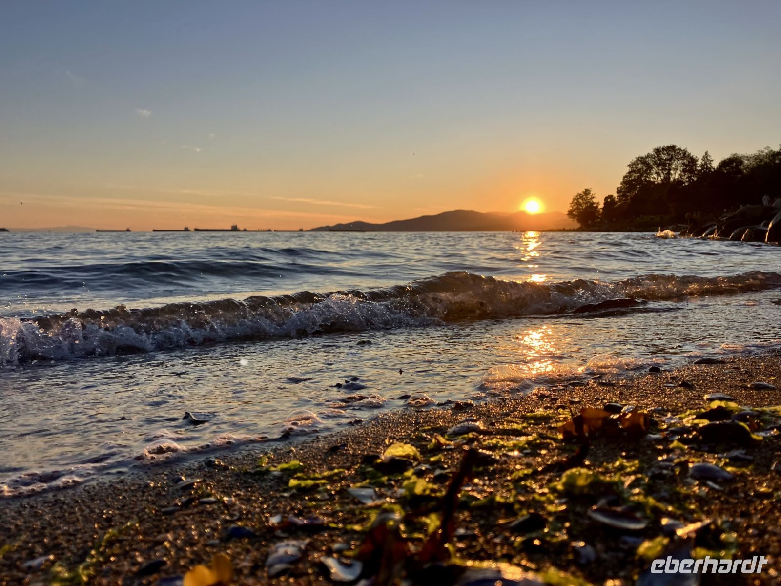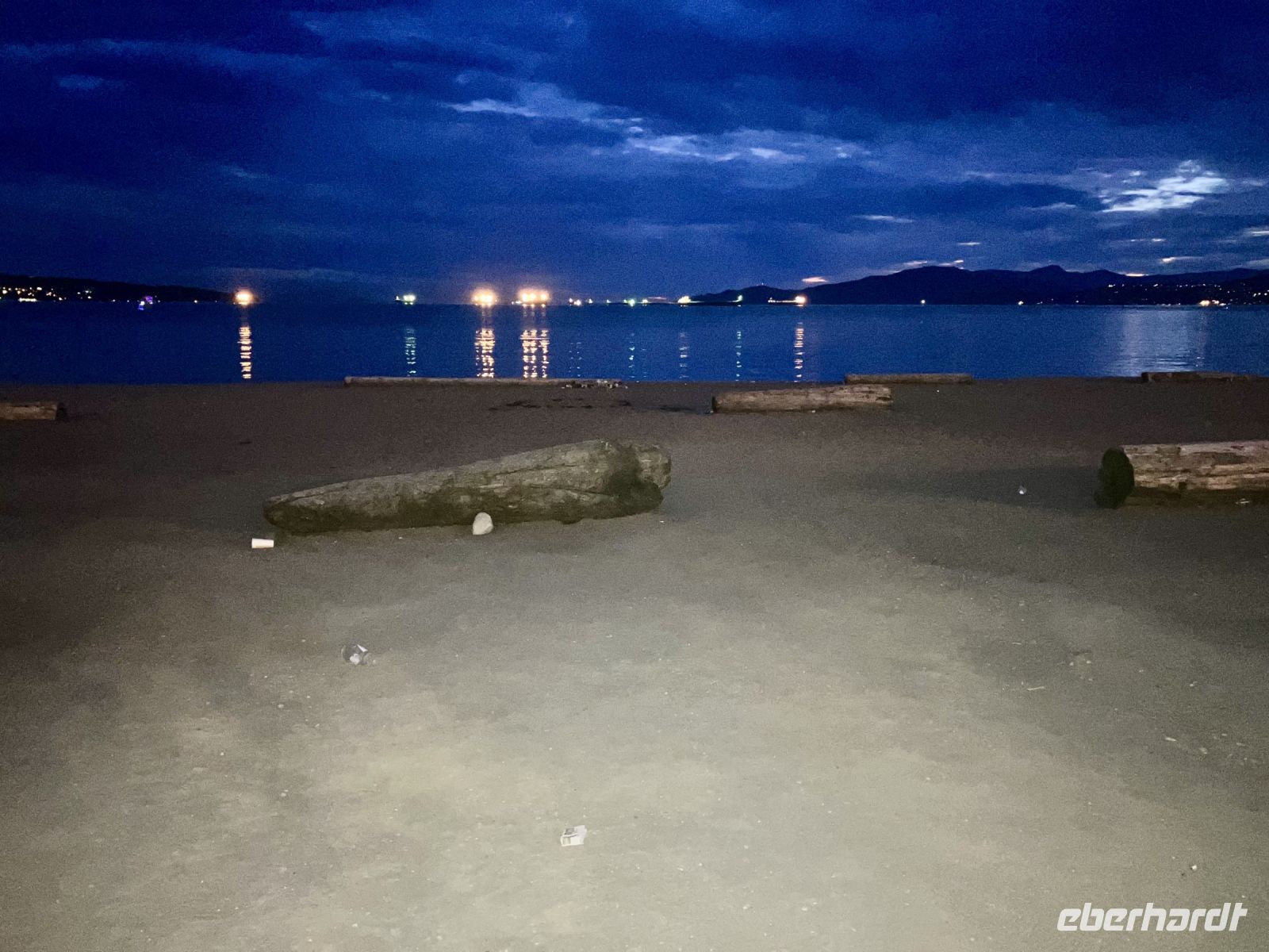 Nun ist Zeit, dass wir wieder zurueckfahren denn wir wollen uns heute noch rausputzen fuers Abschiedsessen in dem feinen Lokal. Ein wunderbarer, sonniger Tag vergeht, die Party zum 40. Hochzeitstag und die offizielle Verabschiedung sind ruehrend und der Prosecco aus dem Okanagen Tal in BC koestlich. Unser Abschiedsessen ist in einem ehrwuerdigen Hotel gleich am Strand. Alle Speisen sind auch sehr lecker. Nach dem Essen gehen wir alle dem Strand entlang zu unserem Hotel. Der Strand vor unserem Hotel ist vollgepackt mit jungen Leuten die sich des Lebens erfreuen. Vielleicht weil bald Sonnenwende ist, oder weil Wochenende gefeiert wird oder weil es einer der ersten richtig schoenen warmen Abende hier ist, jedenfalls hat es jeden unter 25 und ueber 18 hierhergetrieben wie auch uns ! Schoen ist es hier in Vancouver wenn auch laut in jeder Hinsicht.