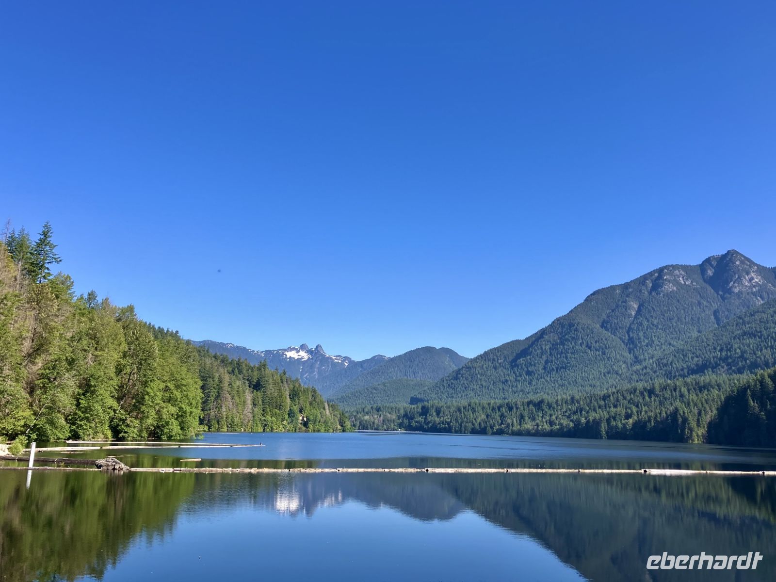 Also gehts auch schon bald los auf den Ausflug in den Norden der Stadt. Wir fahren dem Capilano Fluss hinauf bis zum Capilano See. Er liegt still inmitten der Berge, wobei wir doch bloss 20 Minuten mit dem Bus aus dem Stadtkern gefahren sind ! Wir gehen ueber den Damm und tauchen danach ab ins “Waldbaden”. Auf verschiedenen Pfaden auf und ab, an riesen Baeumen die in den blauen Himmel ragen vorbei, wandern wir zum Fluss hinunter. Ueber eine Bruecke muessen wir nun damit wir zur Lachs-Aufzucht-Anstalt gelangen. Interessant ist die Methode, wie man den Fischbestand erhalten kann, wenn die Lachse auch nicht selbst zur Laichstelle schwimmen koennen wie hier. Der Damm versperrt den Weg.