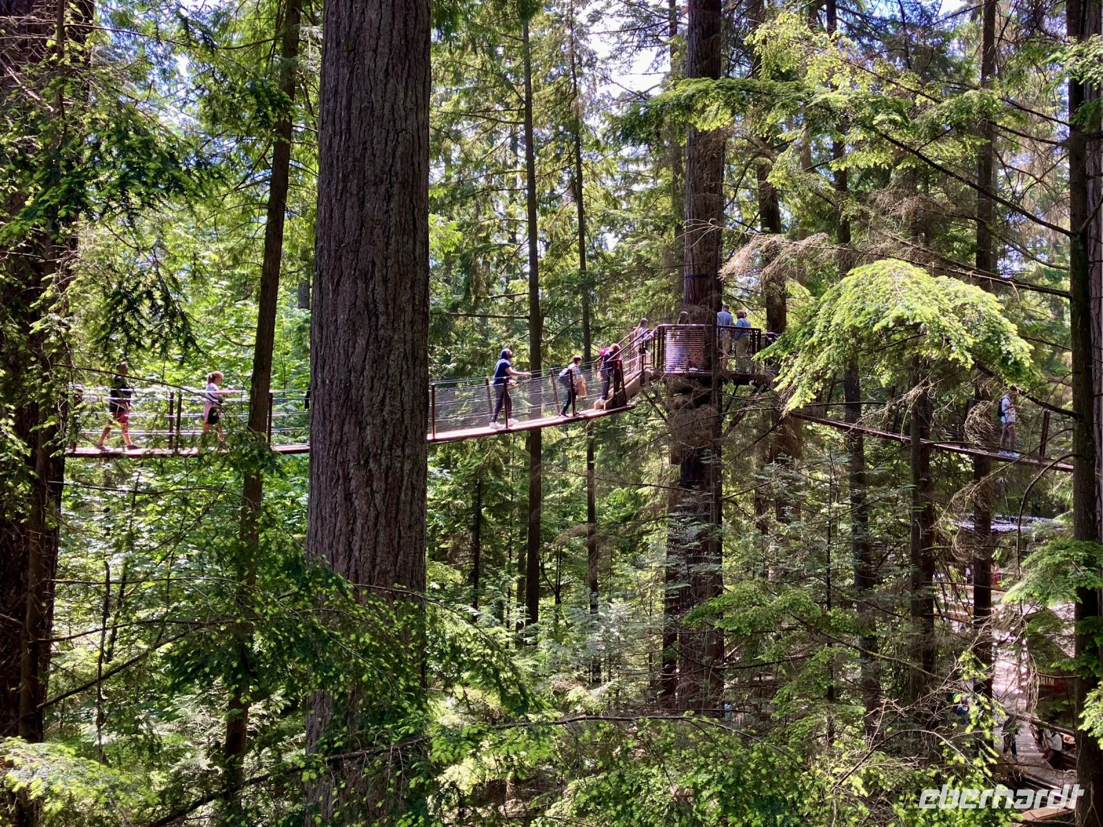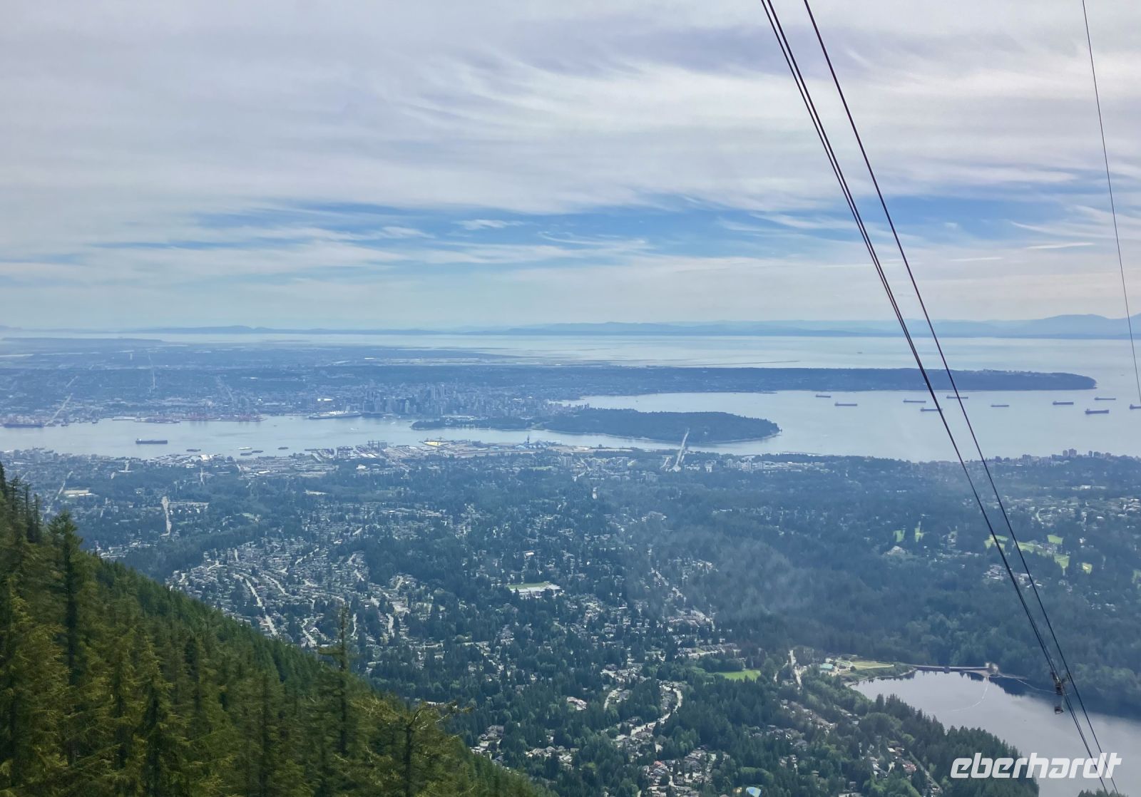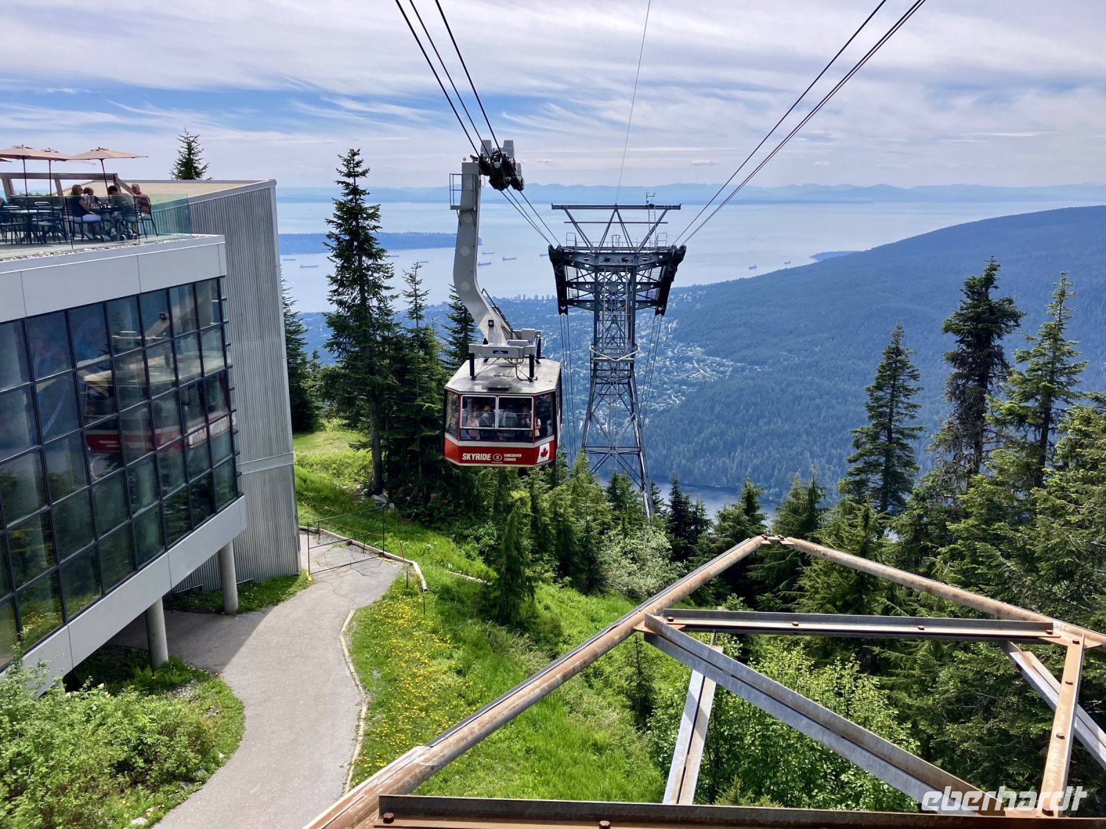 Nun fahren wir mit dem Bus weiter und besuchen die Capilano Haengebruecke. Man muss schon Mut aufbringen um sie durchzugehen, aber die Belohnung ist gross. Ein Baumwipfel-Weg fuehrt uns auf guter Hoehe von Baum zu Baum. Herrliche Aussichten lassen uns ahnen wie sich ein Weisskopfadler in diesem Lande fuehlt. Nun aber wieder ueber die Haengebruecke zurueck zum Shop und weiter auf den neuen Cliff Walk. Es ist ein Eisensteig der an einer sehr steilen Canyonwand angebracht ist. Auch hier trauen wir uns auf dieser furchterregenden Hoehe noch atmend vorwaerts zu gehen. Gelungen, also wieder zurueck zum Bus, denn das naechste Abenteuer wartet bereits. Wir schweben mit einer Gondel auf einen der 3 Hausberge. Grouse Mountain. Wir geniessen eine einmalige Sich auf die Stadt hinunter. Die Sonne lacht, es ist nun wirklich warm.