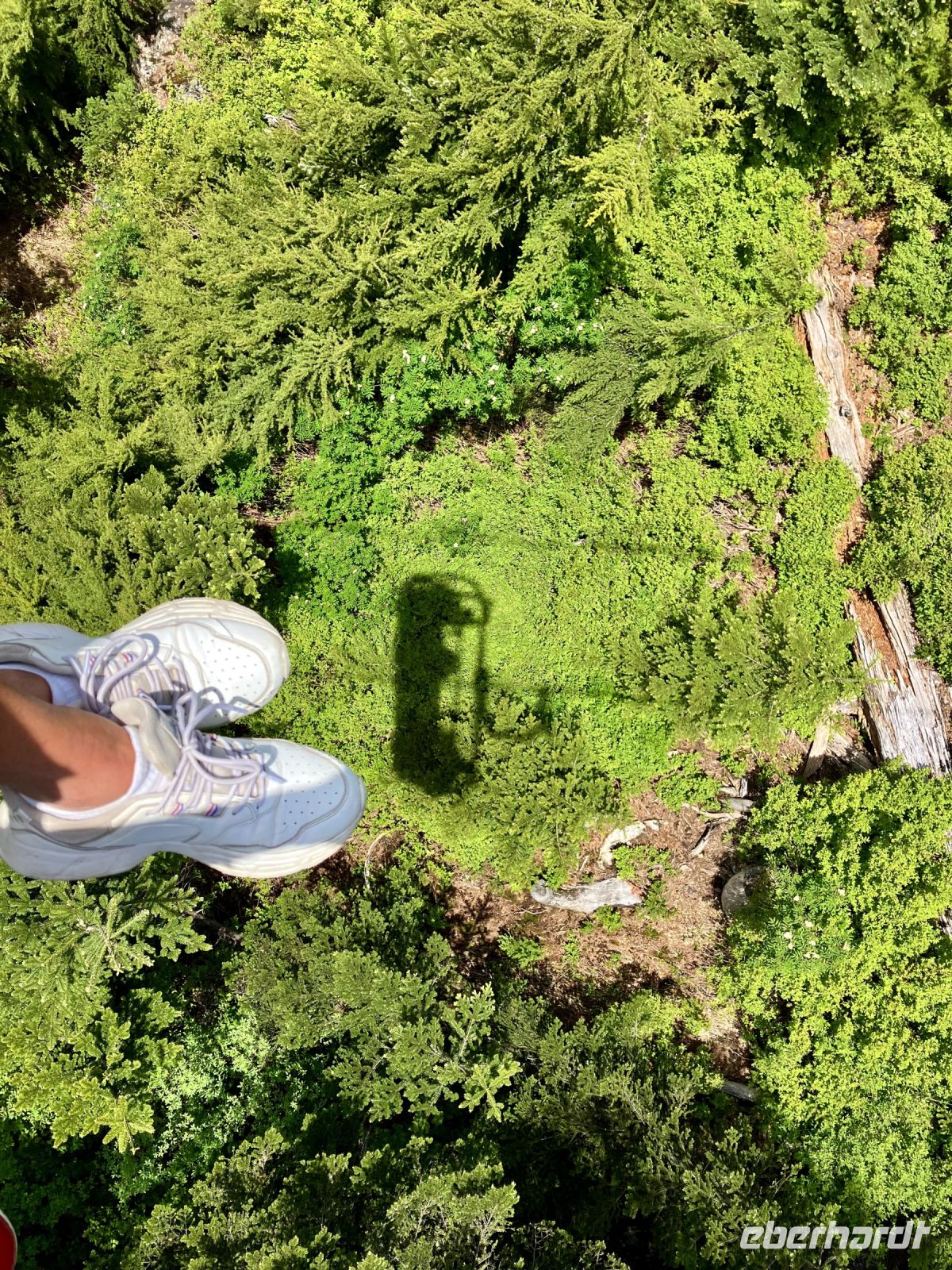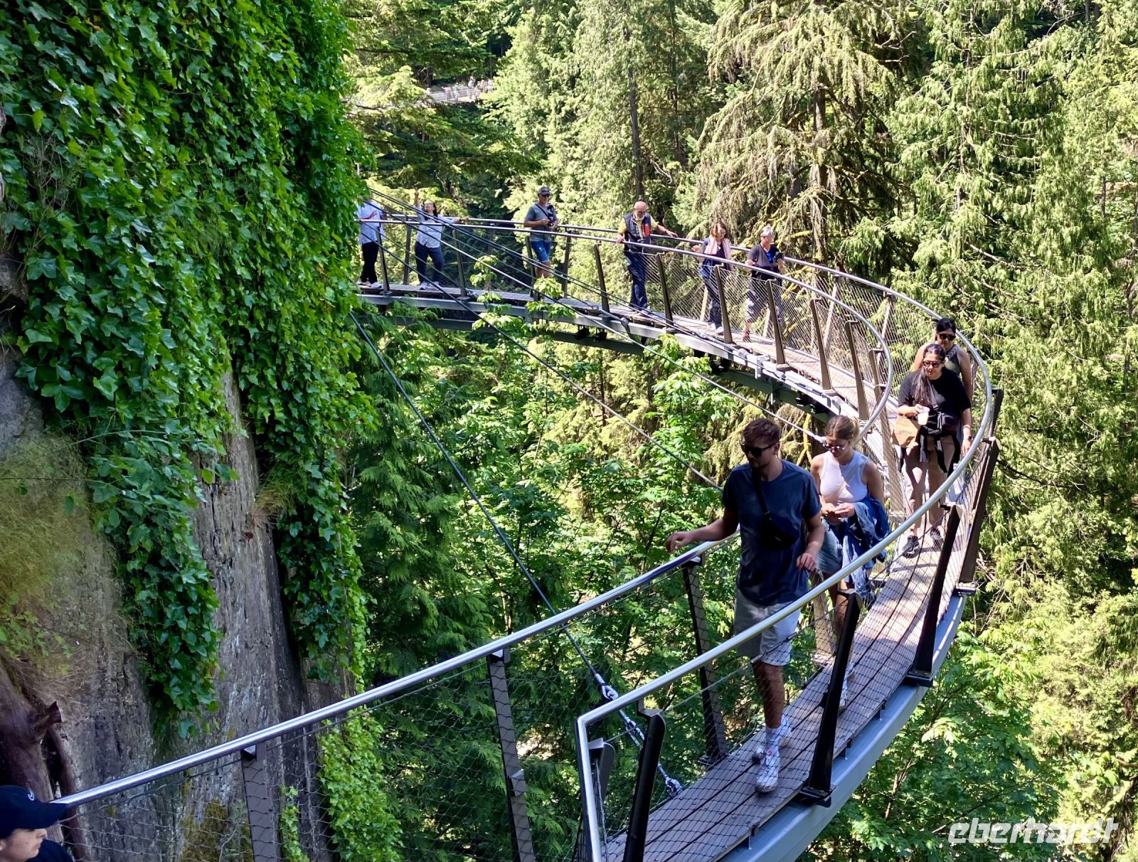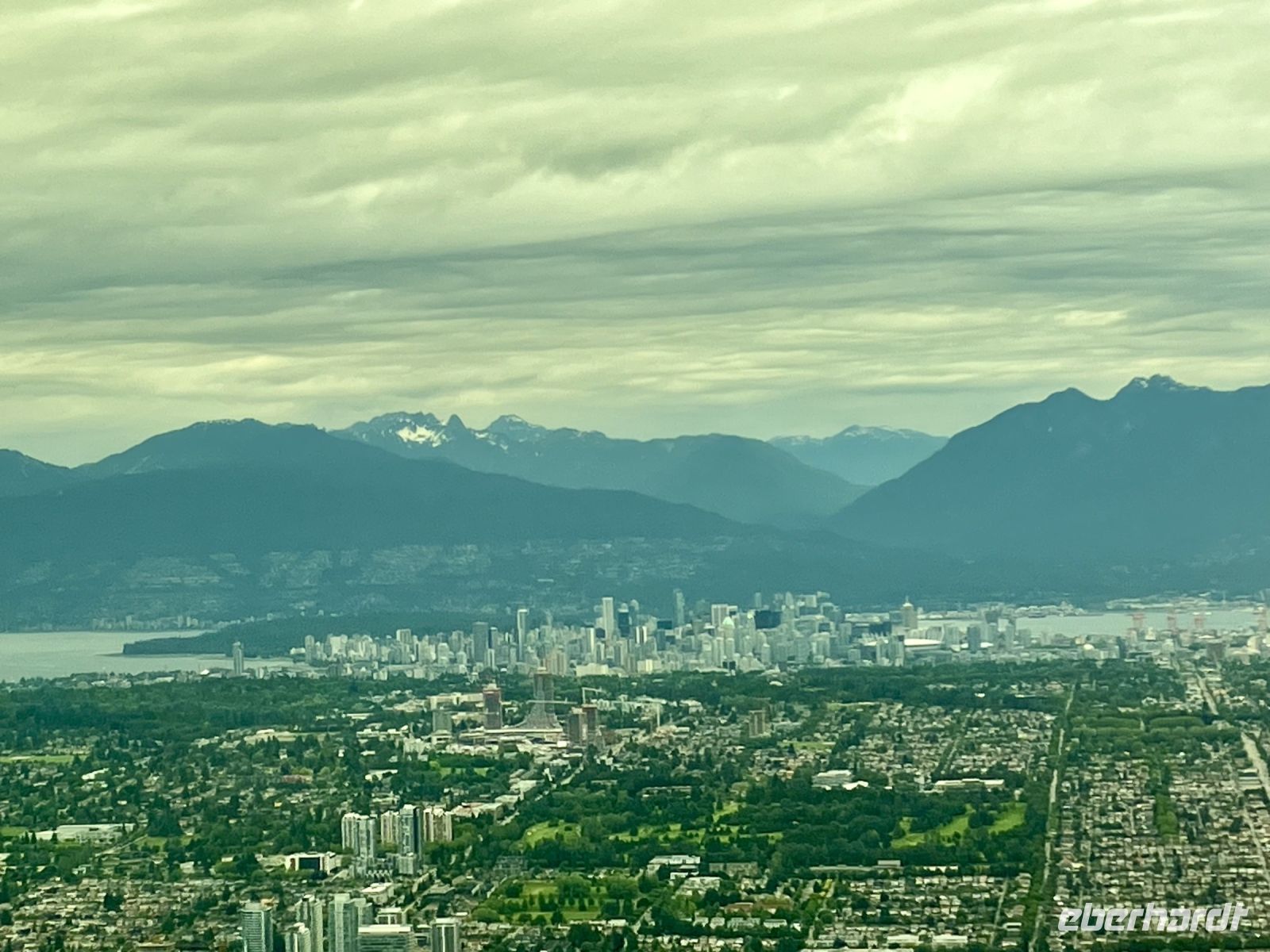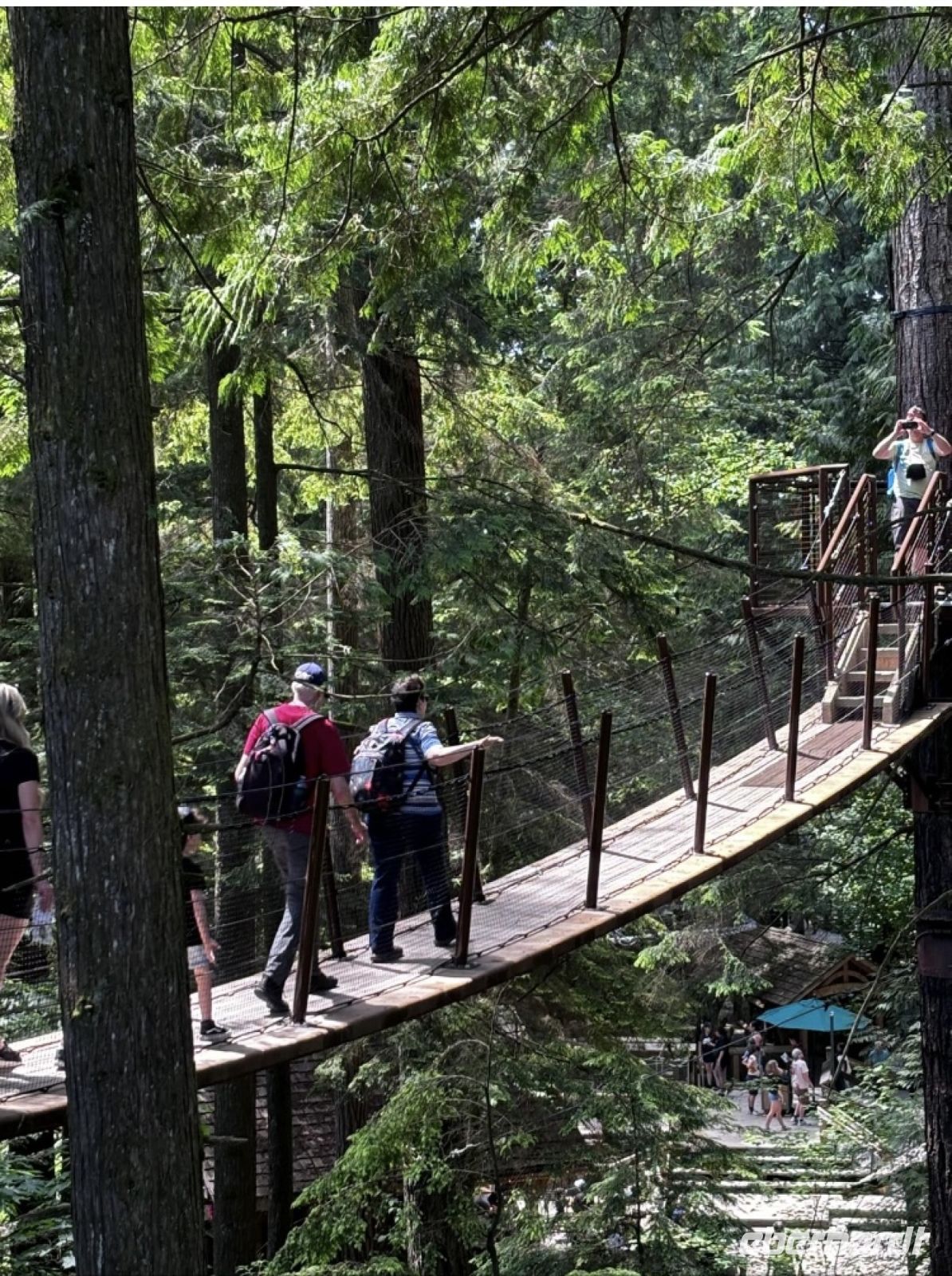 Nun fahren wir mit dem Bus weiter und besuchen die Capilano Haengebruecke. Man muss schon Mut aufbringen um sie durchzugehen, aber die Belohnung ist gross. Ein Baumwipfel-Weg fuehrt uns auf guter Hoehe von Baum zu Baum. Herrliche Aussichten lassen uns ahnen wie sich ein Weisskopfadler in diesem Lande fuehlt. Nun aber wieder ueber die Haengebruecke zurueck zum Shop und weiter auf den neuen Cliff Walk. Es ist ein Eisensteig der an einer sehr steilen Canyonwand angebracht ist. Auch hier trauen wir uns auf dieser furchterregenden Hoehe noch atmend vorwaerts zu gehen. Gelungen, also wieder zurueck zum Bus, denn das naechste Abenteuer wartet bereits. Wir schweben mit einer Gondel auf einen der 3 Hausberge. Grouse Mountain. Wir geniessen eine einmalige Sich auf die Stadt hinunter. Die Sonne lacht, es ist nun wirklich warm.