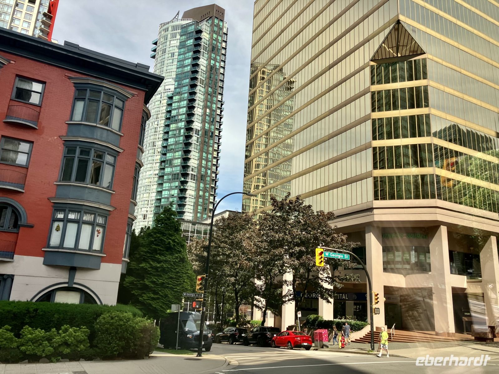 Nun aber ab auf die Faehre nach Vancouver wo wir auch gleich mit der Stadtrundfahrt starten. Vorerst kleinere Haeuser mit Gaertchen vorne und hinten wie so ueblich in Nord Amerika und dann gehts los mit den riesen Glasspalaesten. Als waere es eine Ausscheidung der besten Architekten. Alle bauen sie noch tollere und imposantere Wolkenkratzer aus Glass. Gedreht, geschwungen, wie eine Welle sich baeumend, auf Kabel haengend, nenn es, es gibt es. Wir fahren auch durch Chinatown und wollen gleich nach Gastown weiterfahren. Es ist der historische Teil Vancouvers.