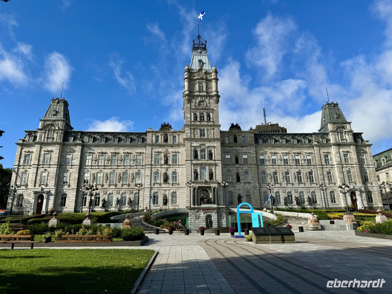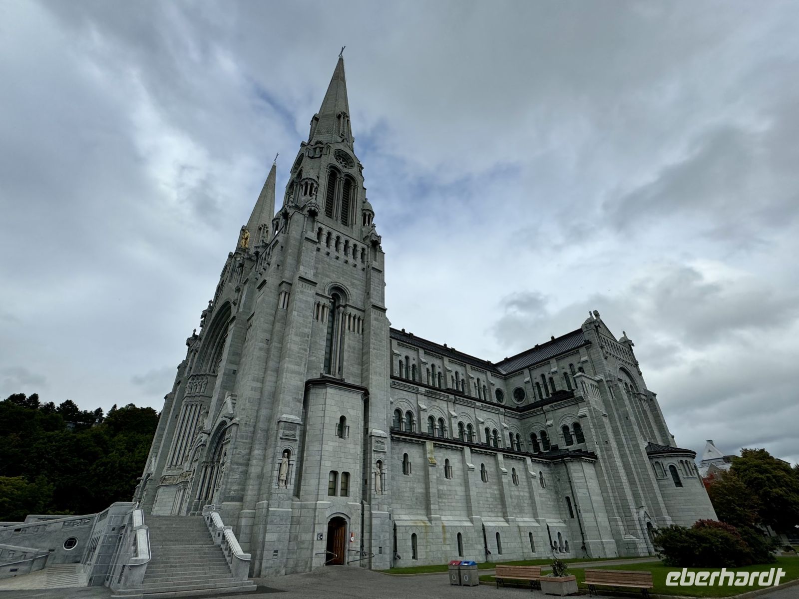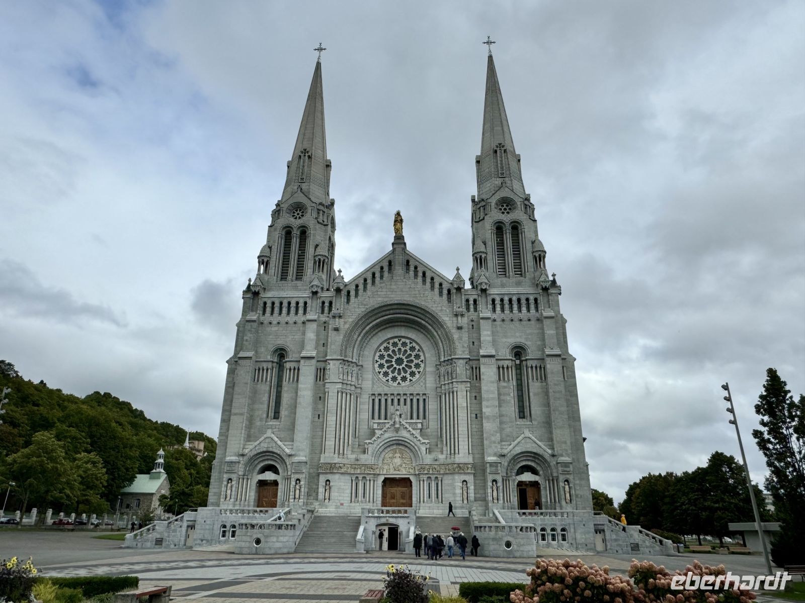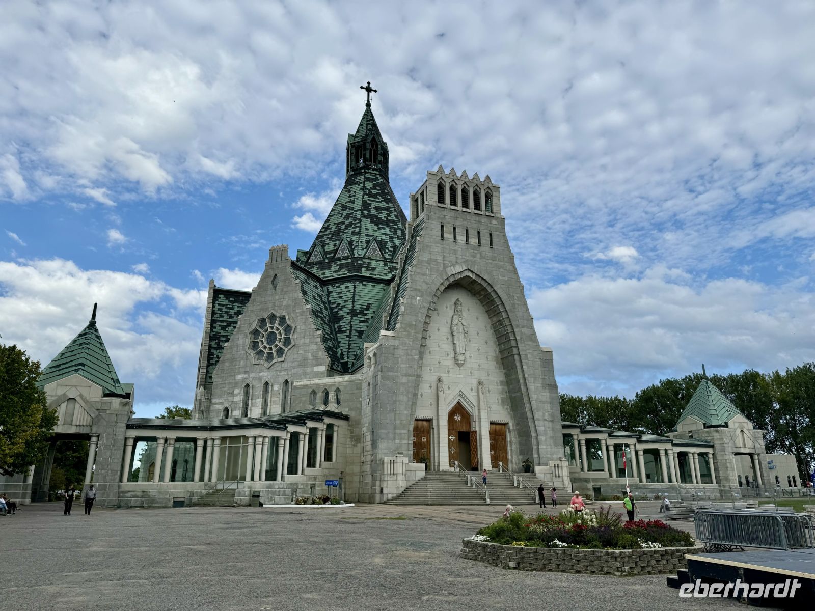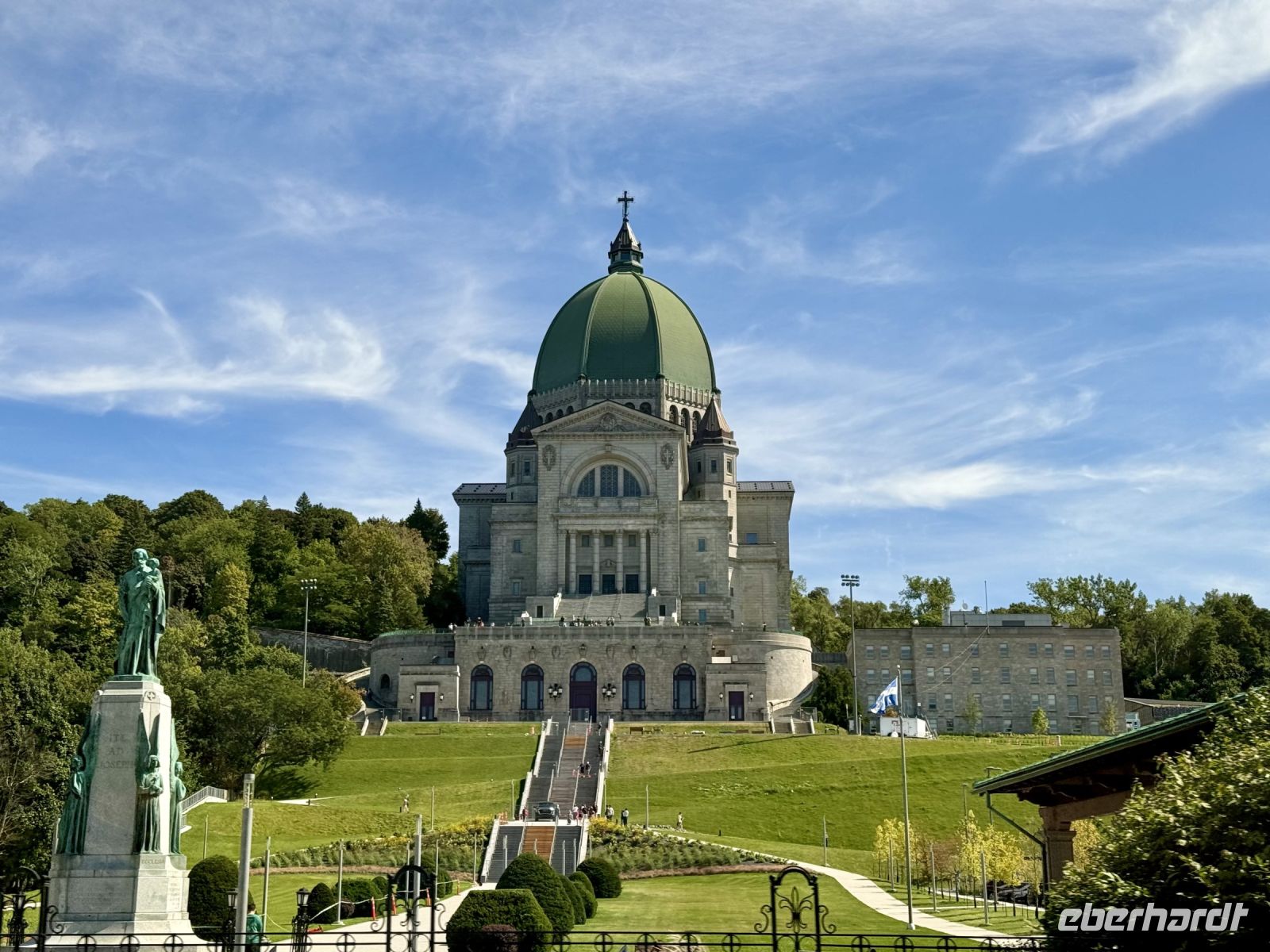 Louis gefällt unser Hotel auch sehr gut, weil er von seiner Wohnung nur fünf Minuten laufen musste. Unsere ersten positiven Eindrücke von Montréal wollen wir mit ihm auf der heutigen Stadtrundfahrt vertiefen. Am nahe gelegenen Dorcester Square steigen wir bereits das erste Mal wieder aus. Während Louis meinen Gästen die Denkmäler auf dem Platz und die umliegenden Gebäude erklärt, darunter das Sunlife Building und die Kathedralbasilika Marie-Reine-du-Monde, versuche ich, eines der vielen putzigen Eichhörnchen vor die Kameralinse zu bekommen. Vor dem Fairmont-Hotel, in dem das berühmte Bed-In von John Lennon und Yoko Ono stattfand, sammelt uns unser Busfahrer Warren wieder auf. Nun fahren wir auf die vorgelagerten Inseln, auf denen sich noch einige Gebäude der Expo 67 befinden. Doch erstmal begeben wir uns zu einem Aussichtspunkt am Wasser, der uns einen Blick auf die Altstadt gewährt. Wir werfen einen Blick in die Biosphère, den ehemaligen amerikanischen Pavillon der Weltausstellung. Auf der Formel-1-Rennstrecke findet gerade ein Fahrradrennen statt, weshalb wir nur bis zum Casino fahren und dabei aber zumindest einen Teil des Circuit Gilles Villeneuve zu Gesicht bekommen. Vorbei am Habitat 67 von Moshe Safdie geht es zurück in die Stadt. Den Abschluss unserer Tour mit Louis bildet ein Spaziergang durch das Zentrum vom World Trade Center mit einem Abschnitt der Berliner Mauer bis zur Place d’Armes vor der Kirche Notre-Dame de Montréal. Wir verabschieden uns hier von ihm und besichtigen dann mit einem Bild von Céline Dion vor unserem geistigen Auge den prächtigen Innenraum der katholischen Kathedrale. Nach etwas Freizeit in der Altstadt für die Mittagspause und eigene Erkundungen treffen wir uns am Marché Bonsecours für unsere Weiterfahrt nach Québec. Wir machen jedoch in Montréal noch einen Zwischenhalt am Olympiastadion, wo allerdings gerade die Renovierungsarbeiten in vollem Gange sind. Vom schönen Dach ist nur noch das Skelett übrig. Auch der Turm ist für uns tabu. Vor dem einsetzenden Regen fliehen wir wieder zu Warren in den Bus. Am Sanctuaire Notre-Dame du Cap hinter Trois-Rivière ist das Wetter wieder schön — ein weiteres Wunder? Oder liegt es daran, dass im Inneren der neuen Basilika gerade eine Messe stattfindet und die Teilnehmenden dort für Sonnenschein beten? Ein weiteres Mysterium. Für mich Ungläubigen öffnet Maria ihre Augen jedenfalls nicht. Wir setzen unsere Fahrt auf dem historischen Chemin du Roy parallel zum Sankt-Lorenz-Strom fort. Hübsche Anwesen und pittoreske Dörfer ziehen an uns vorbei. Hier ließe es sich gut leben mit Blick auf das Wasser. Den letzten Teil der Strecke legen wir auf dem Highway 40 zurück und erreichen unser nächstes Hotel in Québec am frühen Abend. Es liegt außerhalb der Stadtmauer am Rande der oberen Altstadt zwischen Parlament und den Plains of Abraham. Eine perfekte Lage für erste Erkundungen und dennoch recht ruhig. Wir freuen uns sehr auf den nächsten Tag, an dem wir die angeblich schönste Stadt Kanadas intensiv erkunden wollen.