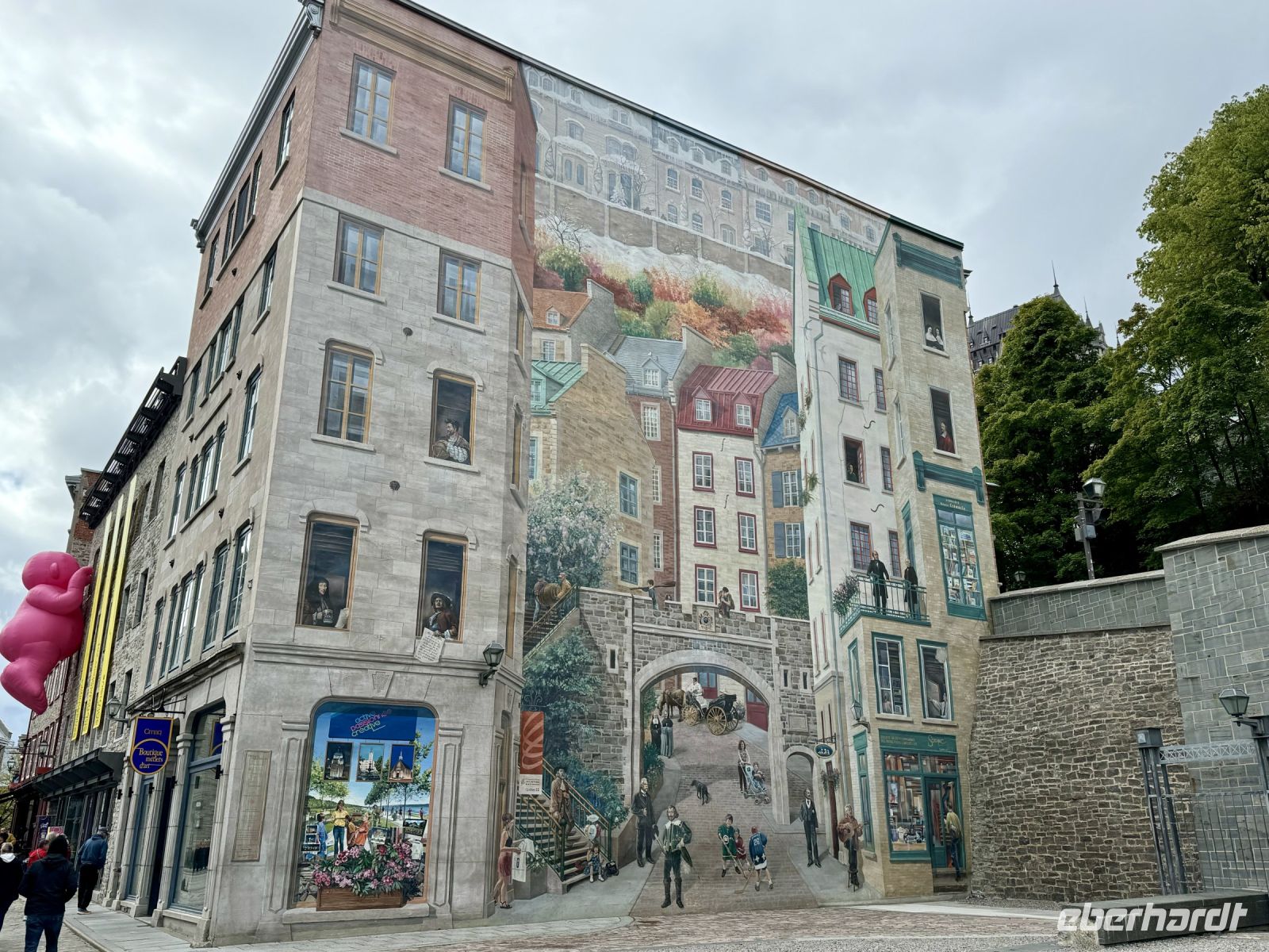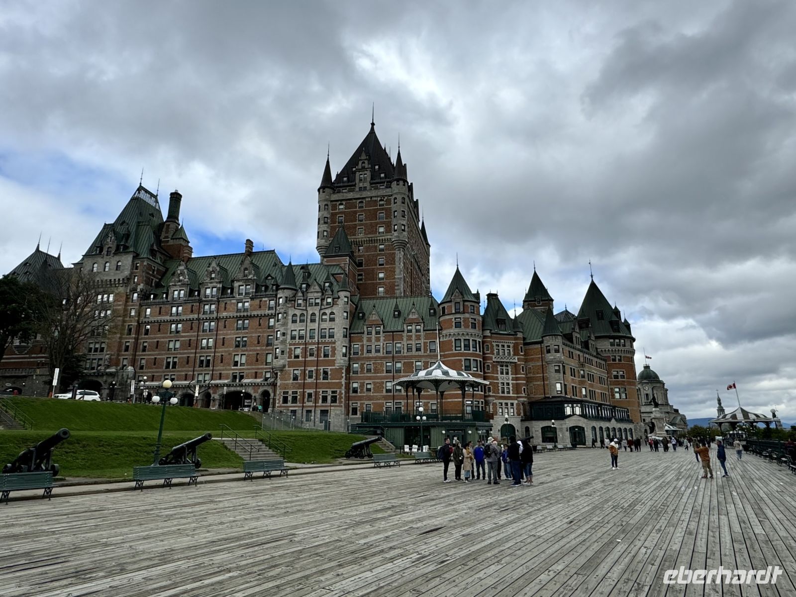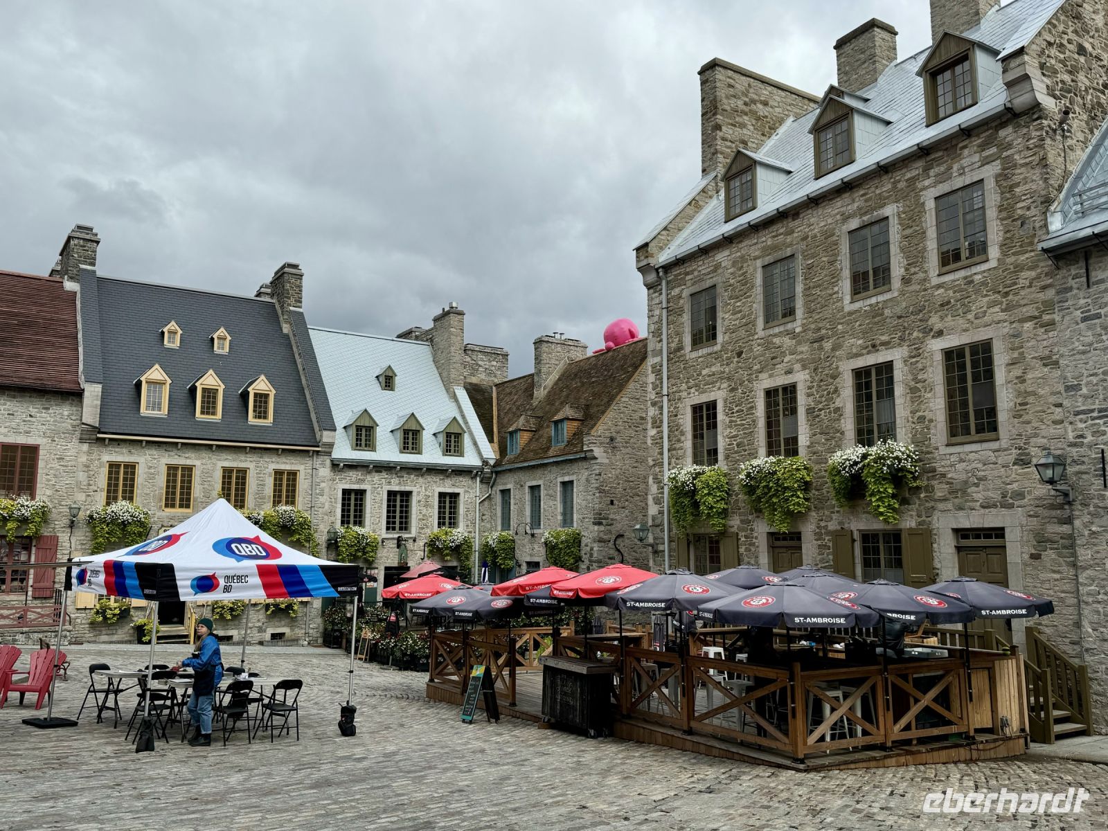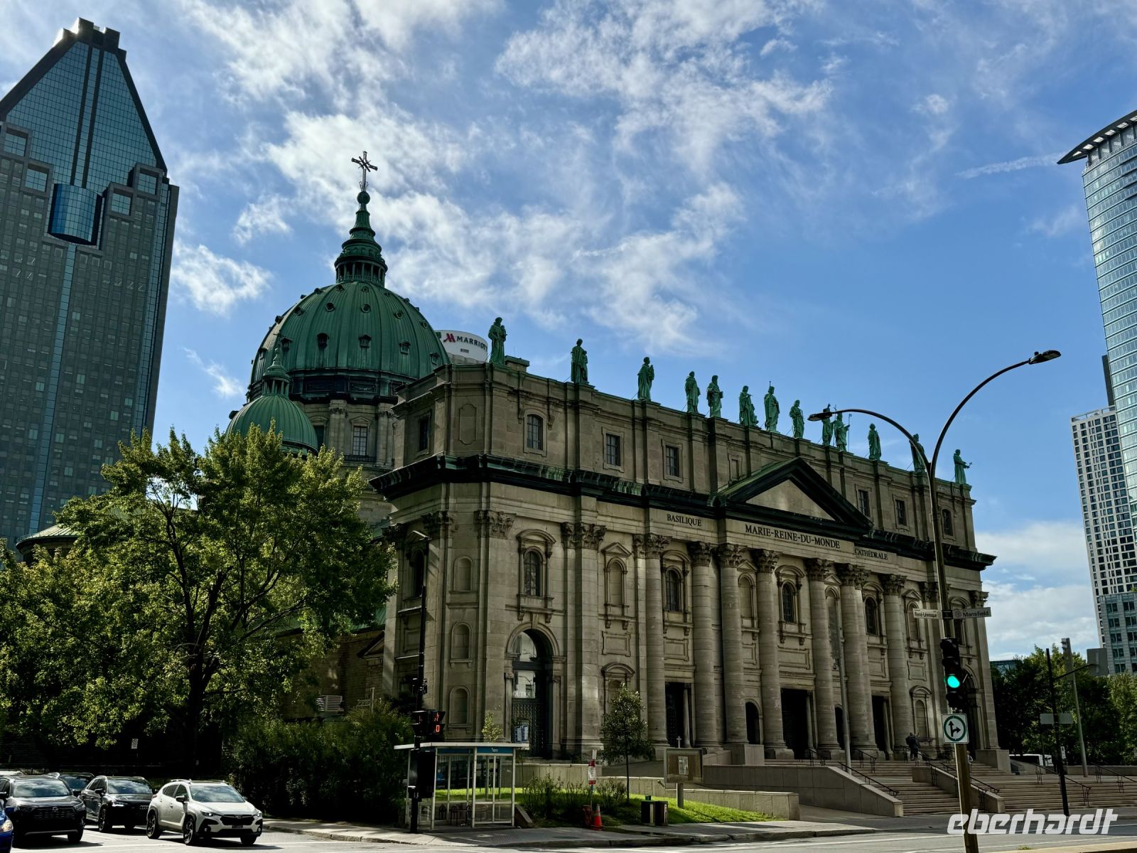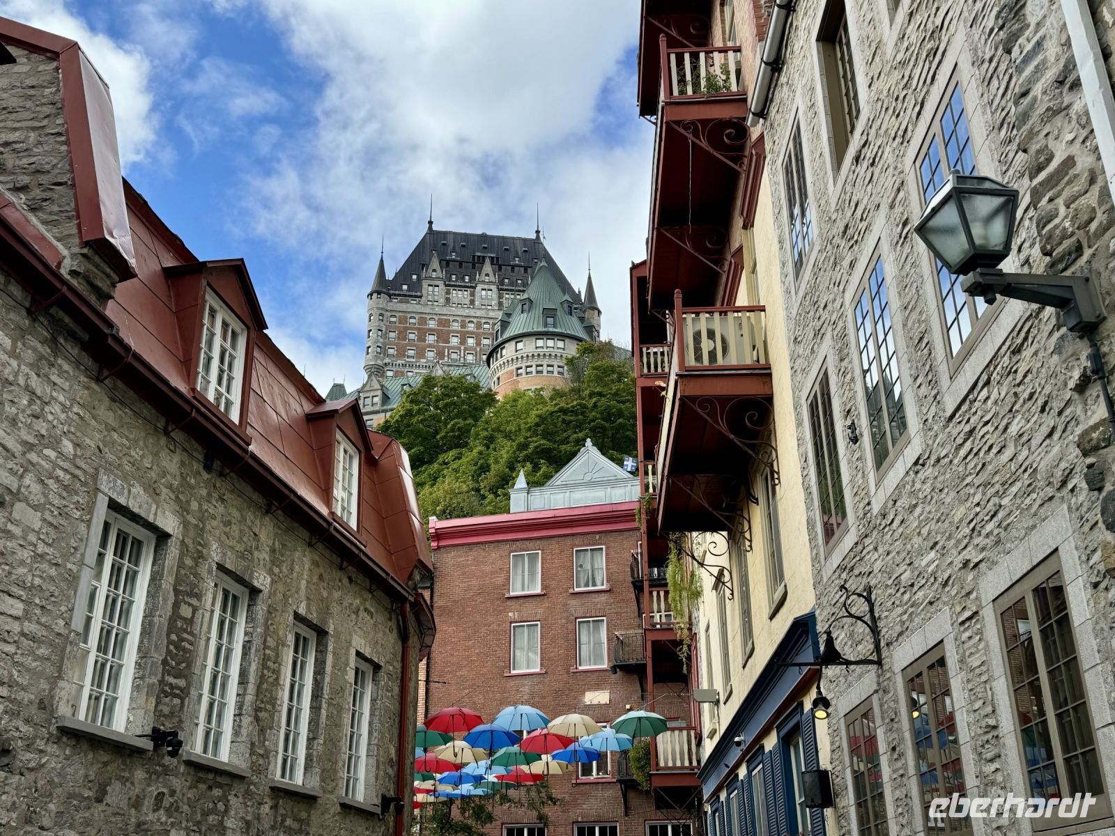 Louis gefällt unser Hotel auch sehr gut, weil er von seiner Wohnung nur fünf Minuten laufen musste. Unsere ersten positiven Eindrücke von Montréal wollen wir mit ihm auf der heutigen Stadtrundfahrt vertiefen. Am nahe gelegenen Dorcester Square steigen wir bereits das erste Mal wieder aus. Während Louis meinen Gästen die Denkmäler auf dem Platz und die umliegenden Gebäude erklärt, darunter das Sunlife Building und die Kathedralbasilika Marie-Reine-du-Monde, versuche ich, eines der vielen putzigen Eichhörnchen vor die Kameralinse zu bekommen. Vor dem Fairmont-Hotel, in dem das berühmte Bed-In von John Lennon und Yoko Ono stattfand, sammelt uns unser Busfahrer Warren wieder auf. Nun fahren wir auf die vorgelagerten Inseln, auf denen sich noch einige Gebäude der Expo 67 befinden. Doch erstmal begeben wir uns zu einem Aussichtspunkt am Wasser, der uns einen Blick auf die Altstadt gewährt. Wir werfen einen Blick in die Biosphère, den ehemaligen amerikanischen Pavillon der Weltausstellung. Auf der Formel-1-Rennstrecke findet gerade ein Fahrradrennen statt, weshalb wir nur bis zum Casino fahren und dabei aber zumindest einen Teil des Circuit Gilles Villeneuve zu Gesicht bekommen. Vorbei am Habitat 67 von Moshe Safdie geht es zurück in die Stadt. Den Abschluss unserer Tour mit Louis bildet ein Spaziergang durch das Zentrum vom World Trade Center mit einem Abschnitt der Berliner Mauer bis zur Place d’Armes vor der Kirche Notre-Dame de Montréal. Wir verabschieden uns hier von ihm und besichtigen dann mit einem Bild von Céline Dion vor unserem geistigen Auge den prächtigen Innenraum der katholischen Kathedrale. Nach etwas Freizeit in der Altstadt für die Mittagspause und eigene Erkundungen treffen wir uns am Marché Bonsecours für unsere Weiterfahrt nach Québec. Wir machen jedoch in Montréal noch einen Zwischenhalt am Olympiastadion, wo allerdings gerade die Renovierungsarbeiten in vollem Gange sind. Vom schönen Dach ist nur noch das Skelett übrig. Auch der Turm ist für uns tabu. Vor dem einsetzenden Regen fliehen wir wieder zu Warren in den Bus. Am Sanctuaire Notre-Dame du Cap hinter Trois-Rivière ist das Wetter wieder schön — ein weiteres Wunder? Oder liegt es daran, dass im Inneren der neuen Basilika gerade eine Messe stattfindet und die Teilnehmenden dort für Sonnenschein beten? Ein weiteres Mysterium. Für mich Ungläubigen öffnet Maria ihre Augen jedenfalls nicht. Wir setzen unsere Fahrt auf dem historischen Chemin du Roy parallel zum Sankt-Lorenz-Strom fort. Hübsche Anwesen und pittoreske Dörfer ziehen an uns vorbei. Hier ließe es sich gut leben mit Blick auf das Wasser. Den letzten Teil der Strecke legen wir auf dem Highway 40 zurück und erreichen unser nächstes Hotel in Québec am frühen Abend. Es liegt außerhalb der Stadtmauer am Rande der oberen Altstadt zwischen Parlament und den Plains of Abraham. Eine perfekte Lage für erste Erkundungen und dennoch recht ruhig. Wir freuen uns sehr auf den nächsten Tag, an dem wir die angeblich schönste Stadt Kanadas intensiv erkunden wollen.