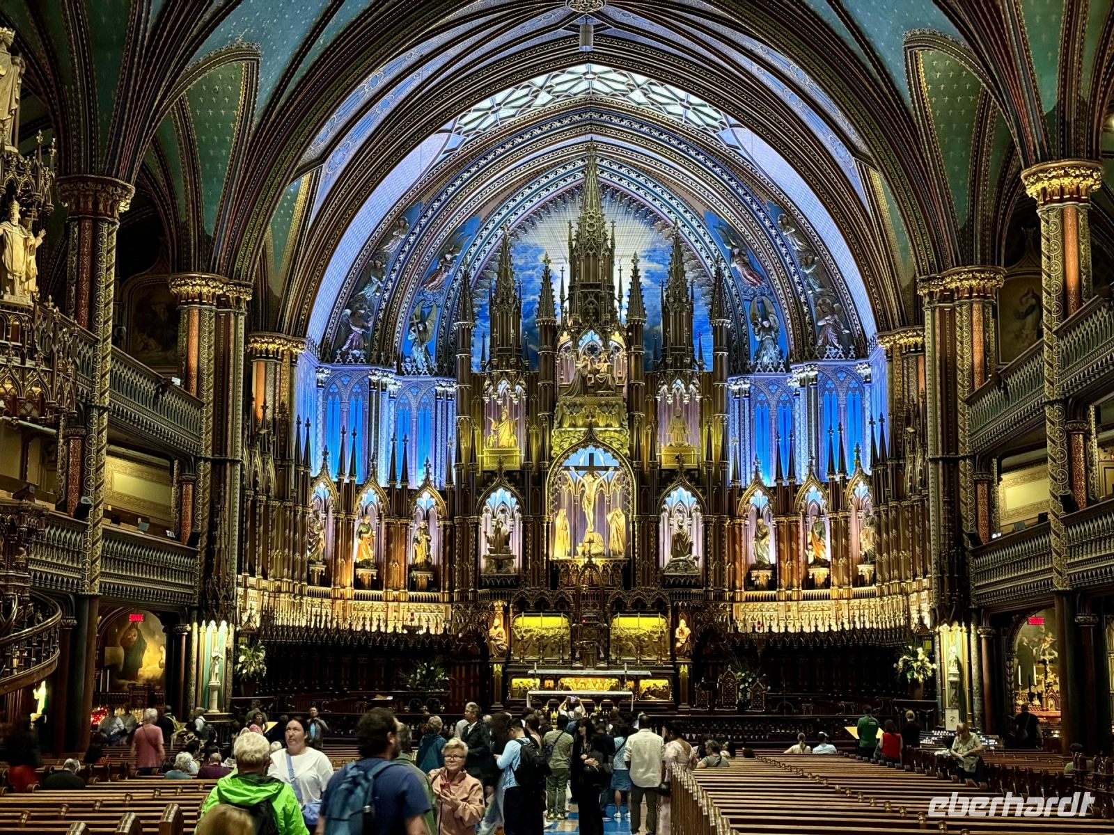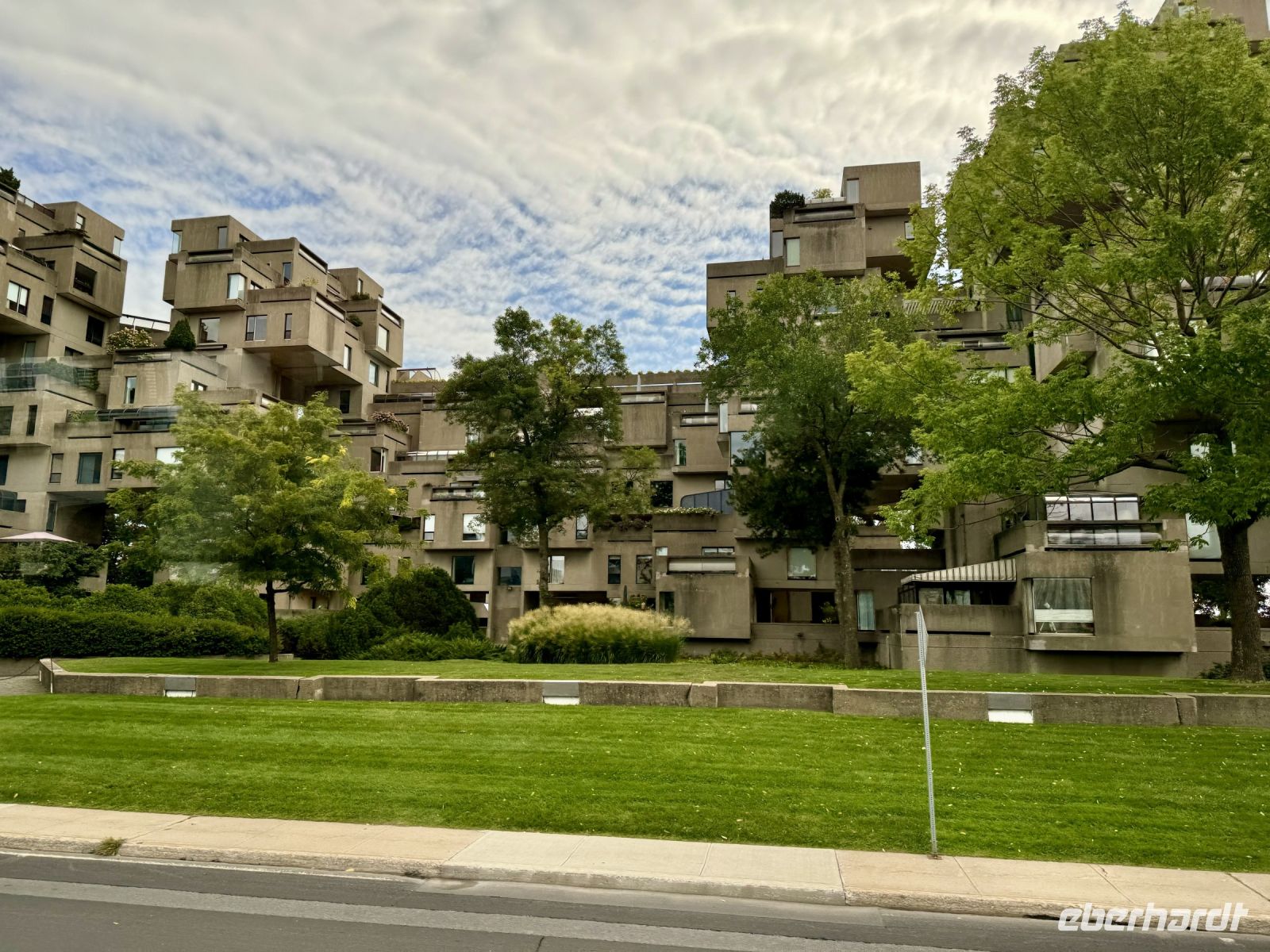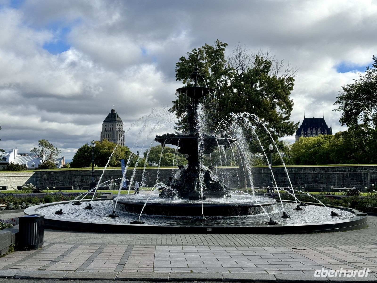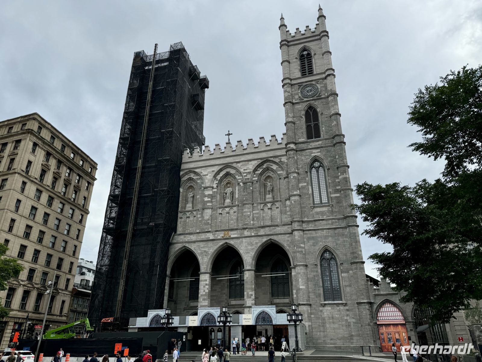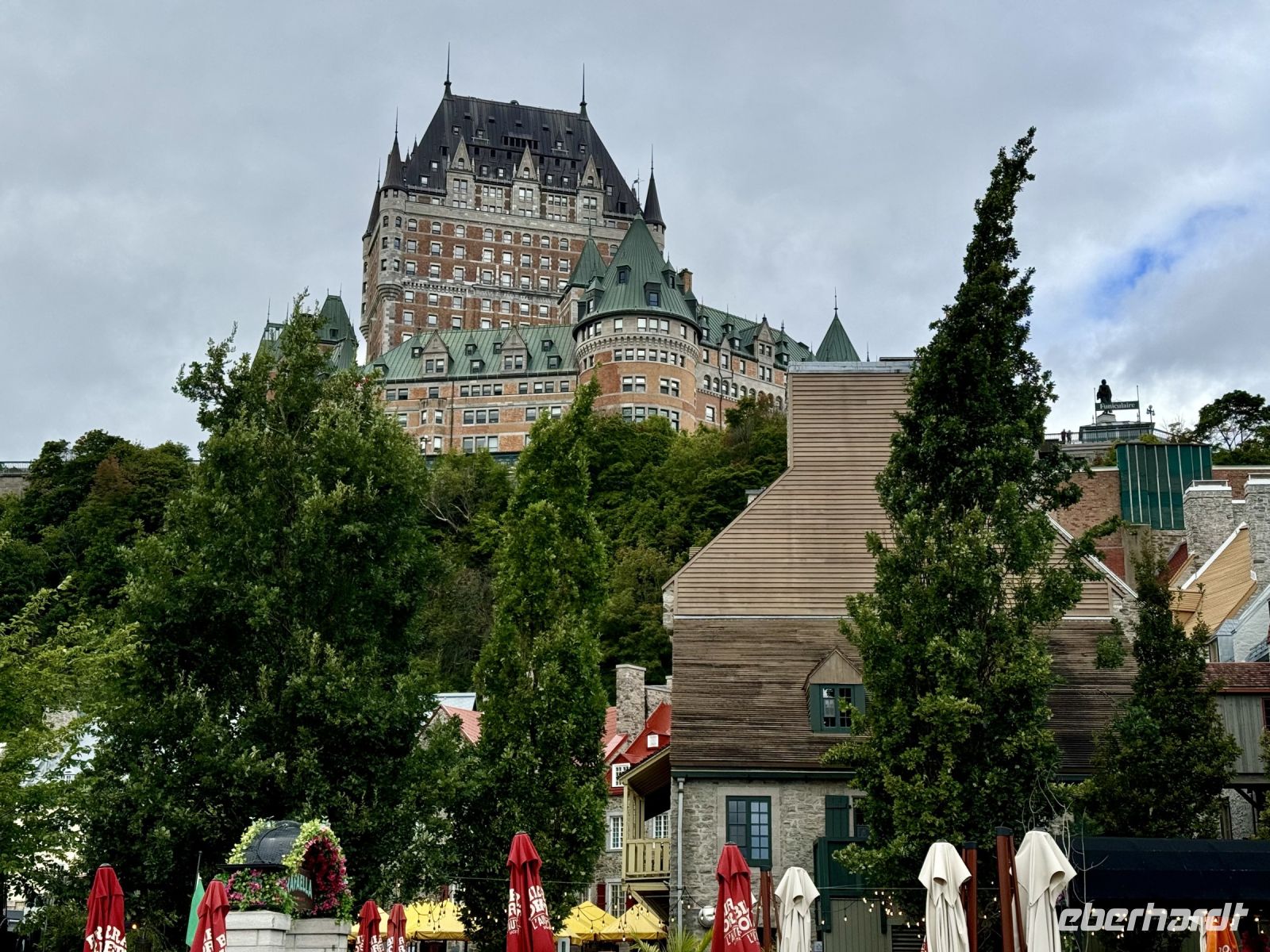 Louis gefällt unser Hotel auch sehr gut, weil er von seiner Wohnung nur fünf Minuten laufen musste. Unsere ersten positiven Eindrücke von Montréal wollen wir mit ihm auf der heutigen Stadtrundfahrt vertiefen. Am nahe gelegenen Dorcester Square steigen wir bereits das erste Mal wieder aus. Während Louis meinen Gästen die Denkmäler auf dem Platz und die umliegenden Gebäude erklärt, darunter das Sunlife Building und die Kathedralbasilika Marie-Reine-du-Monde, versuche ich, eines der vielen putzigen Eichhörnchen vor die Kameralinse zu bekommen. Vor dem Fairmont-Hotel, in dem das berühmte Bed-In von John Lennon und Yoko Ono stattfand, sammelt uns unser Busfahrer Warren wieder auf. Nun fahren wir auf die vorgelagerten Inseln, auf denen sich noch einige Gebäude der Expo 67 befinden. Doch erstmal begeben wir uns zu einem Aussichtspunkt am Wasser, der uns einen Blick auf die Altstadt gewährt. Wir werfen einen Blick in die Biosphère, den ehemaligen amerikanischen Pavillon der Weltausstellung. Auf der Formel-1-Rennstrecke findet gerade ein Fahrradrennen statt, weshalb wir nur bis zum Casino fahren und dabei aber zumindest einen Teil des Circuit Gilles Villeneuve zu Gesicht bekommen. Vorbei am Habitat 67 von Moshe Safdie geht es zurück in die Stadt. Den Abschluss unserer Tour mit Louis bildet ein Spaziergang durch das Zentrum vom World Trade Center mit einem Abschnitt der Berliner Mauer bis zur Place d’Armes vor der Kirche Notre-Dame de Montréal. Wir verabschieden uns hier von ihm und besichtigen dann mit einem Bild von Céline Dion vor unserem geistigen Auge den prächtigen Innenraum der katholischen Kathedrale. Nach etwas Freizeit in der Altstadt für die Mittagspause und eigene Erkundungen treffen wir uns am Marché Bonsecours für unsere Weiterfahrt nach Québec. Wir machen jedoch in Montréal noch einen Zwischenhalt am Olympiastadion, wo allerdings gerade die Renovierungsarbeiten in vollem Gange sind. Vom schönen Dach ist nur noch das Skelett übrig. Auch der Turm ist für uns tabu. Vor dem einsetzenden Regen fliehen wir wieder zu Warren in den Bus. Am Sanctuaire Notre-Dame du Cap hinter Trois-Rivière ist das Wetter wieder schön — ein weiteres Wunder? Oder liegt es daran, dass im Inneren der neuen Basilika gerade eine Messe stattfindet und die Teilnehmenden dort für Sonnenschein beten? Ein weiteres Mysterium. Für mich Ungläubigen öffnet Maria ihre Augen jedenfalls nicht. Wir setzen unsere Fahrt auf dem historischen Chemin du Roy parallel zum Sankt-Lorenz-Strom fort. Hübsche Anwesen und pittoreske Dörfer ziehen an uns vorbei. Hier ließe es sich gut leben mit Blick auf das Wasser. Den letzten Teil der Strecke legen wir auf dem Highway 40 zurück und erreichen unser nächstes Hotel in Québec am frühen Abend. Es liegt außerhalb der Stadtmauer am Rande der oberen Altstadt zwischen Parlament und den Plains of Abraham. Eine perfekte Lage für erste Erkundungen und dennoch recht ruhig. Wir freuen uns sehr auf den nächsten Tag, an dem wir die angeblich schönste Stadt Kanadas intensiv erkunden wollen.