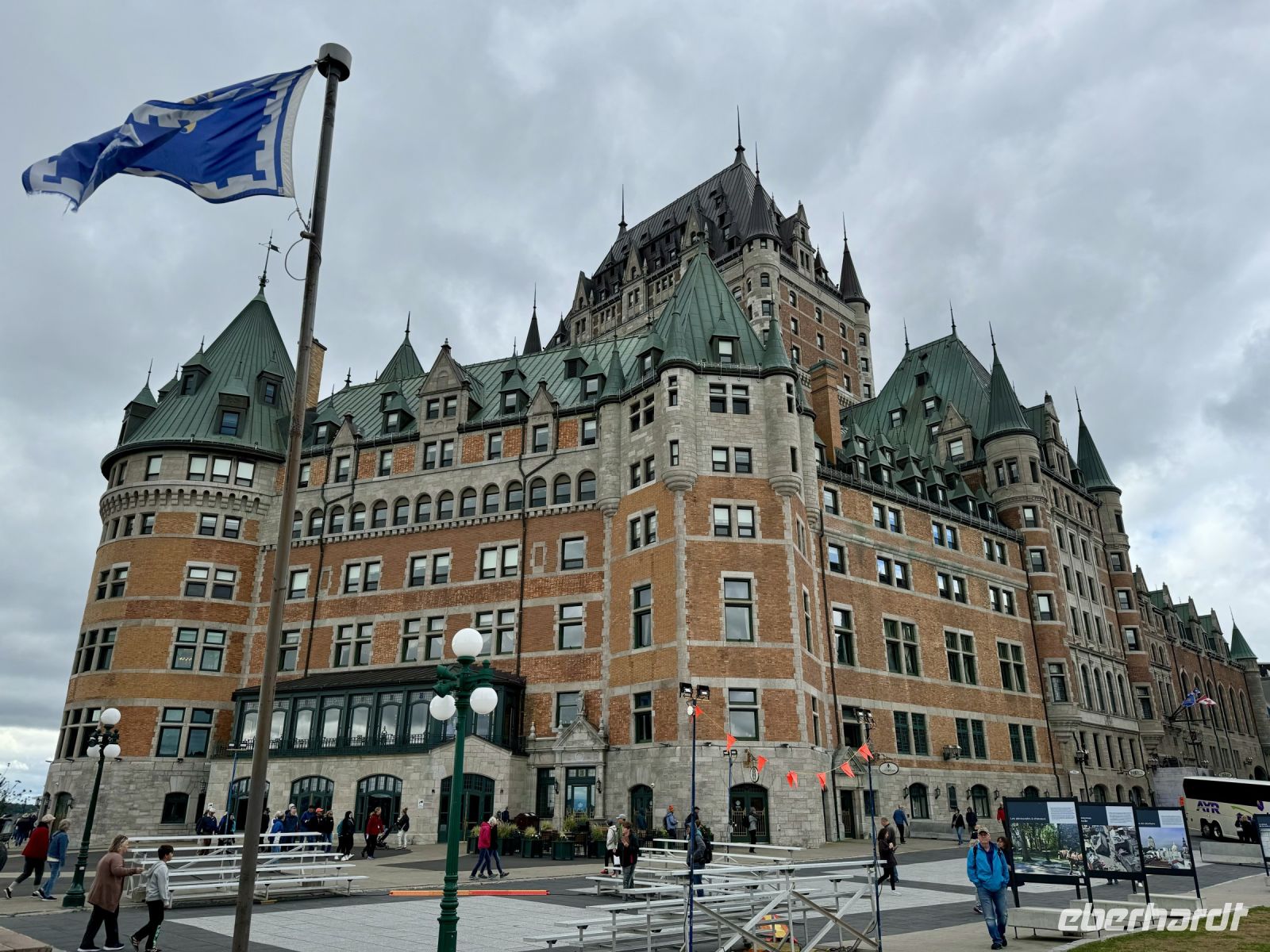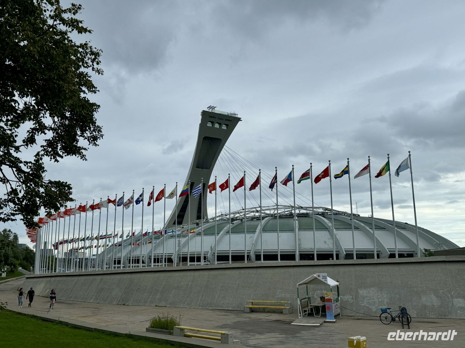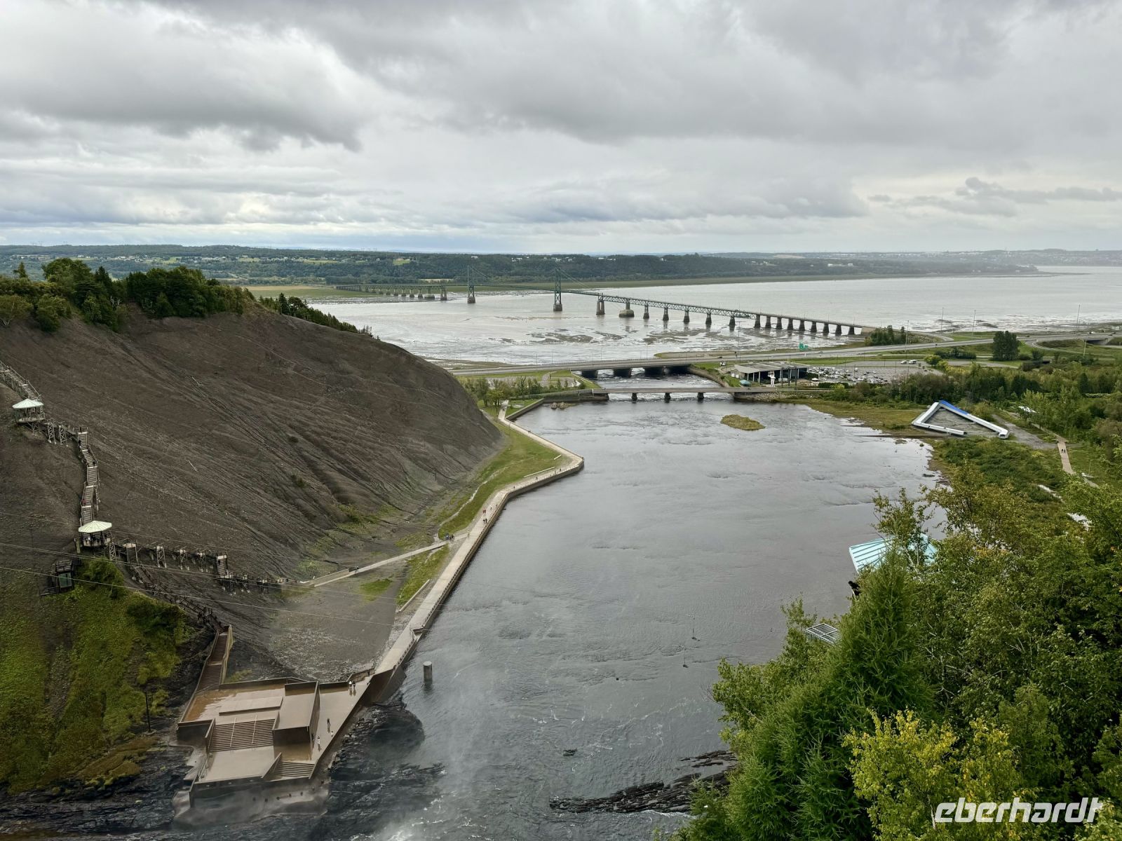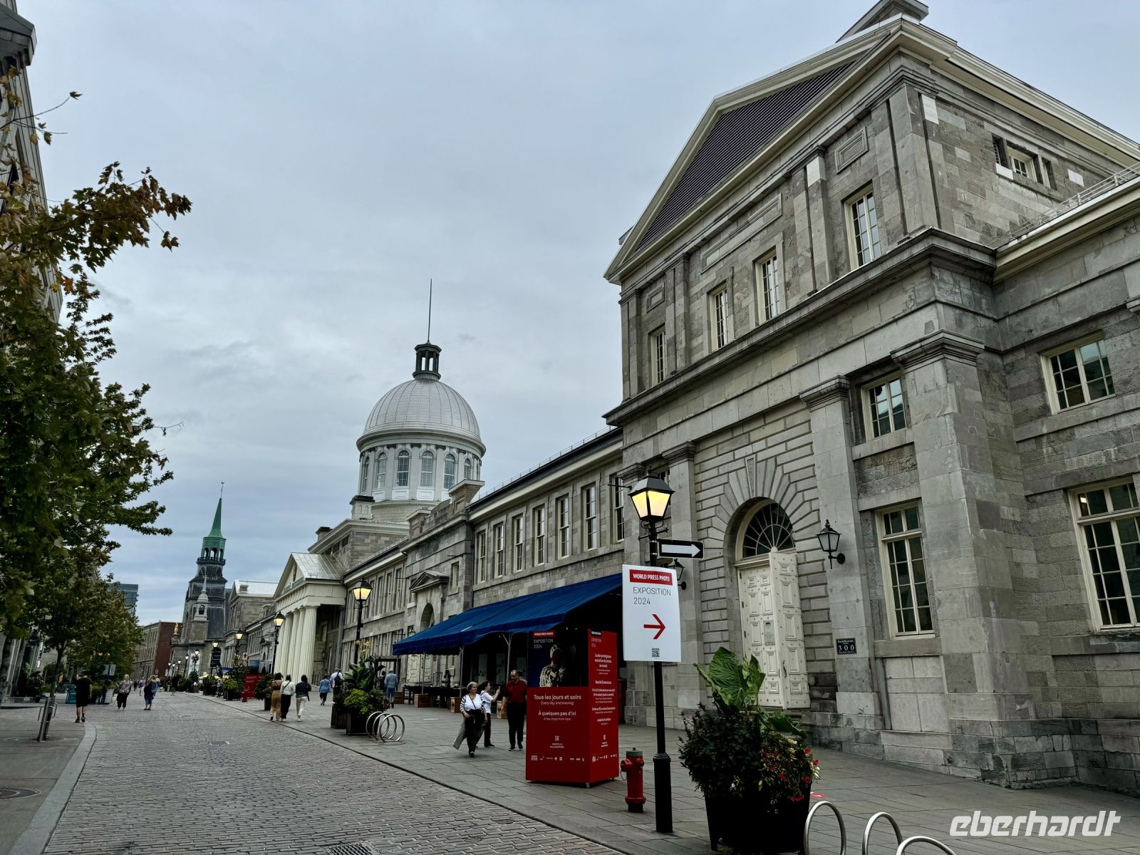 Louis gefällt unser Hotel auch sehr gut, weil er von seiner Wohnung nur fünf Minuten laufen musste. Unsere ersten positiven Eindrücke von Montréal wollen wir mit ihm auf der heutigen Stadtrundfahrt vertiefen. Am nahe gelegenen Dorcester Square steigen wir bereits das erste Mal wieder aus. Während Louis meinen Gästen die Denkmäler auf dem Platz und die umliegenden Gebäude erklärt, darunter das Sunlife Building und die Kathedralbasilika Marie-Reine-du-Monde, versuche ich, eines der vielen putzigen Eichhörnchen vor die Kameralinse zu bekommen. Vor dem Fairmont-Hotel, in dem das berühmte Bed-In von John Lennon und Yoko Ono stattfand, sammelt uns unser Busfahrer Warren wieder auf. Nun fahren wir auf die vorgelagerten Inseln, auf denen sich noch einige Gebäude der Expo 67 befinden. Doch erstmal begeben wir uns zu einem Aussichtspunkt am Wasser, der uns einen Blick auf die Altstadt gewährt. Wir werfen einen Blick in die Biosphère, den ehemaligen amerikanischen Pavillon der Weltausstellung. Auf der Formel-1-Rennstrecke findet gerade ein Fahrradrennen statt, weshalb wir nur bis zum Casino fahren und dabei aber zumindest einen Teil des Circuit Gilles Villeneuve zu Gesicht bekommen. Vorbei am Habitat 67 von Moshe Safdie geht es zurück in die Stadt. Den Abschluss unserer Tour mit Louis bildet ein Spaziergang durch das Zentrum vom World Trade Center mit einem Abschnitt der Berliner Mauer bis zur Place d’Armes vor der Kirche Notre-Dame de Montréal. Wir verabschieden uns hier von ihm und besichtigen dann mit einem Bild von Céline Dion vor unserem geistigen Auge den prächtigen Innenraum der katholischen Kathedrale. Nach etwas Freizeit in der Altstadt für die Mittagspause und eigene Erkundungen treffen wir uns am Marché Bonsecours für unsere Weiterfahrt nach Québec. Wir machen jedoch in Montréal noch einen Zwischenhalt am Olympiastadion, wo allerdings gerade die Renovierungsarbeiten in vollem Gange sind. Vom schönen Dach ist nur noch das Skelett übrig. Auch der Turm ist für uns tabu. Vor dem einsetzenden Regen fliehen wir wieder zu Warren in den Bus. Am Sanctuaire Notre-Dame du Cap hinter Trois-Rivière ist das Wetter wieder schön — ein weiteres Wunder? Oder liegt es daran, dass im Inneren der neuen Basilika gerade eine Messe stattfindet und die Teilnehmenden dort für Sonnenschein beten? Ein weiteres Mysterium. Für mich Ungläubigen öffnet Maria ihre Augen jedenfalls nicht. Wir setzen unsere Fahrt auf dem historischen Chemin du Roy parallel zum Sankt-Lorenz-Strom fort. Hübsche Anwesen und pittoreske Dörfer ziehen an uns vorbei. Hier ließe es sich gut leben mit Blick auf das Wasser. Den letzten Teil der Strecke legen wir auf dem Highway 40 zurück und erreichen unser nächstes Hotel in Québec am frühen Abend. Es liegt außerhalb der Stadtmauer am Rande der oberen Altstadt zwischen Parlament und den Plains of Abraham. Eine perfekte Lage für erste Erkundungen und dennoch recht ruhig. Wir freuen uns sehr auf den nächsten Tag, an dem wir die angeblich schönste Stadt Kanadas intensiv erkunden wollen.