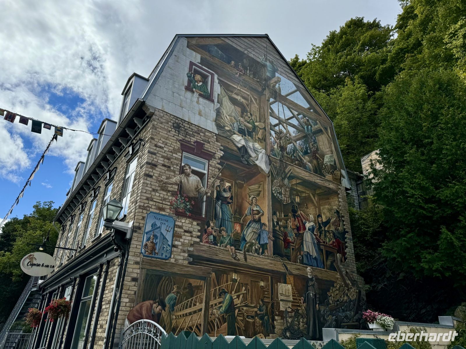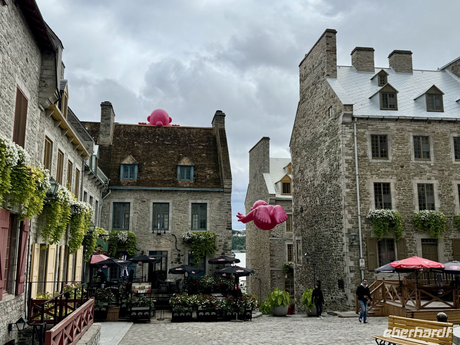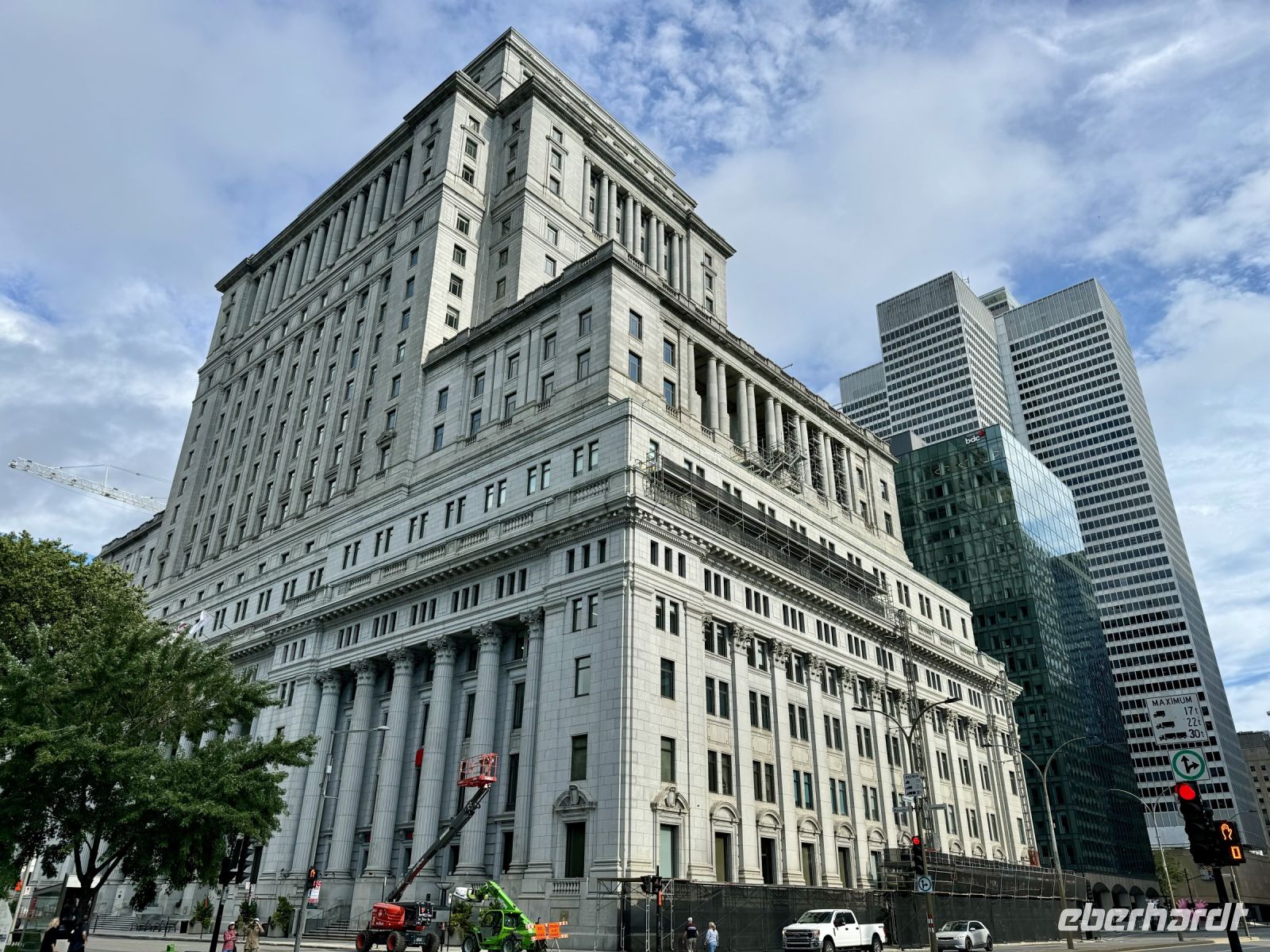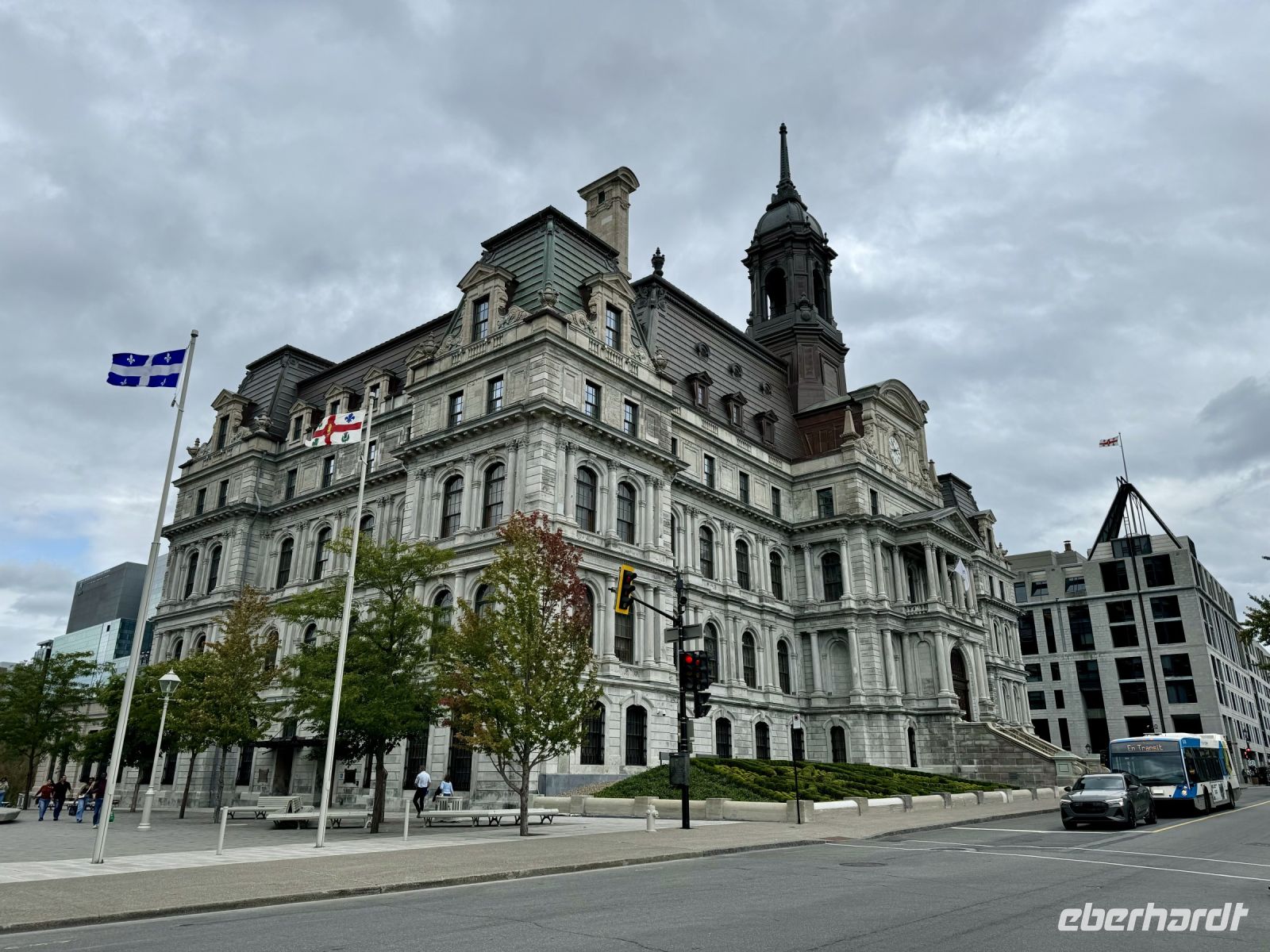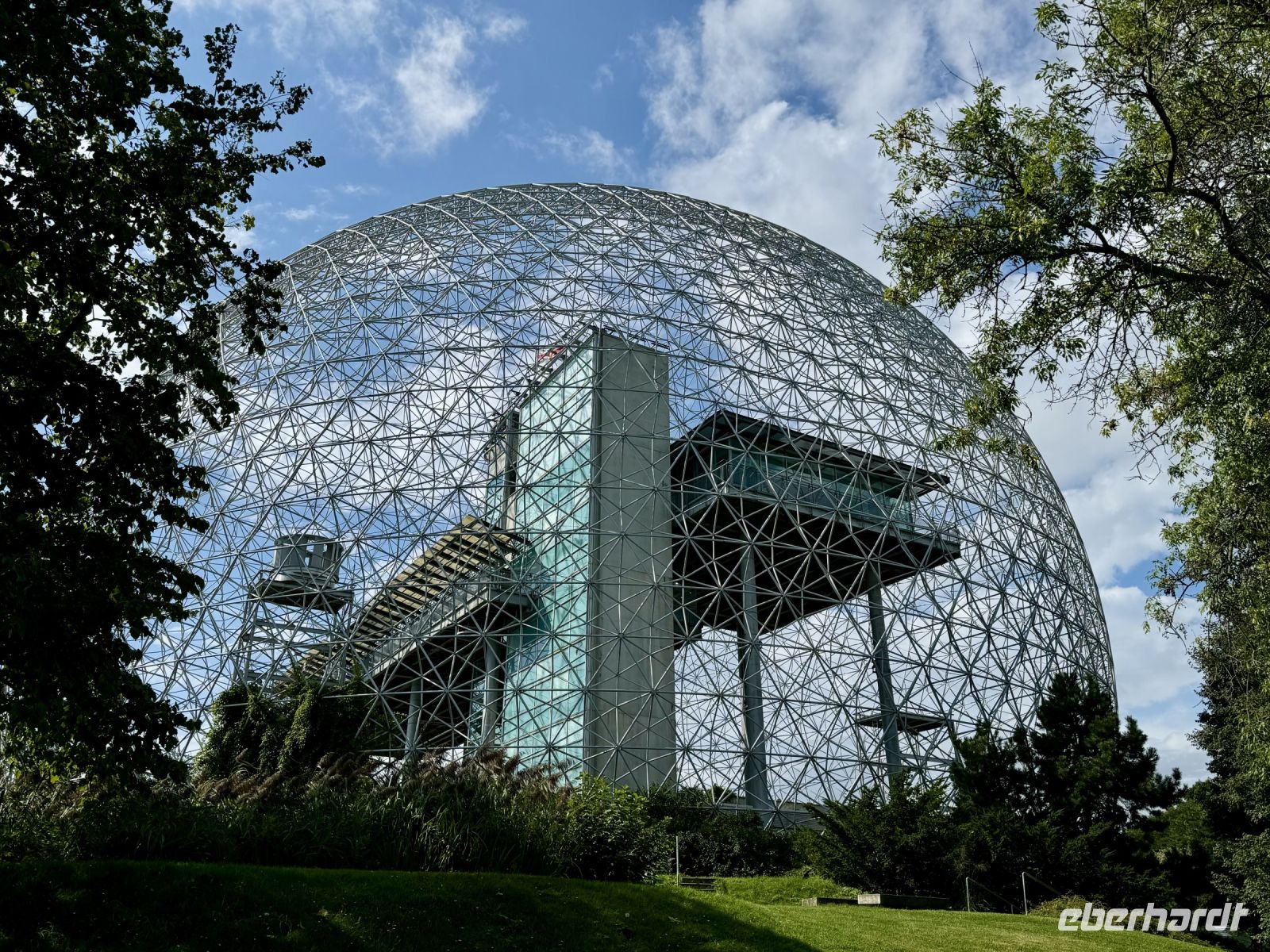 Louis gefällt unser Hotel auch sehr gut, weil er von seiner Wohnung nur fünf Minuten laufen musste. Unsere ersten positiven Eindrücke von Montréal wollen wir mit ihm auf der heutigen Stadtrundfahrt vertiefen. Am nahe gelegenen Dorcester Square steigen wir bereits das erste Mal wieder aus. Während Louis meinen Gästen die Denkmäler auf dem Platz und die umliegenden Gebäude erklärt, darunter das Sunlife Building und die Kathedralbasilika Marie-Reine-du-Monde, versuche ich, eines der vielen putzigen Eichhörnchen vor die Kameralinse zu bekommen. Vor dem Fairmont-Hotel, in dem das berühmte Bed-In von John Lennon und Yoko Ono stattfand, sammelt uns unser Busfahrer Warren wieder auf. Nun fahren wir auf die vorgelagerten Inseln, auf denen sich noch einige Gebäude der Expo 67 befinden. Doch erstmal begeben wir uns zu einem Aussichtspunkt am Wasser, der uns einen Blick auf die Altstadt gewährt. Wir werfen einen Blick in die Biosphère, den ehemaligen amerikanischen Pavillon der Weltausstellung. Auf der Formel-1-Rennstrecke findet gerade ein Fahrradrennen statt, weshalb wir nur bis zum Casino fahren und dabei aber zumindest einen Teil des Circuit Gilles Villeneuve zu Gesicht bekommen. Vorbei am Habitat 67 von Moshe Safdie geht es zurück in die Stadt. Den Abschluss unserer Tour mit Louis bildet ein Spaziergang durch das Zentrum vom World Trade Center mit einem Abschnitt der Berliner Mauer bis zur Place d’Armes vor der Kirche Notre-Dame de Montréal. Wir verabschieden uns hier von ihm und besichtigen dann mit einem Bild von Céline Dion vor unserem geistigen Auge den prächtigen Innenraum der katholischen Kathedrale. Nach etwas Freizeit in der Altstadt für die Mittagspause und eigene Erkundungen treffen wir uns am Marché Bonsecours für unsere Weiterfahrt nach Québec. Wir machen jedoch in Montréal noch einen Zwischenhalt am Olympiastadion, wo allerdings gerade die Renovierungsarbeiten in vollem Gange sind. Vom schönen Dach ist nur noch das Skelett übrig. Auch der Turm ist für uns tabu. Vor dem einsetzenden Regen fliehen wir wieder zu Warren in den Bus. Am Sanctuaire Notre-Dame du Cap hinter Trois-Rivière ist das Wetter wieder schön — ein weiteres Wunder? Oder liegt es daran, dass im Inneren der neuen Basilika gerade eine Messe stattfindet und die Teilnehmenden dort für Sonnenschein beten? Ein weiteres Mysterium. Für mich Ungläubigen öffnet Maria ihre Augen jedenfalls nicht. Wir setzen unsere Fahrt auf dem historischen Chemin du Roy parallel zum Sankt-Lorenz-Strom fort. Hübsche Anwesen und pittoreske Dörfer ziehen an uns vorbei. Hier ließe es sich gut leben mit Blick auf das Wasser. Den letzten Teil der Strecke legen wir auf dem Highway 40 zurück und erreichen unser nächstes Hotel in Québec am frühen Abend. Es liegt außerhalb der Stadtmauer am Rande der oberen Altstadt zwischen Parlament und den Plains of Abraham. Eine perfekte Lage für erste Erkundungen und dennoch recht ruhig. Wir freuen uns sehr auf den nächsten Tag, an dem wir die angeblich schönste Stadt Kanadas intensiv erkunden wollen.