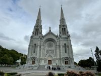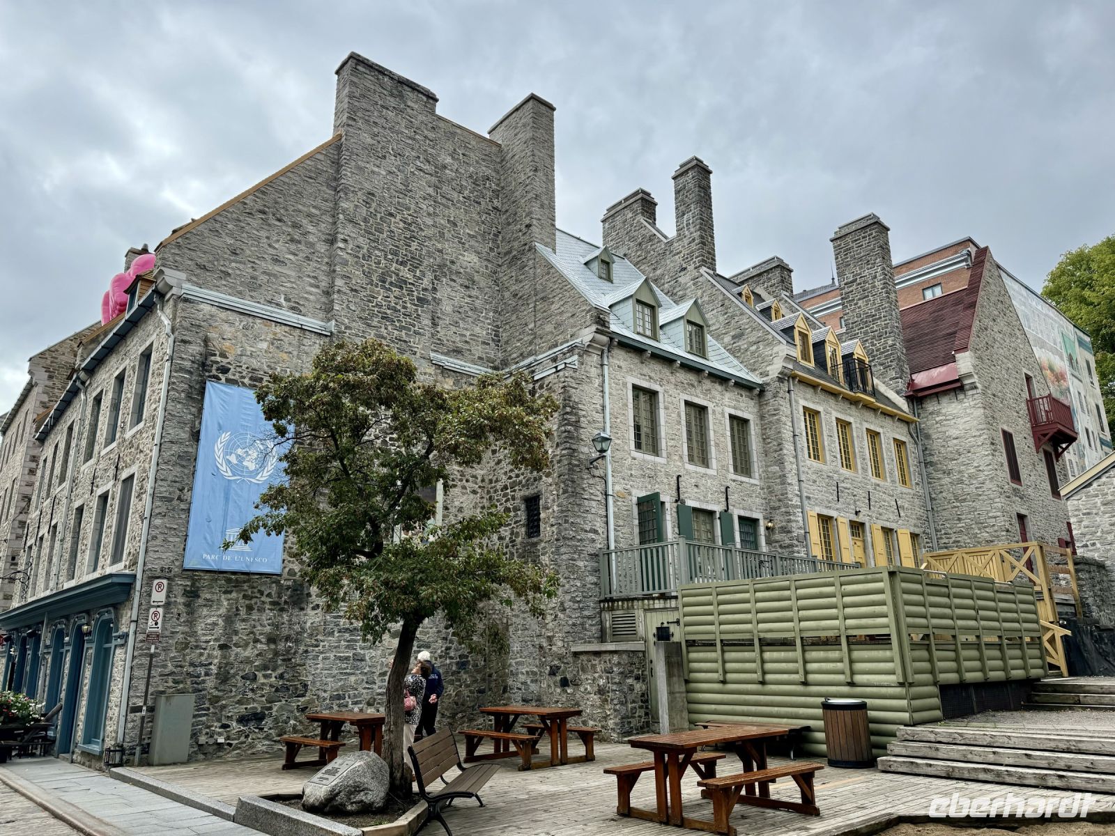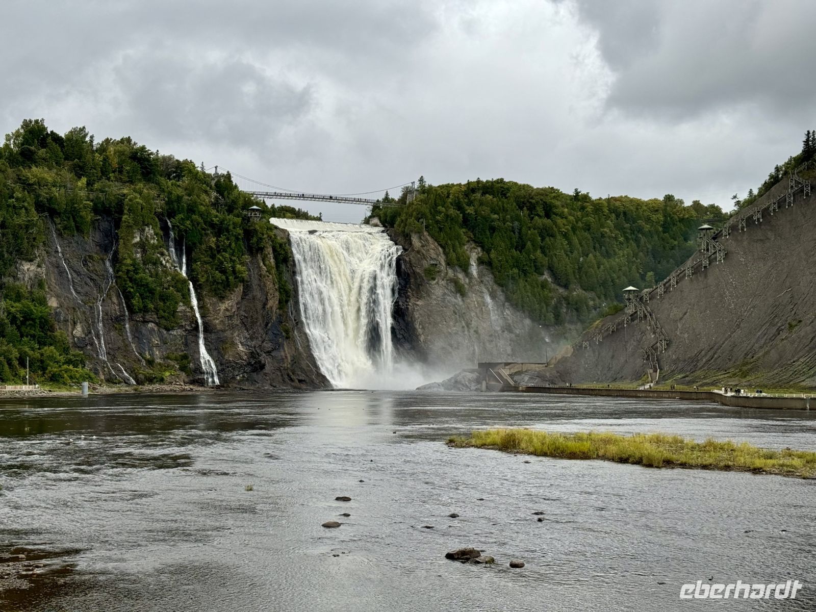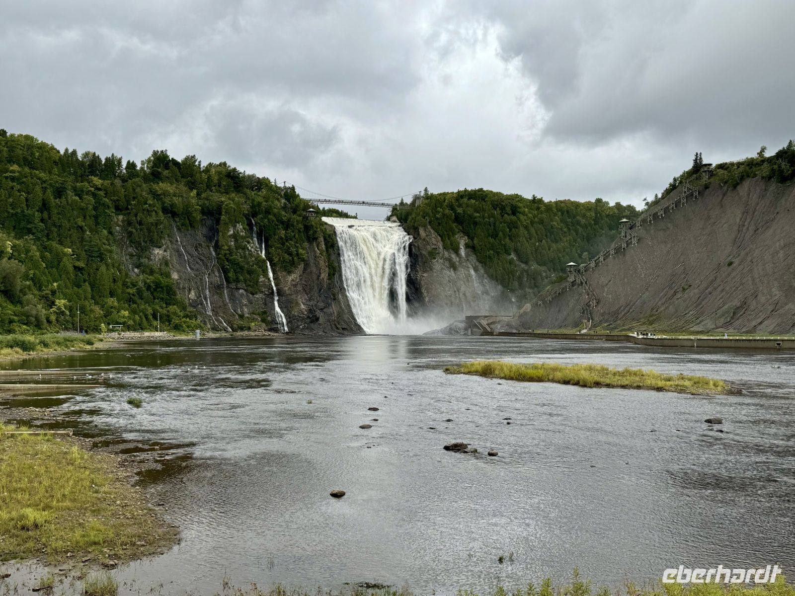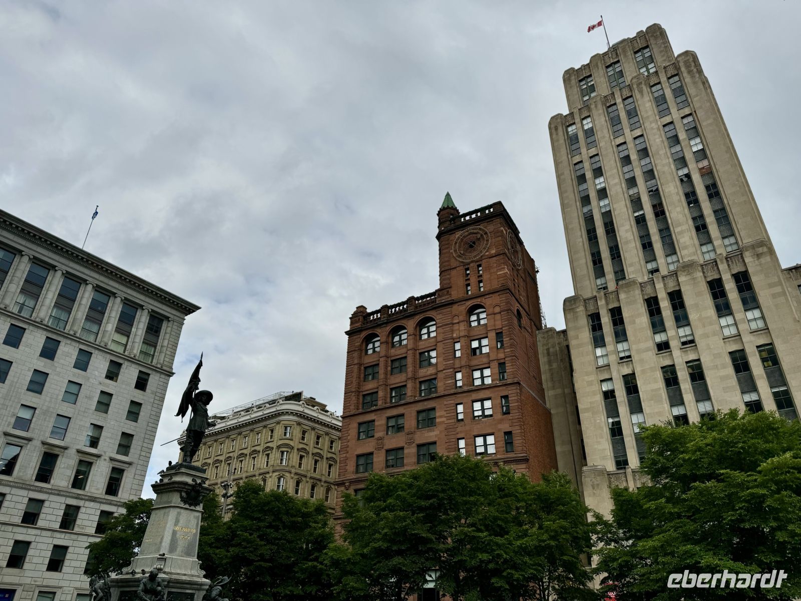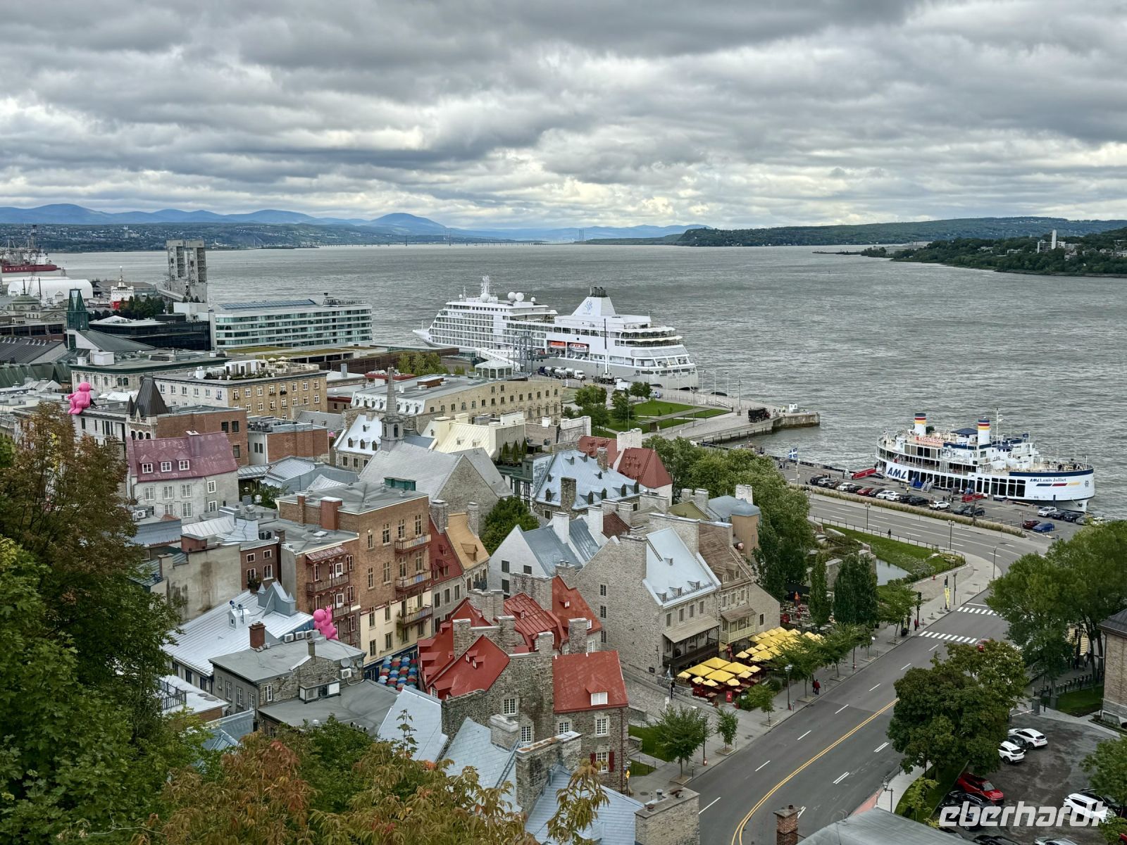 Louis gefällt unser Hotel auch sehr gut, weil er von seiner Wohnung nur fünf Minuten laufen musste. Unsere ersten positiven Eindrücke von Montréal wollen wir mit ihm auf der heutigen Stadtrundfahrt vertiefen. Am nahe gelegenen Dorcester Square steigen wir bereits das erste Mal wieder aus. Während Louis meinen Gästen die Denkmäler auf dem Platz und die umliegenden Gebäude erklärt, darunter das Sunlife Building und die Kathedralbasilika Marie-Reine-du-Monde, versuche ich, eines der vielen putzigen Eichhörnchen vor die Kameralinse zu bekommen. Vor dem Fairmont-Hotel, in dem das berühmte Bed-In von John Lennon und Yoko Ono stattfand, sammelt uns unser Busfahrer Warren wieder auf. Nun fahren wir auf die vorgelagerten Inseln, auf denen sich noch einige Gebäude der Expo 67 befinden. Doch erstmal begeben wir uns zu einem Aussichtspunkt am Wasser, der uns einen Blick auf die Altstadt gewährt. Wir werfen einen Blick in die Biosphère, den ehemaligen amerikanischen Pavillon der Weltausstellung. Auf der Formel-1-Rennstrecke findet gerade ein Fahrradrennen statt, weshalb wir nur bis zum Casino fahren und dabei aber zumindest einen Teil des Circuit Gilles Villeneuve zu Gesicht bekommen. Vorbei am Habitat 67 von Moshe Safdie geht es zurück in die Stadt. Den Abschluss unserer Tour mit Louis bildet ein Spaziergang durch das Zentrum vom World Trade Center mit einem Abschnitt der Berliner Mauer bis zur Place d’Armes vor der Kirche Notre-Dame de Montréal. Wir verabschieden uns hier von ihm und besichtigen dann mit einem Bild von Céline Dion vor unserem geistigen Auge den prächtigen Innenraum der katholischen Kathedrale. Nach etwas Freizeit in der Altstadt für die Mittagspause und eigene Erkundungen treffen wir uns am Marché Bonsecours für unsere Weiterfahrt nach Québec. Wir machen jedoch in Montréal noch einen Zwischenhalt am Olympiastadion, wo allerdings gerade die Renovierungsarbeiten in vollem Gange sind. Vom schönen Dach ist nur noch das Skelett übrig. Auch der Turm ist für uns tabu. Vor dem einsetzenden Regen fliehen wir wieder zu Warren in den Bus. Am Sanctuaire Notre-Dame du Cap hinter Trois-Rivière ist das Wetter wieder schön — ein weiteres Wunder? Oder liegt es daran, dass im Inneren der neuen Basilika gerade eine Messe stattfindet und die Teilnehmenden dort für Sonnenschein beten? Ein weiteres Mysterium. Für mich Ungläubigen öffnet Maria ihre Augen jedenfalls nicht. Wir setzen unsere Fahrt auf dem historischen Chemin du Roy parallel zum Sankt-Lorenz-Strom fort. Hübsche Anwesen und pittoreske Dörfer ziehen an uns vorbei. Hier ließe es sich gut leben mit Blick auf das Wasser. Den letzten Teil der Strecke legen wir auf dem Highway 40 zurück und erreichen unser nächstes Hotel in Québec am frühen Abend. Es liegt außerhalb der Stadtmauer am Rande der oberen Altstadt zwischen Parlament und den Plains of Abraham. Eine perfekte Lage für erste Erkundungen und dennoch recht ruhig. Wir freuen uns sehr auf den nächsten Tag, an dem wir die angeblich schönste Stadt Kanadas intensiv erkunden wollen.