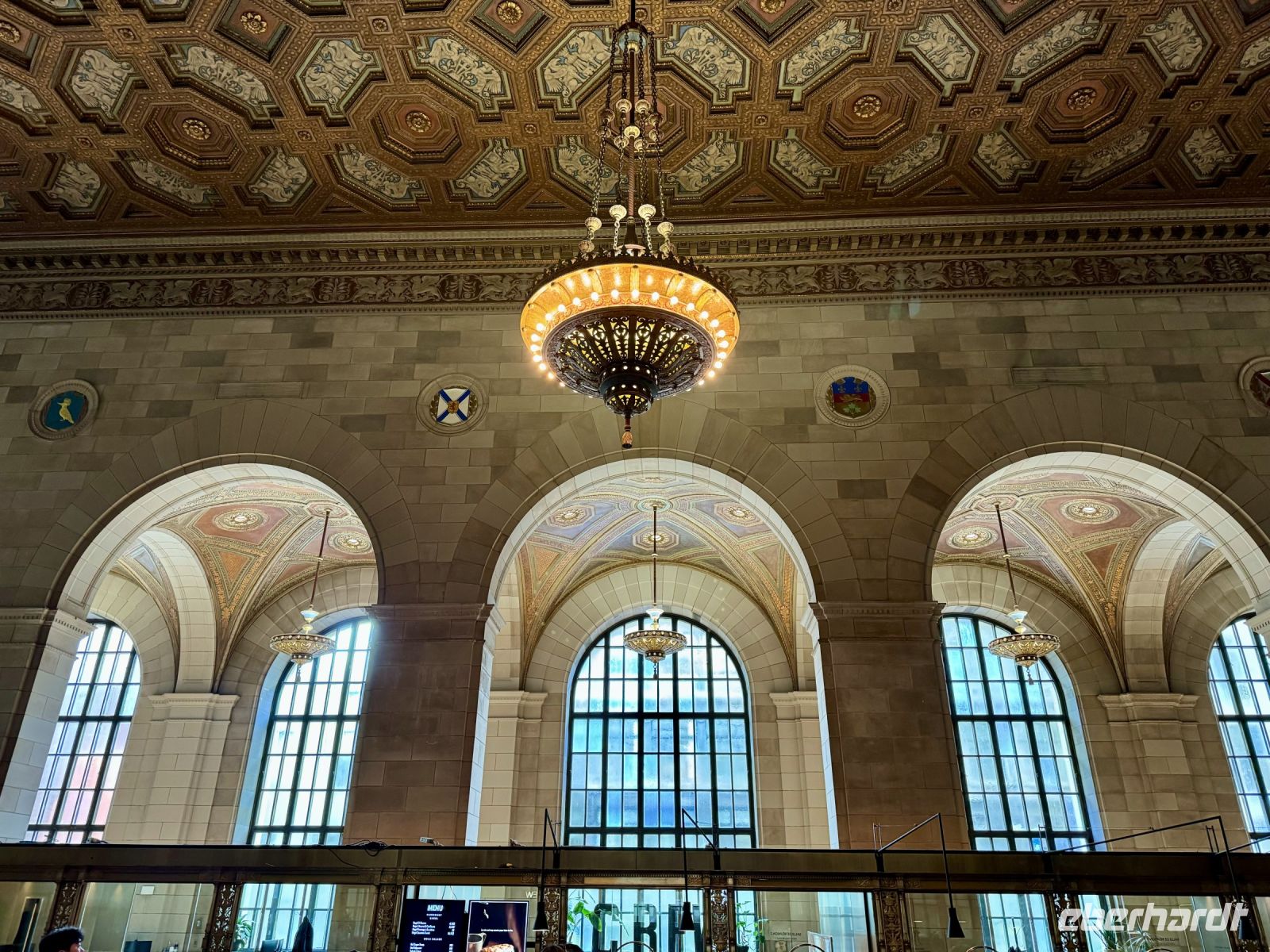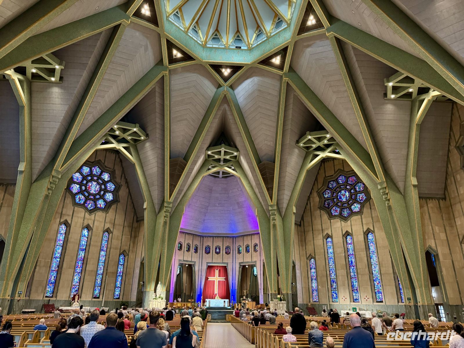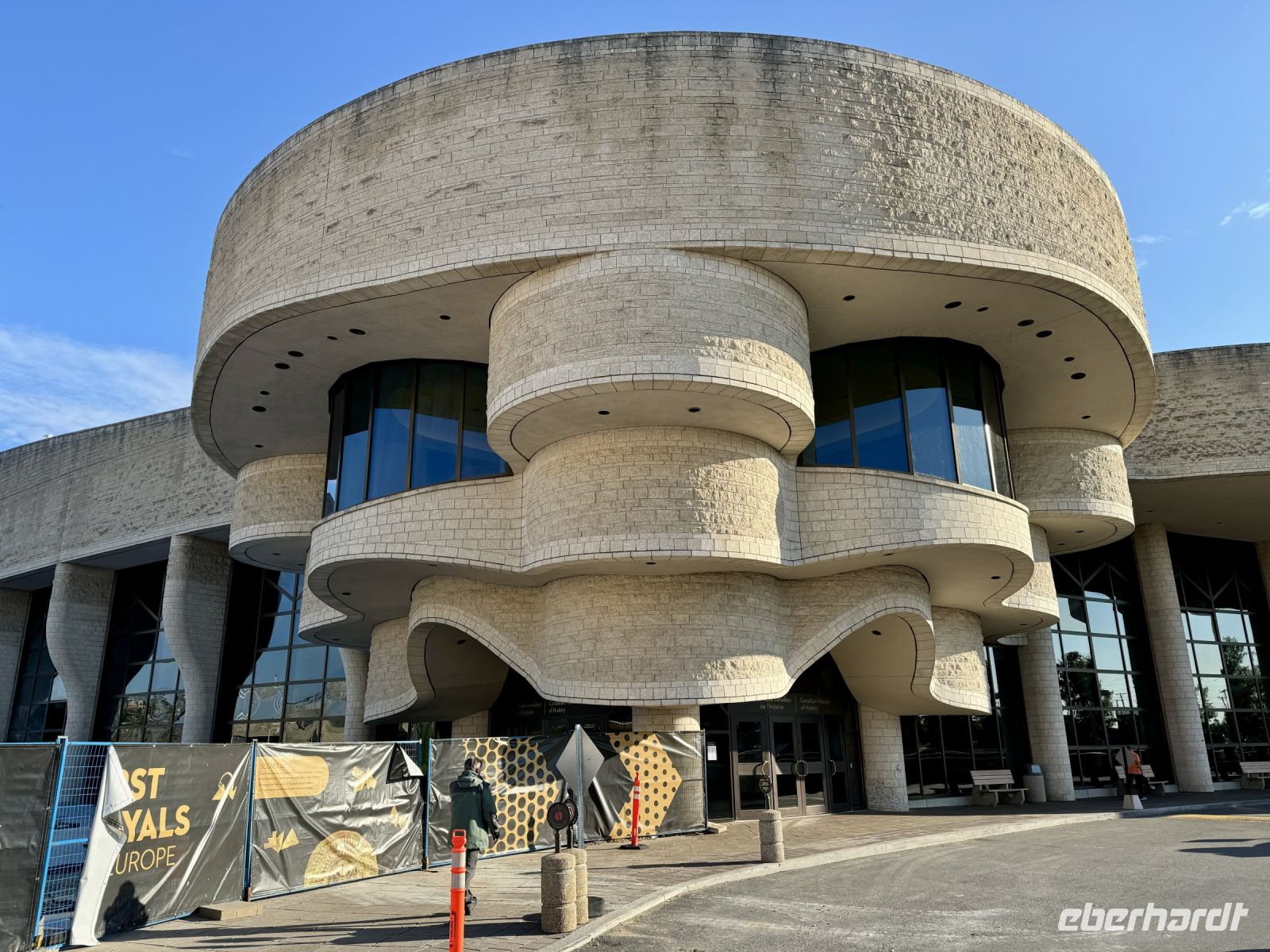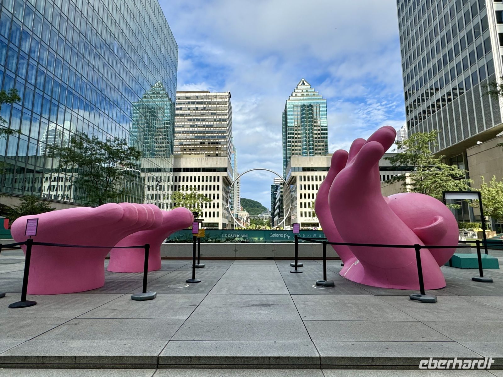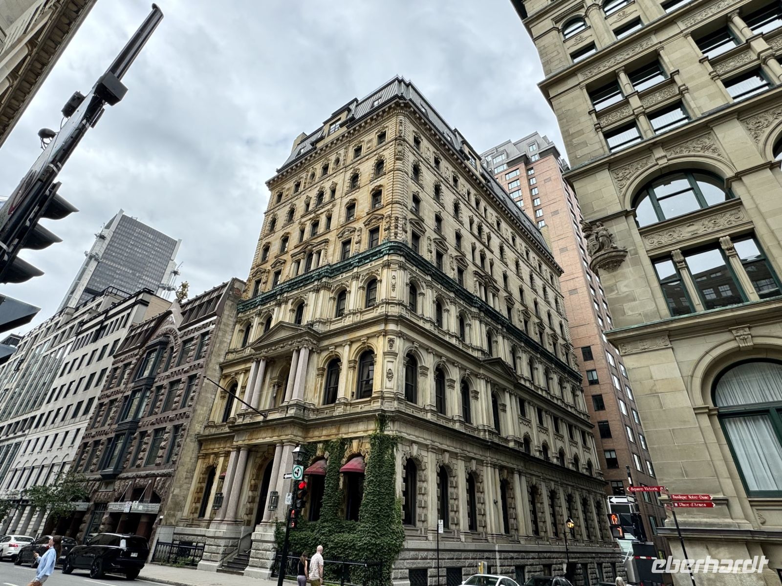 Louis gefällt unser Hotel auch sehr gut, weil er von seiner Wohnung nur fünf Minuten laufen musste. Unsere ersten positiven Eindrücke von Montréal wollen wir mit ihm auf der heutigen Stadtrundfahrt vertiefen. Am nahe gelegenen Dorcester Square steigen wir bereits das erste Mal wieder aus. Während Louis meinen Gästen die Denkmäler auf dem Platz und die umliegenden Gebäude erklärt, darunter das Sunlife Building und die Kathedralbasilika Marie-Reine-du-Monde, versuche ich, eines der vielen putzigen Eichhörnchen vor die Kameralinse zu bekommen. Vor dem Fairmont-Hotel, in dem das berühmte Bed-In von John Lennon und Yoko Ono stattfand, sammelt uns unser Busfahrer Warren wieder auf. Nun fahren wir auf die vorgelagerten Inseln, auf denen sich noch einige Gebäude der Expo 67 befinden. Doch erstmal begeben wir uns zu einem Aussichtspunkt am Wasser, der uns einen Blick auf die Altstadt gewährt. Wir werfen einen Blick in die Biosphère, den ehemaligen amerikanischen Pavillon der Weltausstellung. Auf der Formel-1-Rennstrecke findet gerade ein Fahrradrennen statt, weshalb wir nur bis zum Casino fahren und dabei aber zumindest einen Teil des Circuit Gilles Villeneuve zu Gesicht bekommen. Vorbei am Habitat 67 von Moshe Safdie geht es zurück in die Stadt. Den Abschluss unserer Tour mit Louis bildet ein Spaziergang durch das Zentrum vom World Trade Center mit einem Abschnitt der Berliner Mauer bis zur Place d’Armes vor der Kirche Notre-Dame de Montréal. Wir verabschieden uns hier von ihm und besichtigen dann mit einem Bild von Céline Dion vor unserem geistigen Auge den prächtigen Innenraum der katholischen Kathedrale. Nach etwas Freizeit in der Altstadt für die Mittagspause und eigene Erkundungen treffen wir uns am Marché Bonsecours für unsere Weiterfahrt nach Québec. Wir machen jedoch in Montréal noch einen Zwischenhalt am Olympiastadion, wo allerdings gerade die Renovierungsarbeiten in vollem Gange sind. Vom schönen Dach ist nur noch das Skelett übrig. Auch der Turm ist für uns tabu. Vor dem einsetzenden Regen fliehen wir wieder zu Warren in den Bus. Am Sanctuaire Notre-Dame du Cap hinter Trois-Rivière ist das Wetter wieder schön — ein weiteres Wunder? Oder liegt es daran, dass im Inneren der neuen Basilika gerade eine Messe stattfindet und die Teilnehmenden dort für Sonnenschein beten? Ein weiteres Mysterium. Für mich Ungläubigen öffnet Maria ihre Augen jedenfalls nicht. Wir setzen unsere Fahrt auf dem historischen Chemin du Roy parallel zum Sankt-Lorenz-Strom fort. Hübsche Anwesen und pittoreske Dörfer ziehen an uns vorbei. Hier ließe es sich gut leben mit Blick auf das Wasser. Den letzten Teil der Strecke legen wir auf dem Highway 40 zurück und erreichen unser nächstes Hotel in Québec am frühen Abend. Es liegt außerhalb der Stadtmauer am Rande der oberen Altstadt zwischen Parlament und den Plains of Abraham. Eine perfekte Lage für erste Erkundungen und dennoch recht ruhig. Wir freuen uns sehr auf den nächsten Tag, an dem wir die angeblich schönste Stadt Kanadas intensiv erkunden wollen.