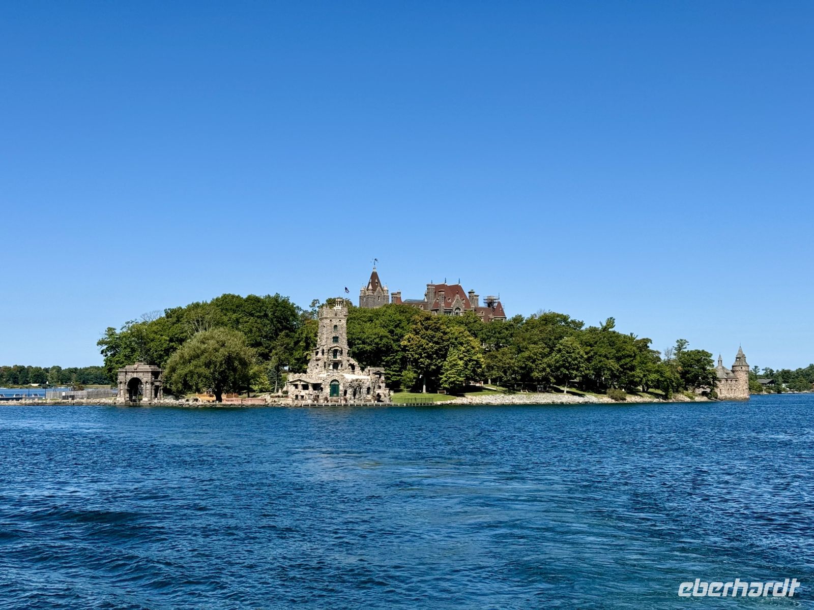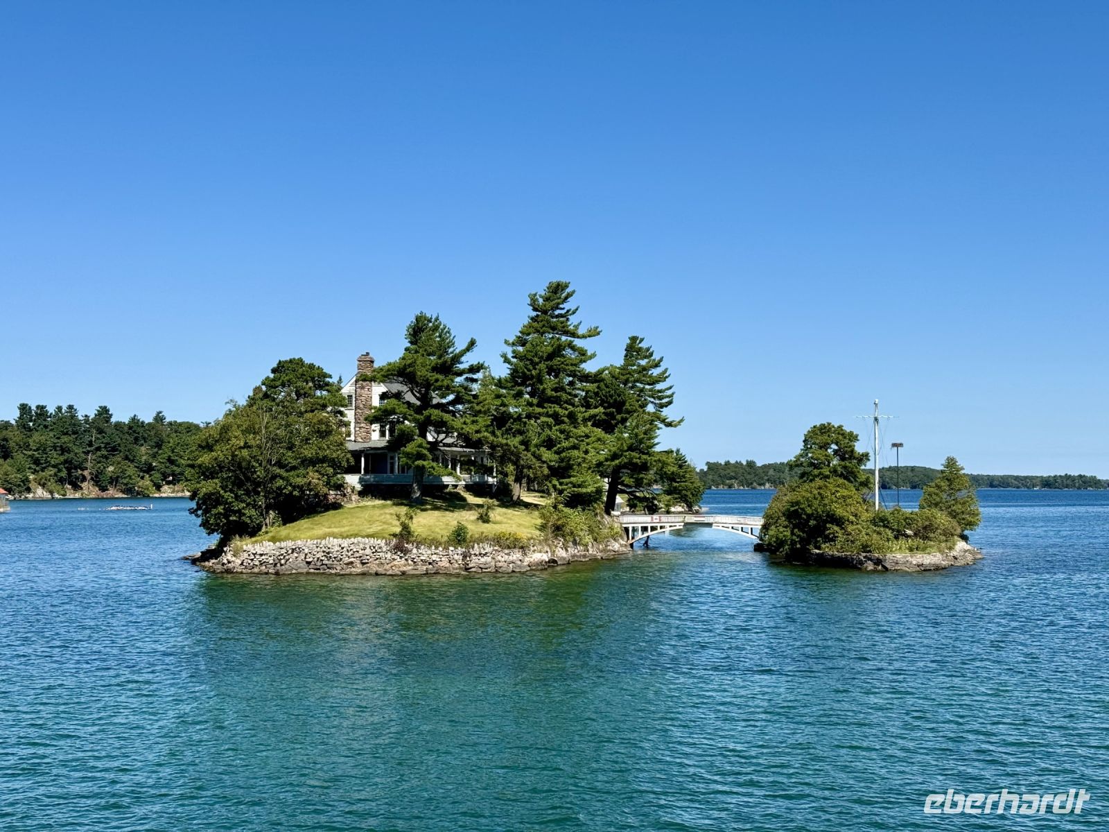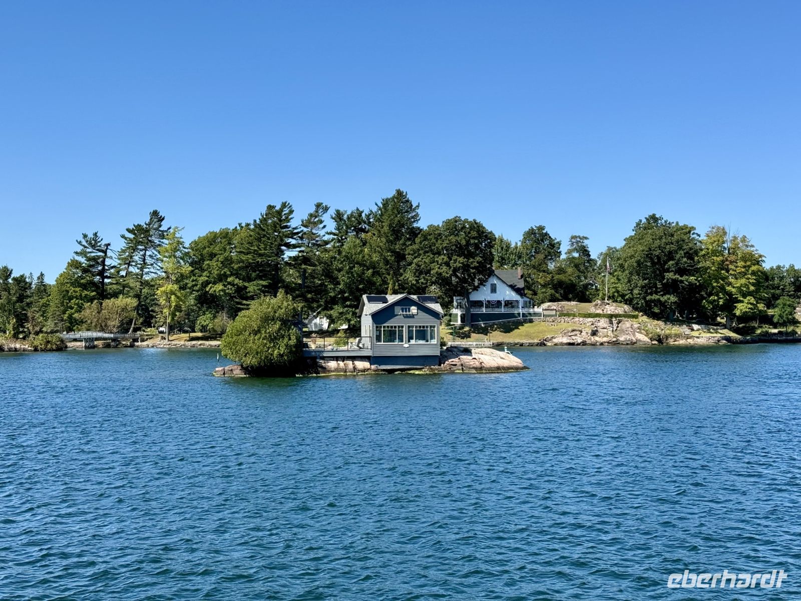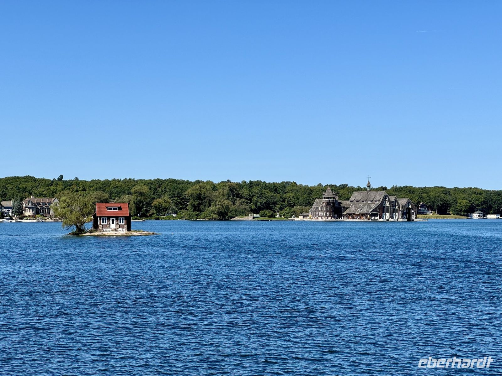Nach dem Frühstück kehren wir zurück zum Nationalmuseum für Geschichte in Gatineau. Meine Gäste können am Vormittag für etwa zwei Stunden die Ausstellung besuchen, die sie von den First Nations in das moderne Kanada von heute führt. Um sich alles anzuschauen, bräuchte man aber den ganzen Tag. Nach dem Museumsbesuch beginnt unsere lange Fahrt nach Toronto. Sie wird unterbrochen durch eine Bootsfahrt zu den Thousand Islands. Ausgangspunkt dafür ist das Örtchen Rockport, das bereits wieder am Sankt-Lorenz-Strom liegt, und der Höhepunkt der Tour ist die Umrundung von Heart Island mit dem Boldt Castle. Doch auch auf den umliegenden kleineren Inseln gibt es einige hübsche Häuschen oder Villen. Manchmal ist das Haus fast so groß oder sogar größer als die Insel, auf der es steht. Eines dieser kleinen Objekte wurde sogar angeblich benutzt, um die ungeliebte Schwiegermutter die Saison über dort zu parken. Na ja, wenn sie die ganze Zeit so schönes sonniges Wetter hat wie wir heute, dann lässt es sich ja immerhin eine Weile aushalten. Bevor wir Rockport verlassen, bekommen wir noch ein Mittagessen im Hafenrestaurant. Danach machen wir einen Zwischenstopp im ehrwürdigen Kingston, der Stadt des Kalksteins, spazieren hinunter zum überdimensionierten Rathaus und zur Touristinformation am Wasser. Den Ontariosee haben wir bereits erreicht, aber bis Toronto brauchen wir noch rund drei Stunden. Das verdeutlicht die Größe des Sees — und er ist noch der kleinste der fünf Great Lakes! Für die notwendige technische Pause schlägt Warren einen Markt mit lokalen Produkten neben dem Highway vor. Ein riesiger roter Apfel weist den Weg zu leckerer Schokolade und Eis. Mit Einbruch der Dämmerung erreichen wir die größte Stadt Kanadas. Unser Hotel liegt mitten in der Downtown von Toronto und ist umringt von Wolkenkratzern (und hat selbst auch 26 Etagen). An die pulsierende Millionenstadt müssen wir uns erst gewöhnen. Ein kurzer Abendspaziergang zum Dundas Square sorgt dank der vielen Leuchtreklamen für noch mehr Reizüberflutung. Da kümmern wir uns lieber erstmal um unser leibliches Wohl und suchen uns individuell ein nettes Lokal zum Abendessen.