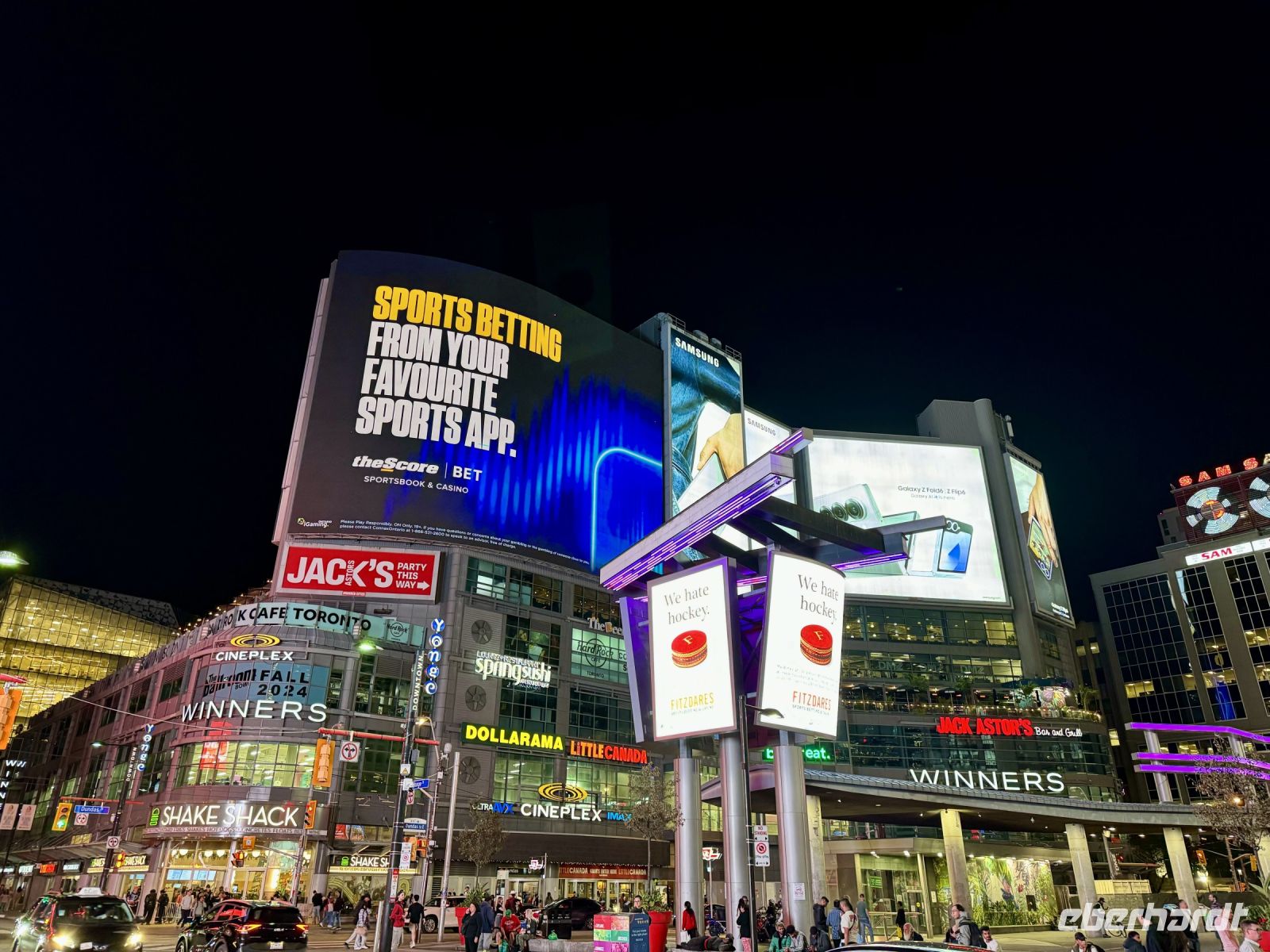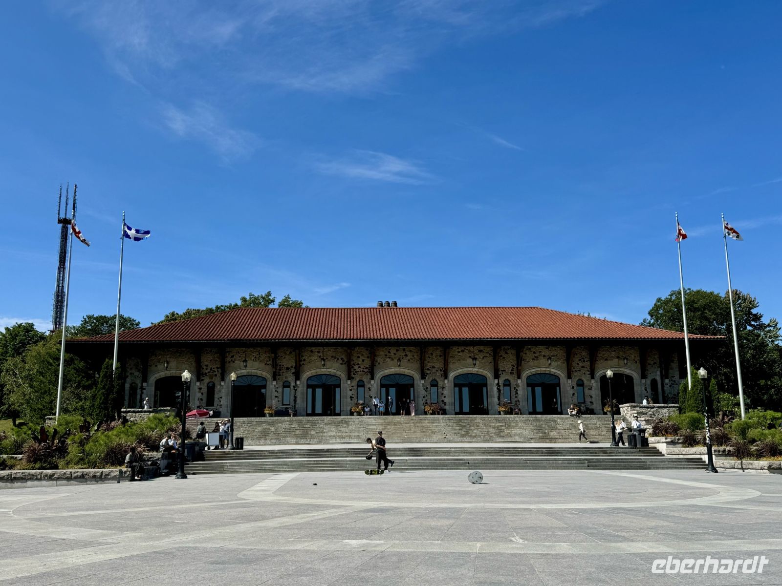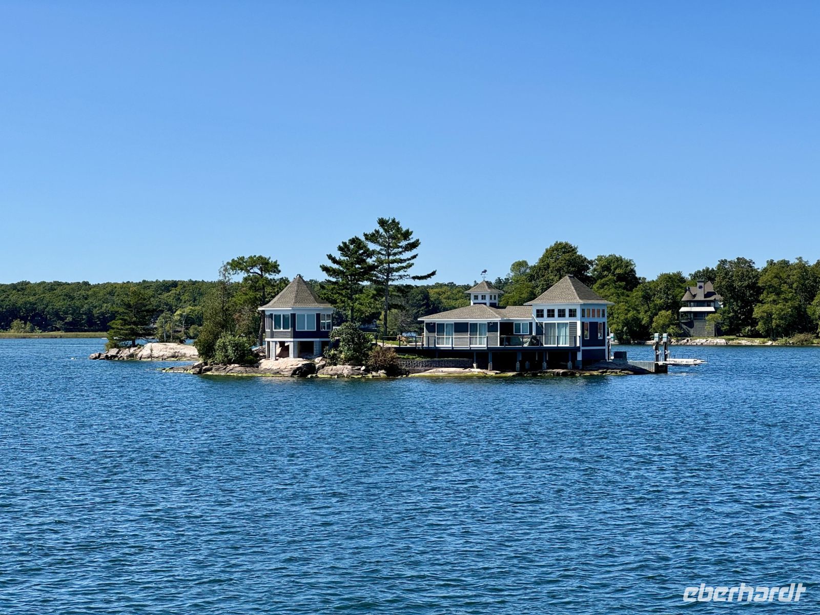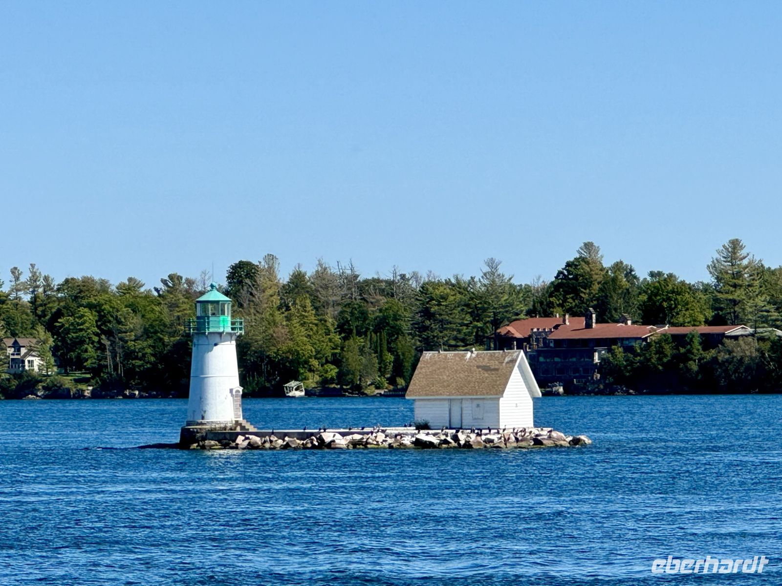Nach dem Frühstück kehren wir zurück zum Nationalmuseum für Geschichte in Gatineau. Meine Gäste können am Vormittag für etwa zwei Stunden die Ausstellung besuchen, die sie von den First Nations in das moderne Kanada von heute führt. Um sich alles anzuschauen, bräuchte man aber den ganzen Tag. Nach dem Museumsbesuch beginnt unsere lange Fahrt nach Toronto. Sie wird unterbrochen durch eine Bootsfahrt zu den Thousand Islands. Ausgangspunkt dafür ist das Örtchen Rockport, das bereits wieder am Sankt-Lorenz-Strom liegt, und der Höhepunkt der Tour ist die Umrundung von Heart Island mit dem Boldt Castle. Doch auch auf den umliegenden kleineren Inseln gibt es einige hübsche Häuschen oder Villen. Manchmal ist das Haus fast so groß oder sogar größer als die Insel, auf der es steht. Eines dieser kleinen Objekte wurde sogar angeblich benutzt, um die ungeliebte Schwiegermutter die Saison über dort zu parken. Na ja, wenn sie die ganze Zeit so schönes sonniges Wetter hat wie wir heute, dann lässt es sich ja immerhin eine Weile aushalten. Bevor wir Rockport verlassen, bekommen wir noch ein Mittagessen im Hafenrestaurant. Danach machen wir einen Zwischenstopp im ehrwürdigen Kingston, der Stadt des Kalksteins, spazieren hinunter zum überdimensionierten Rathaus und zur Touristinformation am Wasser. Den Ontariosee haben wir bereits erreicht, aber bis Toronto brauchen wir noch rund drei Stunden. Das verdeutlicht die Größe des Sees — und er ist noch der kleinste der fünf Great Lakes! Für die notwendige technische Pause schlägt Warren einen Markt mit lokalen Produkten neben dem Highway vor. Ein riesiger roter Apfel weist den Weg zu leckerer Schokolade und Eis. Mit Einbruch der Dämmerung erreichen wir die größte Stadt Kanadas. Unser Hotel liegt mitten in der Downtown von Toronto und ist umringt von Wolkenkratzern (und hat selbst auch 26 Etagen). An die pulsierende Millionenstadt müssen wir uns erst gewöhnen. Ein kurzer Abendspaziergang zum Dundas Square sorgt dank der vielen Leuchtreklamen für noch mehr Reizüberflutung. Da kümmern wir uns lieber erstmal um unser leibliches Wohl und suchen uns individuell ein nettes Lokal zum Abendessen.