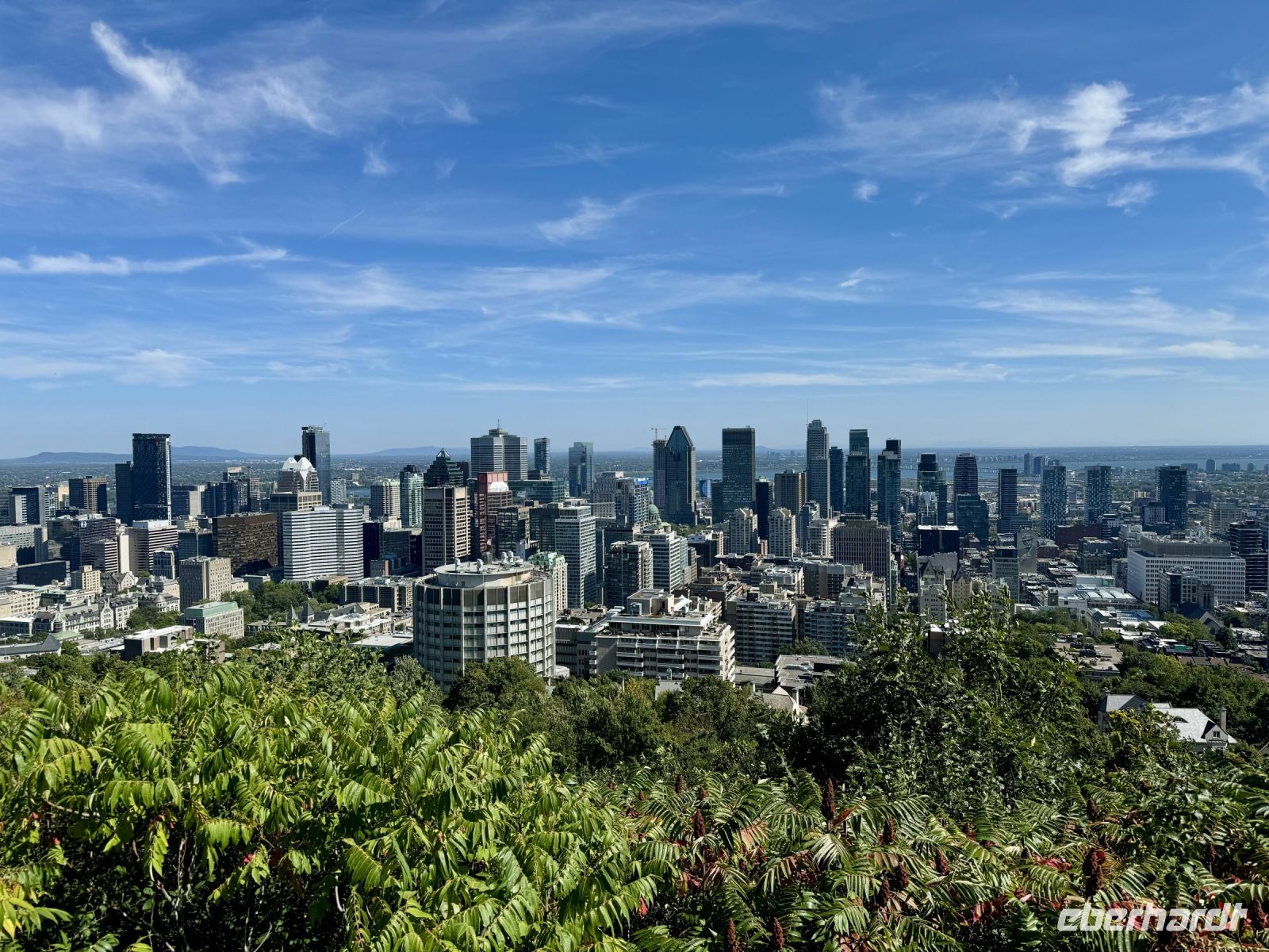 21 Gäste möchten mit mir diesen September Kanada von Ost nach West erkunden und haben diesmal sogar extra den zeitigen Flug mit Air Canada auf sich genommen, sind teilweise schon am Vorabend (wie ich) nach Frankfurt angereist. Trotz Verspätung beim Abflug erreichen wir Montréal noch überpünktlich, nachdem wir den Atlantik überquert und dann wie die alten Entdecker entlang des Sankt-Lorenz-Stroms ins Landesinnere vorgestoßen sind. Die Cockpitcrew hat uns sicher durch ein paar Turbulenzen gebracht und legt in Montréal als Krönung eine butterweiche Landung hin. Auch die Einreise verläuft völlig unproblematisch, sogar die Koffer sind alle da … so muss es bitte vom Ablauf her weitergehen! Unser örtlicher Stadtführer Louis wartet ebenfalls am Flughafen bereits auf uns und heißt uns in seiner Heimatstadt willkommen. Da die Wettervorhersage für morgen nicht ganz so gut aussieht und wir sowieso noch die Zeit bis zum Check-in im Hotel überbrücken „müssen“, schlage ich vor, bei diesem schönen sonnigen Wetter schon heute auf den Mont Royal zu fahren. Hier können wir einen kleinen Spaziergang zum Aussichtspunkt am Chalet unternehmen und bekommen dadurch die Innenstadt von Montréal quasi wie auf dem Silbertablett serviert. Dahinter fließt der Sankt-Lorenz-Strom und am Horizont sind sogar die ersten Ausläufer der Appalachen zu sehen. Ein schöner Einstieg in unsere Kanada-Reise! Inzwischen sind die Zimmer bezugsfertig, sodass wir zum Hotel fahren und uns nun erstmal von der Anreise erholen können. Obwohl es draußen ganz schön windig ist, unternehmen meine Gäste noch Erkundungsspaziergänge auf eigene Faust, gehen zum Supermarkt und/oder sogar bis zur Altstadt. (Respekt für so viel Energie und Motivation!) Die meisten Gäste haben das Halbpensionspaket zugebucht. Mit ihnen genieße ich am Abend im Hotelrestaurant das erste leckere 3-Gänge-Menü auf der Reise. Anschließend geben wir der Müdigkeit nach und fallen in unseren großen Betten in einen tiefen, ruhigen Schlaf.