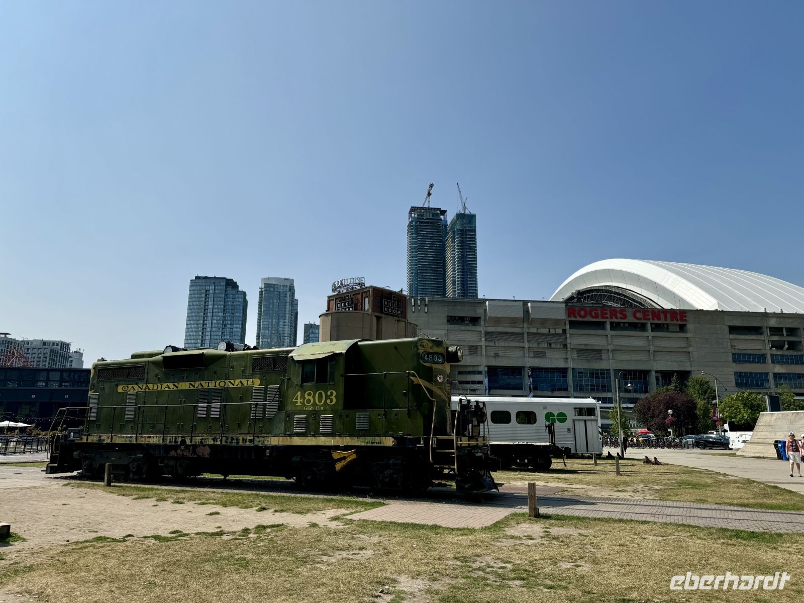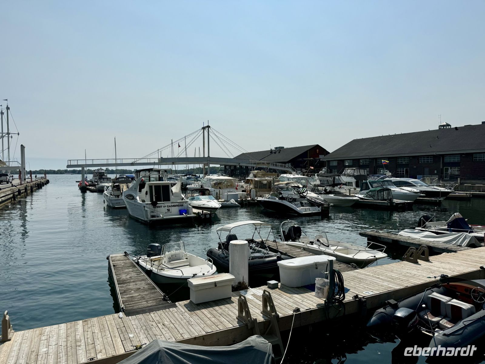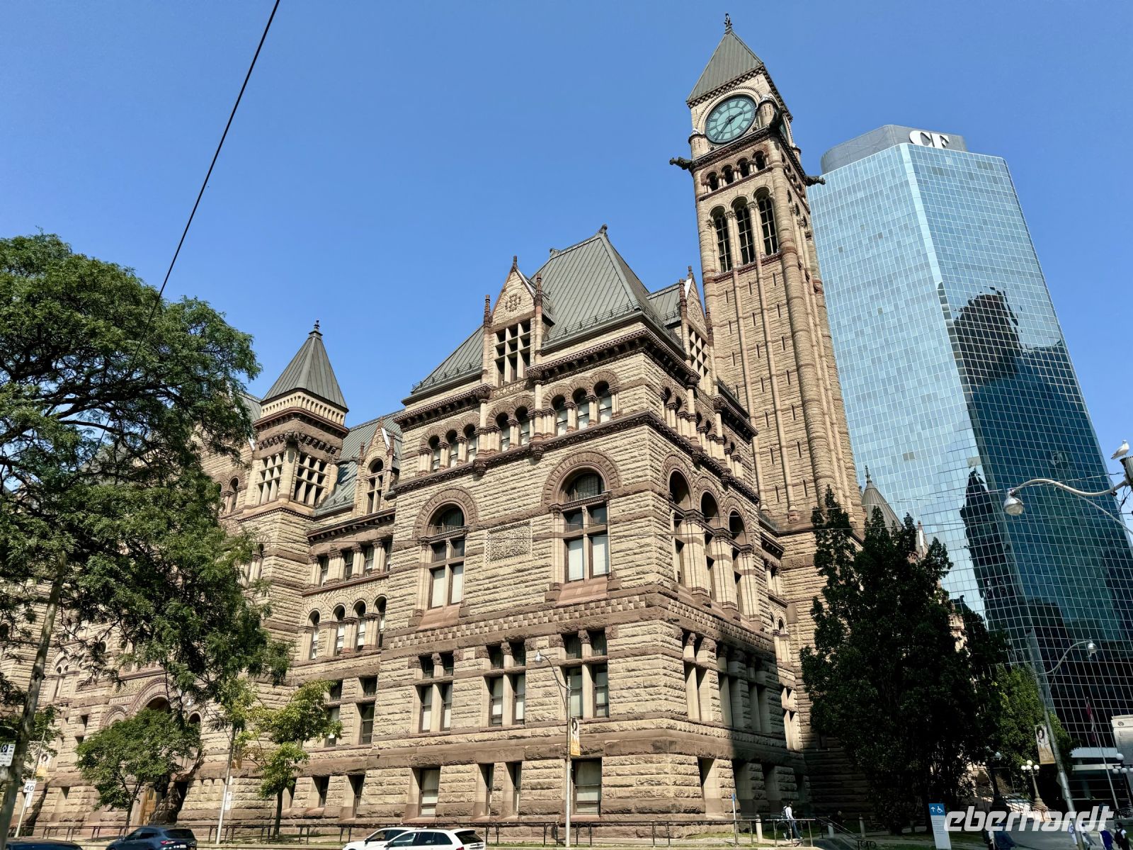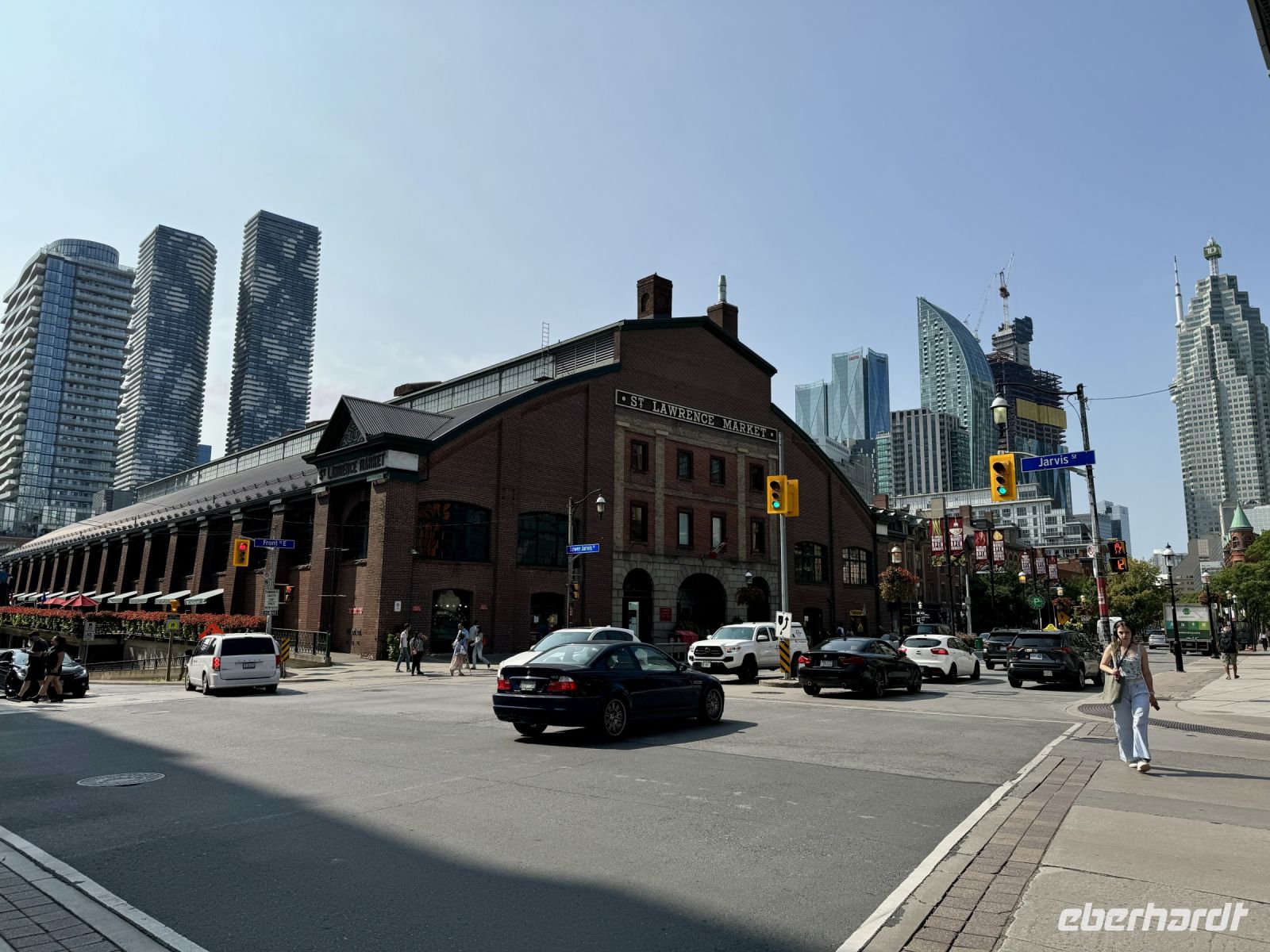 Wir beginnen die Stadtrundfahrt durch Toronto mit einem Stopp am Rathaus, das gar nicht weit vom Hotel entfernt ist. Genau genommen ist es das neue Rathaus, denn das alte steht noch daneben und ist heute ein Gerichtsgebäude. Wir finden es fast schöner als den kahlen, kalten Betonbau mit dem Ufo in der Mitte. Da wir heute viel Zeit haben, können wir auch kurz ins Rathaus hineinschauen. Auch in das Einkaufszentrum Eaton Centre werfen wir einen Blick. Dass meine Gäste auch heute für wunderschönes Spätsommerwetter gesorgt haben, brauche ich eigentlich gar nicht mehr zu erwähnen. Ich freue mich aber sehr darüber, denn so schmeckt das Eis aus der Schokoladenfabrik im Distillery District noch einmal viel besser. Auf dem Gelände der einst weltgrößten Whiskybrennerei machen wir eine längere Pause, nachdem wir durch die King Street mit ihren Kinos und Theatern und durch Chinatown gefahren sind sowie das Royal Ontario Museum passiert und das Parlamentsgebäude umrundet haben. Warren schafft es anschließend, den Bus in der Nähe des St Lawrence Market zu parken, sodass wir auch hier einen Blick in die große Markthalle werfen können. Nicht weit entfernt steht das markante Gooderham Building, das „Bügeleisengebäude“ von Toronto. Die Auffahrt auf den CN Tower ist diesmal fakultativ, aber fast alle meine Gäste lassen sich die tolle Aussicht nicht entgehen. Wir können weit über den Ontariosee blicken, sehen die Toronto Islands, unter uns den großen Hauptbahnhof und das Baseball-Stadion. Die größte Metropole Kanadas erstreckt sich bis zum Horizont und sieht außerhalb der Downtown sehr grün aus. Wer möchte, kann mich nun noch auf einen Spaziergang vorbei am Lokschuppen hinunter zur Harbourfront begleiten. Vom Ufer des Ontariosees lässt sich der Turm besonders gut fotografieren. Wir beenden die Stadtrundfahrt am frühen Nachmittag wieder am Rathaus. Der Nathan Phillipps Square ist ein guter Startpunkt für die weitere Erkundung Torontos. Die erfolgt für meine Gäste ab jetzt allerdings auf eigene Faust, denn sie haben bis morgen früh Freizeit!