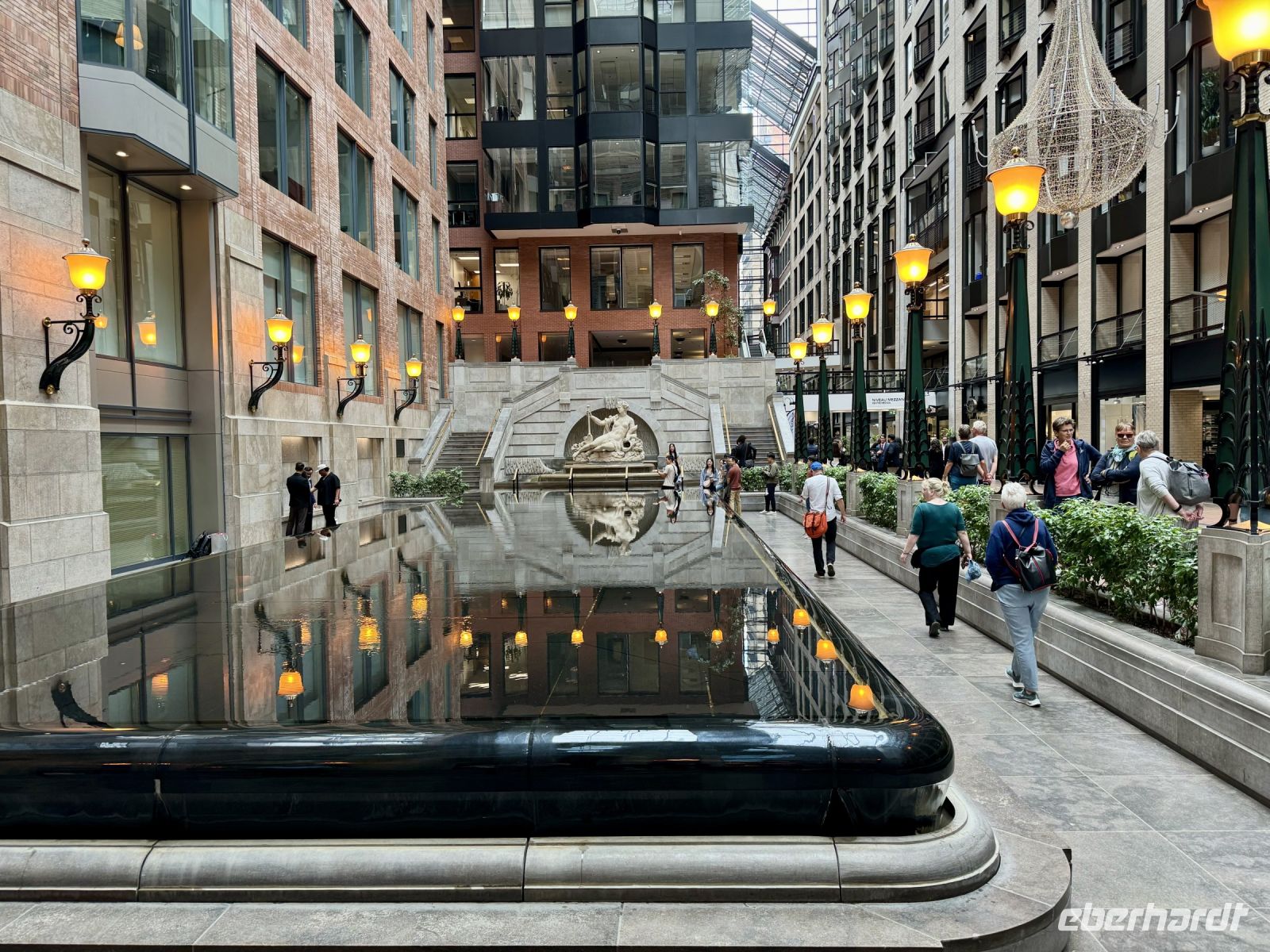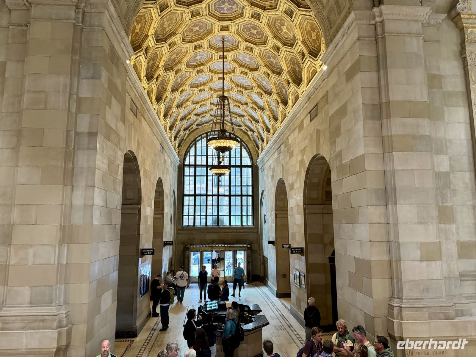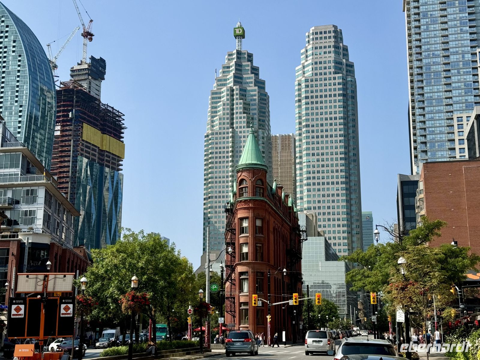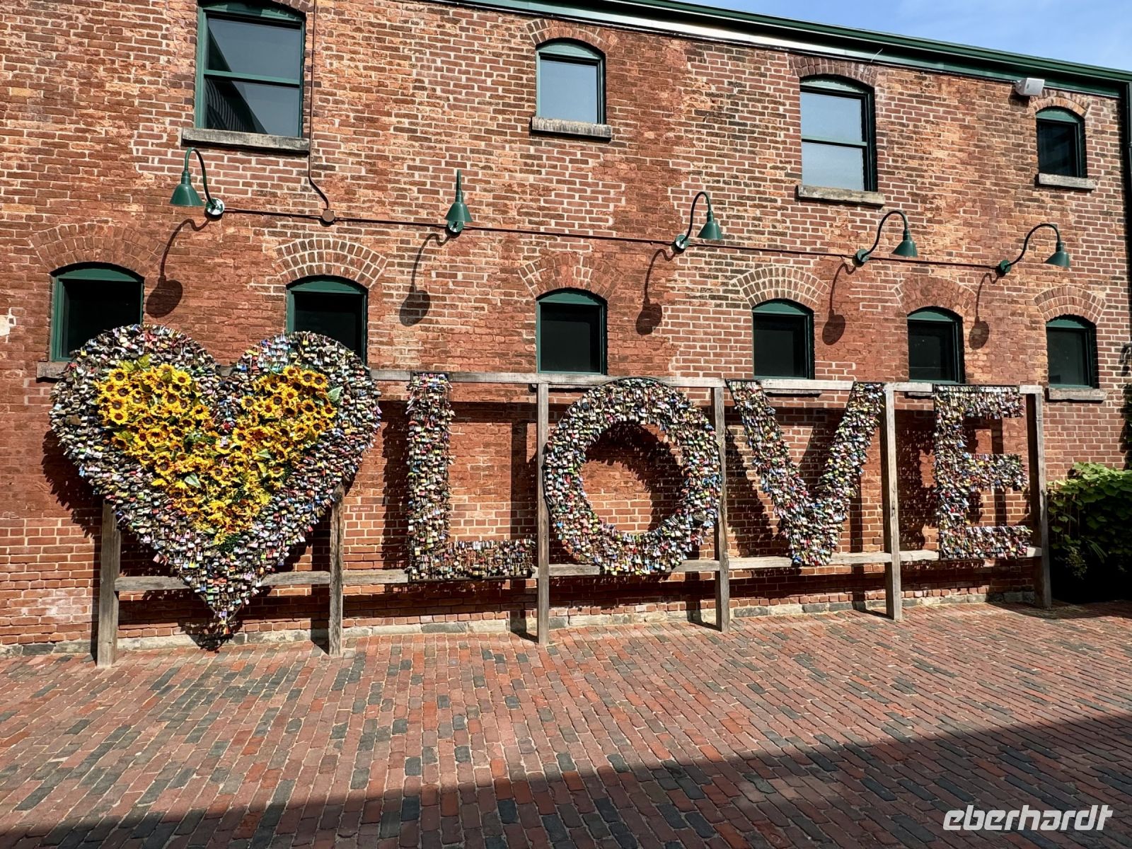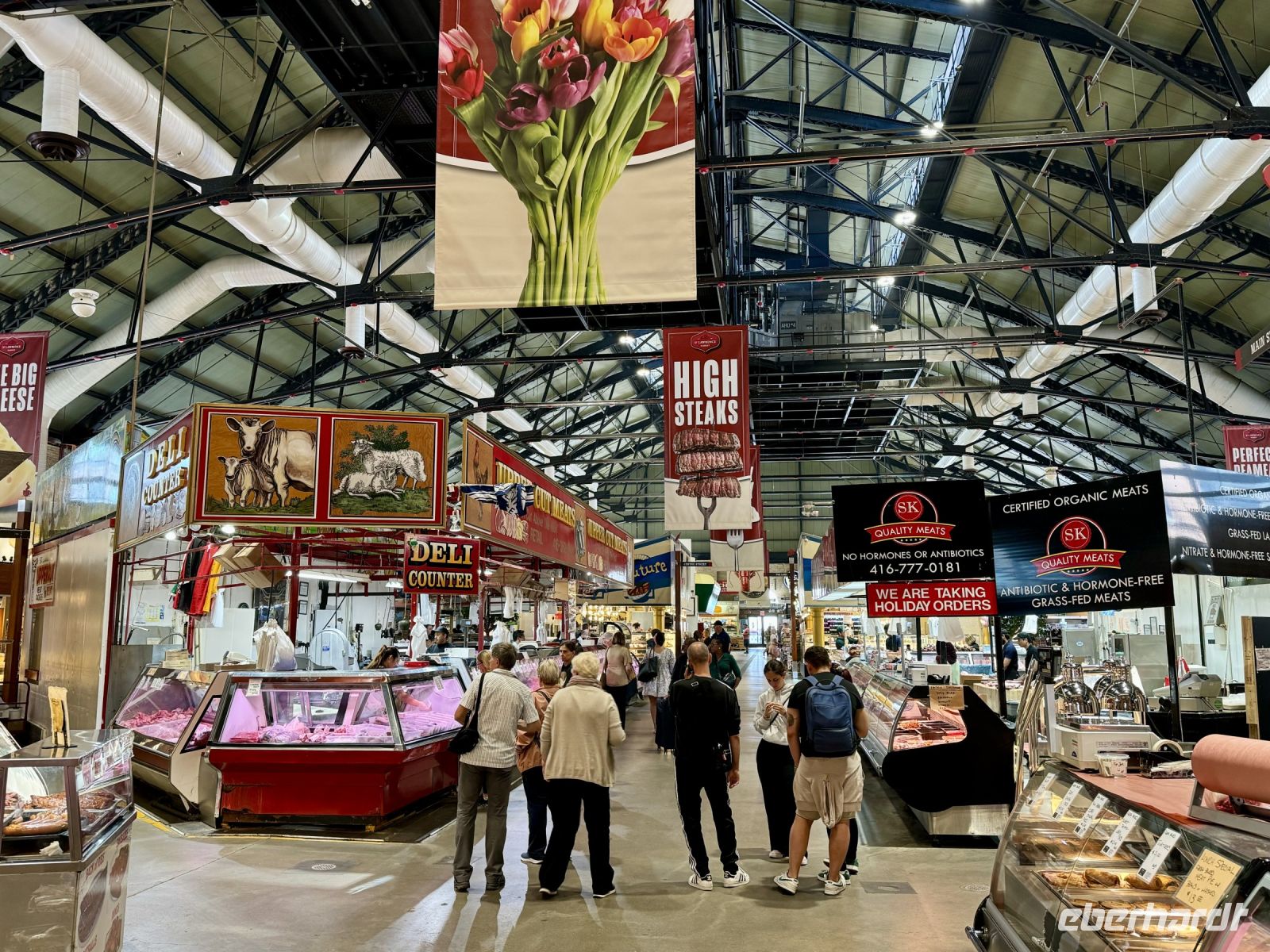 Wir beginnen die Stadtrundfahrt durch Toronto mit einem Stopp am Rathaus, das gar nicht weit vom Hotel entfernt ist. Genau genommen ist es das neue Rathaus, denn das alte steht noch daneben und ist heute ein Gerichtsgebäude. Wir finden es fast schöner als den kahlen, kalten Betonbau mit dem Ufo in der Mitte. Da wir heute viel Zeit haben, können wir auch kurz ins Rathaus hineinschauen. Auch in das Einkaufszentrum Eaton Centre werfen wir einen Blick. Dass meine Gäste auch heute für wunderschönes Spätsommerwetter gesorgt haben, brauche ich eigentlich gar nicht mehr zu erwähnen. Ich freue mich aber sehr darüber, denn so schmeckt das Eis aus der Schokoladenfabrik im Distillery District noch einmal viel besser. Auf dem Gelände der einst weltgrößten Whiskybrennerei machen wir eine längere Pause, nachdem wir durch die King Street mit ihren Kinos und Theatern und durch Chinatown gefahren sind sowie das Royal Ontario Museum passiert und das Parlamentsgebäude umrundet haben. Warren schafft es anschließend, den Bus in der Nähe des St Lawrence Market zu parken, sodass wir auch hier einen Blick in die große Markthalle werfen können. Nicht weit entfernt steht das markante Gooderham Building, das „Bügeleisengebäude“ von Toronto. Die Auffahrt auf den CN Tower ist diesmal fakultativ, aber fast alle meine Gäste lassen sich die tolle Aussicht nicht entgehen. Wir können weit über den Ontariosee blicken, sehen die Toronto Islands, unter uns den großen Hauptbahnhof und das Baseball-Stadion. Die größte Metropole Kanadas erstreckt sich bis zum Horizont und sieht außerhalb der Downtown sehr grün aus. Wer möchte, kann mich nun noch auf einen Spaziergang vorbei am Lokschuppen hinunter zur Harbourfront begleiten. Vom Ufer des Ontariosees lässt sich der Turm besonders gut fotografieren. Wir beenden die Stadtrundfahrt am frühen Nachmittag wieder am Rathaus. Der Nathan Phillipps Square ist ein guter Startpunkt für die weitere Erkundung Torontos. Die erfolgt für meine Gäste ab jetzt allerdings auf eigene Faust, denn sie haben bis morgen früh Freizeit!