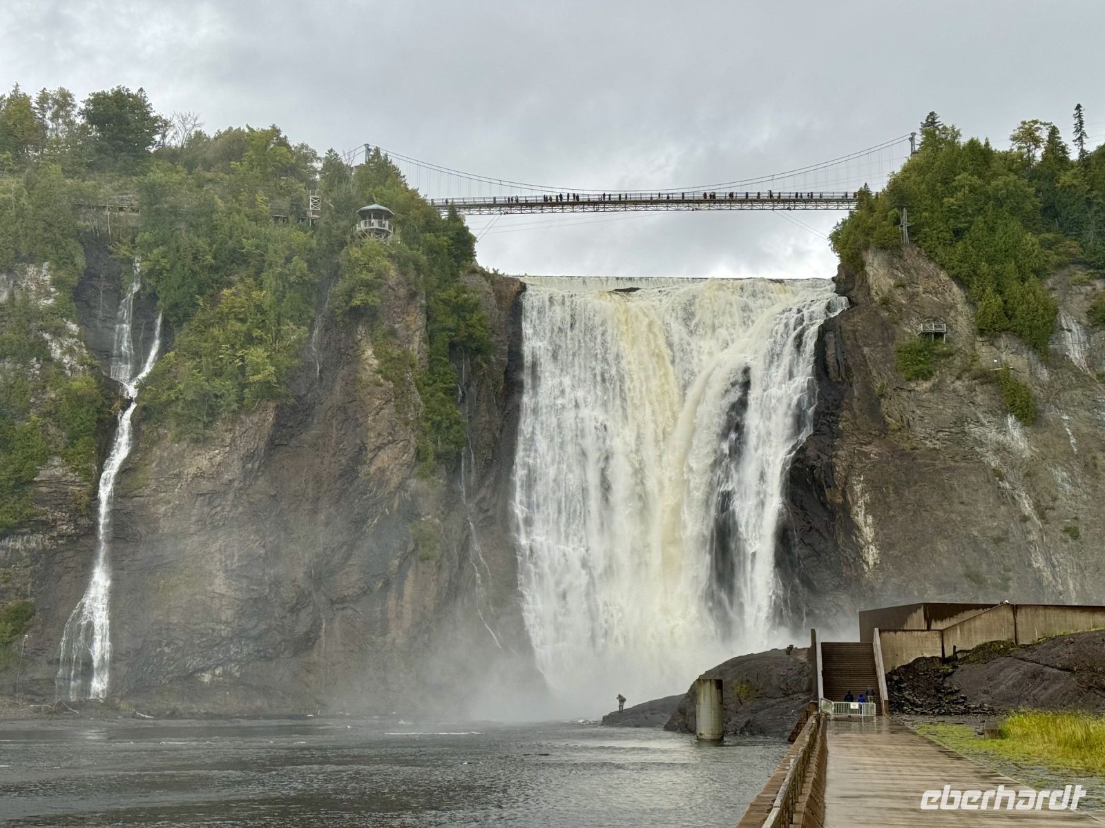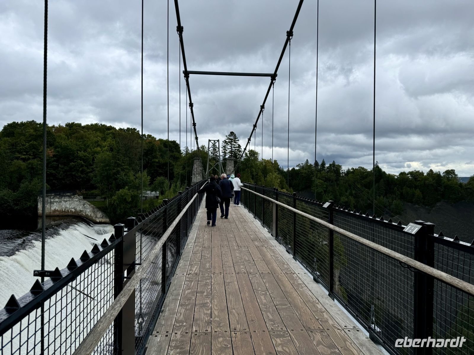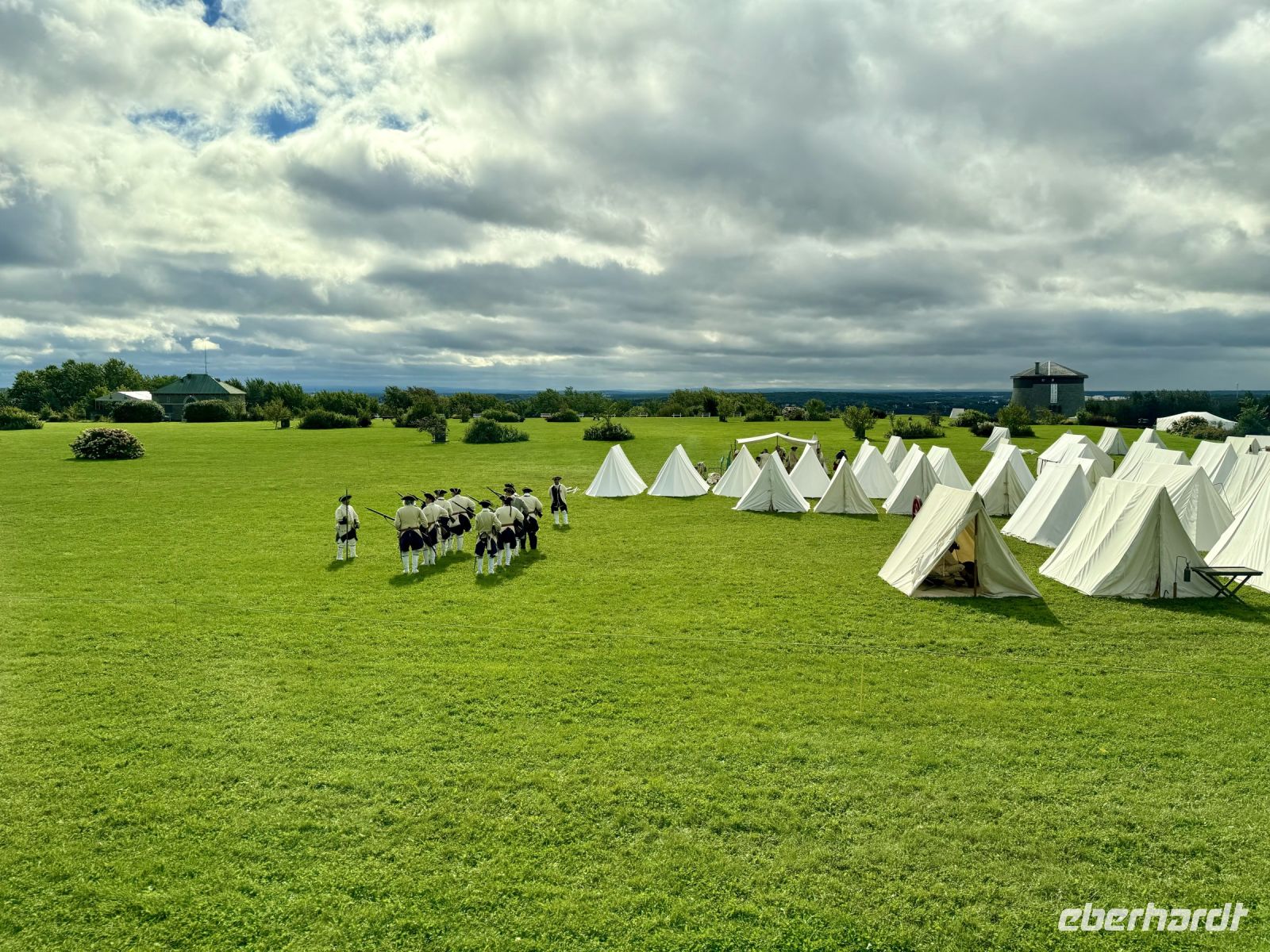 Noch starten wir mit etwas blauem Himmel in den Tag, passend zur Farbe der Flagge von Québec, die über dem Parlamentsgebäude weht. Es ist die erste Station unserer Stadtrundfahrt mit Christine, die uns ihre Wahlheimat bestmöglich präsentieren will. Von hier aus geht es auf die Plains of Abraham. Auf dem Schlachtfeld ist ein ganzes Lager aus Zelten aufgebaut, denn jedes Jahr wird die Auseinandersetzung zwischen Briten und Franzosen nachgestellt. Und wir sind offenbar genau zur richtigen Zeit in Québec. Christine zeigt uns einige schöne, englisch angehauchte Viertel der Oberstadt, damit wir ein Gefühl für das Leben der Einheimischen bekommen. Über die Grande Allée gelangen wir zurück zur Stadtmauer und fahren in die obere Altstadt. Am Luxushotel Château Frontenac steigen wir nochmals aus dem Bus aus und begeben uns zur Dufferin Terrace. Unter uns befindet sich die strategisch wichtige Engstelle des Sankt-Lorenz-Stroms. Dort liegt gerade nur ein kleineres Kreuzfahrtschiff, weshalb es in den Straßen und Gassen vergleichsweise ruhig zugeht. Nun bringt uns Warren schließlich mit dem Bus in die ebenfalls sehr charmante, ja vielleicht sogar noch etwas hübschere untere Altstadt. Diese erkunden wir mit Christine zu Fuß auf einem Spaziergang. Höhepunkte sind dabei das Wandgemälde zur Geschichte der Provinz, die Place Royale mit einer Statue des Sonnenkönigs und die wuselige Rue de Petit-Champlain. Das abrissgefährdete Viertel wurde liebevoll rekonstruiert, sodass wir uns ins Frankreich des 17./18. Jahrhunderts zurückversetzt fühlen. Nachdem wir uns von Christine verabschiedet haben, machen wir hier in der unteren Altstadt auch gleich unsere Mittagspause. Am Nachmittag erkunden wir dann das Gebiet östlich von Québec, fahren also ein Stück aus der Stadt hinaus. Ein Spaziergang durch den Canyon Sainte-Anne steht dabei zuerst auf dem Programm. Über zwei, wahlweise auch drei Hängebrücken erkunden wir die von schönen Wäldern gesäumte Schlucht, in der sich der Rivière Sainte-Anne in die Tiefe stürzt. Die Heilige Anna wird in dieser Region sehr verehrt, weshalb ihr auch die Basilika Sainte-Anne de Beaupré geweiht ist. Dem monumentalen neogotischen Sakralbau statten wir unseren nächsten Besuch ab. An den Montmorency Falls wird es nun ein bisschen düster, ja es fängt sogar leicht zu regnen an. Das war aber nicht mit gebucht! Beeindruckend ist der rund 90 Meter hohe Wasserfall trotzdem. Wir machen erst unten einen Fotostopp und fahren dann zum Manoir Montmorency hinauf, wo wir einen zweiten, etwas längeren Stopp machen. Die Zeit bis zum Abendessen überbrücken wir mir einer kleinen Rundfahrt über die Île d’Orléans, verbunden mit dem Besuch eines kleinen Obstmarktes mit regionalen Erzeugnissen. Solche Bauernmärkte werden in Kanada ganz groß geschrieben und von der Bevölkerung beim Einkaufen bevorzugt (wer es sich leisten kann). Die Insel wirkt auf uns sehr idyllisch. Im Schatten großer Bäume stehen niedliche Häuser. Einige Bewohner können sogar auf die Silhouette der Stadt Québec blicken. Traumhaft. Nun aber los zum Sugar Shack! Am Lac Beauport werden wir bereits erwartet. Wir beginnen mit einer historischen Einführung in die Ahornsirupproduktion, bevor wir zum gemütlichen Teil des Abends übergehen und typische Gerichte der frankokanadischen Küche serviert bekommen. Traditionelle Hausmannskost, verfeinert mit Ahornsirup. Früher wurden auf diese Weise zum Dank die vielen Erntehelfer verköstigt; wir brauchen zum Glück nicht mitzuarbeiten. Als zweiten Nachtisch dürfen wir uns selbst auf Schnee unsere Lollis aus gefrorenem Ahornsirup drehen. Inzwischen ist es dunkel geworden. Draußen flackert ein Lagerfeuer und Lichterketten erhellen den Hof. Zeit für die Rückfahrt zum Hotel. Es war wieder ein langer, aber sehr schöner Tag in Kanada, der dritte unserer großen Rundreise quer durch das Land.