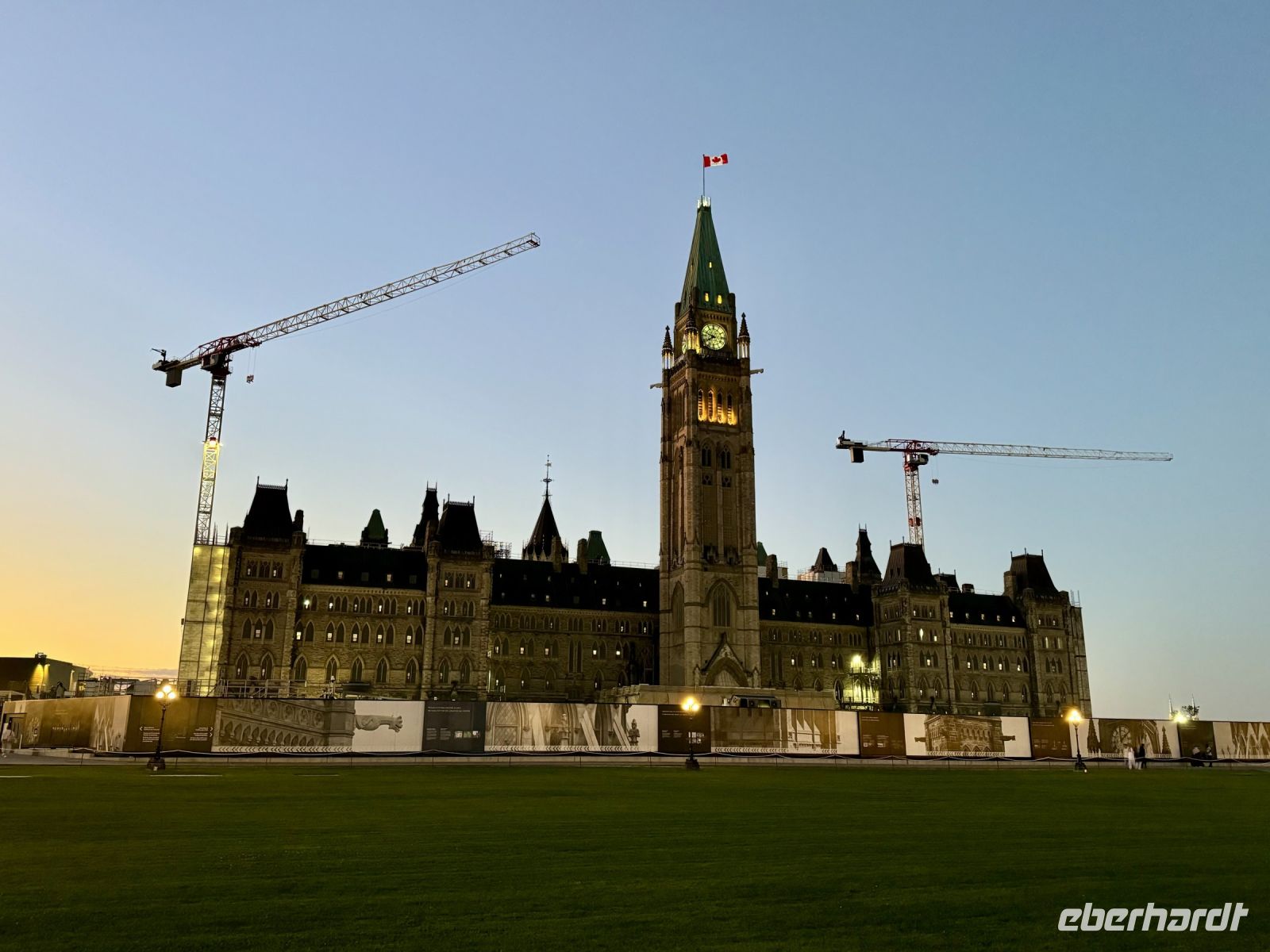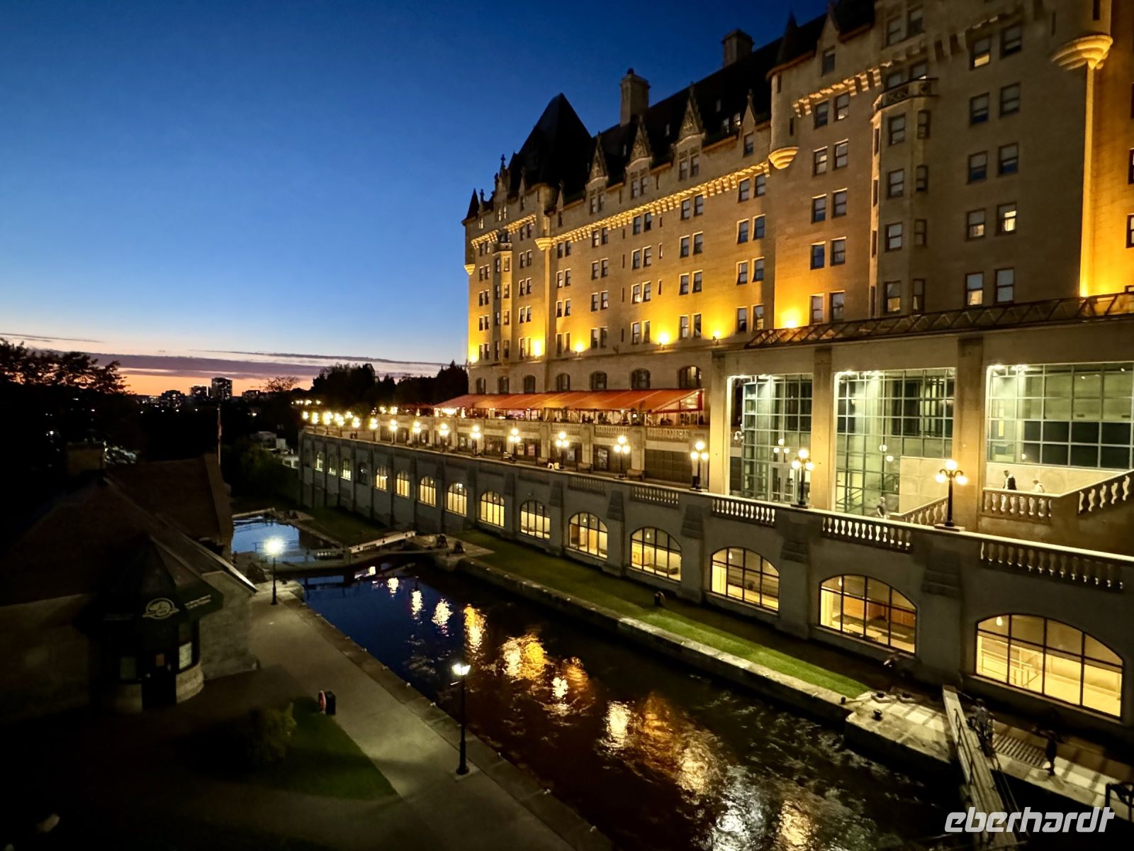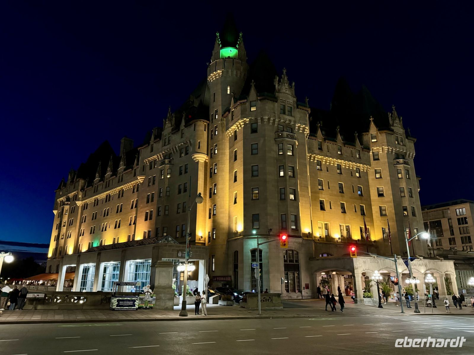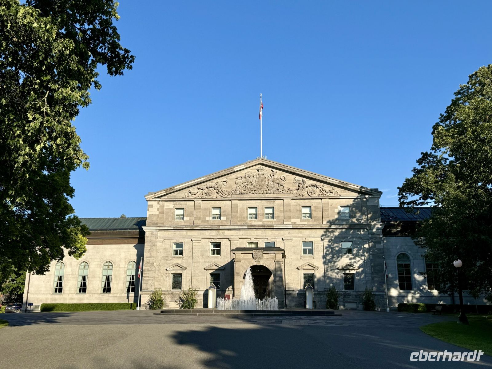 Unser Aufenthalt in der ersten kanadischen Provinz neigt sich langsam dem Ende zu. Die letzte Möglichkeit, von unseren eingerosteten Französischkenntnissen Gebrauch zu machen. Also: Bonjour! Es soll wieder ein schöner Tag werden. Auf Warren wartet am Vormittag aber erstmal eine lange Fahrstrecke. Da braucht er logischerweise zwischendurch dringend einen Kaffee von Tim Hortons. Zum Mittagessen sind wir ins ehrwürdige Château Montebello geladen. Beim 3-Gänge-Menü schlemmen wir mit Blick auf den Ottawa River und die Gartenanlage, lassen uns hier verwöhnen wie einst Helmut Schmidt und Ronald Reagan. Im Anschluss haben wir noch Zeit für eine kleine Erkundung der eindrucksvollen Lobby des aus 10.000 Rotzedern erbauten Eisenbahnhotels im Blockhüttenstil sowie der Außenanlagen des weitläufigen Geländes. Aber nicht nur wir, auch die Tiere im Parc Omega brauchen ihr Mittagessen! Am Eingang wartet schon das verfutterte Wapiti-Empfangskomitee auf unsere Karotten. Mit einem umgebauten Schulbus fahren wir durch den Wildpark und bekommen u. a. auch Wildschweine, Waldwölfe, einen riesigen Elch, niedliche Polarfüchse, Bisons und ganz am Ende natürlich als Höhepunkt Schwarzbären und seltene Zimtbären zu sehen. Während der Pause zwischendurch lässt sich heute auch Herr Biber blicken. Am späten Nachmittag wartet noch die Hauptstadtregion Kanadas auf uns. Unseren Besuch in der Doppelstadt Ottawa/Gatineau beginnen wir mit einem Fotostopp auf der Aussichtsplattform des Nationalmuseums für Geschichte. Genau auf der gegenüberliegenden Seite des Ottawa River sind nämlich fast alle Sehenswürdigkeiten und wichtigen Gebäude wie auf einer Perlenkette aufgereiht: Nationalgalerie, Château Laurier, Rideau-Kanal, das Parlamentsgebäude mit der hübschen Bibliothek und der Supreme Court. Danach fahren wir am Amtssitz des Premierministers vorbei und können heute sogar bis an die Haustür der Generalgouverneurin laufen! Ihr Amtssitz Rideau Hall befindet sich in einer schönen Parkanlage. Beim Schloss Bellevue kämen wir niemals so weit! Das zeigt mal wieder, dass in Kanada alles ein bisschen entspannter zugeht. Auf dem Weg zum Hotel fahren wir noch an der deutschen Botschaft vorbei, die immerhin direkt am Rideau-Kanal liegt. Da kann der Botschafter im Winter immer schön Schlittschuh laufen! Vom Hotel aus machen wir noch einen kleinen Abendspaziergang zum Parlamentshügel und zum Fairmont-Hotel.