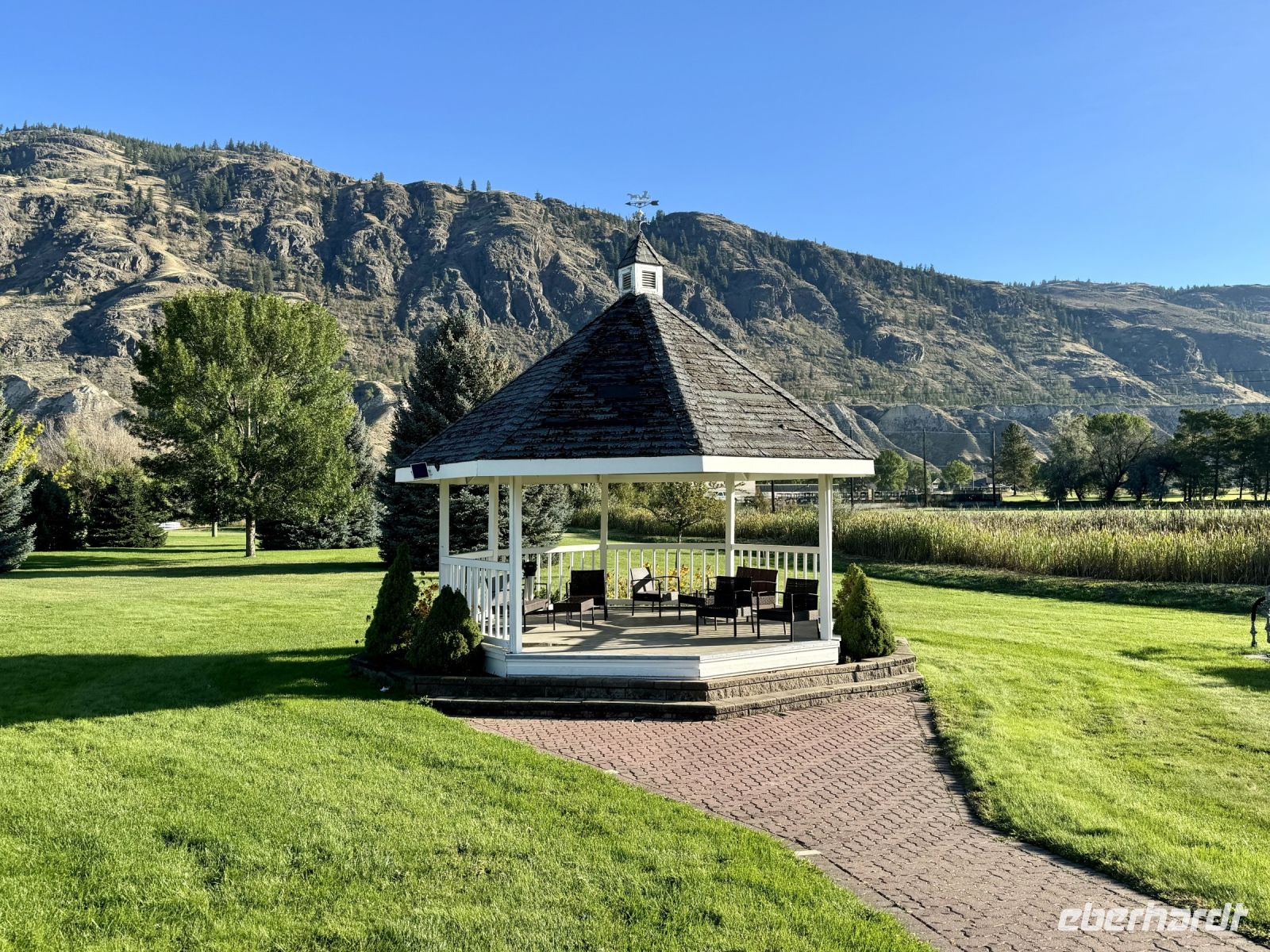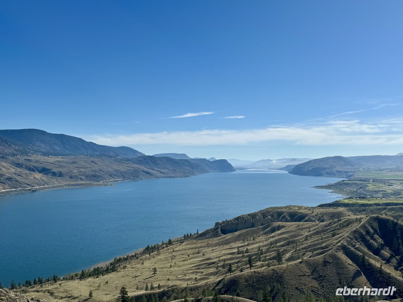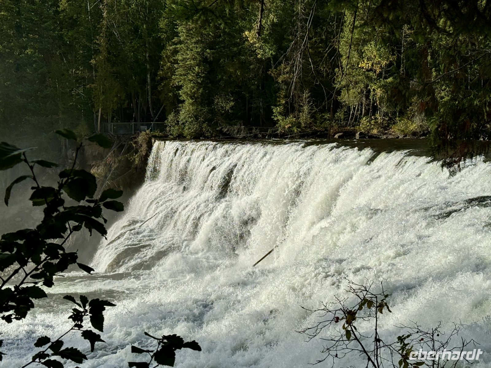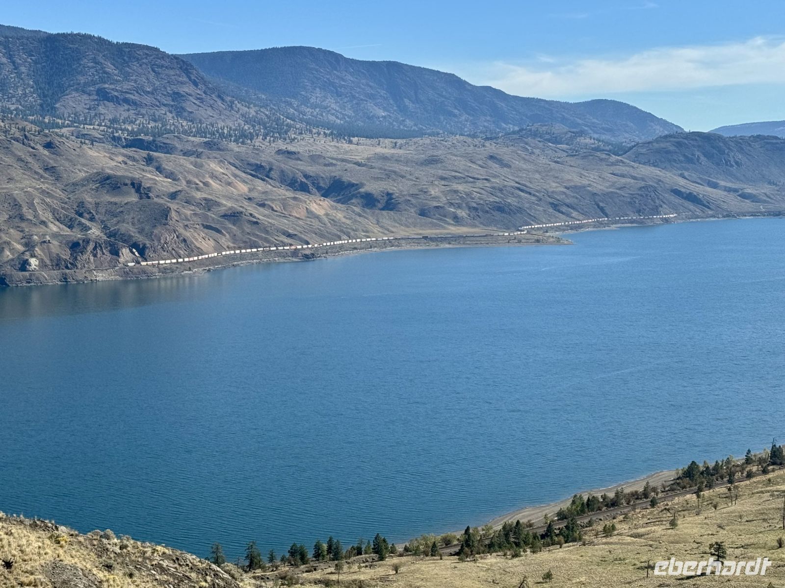 Steve besteht darauf, unseren Gästen noch einige interessante Punkte in Banff zu zeigen, bevor wir diesen Nationalpark und diese Provinz verlassen. So beginnen wir also unseren langen Tag mit einer Fotosession bei der Parkverwaltung. Die Mitarbeiter derselben sitzen in einem schlossartigen Gebäude inmitten einer Gartenanlage und können die ganze Banff Avenue überblicken. Die haben es gut! Auch gut haben es die Gäste dem Vernehmen nach im Banff Springs Hotel. Aber auch wir konnten ja bisher nicht klagen. Imposant sieht es ja schon aus, das weltberühmte Eisenbahnhotel, wie wir bei der Vorbeifahrt feststellen. Wir kehren noch einmal an den Bow River zurück, genauer gesagt an die Bow Falls. Auch auf diesem Fotostopp hat Steve noch bestanden. Es ist ja auch ein schöner Fleck. Nun übernehme ich aber wieder das Kommando auf der Brücke und gebe die Surprise Corner als nächsten Halt vor. An diesem Aussichtspunkt kann man nämlich sehr schön das besagte Banff Springs Hotel vor dem Sulphur Mountain fotografieren. Nur ein Stück weiter warten die Hoodoos auf uns. Die Felsnadeln sind zwar ganz interessant, doch viel schöner ist der Blick über das weite Tal des Bow River. Zwei Fotostopps — zuerst an einem Parkplatz mit dem Castle Mountain im Hintergrund, danach an den Spiral Tunnels, wobei wir leider keinen Güterzug sehen — unterbrechen die Fahrt in den Yoho-Nationalpark. Gleichzeitig überqueren wir damit die Wasserscheide und gelangen in die nächste kanadische Provinz auf unserer Reise, British Columbia. Am smaragdgrün schimmernden Emerald Lake nehmen wir uns die Zeit für einen kleinen Spaziergang am Ufer oder zum Aussichtspunkt auf der Hotel-Halbinsel. Die Uhren haben wir schon um eine Stunde zurückgestellt. Das Wetterglück ist uns derweil wieder hold. Viel blauer Himmel begleitet uns beim Fotostopp an der Natural Bridge über den Kicking Horse River und auf der Weiterfahrt über Golden (hier machen wir unsere Mittagspause) zum Rogers Pass. Die Suche nach geeigneten Pässen für die Eisenbahn und später auch den Trans-Canada Highway über die Berge war immer eine spannende Angelegenheit und erforderte Mut und Pioniergeist — und idealerweise Ureinwohner, die sich in der Gegend auskannten. Der Glacier-Nationalpark ist schon der dritte auf unserer heutigen Route. Bald danach folgt der Mount-Revelstoke-Nationalpark, wo wir einen Spaziergang auf dem Giant Cedar Boardwalk unternehmen und uralte Baumriesen bestaunen. Am letzten Ort, an dem wir heute halten, wurde kanadische Geschichte geschrieben: Der Name „Last Spike“ verrät schon, dass hier der Bau der Eisenbahnstrecke zum Pazifik mit dem letzten eingeschlagenen Nagel feierlich vollendet wurde. Der letzte Streckenabschnitt führt uns an den Sushwap Lakes vorbei in immer trockenere Regionen, bis wir schließlich die halbwüstenartige Gegend um Kamloops erreichen. Einige Kilometer vor der Stadt befindet sich direkt am Fluss unser nächstes Hotel, das South Thompson Inn. Hier warten nach mehr als 500 Kilometern Umleitungsstrecke schöne Zimmer mit einer umlaufenden Veranda und ein leckeres BBQ-Abendessen auf uns.