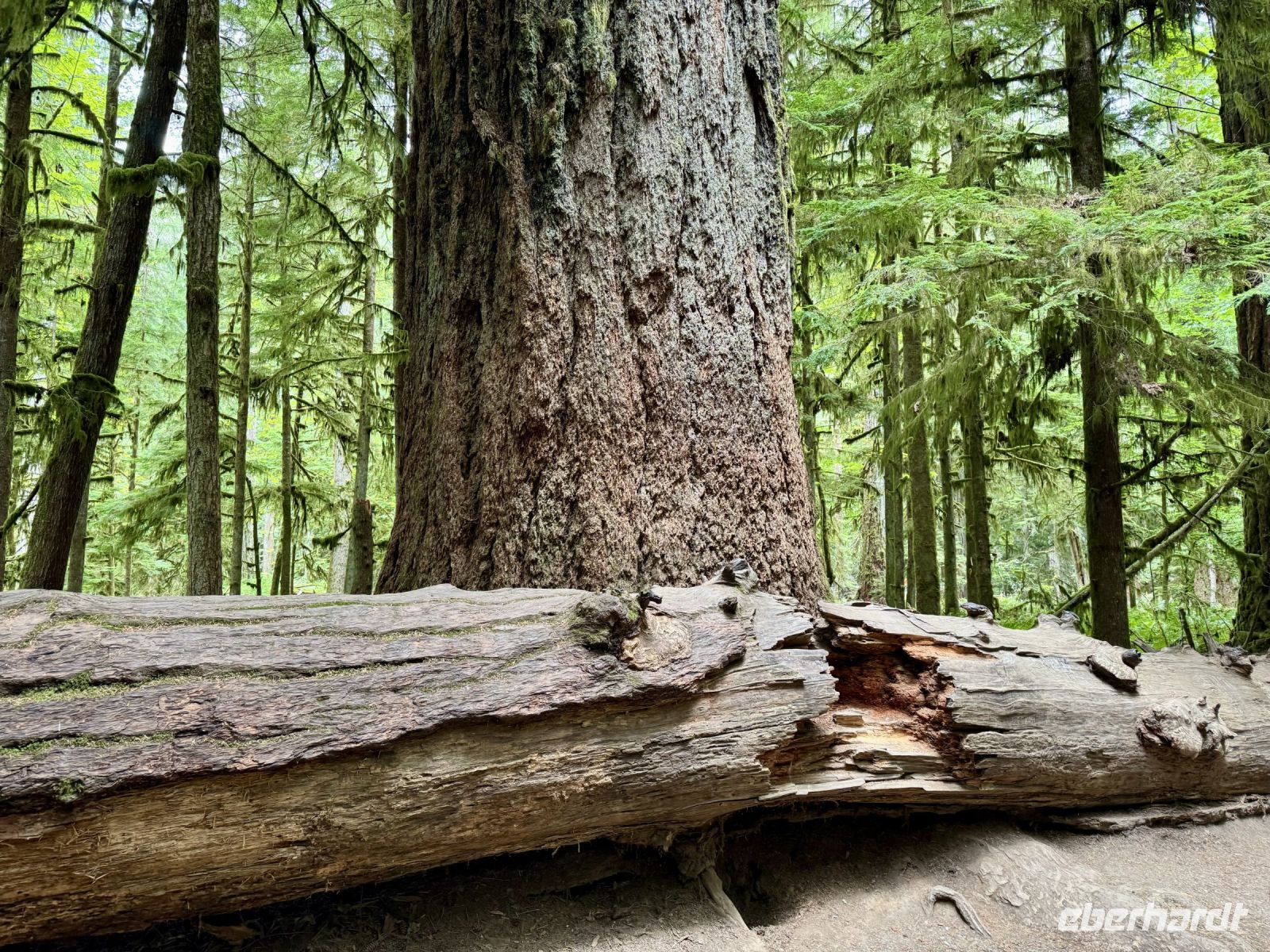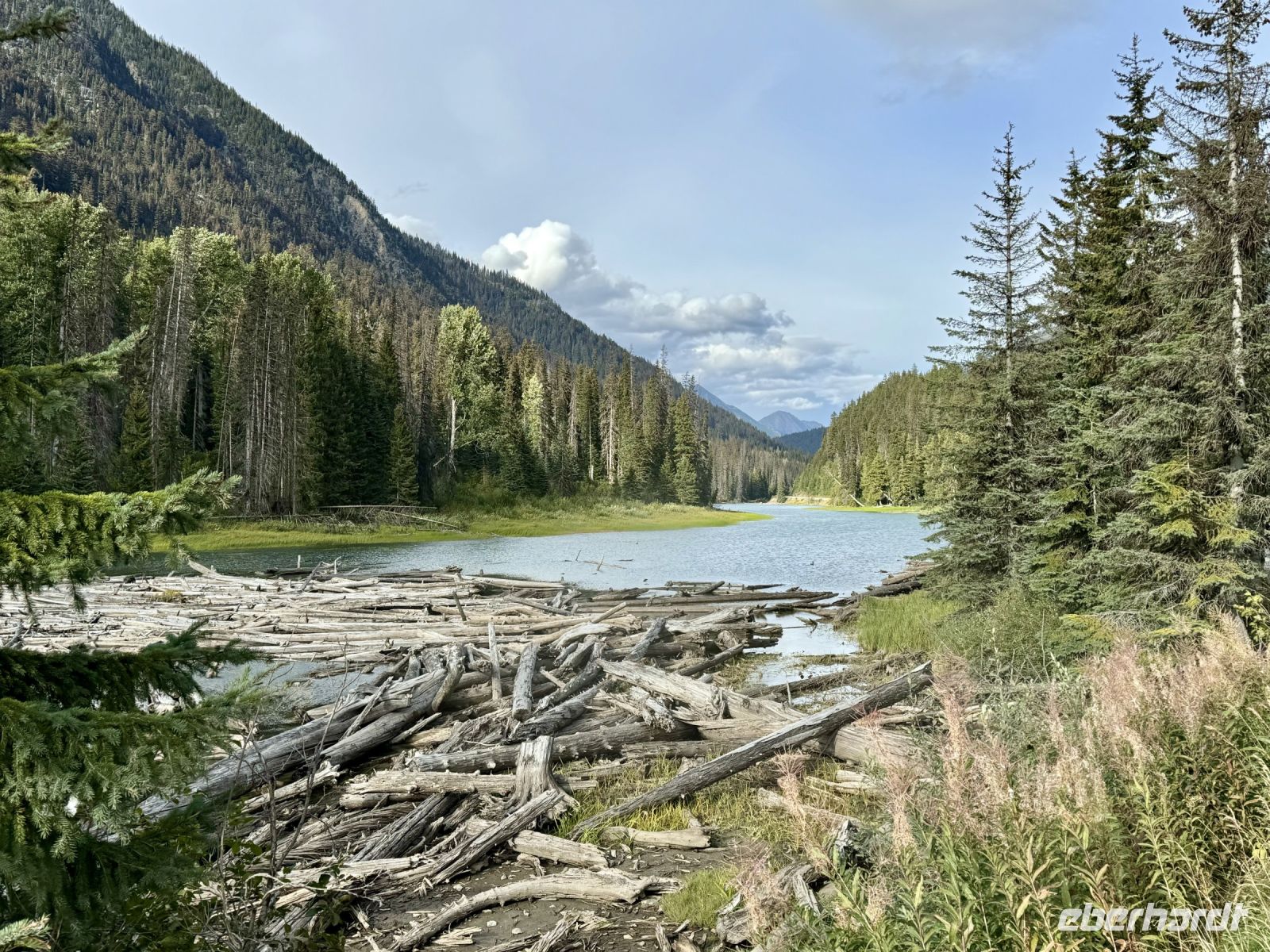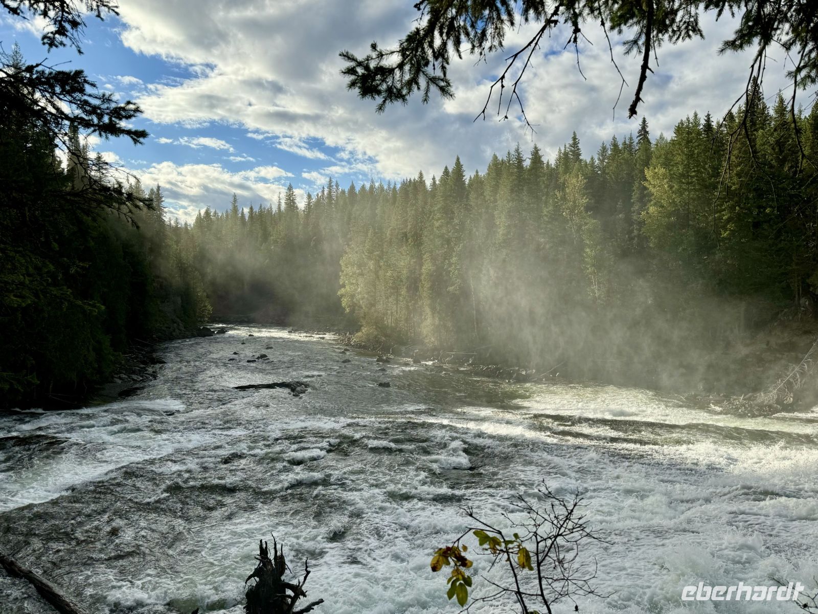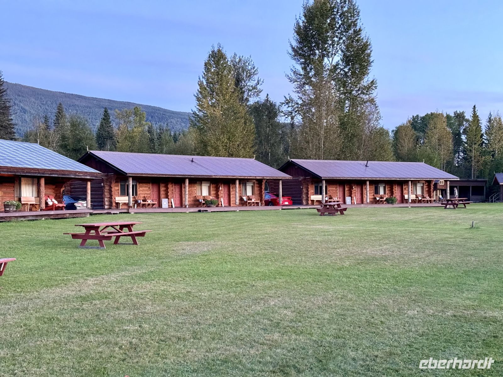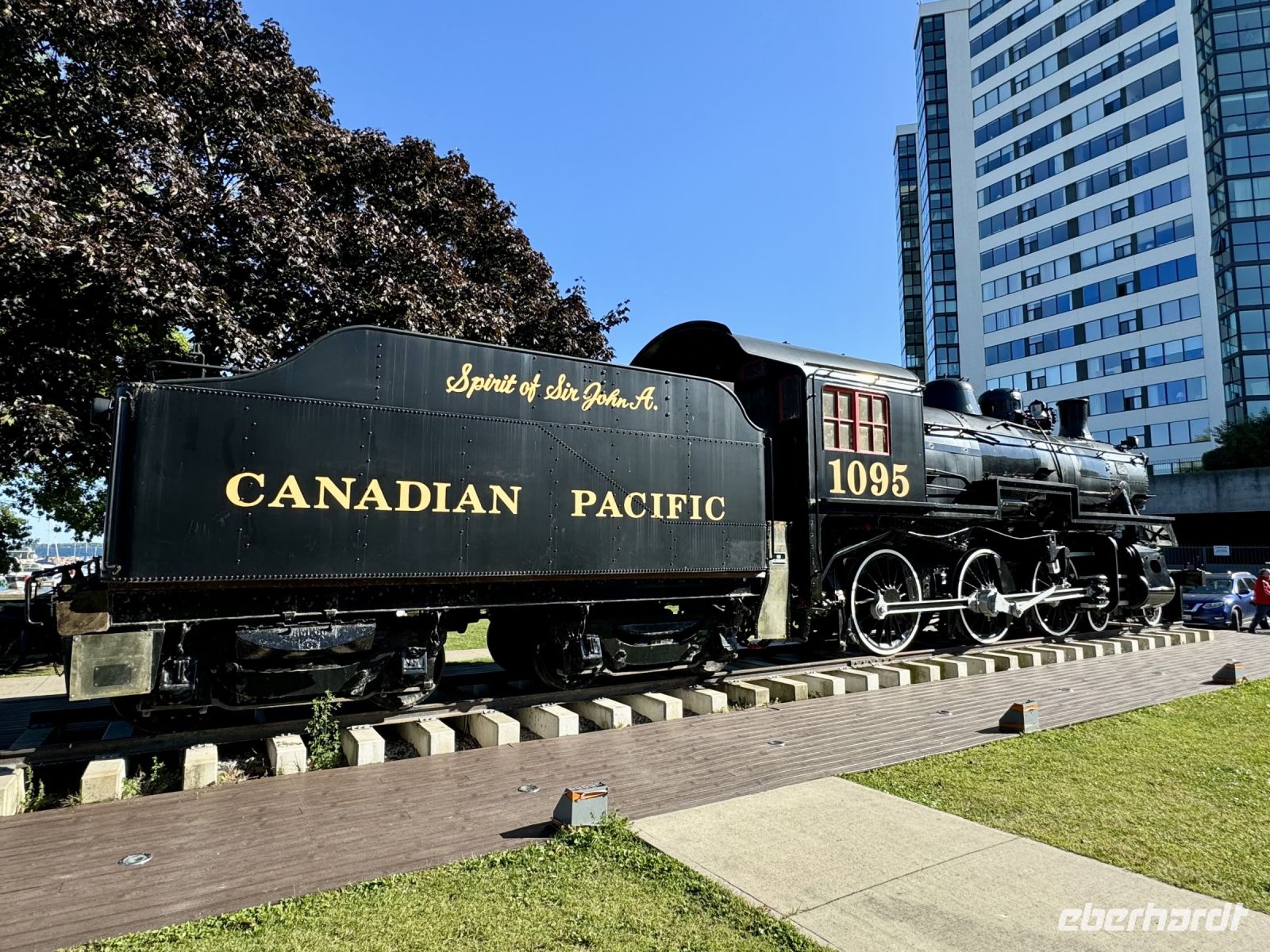 Steve besteht darauf, unseren Gästen noch einige interessante Punkte in Banff zu zeigen, bevor wir diesen Nationalpark und diese Provinz verlassen. So beginnen wir also unseren langen Tag mit einer Fotosession bei der Parkverwaltung. Die Mitarbeiter derselben sitzen in einem schlossartigen Gebäude inmitten einer Gartenanlage und können die ganze Banff Avenue überblicken. Die haben es gut! Auch gut haben es die Gäste dem Vernehmen nach im Banff Springs Hotel. Aber auch wir konnten ja bisher nicht klagen. Imposant sieht es ja schon aus, das weltberühmte Eisenbahnhotel, wie wir bei der Vorbeifahrt feststellen. Wir kehren noch einmal an den Bow River zurück, genauer gesagt an die Bow Falls. Auch auf diesem Fotostopp hat Steve noch bestanden. Es ist ja auch ein schöner Fleck. Nun übernehme ich aber wieder das Kommando auf der Brücke und gebe die Surprise Corner als nächsten Halt vor. An diesem Aussichtspunkt kann man nämlich sehr schön das besagte Banff Springs Hotel vor dem Sulphur Mountain fotografieren. Nur ein Stück weiter warten die Hoodoos auf uns. Die Felsnadeln sind zwar ganz interessant, doch viel schöner ist der Blick über das weite Tal des Bow River. Zwei Fotostopps — zuerst an einem Parkplatz mit dem Castle Mountain im Hintergrund, danach an den Spiral Tunnels, wobei wir leider keinen Güterzug sehen — unterbrechen die Fahrt in den Yoho-Nationalpark. Gleichzeitig überqueren wir damit die Wasserscheide und gelangen in die nächste kanadische Provinz auf unserer Reise, British Columbia. Am smaragdgrün schimmernden Emerald Lake nehmen wir uns die Zeit für einen kleinen Spaziergang am Ufer oder zum Aussichtspunkt auf der Hotel-Halbinsel. Die Uhren haben wir schon um eine Stunde zurückgestellt. Das Wetterglück ist uns derweil wieder hold. Viel blauer Himmel begleitet uns beim Fotostopp an der Natural Bridge über den Kicking Horse River und auf der Weiterfahrt über Golden (hier machen wir unsere Mittagspause) zum Rogers Pass. Die Suche nach geeigneten Pässen für die Eisenbahn und später auch den Trans-Canada Highway über die Berge war immer eine spannende Angelegenheit und erforderte Mut und Pioniergeist — und idealerweise Ureinwohner, die sich in der Gegend auskannten. Der Glacier-Nationalpark ist schon der dritte auf unserer heutigen Route. Bald danach folgt der Mount-Revelstoke-Nationalpark, wo wir einen Spaziergang auf dem Giant Cedar Boardwalk unternehmen und uralte Baumriesen bestaunen. Am letzten Ort, an dem wir heute halten, wurde kanadische Geschichte geschrieben: Der Name „Last Spike“ verrät schon, dass hier der Bau der Eisenbahnstrecke zum Pazifik mit dem letzten eingeschlagenen Nagel feierlich vollendet wurde. Der letzte Streckenabschnitt führt uns an den Sushwap Lakes vorbei in immer trockenere Regionen, bis wir schließlich die halbwüstenartige Gegend um Kamloops erreichen. Einige Kilometer vor der Stadt befindet sich direkt am Fluss unser nächstes Hotel, das South Thompson Inn. Hier warten nach mehr als 500 Kilometern Umleitungsstrecke schöne Zimmer mit einer umlaufenden Veranda und ein leckeres BBQ-Abendessen auf uns.