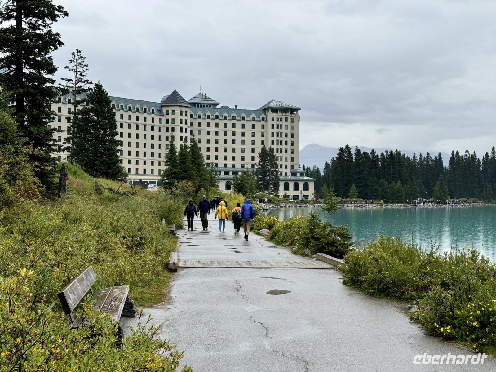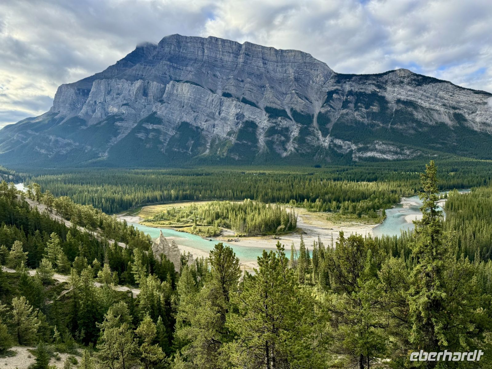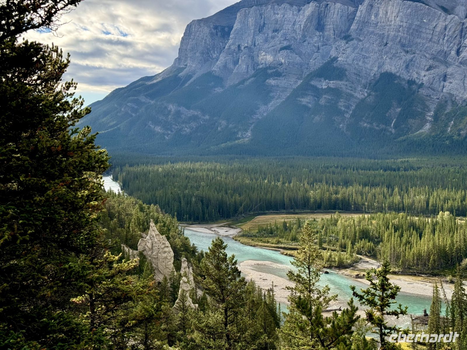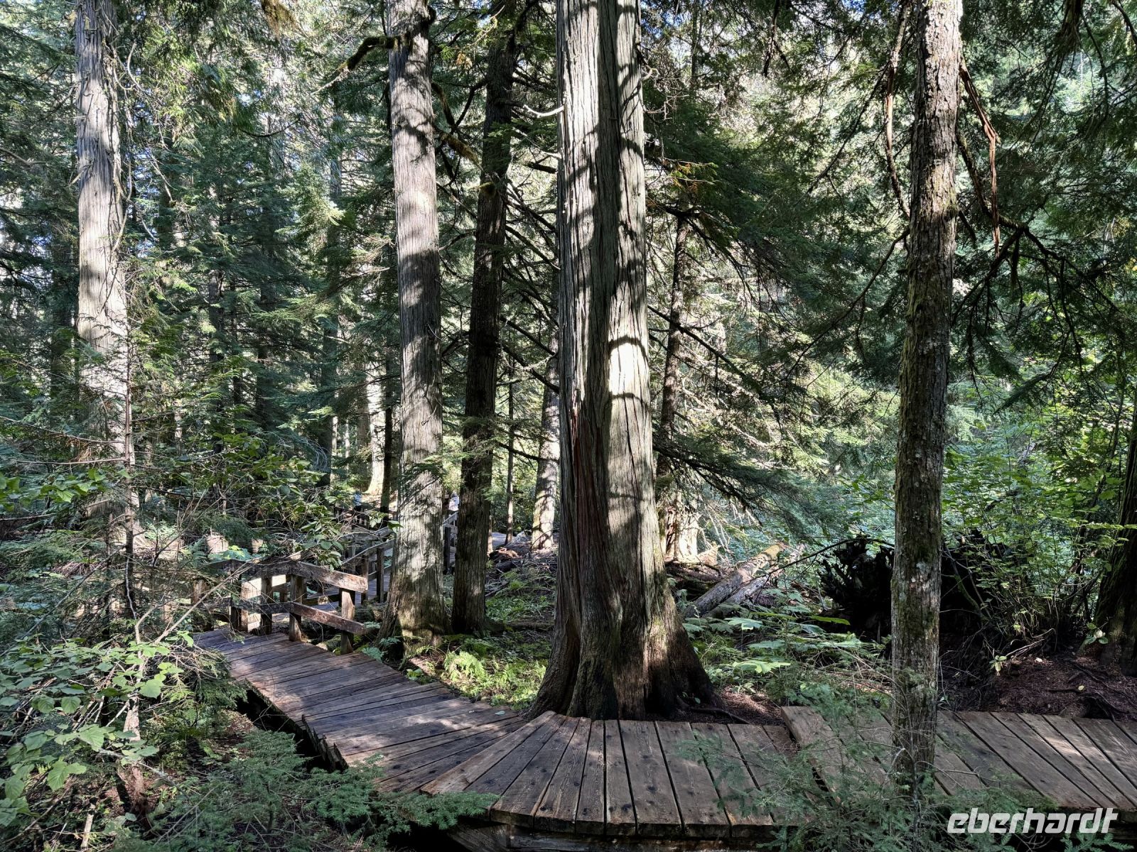 Steve besteht darauf, unseren Gästen noch einige interessante Punkte in Banff zu zeigen, bevor wir diesen Nationalpark und diese Provinz verlassen. So beginnen wir also unseren langen Tag mit einer Fotosession bei der Parkverwaltung. Die Mitarbeiter derselben sitzen in einem schlossartigen Gebäude inmitten einer Gartenanlage und können die ganze Banff Avenue überblicken. Die haben es gut! Auch gut haben es die Gäste dem Vernehmen nach im Banff Springs Hotel. Aber auch wir konnten ja bisher nicht klagen. Imposant sieht es ja schon aus, das weltberühmte Eisenbahnhotel, wie wir bei der Vorbeifahrt feststellen. Wir kehren noch einmal an den Bow River zurück, genauer gesagt an die Bow Falls. Auch auf diesem Fotostopp hat Steve noch bestanden. Es ist ja auch ein schöner Fleck. Nun übernehme ich aber wieder das Kommando auf der Brücke und gebe die Surprise Corner als nächsten Halt vor. An diesem Aussichtspunkt kann man nämlich sehr schön das besagte Banff Springs Hotel vor dem Sulphur Mountain fotografieren. Nur ein Stück weiter warten die Hoodoos auf uns. Die Felsnadeln sind zwar ganz interessant, doch viel schöner ist der Blick über das weite Tal des Bow River. Zwei Fotostopps — zuerst an einem Parkplatz mit dem Castle Mountain im Hintergrund, danach an den Spiral Tunnels, wobei wir leider keinen Güterzug sehen — unterbrechen die Fahrt in den Yoho-Nationalpark. Gleichzeitig überqueren wir damit die Wasserscheide und gelangen in die nächste kanadische Provinz auf unserer Reise, British Columbia. Am smaragdgrün schimmernden Emerald Lake nehmen wir uns die Zeit für einen kleinen Spaziergang am Ufer oder zum Aussichtspunkt auf der Hotel-Halbinsel. Die Uhren haben wir schon um eine Stunde zurückgestellt. Das Wetterglück ist uns derweil wieder hold. Viel blauer Himmel begleitet uns beim Fotostopp an der Natural Bridge über den Kicking Horse River und auf der Weiterfahrt über Golden (hier machen wir unsere Mittagspause) zum Rogers Pass. Die Suche nach geeigneten Pässen für die Eisenbahn und später auch den Trans-Canada Highway über die Berge war immer eine spannende Angelegenheit und erforderte Mut und Pioniergeist — und idealerweise Ureinwohner, die sich in der Gegend auskannten. Der Glacier-Nationalpark ist schon der dritte auf unserer heutigen Route. Bald danach folgt der Mount-Revelstoke-Nationalpark, wo wir einen Spaziergang auf dem Giant Cedar Boardwalk unternehmen und uralte Baumriesen bestaunen. Am letzten Ort, an dem wir heute halten, wurde kanadische Geschichte geschrieben: Der Name „Last Spike“ verrät schon, dass hier der Bau der Eisenbahnstrecke zum Pazifik mit dem letzten eingeschlagenen Nagel feierlich vollendet wurde. Der letzte Streckenabschnitt führt uns an den Sushwap Lakes vorbei in immer trockenere Regionen, bis wir schließlich die halbwüstenartige Gegend um Kamloops erreichen. Einige Kilometer vor der Stadt befindet sich direkt am Fluss unser nächstes Hotel, das South Thompson Inn. Hier warten nach mehr als 500 Kilometern Umleitungsstrecke schöne Zimmer mit einer umlaufenden Veranda und ein leckeres BBQ-Abendessen auf uns.