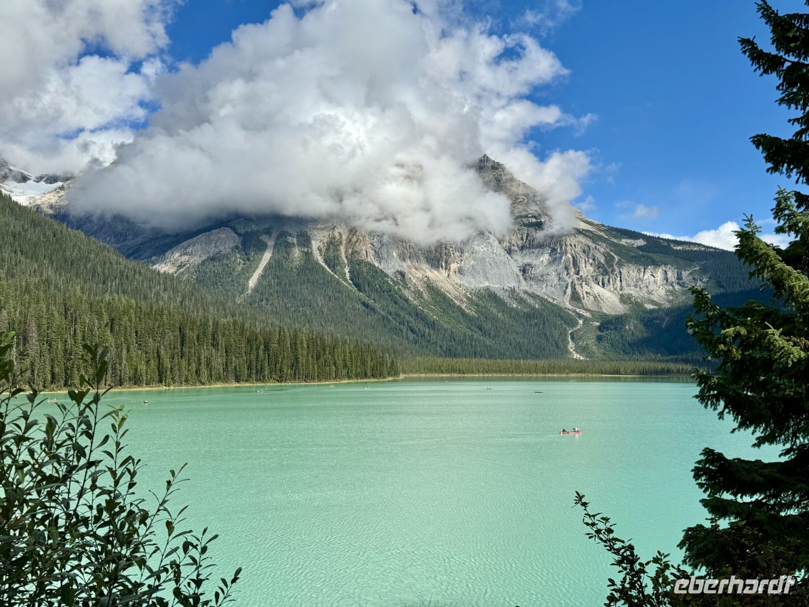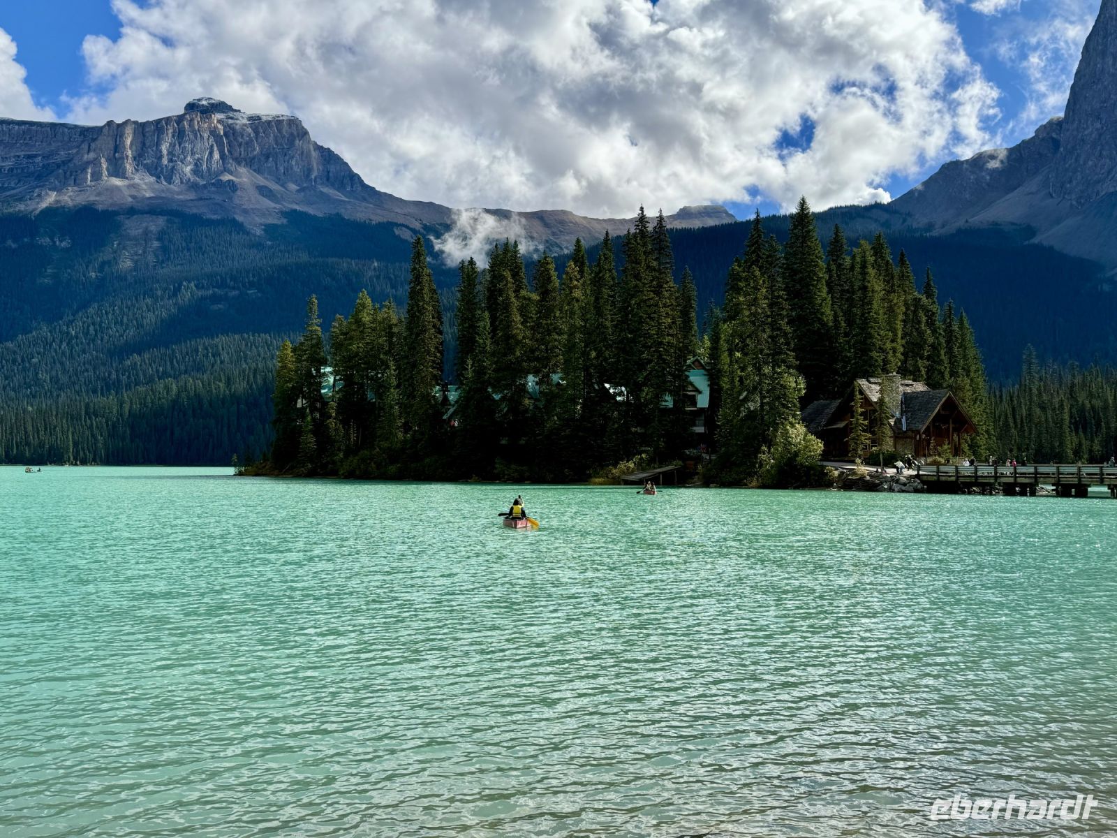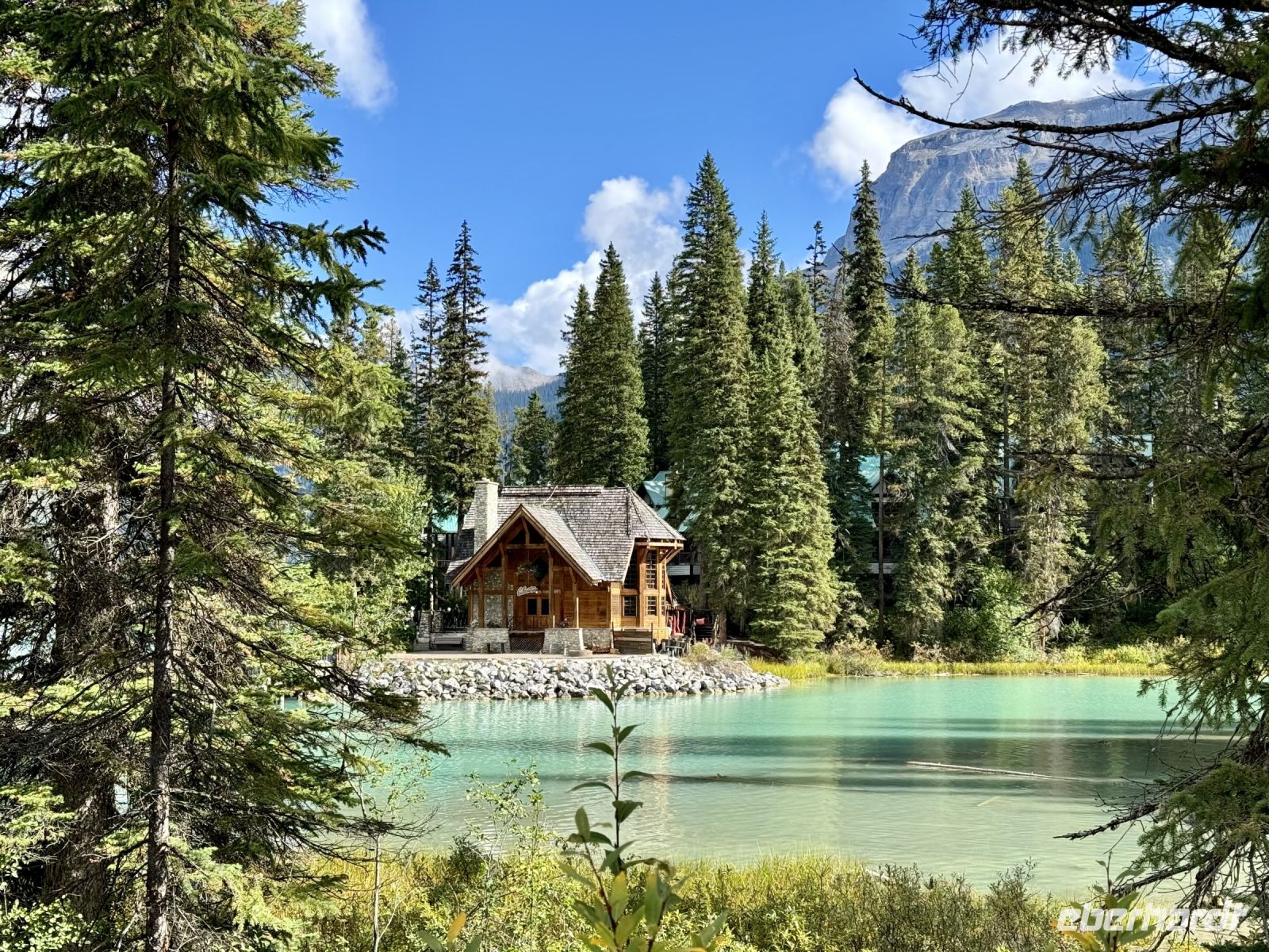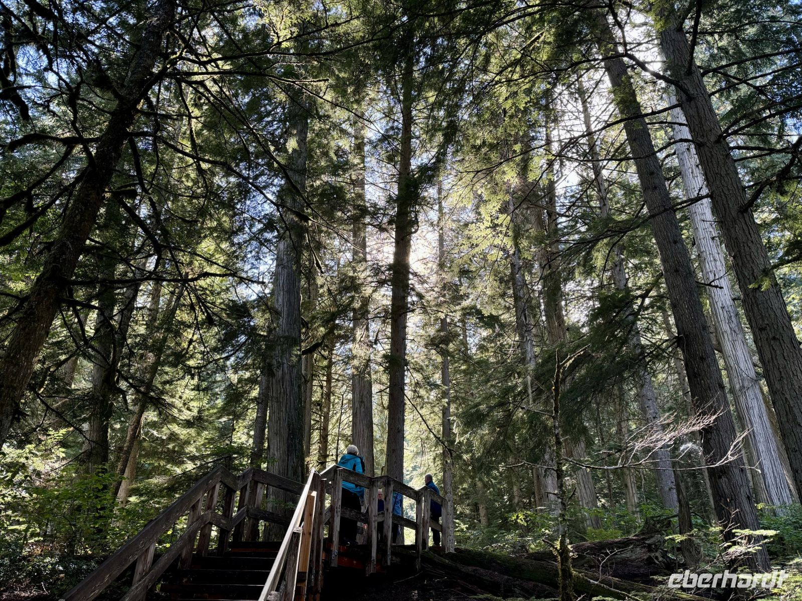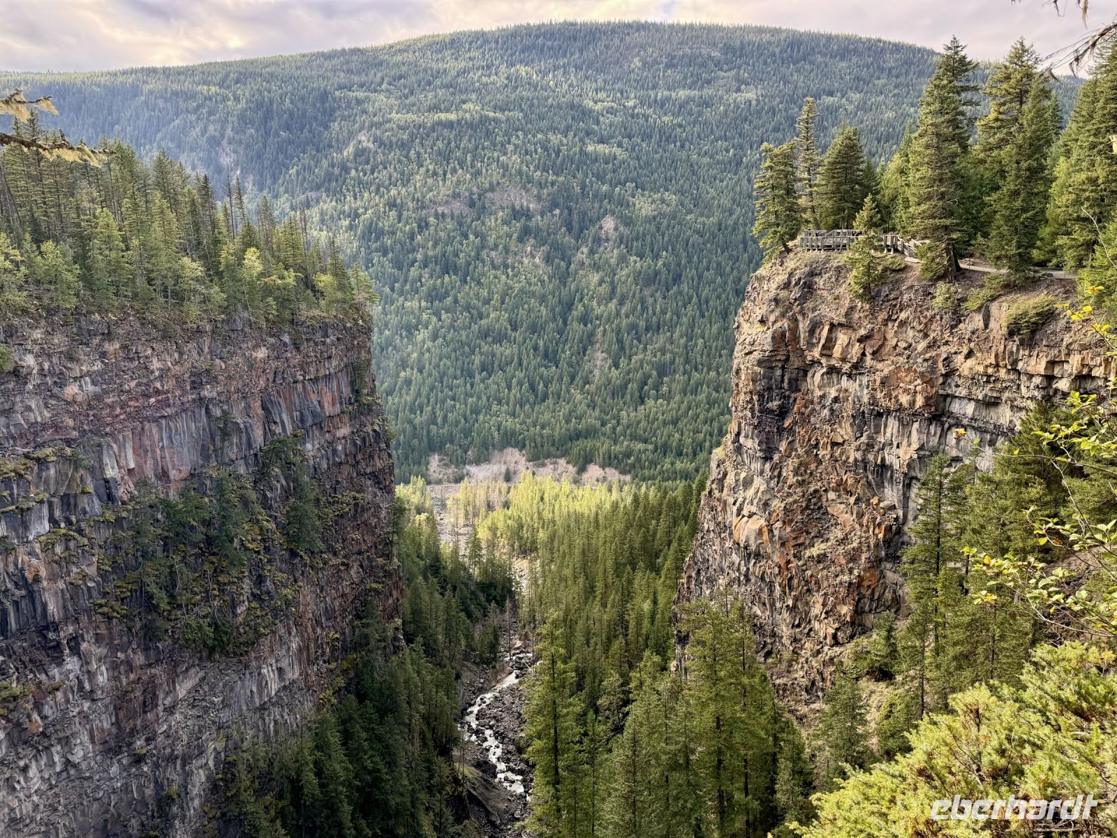 Steve besteht darauf, unseren Gästen noch einige interessante Punkte in Banff zu zeigen, bevor wir diesen Nationalpark und diese Provinz verlassen. So beginnen wir also unseren langen Tag mit einer Fotosession bei der Parkverwaltung. Die Mitarbeiter derselben sitzen in einem schlossartigen Gebäude inmitten einer Gartenanlage und können die ganze Banff Avenue überblicken. Die haben es gut! Auch gut haben es die Gäste dem Vernehmen nach im Banff Springs Hotel. Aber auch wir konnten ja bisher nicht klagen. Imposant sieht es ja schon aus, das weltberühmte Eisenbahnhotel, wie wir bei der Vorbeifahrt feststellen. Wir kehren noch einmal an den Bow River zurück, genauer gesagt an die Bow Falls. Auch auf diesem Fotostopp hat Steve noch bestanden. Es ist ja auch ein schöner Fleck. Nun übernehme ich aber wieder das Kommando auf der Brücke und gebe die Surprise Corner als nächsten Halt vor. An diesem Aussichtspunkt kann man nämlich sehr schön das besagte Banff Springs Hotel vor dem Sulphur Mountain fotografieren. Nur ein Stück weiter warten die Hoodoos auf uns. Die Felsnadeln sind zwar ganz interessant, doch viel schöner ist der Blick über das weite Tal des Bow River. Zwei Fotostopps — zuerst an einem Parkplatz mit dem Castle Mountain im Hintergrund, danach an den Spiral Tunnels, wobei wir leider keinen Güterzug sehen — unterbrechen die Fahrt in den Yoho-Nationalpark. Gleichzeitig überqueren wir damit die Wasserscheide und gelangen in die nächste kanadische Provinz auf unserer Reise, British Columbia. Am smaragdgrün schimmernden Emerald Lake nehmen wir uns die Zeit für einen kleinen Spaziergang am Ufer oder zum Aussichtspunkt auf der Hotel-Halbinsel. Die Uhren haben wir schon um eine Stunde zurückgestellt. Das Wetterglück ist uns derweil wieder hold. Viel blauer Himmel begleitet uns beim Fotostopp an der Natural Bridge über den Kicking Horse River und auf der Weiterfahrt über Golden (hier machen wir unsere Mittagspause) zum Rogers Pass. Die Suche nach geeigneten Pässen für die Eisenbahn und später auch den Trans-Canada Highway über die Berge war immer eine spannende Angelegenheit und erforderte Mut und Pioniergeist — und idealerweise Ureinwohner, die sich in der Gegend auskannten. Der Glacier-Nationalpark ist schon der dritte auf unserer heutigen Route. Bald danach folgt der Mount-Revelstoke-Nationalpark, wo wir einen Spaziergang auf dem Giant Cedar Boardwalk unternehmen und uralte Baumriesen bestaunen. Am letzten Ort, an dem wir heute halten, wurde kanadische Geschichte geschrieben: Der Name „Last Spike“ verrät schon, dass hier der Bau der Eisenbahnstrecke zum Pazifik mit dem letzten eingeschlagenen Nagel feierlich vollendet wurde. Der letzte Streckenabschnitt führt uns an den Sushwap Lakes vorbei in immer trockenere Regionen, bis wir schließlich die halbwüstenartige Gegend um Kamloops erreichen. Einige Kilometer vor der Stadt befindet sich direkt am Fluss unser nächstes Hotel, das South Thompson Inn. Hier warten nach mehr als 500 Kilometern Umleitungsstrecke schöne Zimmer mit einer umlaufenden Veranda und ein leckeres BBQ-Abendessen auf uns.
