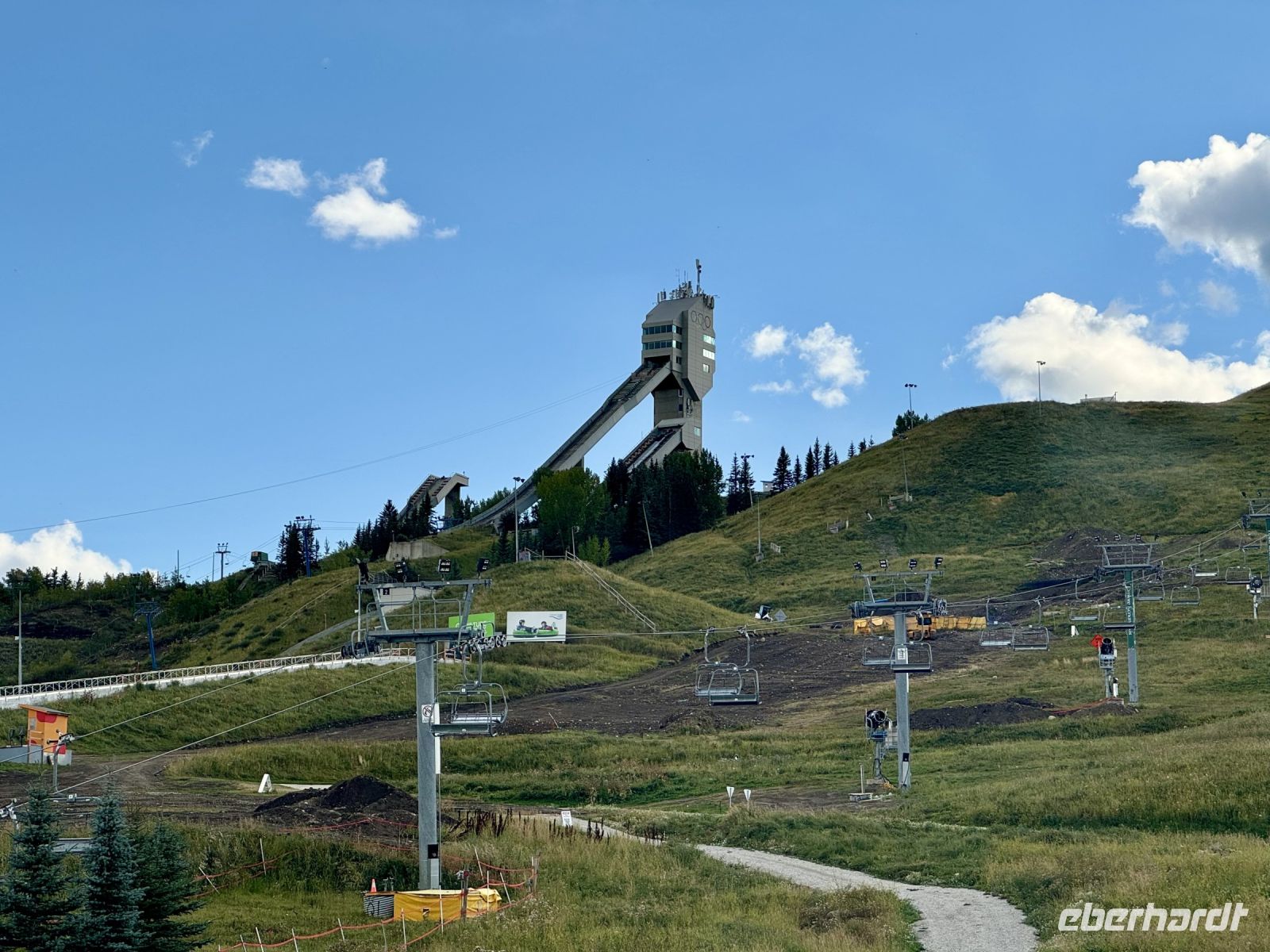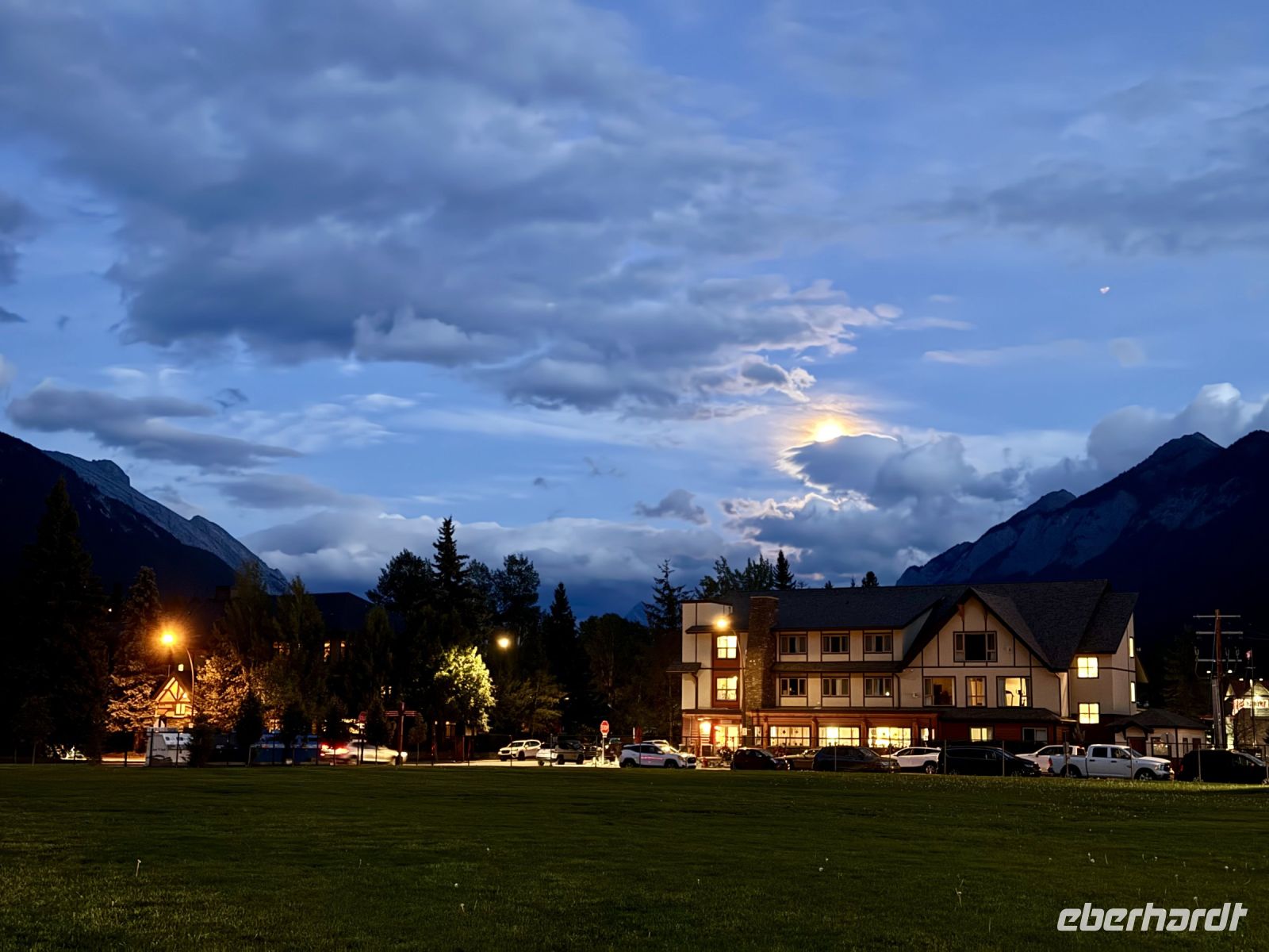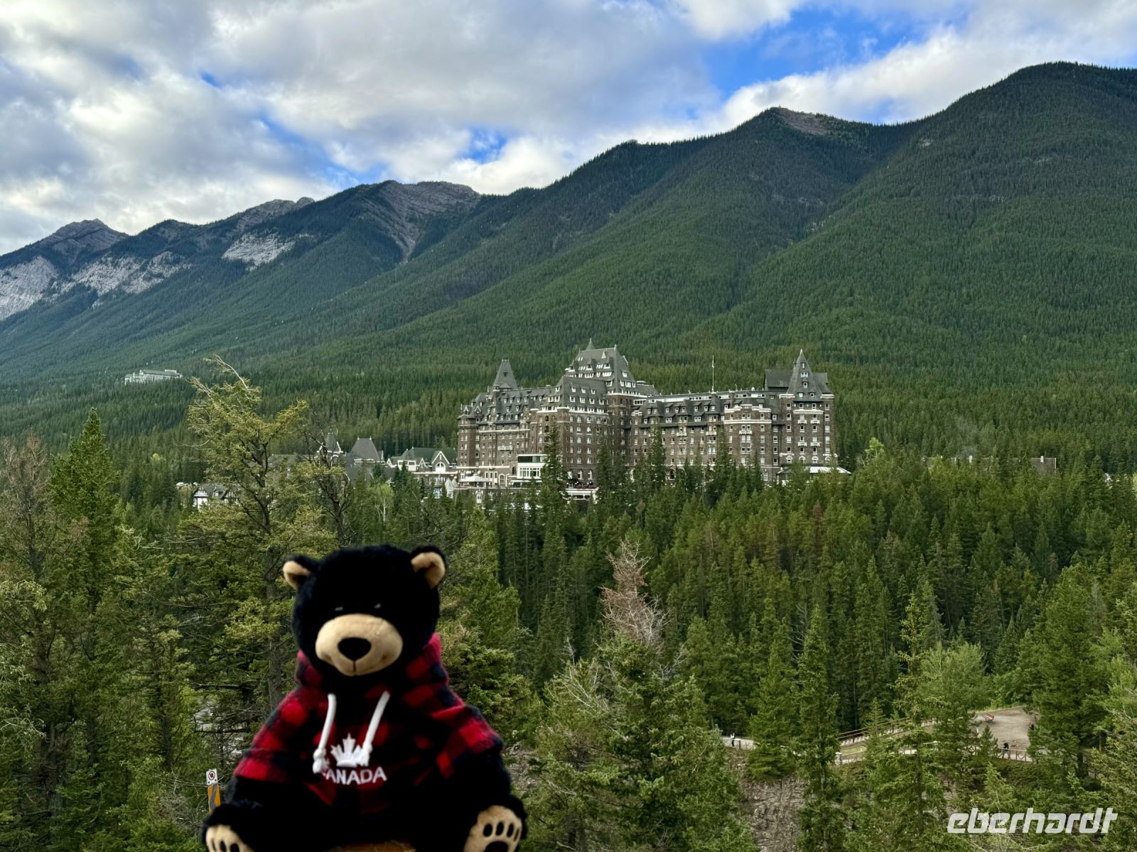 Noch etwas schlaftrunken begeben wir uns am frühen Morgen zum Bus. Mit dem schönen Feuerwerk über den Wasserfällen noch vor dem inneren Auge nehmen wir Abschied vom Osten Kanadas. Warren wählt extra die Mautstrecke, damit wir auch wirklich pünktlich zum Flughafen von Toronto kommen. Am Ende sind wir sogar wider Erwarten sehr zeitig da, aber besser so als andersrum. Auf dem Queen Elizabeth Way würden wir wahrscheinlich immer noch im Stau stecken. Hat er also gut gemacht, unser Warren, wie alles in den letzten Tagen. Seinen großen Applaus und einen gut gefüllten Umschlag hat er sich verdient. Über die fast endlos erscheinenden Weiten der Prärieprovinzen Saskatchewan und Manitoba fliegen wir mit Air Canada nach Calgary … und machen dort nach Ankunft erstmal eine kleine Mittagspause im Food Court des Flughafens. Die Stärkung haben wir nötig, denn wir müssen noch einmal zwei Stunden Zeitumstellung verkraften und haben dadurch außerdem einen langen Tag vor uns. Mit großer Freude besteigen wir unseren Bus für den Westteil der Reise: Er ist gerade ein halbes Jahr alt, sieht auch noch aus wie neu, und ist noch einmal komfortabler als unser Bus im Osten. Auch unser neuer Fahrer Steve hinterlässt einen guten ersten Eindruck. Mit ihm brechen wir bei sonnigem Wetter zunächst zu einer kleinen Erkundungstour durch Calgary auf, die ganz im Zeichen der Geschichte und der Olympischen Winterspiele von 1988 steht. Denn nach einem Fotostopp am historischen Fort Calgary folgt ein Abstecher zur Saddledome Arena (wir denken an Katarina Witt), dann fahren wir am Rathaus und dem Olympic Plaza vorbei und schließlich halten wir noch einmal am Stadtrand im Olympiapark, wo wir in den Jamaika-Bob aus dem Disneyfilm „Cool Runnings“ klettern und die Sprungschanzen fotografieren. Auf dem Trans-Canada Highway nähern wir uns dann den Rocky Mountains. Auf die Berge haben wir uns alle schon gefreut. Wir können sogar am Nachmittag noch einen Spaziergang durch den Johnston Canyon unternehmen, dabei die frische Bergluft schnuppern und dem Klang des rauschenden Wassers lauschen. Außerdem gibt es hier leckeres, sahniges Softeis! Unser Hotel in Banff gefällt uns gut und ist auch gut gelegen. Wir flitzen zum Abendessen im El Toro (auch wieder lecker!), wo wir später auf die Eberhardt-Wandergruppe treffen, die uns noch ein ganzes Stück verfolgen wird. Die Nacht ist noch jung, der Mond über Banff scheint hell, taucht Berge und Täler in ein magisches Licht — ideale Bedingungen für einen kleinen Spaziergang entlang der Banff Avenue, bis uns schließlich die Müdigkeit überkommt.