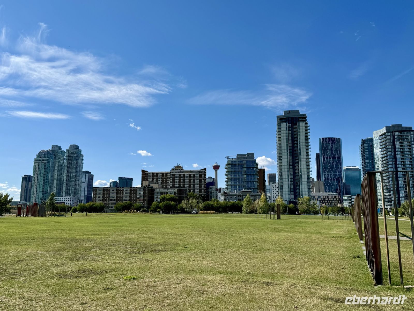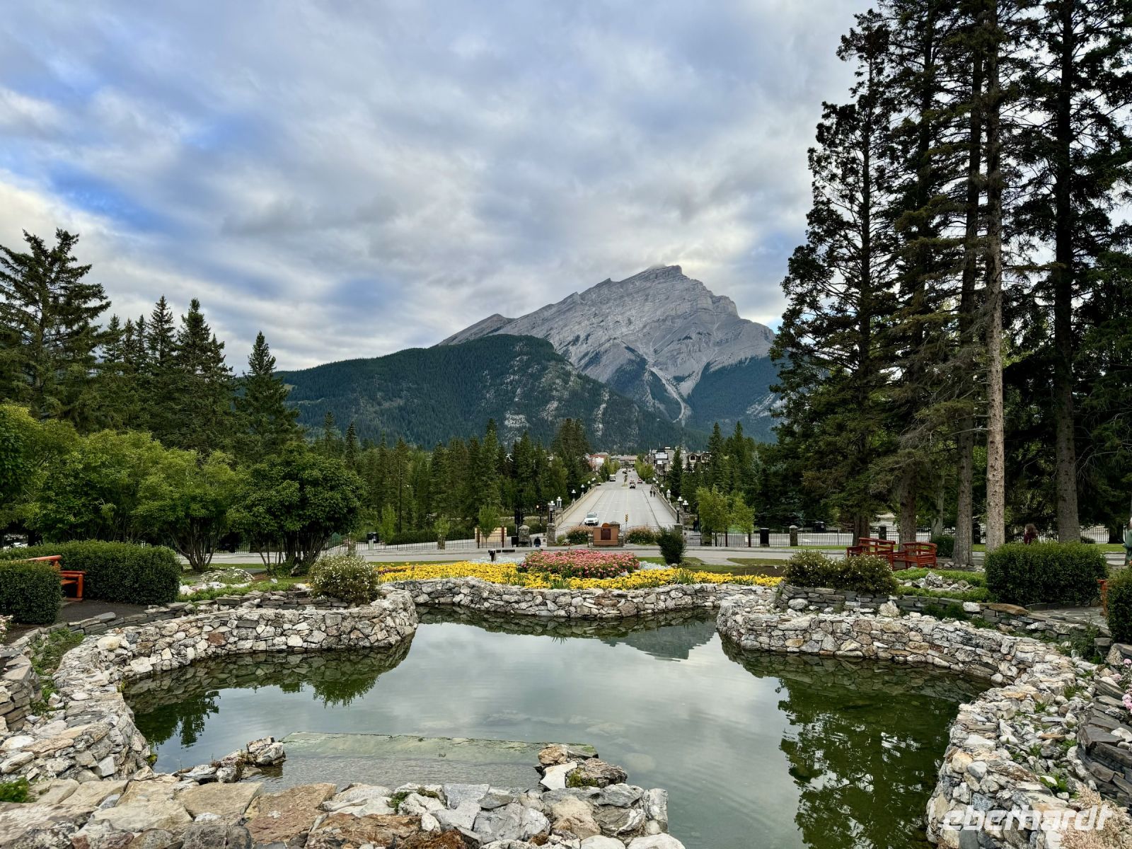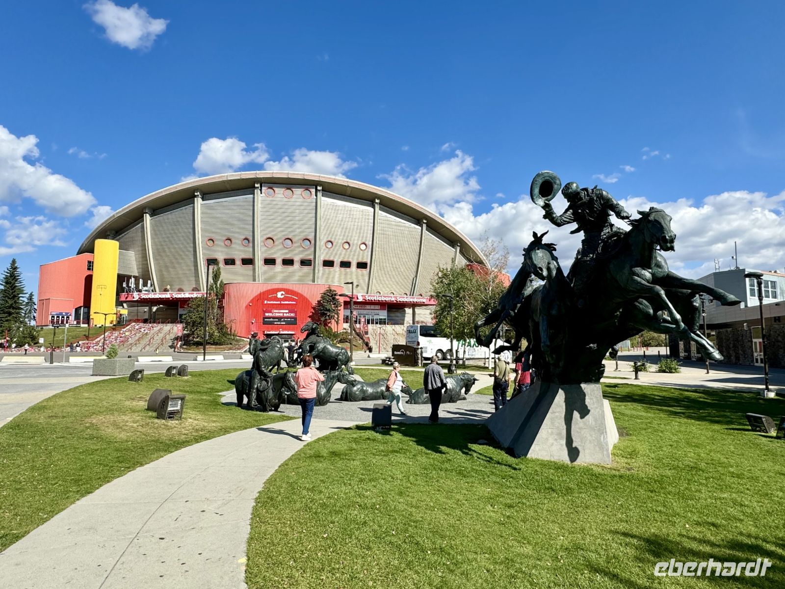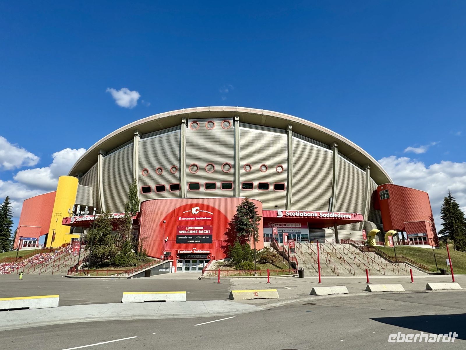 Noch etwas schlaftrunken begeben wir uns am frühen Morgen zum Bus. Mit dem schönen Feuerwerk über den Wasserfällen noch vor dem inneren Auge nehmen wir Abschied vom Osten Kanadas. Warren wählt extra die Mautstrecke, damit wir auch wirklich pünktlich zum Flughafen von Toronto kommen. Am Ende sind wir sogar wider Erwarten sehr zeitig da, aber besser so als andersrum. Auf dem Queen Elizabeth Way würden wir wahrscheinlich immer noch im Stau stecken. Hat er also gut gemacht, unser Warren, wie alles in den letzten Tagen. Seinen großen Applaus und einen gut gefüllten Umschlag hat er sich verdient. Über die fast endlos erscheinenden Weiten der Prärieprovinzen Saskatchewan und Manitoba fliegen wir mit Air Canada nach Calgary … und machen dort nach Ankunft erstmal eine kleine Mittagspause im Food Court des Flughafens. Die Stärkung haben wir nötig, denn wir müssen noch einmal zwei Stunden Zeitumstellung verkraften und haben dadurch außerdem einen langen Tag vor uns. Mit großer Freude besteigen wir unseren Bus für den Westteil der Reise: Er ist gerade ein halbes Jahr alt, sieht auch noch aus wie neu, und ist noch einmal komfortabler als unser Bus im Osten. Auch unser neuer Fahrer Steve hinterlässt einen guten ersten Eindruck. Mit ihm brechen wir bei sonnigem Wetter zunächst zu einer kleinen Erkundungstour durch Calgary auf, die ganz im Zeichen der Geschichte und der Olympischen Winterspiele von 1988 steht. Denn nach einem Fotostopp am historischen Fort Calgary folgt ein Abstecher zur Saddledome Arena (wir denken an Katarina Witt), dann fahren wir am Rathaus und dem Olympic Plaza vorbei und schließlich halten wir noch einmal am Stadtrand im Olympiapark, wo wir in den Jamaika-Bob aus dem Disneyfilm „Cool Runnings“ klettern und die Sprungschanzen fotografieren. Auf dem Trans-Canada Highway nähern wir uns dann den Rocky Mountains. Auf die Berge haben wir uns alle schon gefreut. Wir können sogar am Nachmittag noch einen Spaziergang durch den Johnston Canyon unternehmen, dabei die frische Bergluft schnuppern und dem Klang des rauschenden Wassers lauschen. Außerdem gibt es hier leckeres, sahniges Softeis! Unser Hotel in Banff gefällt uns gut und ist auch gut gelegen. Wir flitzen zum Abendessen im El Toro (auch wieder lecker!), wo wir später auf die Eberhardt-Wandergruppe treffen, die uns noch ein ganzes Stück verfolgen wird. Die Nacht ist noch jung, der Mond über Banff scheint hell, taucht Berge und Täler in ein magisches Licht — ideale Bedingungen für einen kleinen Spaziergang entlang der Banff Avenue, bis uns schließlich die Müdigkeit überkommt.