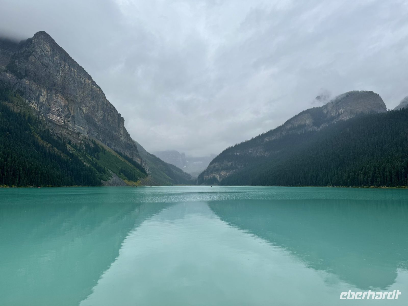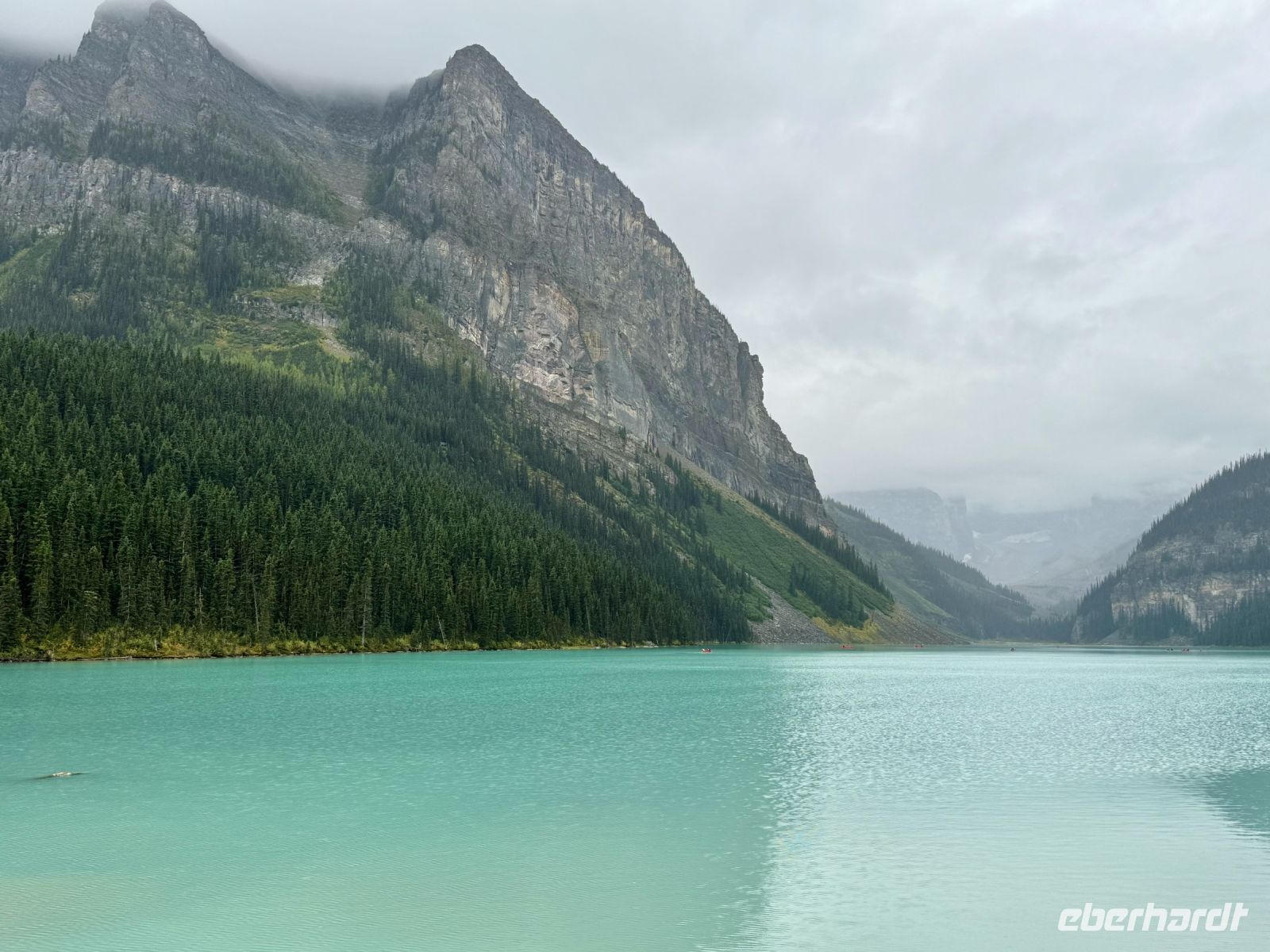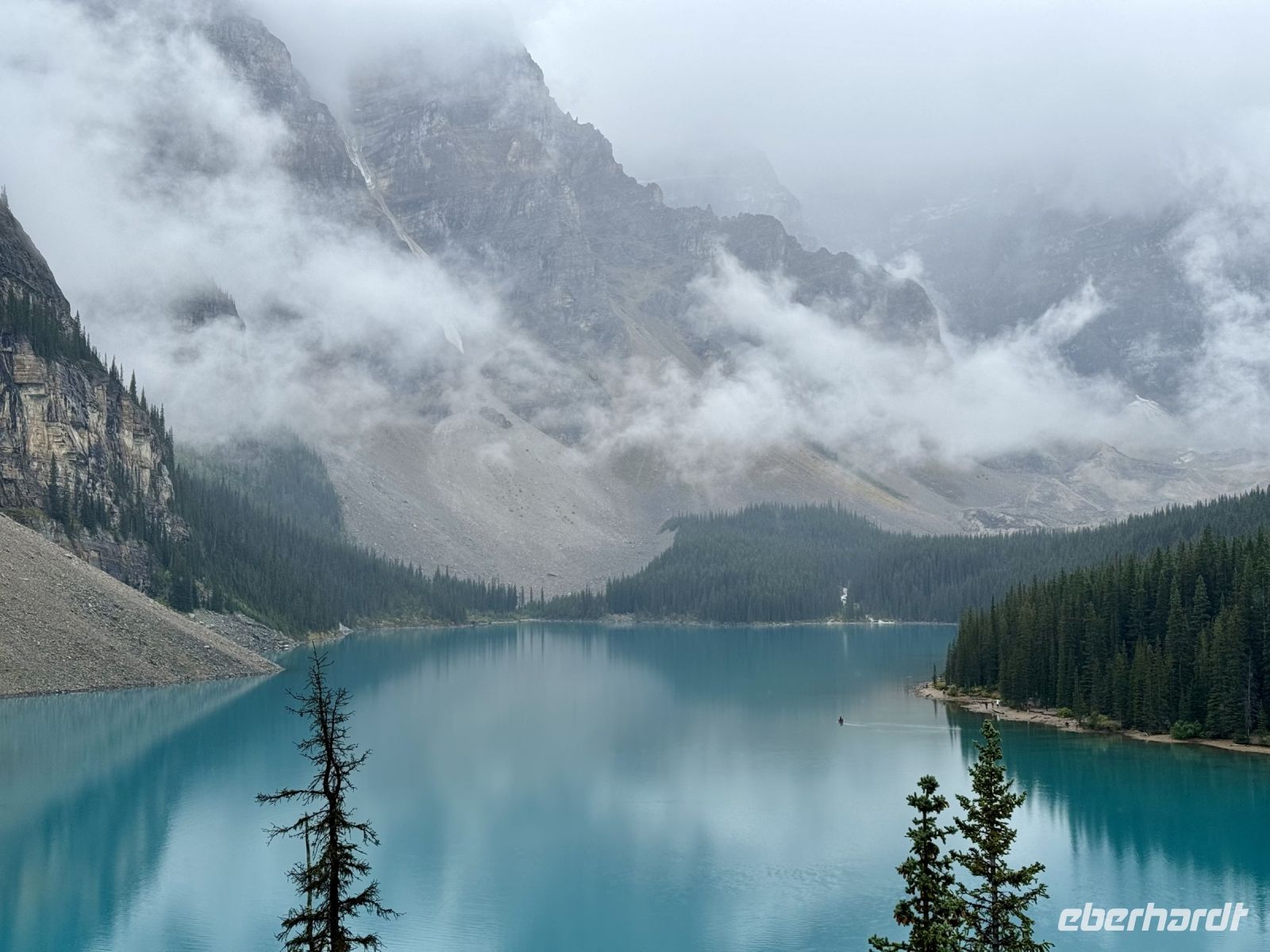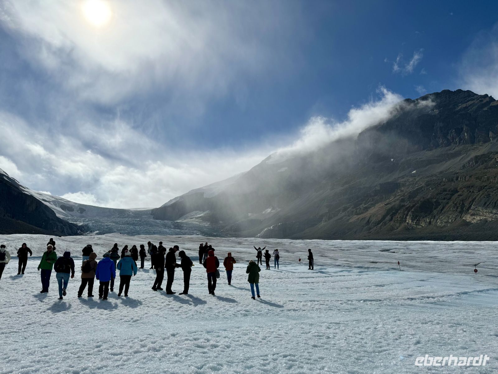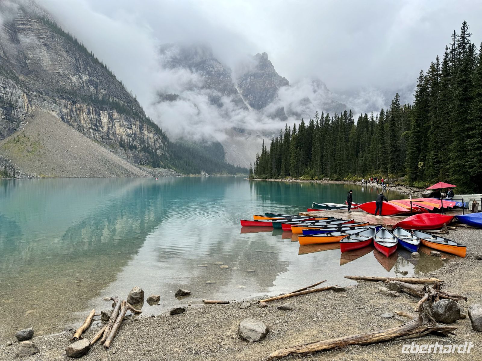 Auch Wetterengel können nicht jeden Tag Glück haben. Außerdem brauchen die Pflanzen und Bäume ja auch ab und zu Wasser von oben zum Wachsen. Damit will ich umschreiben, dass es heute ausnahmsweise mal regnet, zumindest in der ersten Tageshälfte und besonders bei unserem Besuch am berühmten Lake Louise. Aber der Regen ist nicht sehr stark; viel unangenehmer sind die schon fast winterlichen Temperaturen von nur 8 Grad. Da kommen Mütze und Schal zum Einsatz. Anfangs sind nur wenige Touristen am Gletschersee, doch nach und nach rauschen die Busse heran, vor allem auch die Shuttlebusse aus Banff und von den Pkw-Parkplätzen in der Umgebung. Am Lake Louise gibt es seit einigen Jahren nur noch „voll“ und „noch voller“, doch wer will es aller Welt verübeln, sich dieses Kleinod in den Rocky Mountains anschauen zu wollen? Am benachbarten Moraine Lake geht es dank strikter Zugangsbeschränkungen etwas beschaulicher zu. Ich finde es hier sogar noch schöner als am Lake Louise, vor allem, wenn man sich die Mühe macht und den Geröllhügel, der den See aufstaut, bis zum Aussichtspunkt erklimmt. Dann ist der Blickwinkel perfekt und die Farbe des Sees kommt besonders schön zur Geltung. Ein paar Nebelschwaden ziehen zusätzlich durchs Tal und verleihen dem Ganzen eine mystische Atmosphäre. Wer nicht spirituell veranlagt ist — hier und jetzt könnte man anfangen, an Tiergeister und den großen Manitou zu glauben. Auf dem Icefields Parkway wartet gegen Mittag mit dem Peyto Lake der dritte Gletschersee auf uns. Auch hier blicken wir von einer erhöhten Position auf das weite Tal und den See hinab, dessen Farbe ein bisschen mehr ins Grüne geht. Die Lücken in der Wolkendecke stimmen optimistisch, dass wir später auf dem Gletscher nicht im Regen stehen, ja vielleicht sogar wieder schönes Wetter haben werden. Am Saskatchewan Crossing machen wir Mittagspause und dann wartet kurz hinter der Grenze zum Jasper-Nationalpark die Auffahrt auf den Athabasca-Gletscher auf uns. Dazu klettern wir in Spezialbusse mit riesigen, mannshohen Reifen, die uns in gemächlichem Tempo hinauf auf die Seitenmoräne und über eine sehr, sehr, sehr steile Piste hinab (!) auf den Gletscher bringen. Allein diese Fahrt ist schon ein einmaliges Erlebnis. Auf dem Gletscher können wir uns ein bisschen bewegen und uns sogar eiskaltes Gletscherwasser abfüllen. Und wir haben wirklich wieder großes Glück: Sonnenschein, blauer Himmel — und als wir wieder unten am Besucherzentrum sind, regnet es oben auf dem Gletscher. Auf der Rückfahrt auf dem Icefields Parkway ziehen die Berge und kleinere Gletscher nochmals an uns vorbei. Am Bow Lake und Crowfoot Glacier machen wir den letzten Stopp, dann fahren wir bis Banff durch. Der restliche Abend steht uns zur freien Verfügung. Wir schwärmen daher aus und erkunden nochmals die Banff Avenue mit ihren Restaurants und Kneipen.