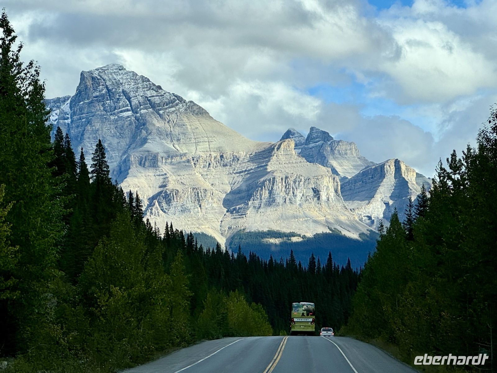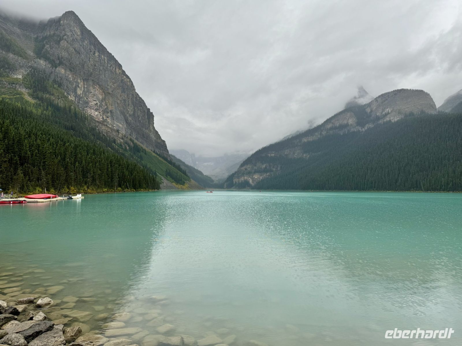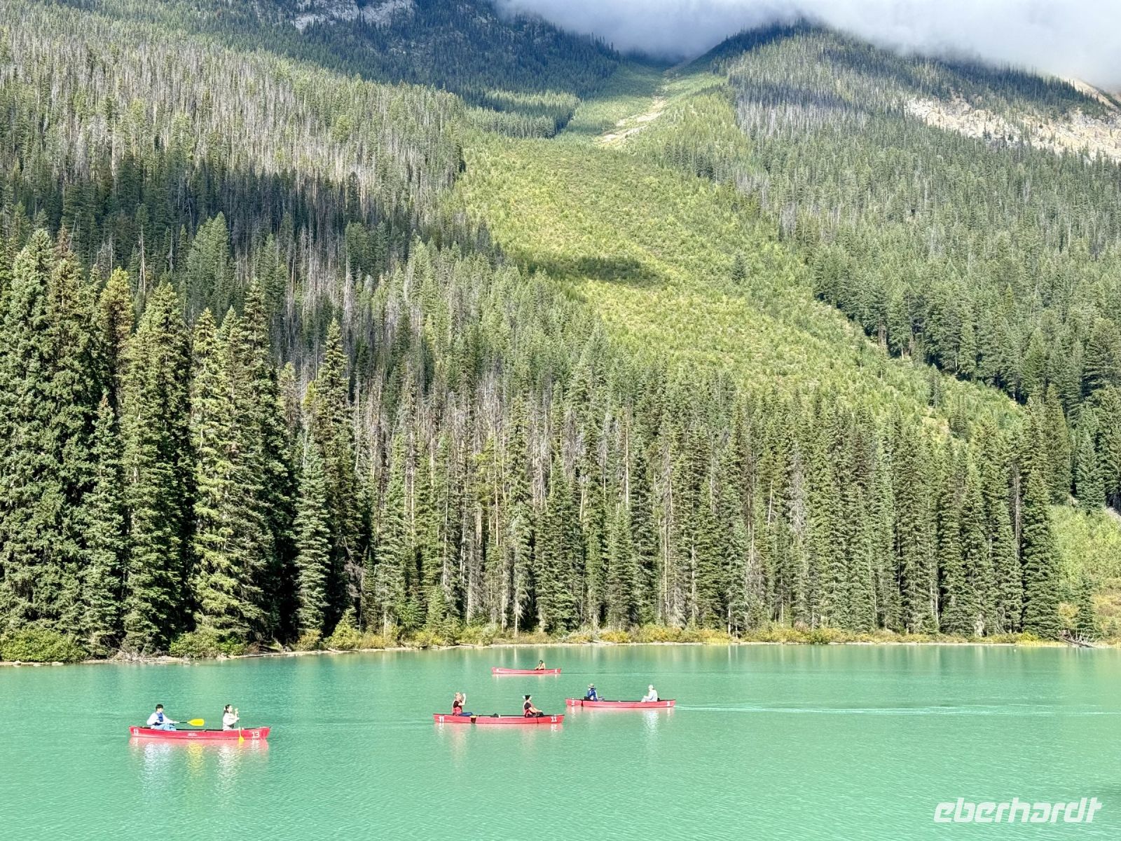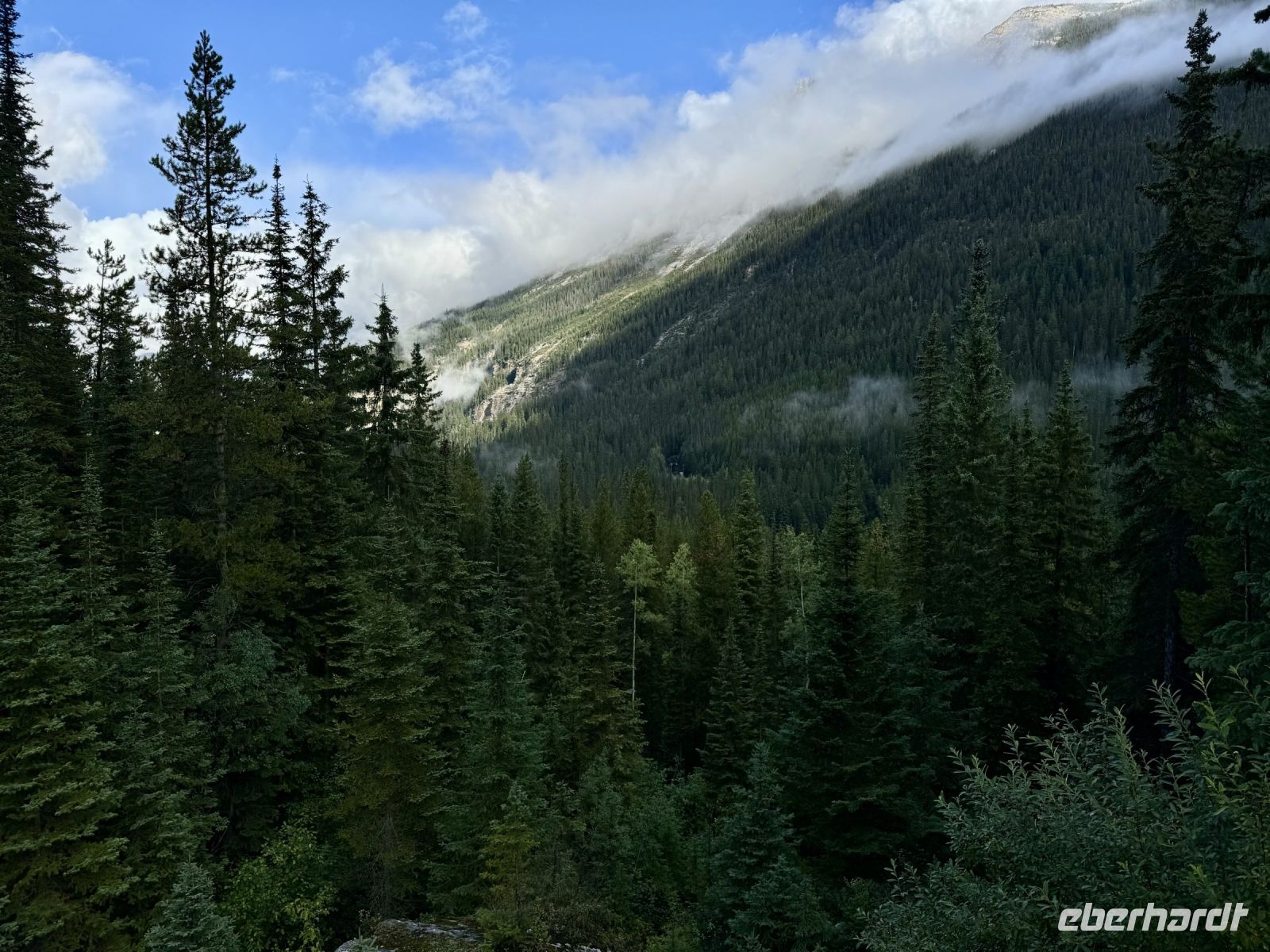 Auch Wetterengel können nicht jeden Tag Glück haben. Außerdem brauchen die Pflanzen und Bäume ja auch ab und zu Wasser von oben zum Wachsen. Damit will ich umschreiben, dass es heute ausnahmsweise mal regnet, zumindest in der ersten Tageshälfte und besonders bei unserem Besuch am berühmten Lake Louise. Aber der Regen ist nicht sehr stark; viel unangenehmer sind die schon fast winterlichen Temperaturen von nur 8 Grad. Da kommen Mütze und Schal zum Einsatz. Anfangs sind nur wenige Touristen am Gletschersee, doch nach und nach rauschen die Busse heran, vor allem auch die Shuttlebusse aus Banff und von den Pkw-Parkplätzen in der Umgebung. Am Lake Louise gibt es seit einigen Jahren nur noch „voll“ und „noch voller“, doch wer will es aller Welt verübeln, sich dieses Kleinod in den Rocky Mountains anschauen zu wollen? Am benachbarten Moraine Lake geht es dank strikter Zugangsbeschränkungen etwas beschaulicher zu. Ich finde es hier sogar noch schöner als am Lake Louise, vor allem, wenn man sich die Mühe macht und den Geröllhügel, der den See aufstaut, bis zum Aussichtspunkt erklimmt. Dann ist der Blickwinkel perfekt und die Farbe des Sees kommt besonders schön zur Geltung. Ein paar Nebelschwaden ziehen zusätzlich durchs Tal und verleihen dem Ganzen eine mystische Atmosphäre. Wer nicht spirituell veranlagt ist — hier und jetzt könnte man anfangen, an Tiergeister und den großen Manitou zu glauben. Auf dem Icefields Parkway wartet gegen Mittag mit dem Peyto Lake der dritte Gletschersee auf uns. Auch hier blicken wir von einer erhöhten Position auf das weite Tal und den See hinab, dessen Farbe ein bisschen mehr ins Grüne geht. Die Lücken in der Wolkendecke stimmen optimistisch, dass wir später auf dem Gletscher nicht im Regen stehen, ja vielleicht sogar wieder schönes Wetter haben werden. Am Saskatchewan Crossing machen wir Mittagspause und dann wartet kurz hinter der Grenze zum Jasper-Nationalpark die Auffahrt auf den Athabasca-Gletscher auf uns. Dazu klettern wir in Spezialbusse mit riesigen, mannshohen Reifen, die uns in gemächlichem Tempo hinauf auf die Seitenmoräne und über eine sehr, sehr, sehr steile Piste hinab (!) auf den Gletscher bringen. Allein diese Fahrt ist schon ein einmaliges Erlebnis. Auf dem Gletscher können wir uns ein bisschen bewegen und uns sogar eiskaltes Gletscherwasser abfüllen. Und wir haben wirklich wieder großes Glück: Sonnenschein, blauer Himmel — und als wir wieder unten am Besucherzentrum sind, regnet es oben auf dem Gletscher. Auf der Rückfahrt auf dem Icefields Parkway ziehen die Berge und kleinere Gletscher nochmals an uns vorbei. Am Bow Lake und Crowfoot Glacier machen wir den letzten Stopp, dann fahren wir bis Banff durch. Der restliche Abend steht uns zur freien Verfügung. Wir schwärmen daher aus und erkunden nochmals die Banff Avenue mit ihren Restaurants und Kneipen.