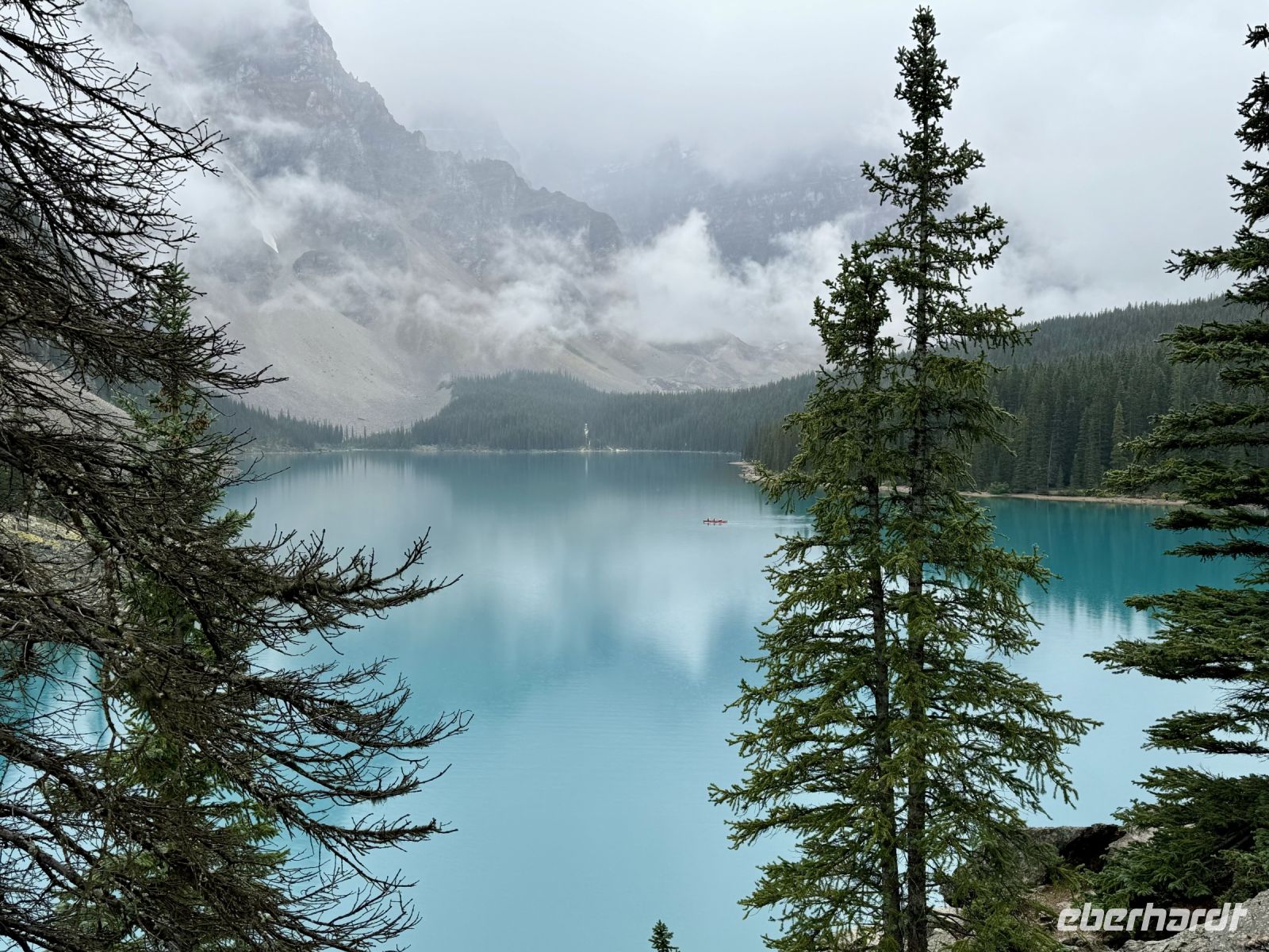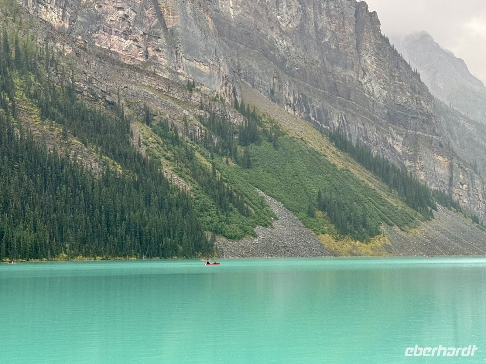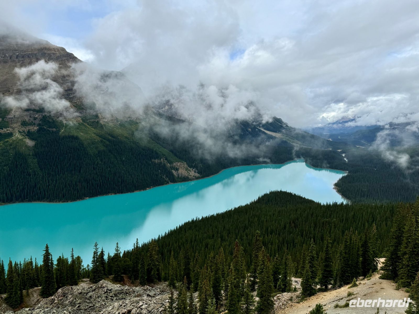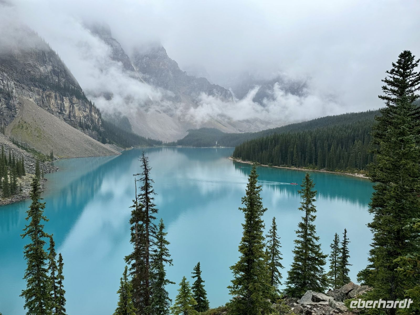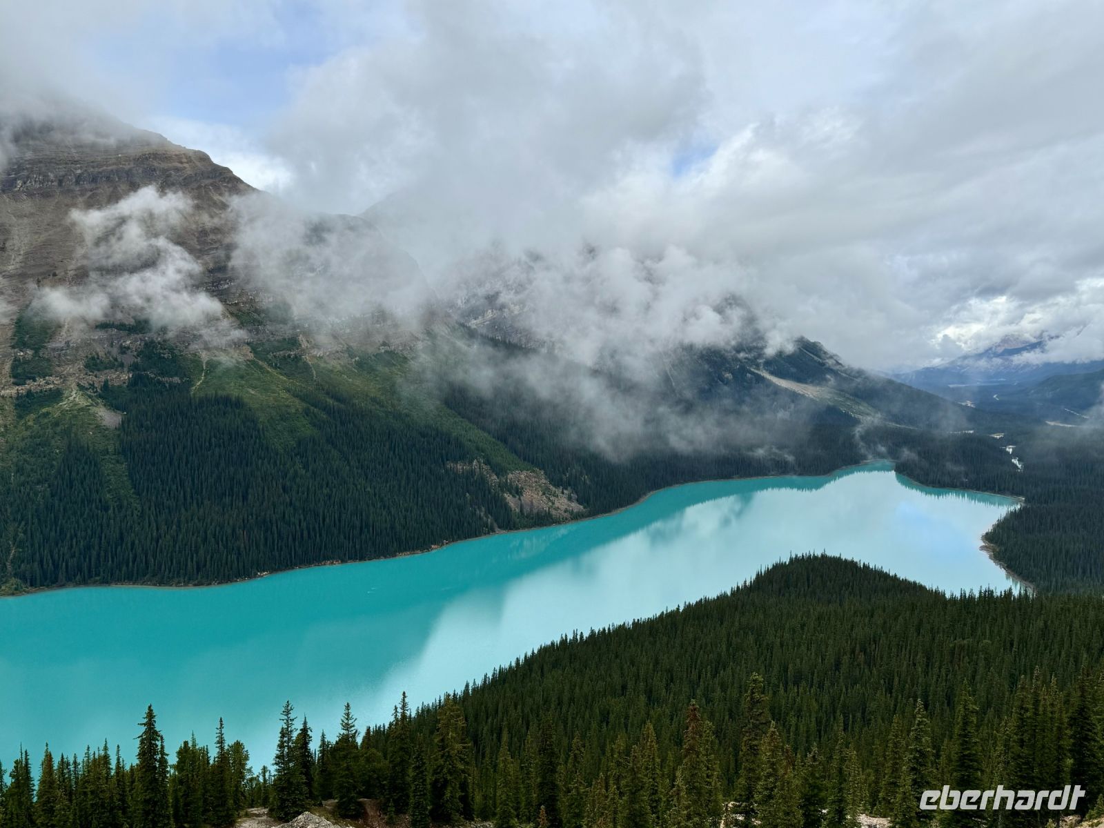 Auch Wetterengel können nicht jeden Tag Glück haben. Außerdem brauchen die Pflanzen und Bäume ja auch ab und zu Wasser von oben zum Wachsen. Damit will ich umschreiben, dass es heute ausnahmsweise mal regnet, zumindest in der ersten Tageshälfte und besonders bei unserem Besuch am berühmten Lake Louise. Aber der Regen ist nicht sehr stark; viel unangenehmer sind die schon fast winterlichen Temperaturen von nur 8 Grad. Da kommen Mütze und Schal zum Einsatz. Anfangs sind nur wenige Touristen am Gletschersee, doch nach und nach rauschen die Busse heran, vor allem auch die Shuttlebusse aus Banff und von den Pkw-Parkplätzen in der Umgebung. Am Lake Louise gibt es seit einigen Jahren nur noch „voll“ und „noch voller“, doch wer will es aller Welt verübeln, sich dieses Kleinod in den Rocky Mountains anschauen zu wollen? Am benachbarten Moraine Lake geht es dank strikter Zugangsbeschränkungen etwas beschaulicher zu. Ich finde es hier sogar noch schöner als am Lake Louise, vor allem, wenn man sich die Mühe macht und den Geröllhügel, der den See aufstaut, bis zum Aussichtspunkt erklimmt. Dann ist der Blickwinkel perfekt und die Farbe des Sees kommt besonders schön zur Geltung. Ein paar Nebelschwaden ziehen zusätzlich durchs Tal und verleihen dem Ganzen eine mystische Atmosphäre. Wer nicht spirituell veranlagt ist — hier und jetzt könnte man anfangen, an Tiergeister und den großen Manitou zu glauben. Auf dem Icefields Parkway wartet gegen Mittag mit dem Peyto Lake der dritte Gletschersee auf uns. Auch hier blicken wir von einer erhöhten Position auf das weite Tal und den See hinab, dessen Farbe ein bisschen mehr ins Grüne geht. Die Lücken in der Wolkendecke stimmen optimistisch, dass wir später auf dem Gletscher nicht im Regen stehen, ja vielleicht sogar wieder schönes Wetter haben werden. Am Saskatchewan Crossing machen wir Mittagspause und dann wartet kurz hinter der Grenze zum Jasper-Nationalpark die Auffahrt auf den Athabasca-Gletscher auf uns. Dazu klettern wir in Spezialbusse mit riesigen, mannshohen Reifen, die uns in gemächlichem Tempo hinauf auf die Seitenmoräne und über eine sehr, sehr, sehr steile Piste hinab (!) auf den Gletscher bringen. Allein diese Fahrt ist schon ein einmaliges Erlebnis. Auf dem Gletscher können wir uns ein bisschen bewegen und uns sogar eiskaltes Gletscherwasser abfüllen. Und wir haben wirklich wieder großes Glück: Sonnenschein, blauer Himmel — und als wir wieder unten am Besucherzentrum sind, regnet es oben auf dem Gletscher. Auf der Rückfahrt auf dem Icefields Parkway ziehen die Berge und kleinere Gletscher nochmals an uns vorbei. Am Bow Lake und Crowfoot Glacier machen wir den letzten Stopp, dann fahren wir bis Banff durch. Der restliche Abend steht uns zur freien Verfügung. Wir schwärmen daher aus und erkunden nochmals die Banff Avenue mit ihren Restaurants und Kneipen.