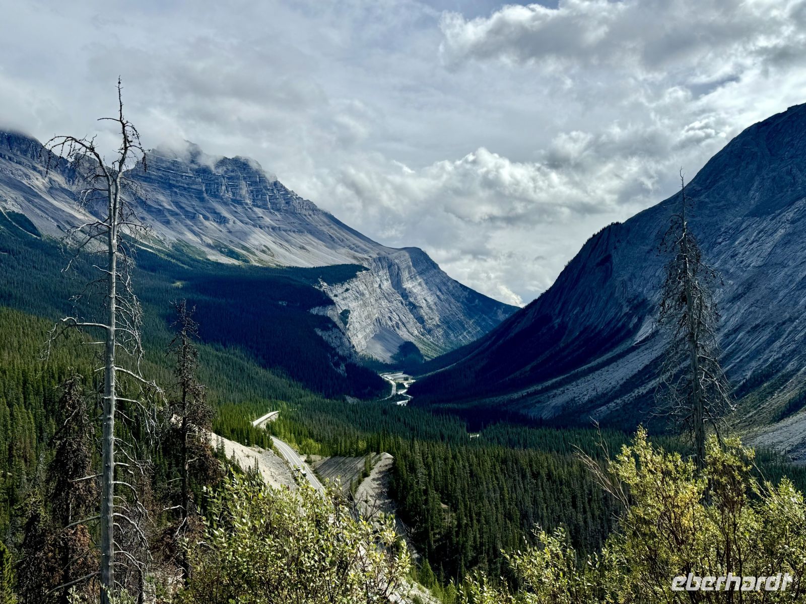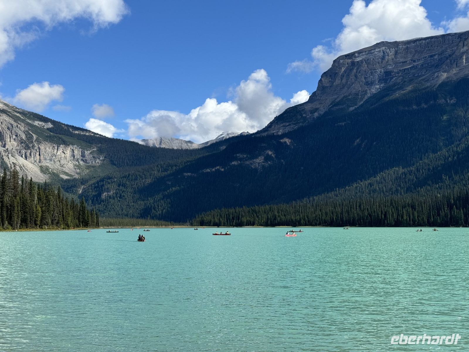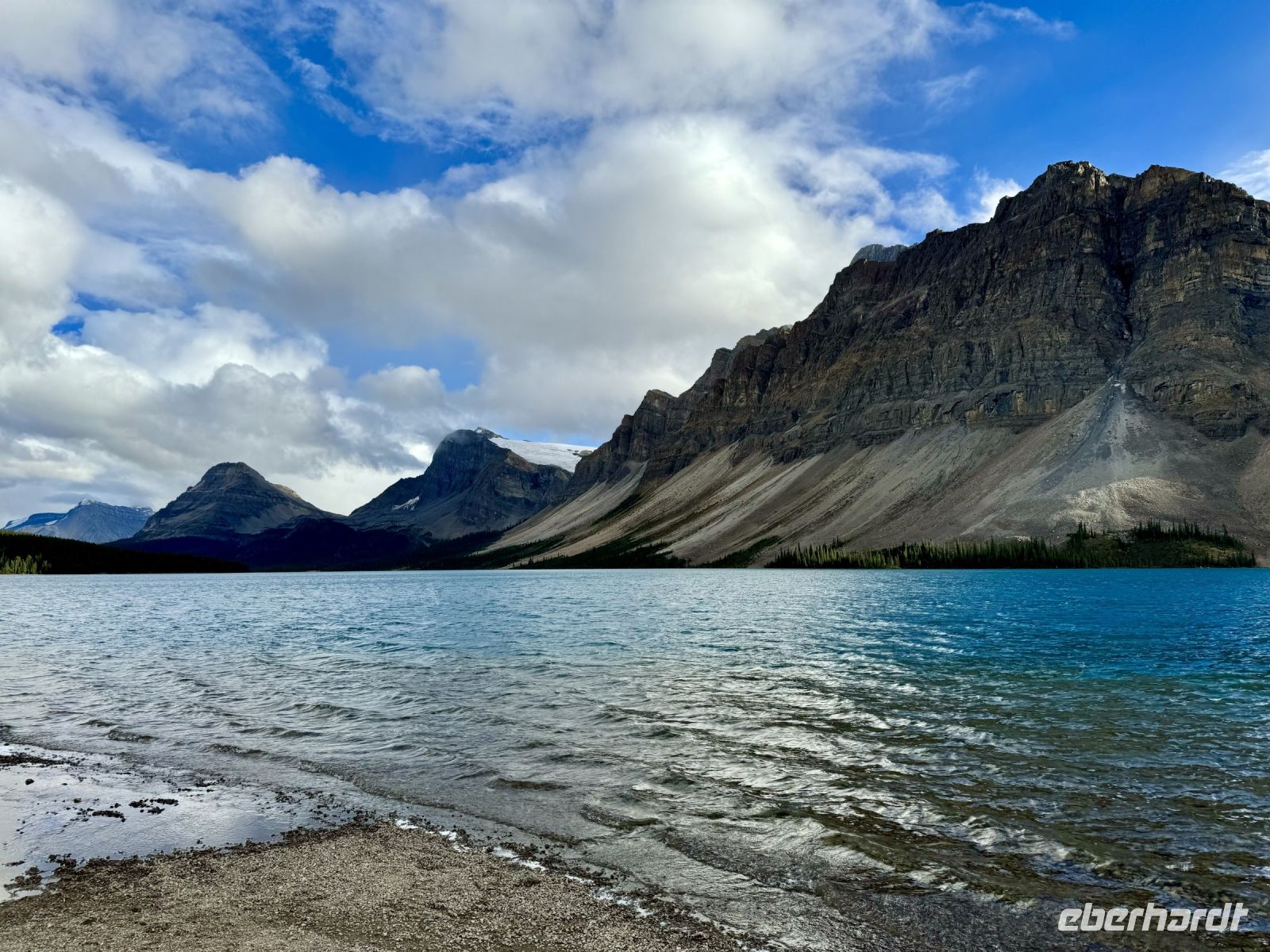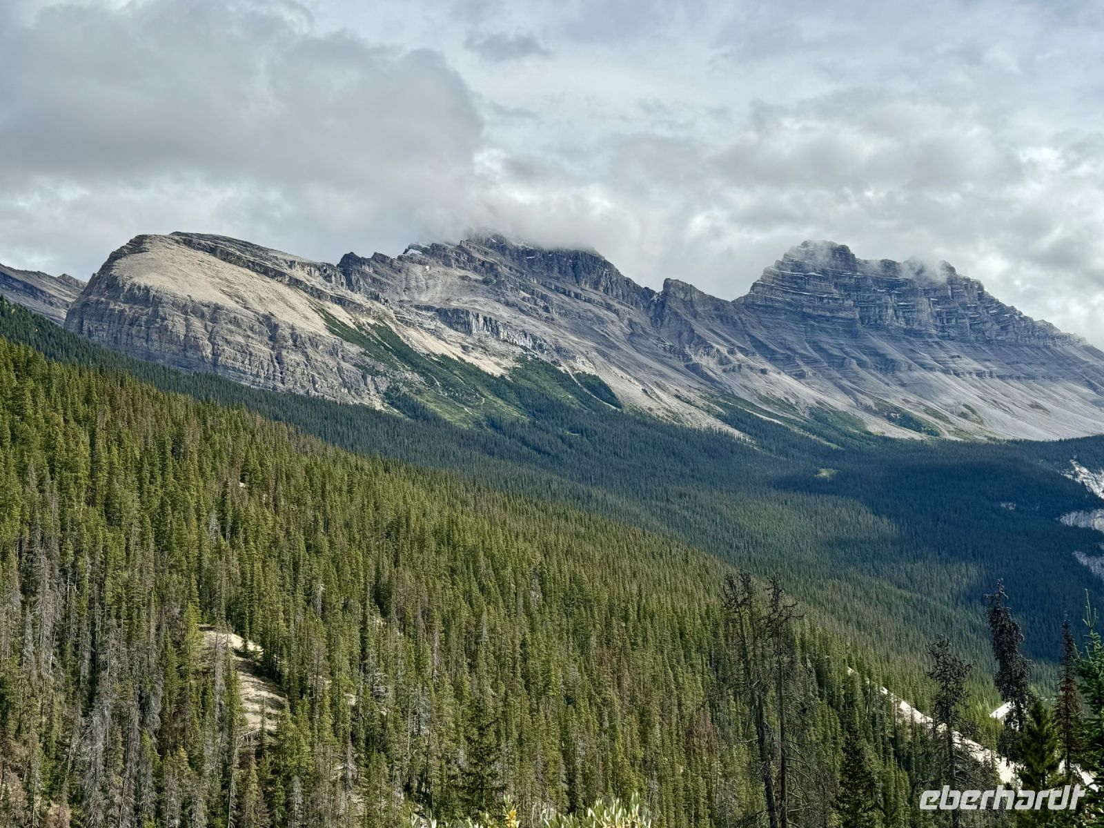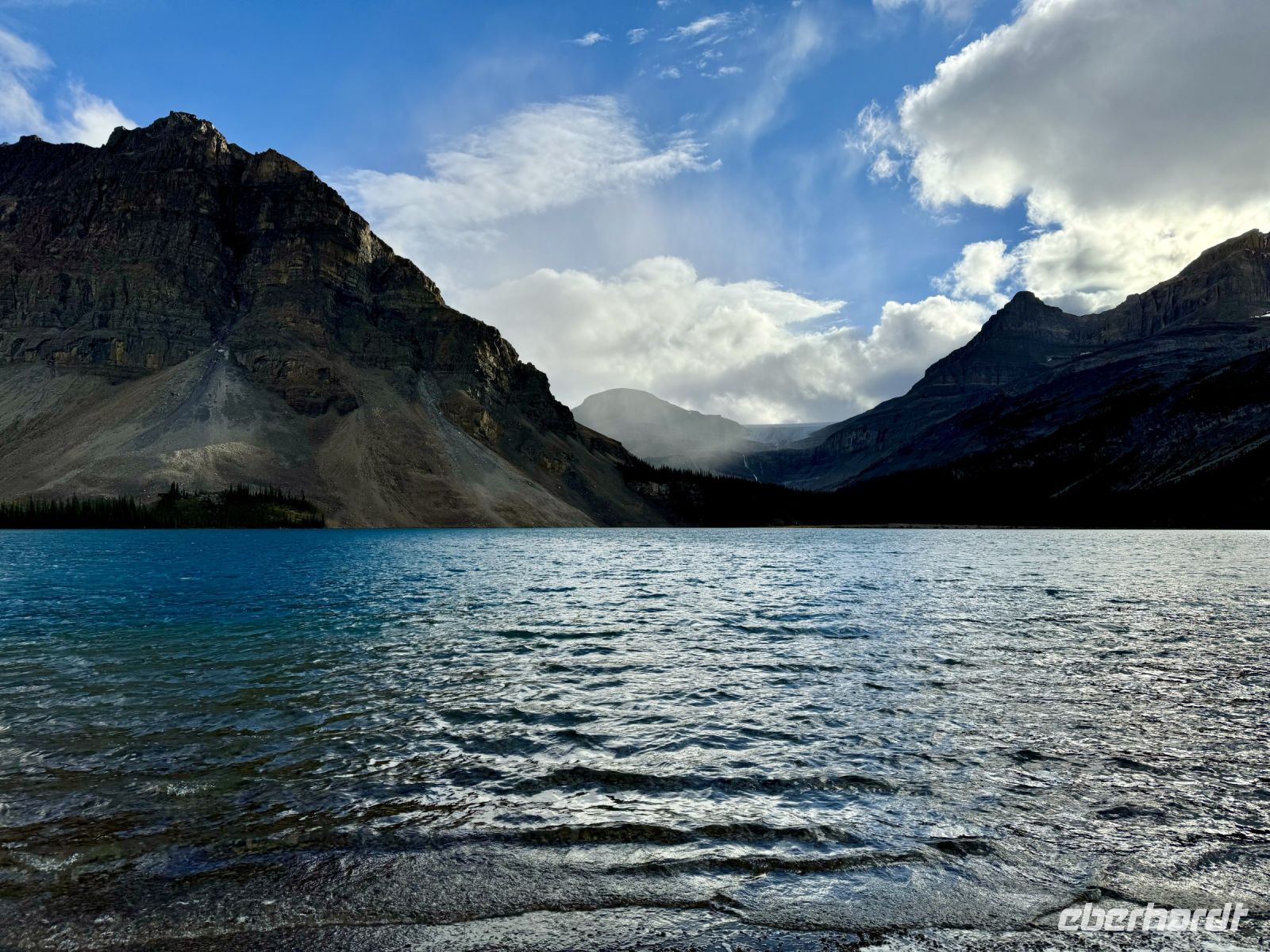 Auch Wetterengel können nicht jeden Tag Glück haben. Außerdem brauchen die Pflanzen und Bäume ja auch ab und zu Wasser von oben zum Wachsen. Damit will ich umschreiben, dass es heute ausnahmsweise mal regnet, zumindest in der ersten Tageshälfte und besonders bei unserem Besuch am berühmten Lake Louise. Aber der Regen ist nicht sehr stark; viel unangenehmer sind die schon fast winterlichen Temperaturen von nur 8 Grad. Da kommen Mütze und Schal zum Einsatz. Anfangs sind nur wenige Touristen am Gletschersee, doch nach und nach rauschen die Busse heran, vor allem auch die Shuttlebusse aus Banff und von den Pkw-Parkplätzen in der Umgebung. Am Lake Louise gibt es seit einigen Jahren nur noch „voll“ und „noch voller“, doch wer will es aller Welt verübeln, sich dieses Kleinod in den Rocky Mountains anschauen zu wollen? Am benachbarten Moraine Lake geht es dank strikter Zugangsbeschränkungen etwas beschaulicher zu. Ich finde es hier sogar noch schöner als am Lake Louise, vor allem, wenn man sich die Mühe macht und den Geröllhügel, der den See aufstaut, bis zum Aussichtspunkt erklimmt. Dann ist der Blickwinkel perfekt und die Farbe des Sees kommt besonders schön zur Geltung. Ein paar Nebelschwaden ziehen zusätzlich durchs Tal und verleihen dem Ganzen eine mystische Atmosphäre. Wer nicht spirituell veranlagt ist — hier und jetzt könnte man anfangen, an Tiergeister und den großen Manitou zu glauben. Auf dem Icefields Parkway wartet gegen Mittag mit dem Peyto Lake der dritte Gletschersee auf uns. Auch hier blicken wir von einer erhöhten Position auf das weite Tal und den See hinab, dessen Farbe ein bisschen mehr ins Grüne geht. Die Lücken in der Wolkendecke stimmen optimistisch, dass wir später auf dem Gletscher nicht im Regen stehen, ja vielleicht sogar wieder schönes Wetter haben werden. Am Saskatchewan Crossing machen wir Mittagspause und dann wartet kurz hinter der Grenze zum Jasper-Nationalpark die Auffahrt auf den Athabasca-Gletscher auf uns. Dazu klettern wir in Spezialbusse mit riesigen, mannshohen Reifen, die uns in gemächlichem Tempo hinauf auf die Seitenmoräne und über eine sehr, sehr, sehr steile Piste hinab (!) auf den Gletscher bringen. Allein diese Fahrt ist schon ein einmaliges Erlebnis. Auf dem Gletscher können wir uns ein bisschen bewegen und uns sogar eiskaltes Gletscherwasser abfüllen. Und wir haben wirklich wieder großes Glück: Sonnenschein, blauer Himmel — und als wir wieder unten am Besucherzentrum sind, regnet es oben auf dem Gletscher. Auf der Rückfahrt auf dem Icefields Parkway ziehen die Berge und kleinere Gletscher nochmals an uns vorbei. Am Bow Lake und Crowfoot Glacier machen wir den letzten Stopp, dann fahren wir bis Banff durch. Der restliche Abend steht uns zur freien Verfügung. Wir schwärmen daher aus und erkunden nochmals die Banff Avenue mit ihren Restaurants und Kneipen.