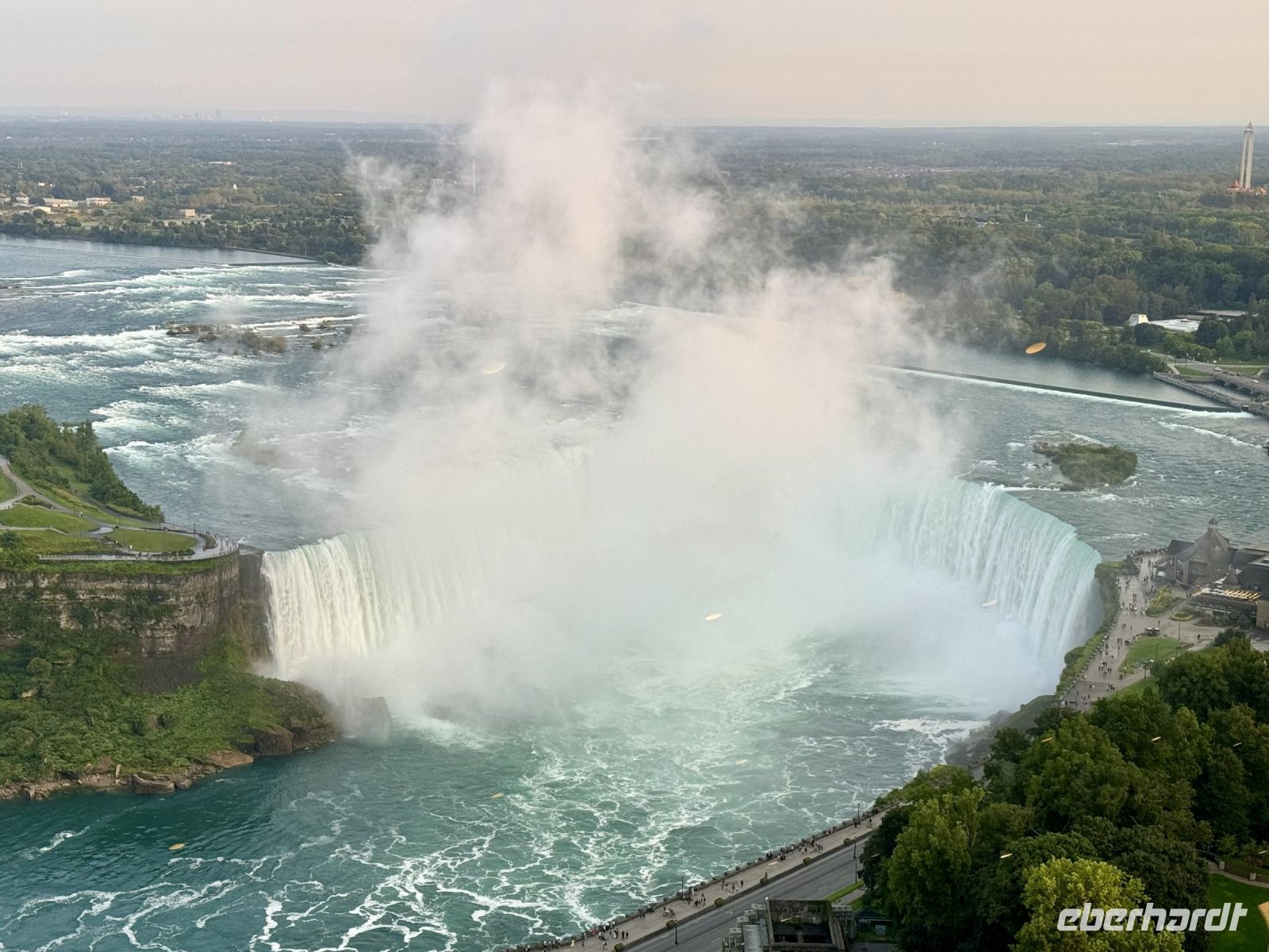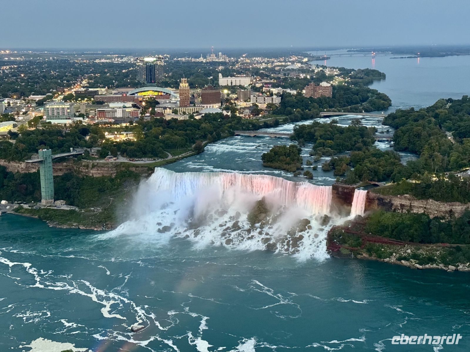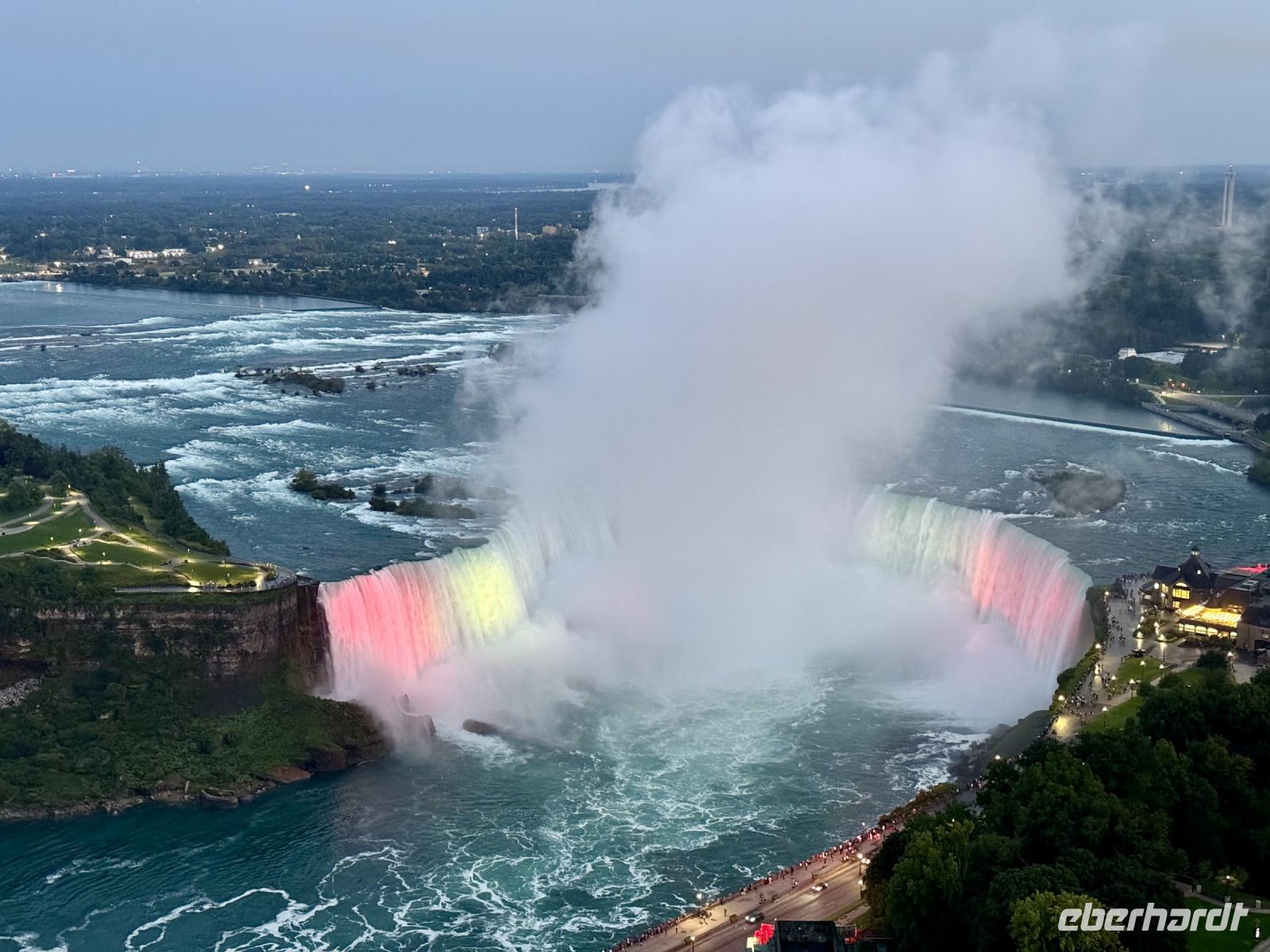 Ein zweites Mal dürfen wir beim Frühstück im Chelsea Hotel die große Auswahl vom Buffet genießen. Bald darauf verlassen wir Toronto über den Expressway und fahren in die in der Vergangenheit hart umkämpfte Niagara-Region auf der Südseite des Ontariosees. Inzwischen fallen zwar keine amerikanischen Soldaten, dafür aber jede Menge Touristen ein, um ein Mal im Leben die Niagarafälle zu sehen. Beim ersten Stopp im hübschen Örtchen Niagara-on-the-Lake mischen wir uns bereits unter die Besucher aus aller Welt, obgleich es am Vormittag noch relativ ruhig zugeht. Die Region ist hauptsächlich bekannt für den Weinanbau, doch inzwischen hat sich herumgesprochen, dass es hier ebenfalls sehr leckeres Gelato gibt. Wir bummeln entlang der Hauptstraße mit vielen Cafés und Geschäften und bewundern die herrliche Blumendekoration. Es gibt hier auch ein ganzjährig geöffnetes Weihnachtsgeschäft, doch bei sommerlichen Temperaturen und blauem Himmel will heute noch keine richtige Weihnachtsstimmung aufkommen. Beim nächsten Stopp am sogenannten „Whirlpool“ sehen wir bereits den Niagara River unter uns im Canyon und sind den Wasserfällen schon sehr nahe. Ein Fotostopp am Aussichtspunkt „Table Rock“ gewährt uns einen ersten Eindruck von der Kraft der Wassermassen, die hier fast 60 Meter in die Tiefe stürzen. Die Gischt steigt hoch hinauf in den Himmel und rieselt als leichter Regen auf uns hernieder. Ein kleiner Vorgeschmack auf die anschließende Bootstour zu den amerikanischen und kanadischen Wasserfällen, denn wer möchte, kann sich hier von Kopf bis Fuss so richtig nass spritzen lassen. Dazu muss man sich nur des roten Regencapes entledigen und sich einen Platz ganz vorn am Bug suchen, wenn der Kapitän das Ausflugsboot ganz dicht an die Horseshoe Falls heransteuert. Die besten Fotos lassen sich jedoch lieber auf dem Rückweg zum Anleger machen. Während wir uns ins Abenteuer gestürzt haben, war Warren so freundlich, bereits unsere Zimmerkarten und Willkommenskekse zu organisieren. Dadurch ist der Check-in im Hotel schnell erledigt und es bleibt mehr Freizeit in Niagara Falls für meine Gäste. Wer die Halbpension zugebucht hat, darf sich am Abend noch auf ein 3-Gänge-Menü auf dem Skylon Tower freuen. Während wir schmausen, bekommen wir die Wasserfälle aus der Vogelperspektive zu sehen. Langsam geht nun auch die Sonne unter, es wird dunkel — und der zweite Teil des Spektakels beginnt. Nach Einbruch der Nacht gehen die Scheinwerfer an und die Niagarafälle werden in wechselnden Farbkombinationen angestrahlt. Der krönende Abschluss des Tages ist dann um 22 Uhr das tägliche Feuerwerk von amerikanischer Seite. Von unseren Hotelzimmern aus lässt es sich bestens beobachten.