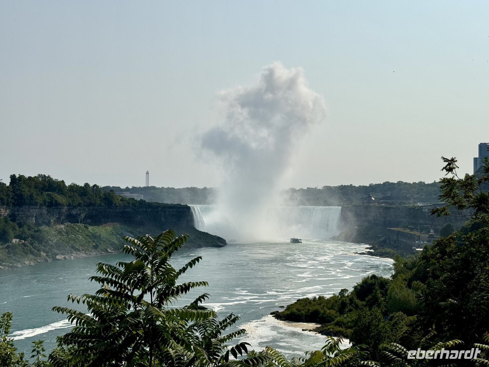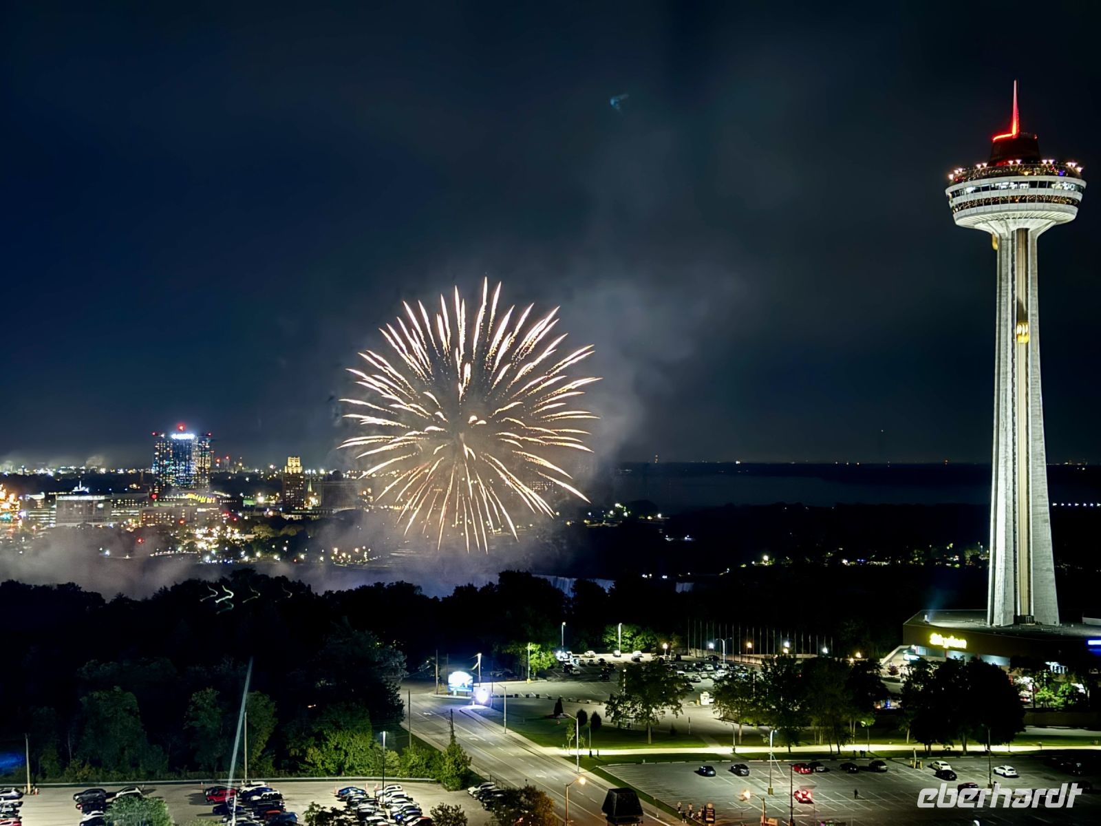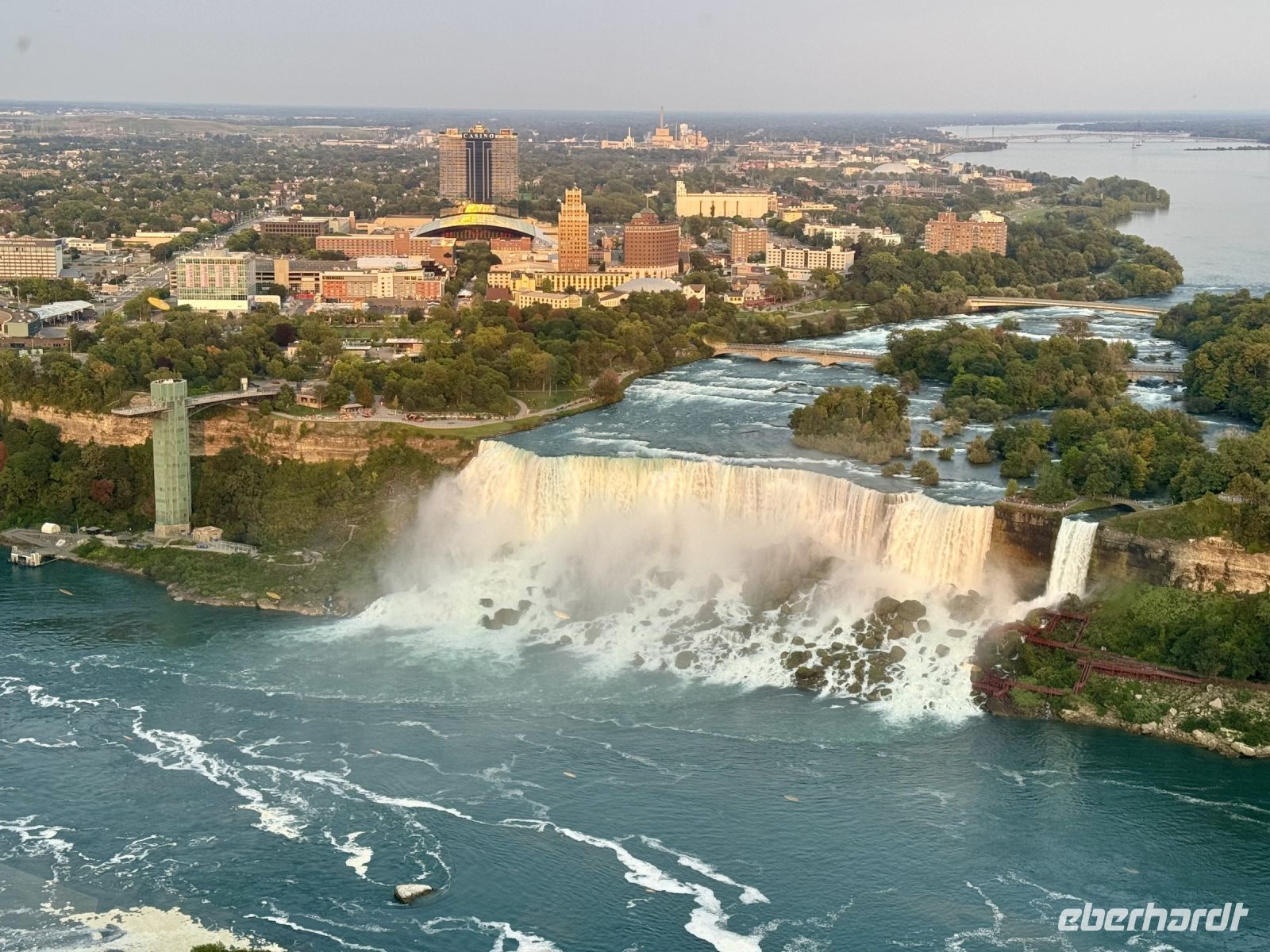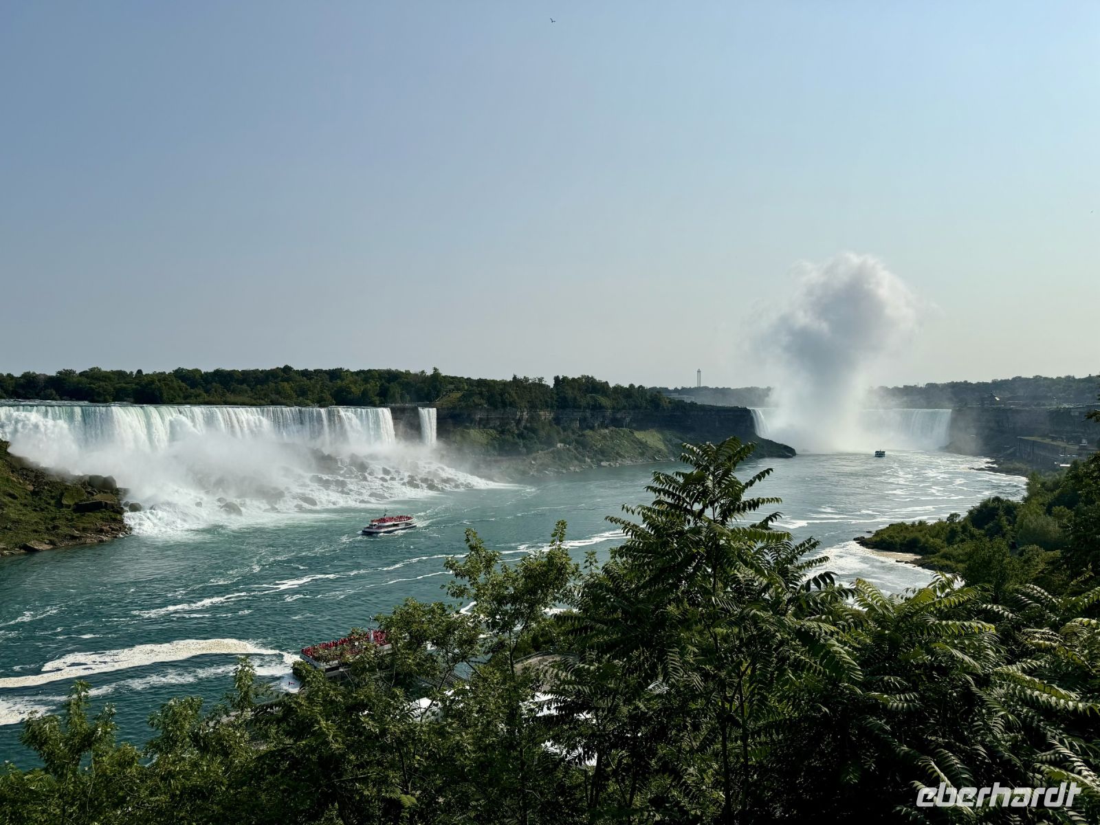 Ein zweites Mal dürfen wir beim Frühstück im Chelsea Hotel die große Auswahl vom Buffet genießen. Bald darauf verlassen wir Toronto über den Expressway und fahren in die in der Vergangenheit hart umkämpfte Niagara-Region auf der Südseite des Ontariosees. Inzwischen fallen zwar keine amerikanischen Soldaten, dafür aber jede Menge Touristen ein, um ein Mal im Leben die Niagarafälle zu sehen. Beim ersten Stopp im hübschen Örtchen Niagara-on-the-Lake mischen wir uns bereits unter die Besucher aus aller Welt, obgleich es am Vormittag noch relativ ruhig zugeht. Die Region ist hauptsächlich bekannt für den Weinanbau, doch inzwischen hat sich herumgesprochen, dass es hier ebenfalls sehr leckeres Gelato gibt. Wir bummeln entlang der Hauptstraße mit vielen Cafés und Geschäften und bewundern die herrliche Blumendekoration. Es gibt hier auch ein ganzjährig geöffnetes Weihnachtsgeschäft, doch bei sommerlichen Temperaturen und blauem Himmel will heute noch keine richtige Weihnachtsstimmung aufkommen. Beim nächsten Stopp am sogenannten „Whirlpool“ sehen wir bereits den Niagara River unter uns im Canyon und sind den Wasserfällen schon sehr nahe. Ein Fotostopp am Aussichtspunkt „Table Rock“ gewährt uns einen ersten Eindruck von der Kraft der Wassermassen, die hier fast 60 Meter in die Tiefe stürzen. Die Gischt steigt hoch hinauf in den Himmel und rieselt als leichter Regen auf uns hernieder. Ein kleiner Vorgeschmack auf die anschließende Bootstour zu den amerikanischen und kanadischen Wasserfällen, denn wer möchte, kann sich hier von Kopf bis Fuss so richtig nass spritzen lassen. Dazu muss man sich nur des roten Regencapes entledigen und sich einen Platz ganz vorn am Bug suchen, wenn der Kapitän das Ausflugsboot ganz dicht an die Horseshoe Falls heransteuert. Die besten Fotos lassen sich jedoch lieber auf dem Rückweg zum Anleger machen. Während wir uns ins Abenteuer gestürzt haben, war Warren so freundlich, bereits unsere Zimmerkarten und Willkommenskekse zu organisieren. Dadurch ist der Check-in im Hotel schnell erledigt und es bleibt mehr Freizeit in Niagara Falls für meine Gäste. Wer die Halbpension zugebucht hat, darf sich am Abend noch auf ein 3-Gänge-Menü auf dem Skylon Tower freuen. Während wir schmausen, bekommen wir die Wasserfälle aus der Vogelperspektive zu sehen. Langsam geht nun auch die Sonne unter, es wird dunkel — und der zweite Teil des Spektakels beginnt. Nach Einbruch der Nacht gehen die Scheinwerfer an und die Niagarafälle werden in wechselnden Farbkombinationen angestrahlt. Der krönende Abschluss des Tages ist dann um 22 Uhr das tägliche Feuerwerk von amerikanischer Seite. Von unseren Hotelzimmern aus lässt es sich bestens beobachten.
