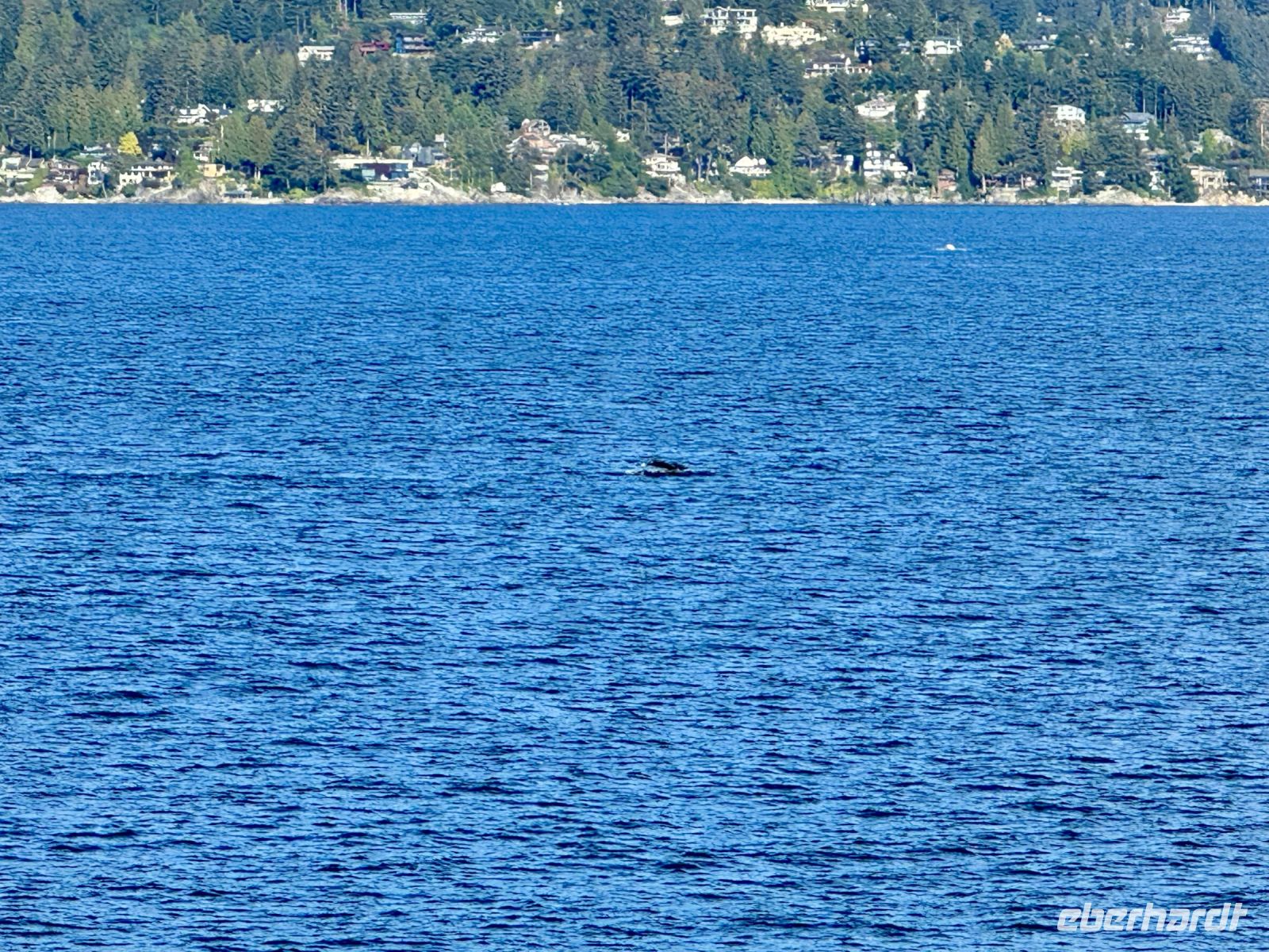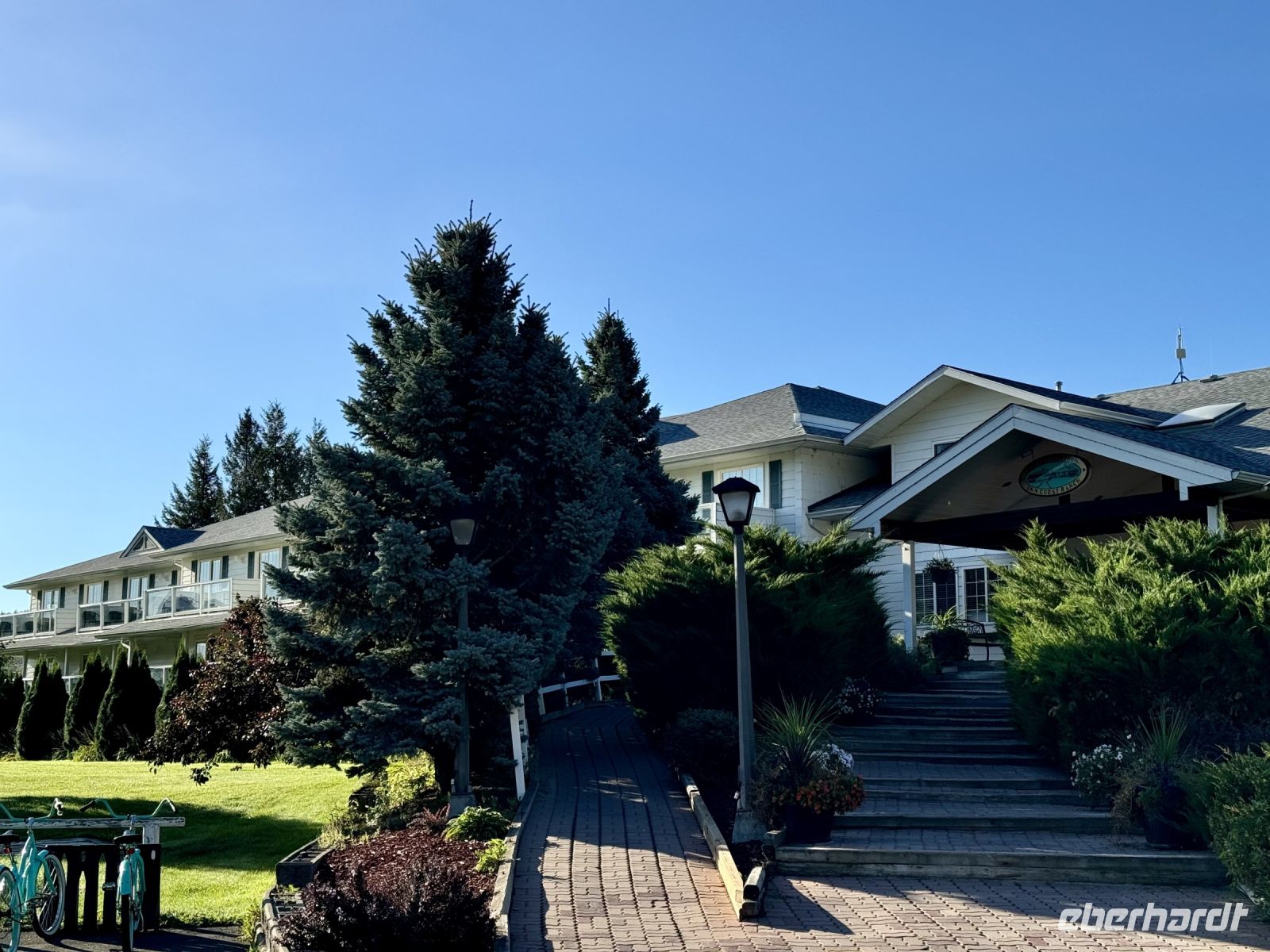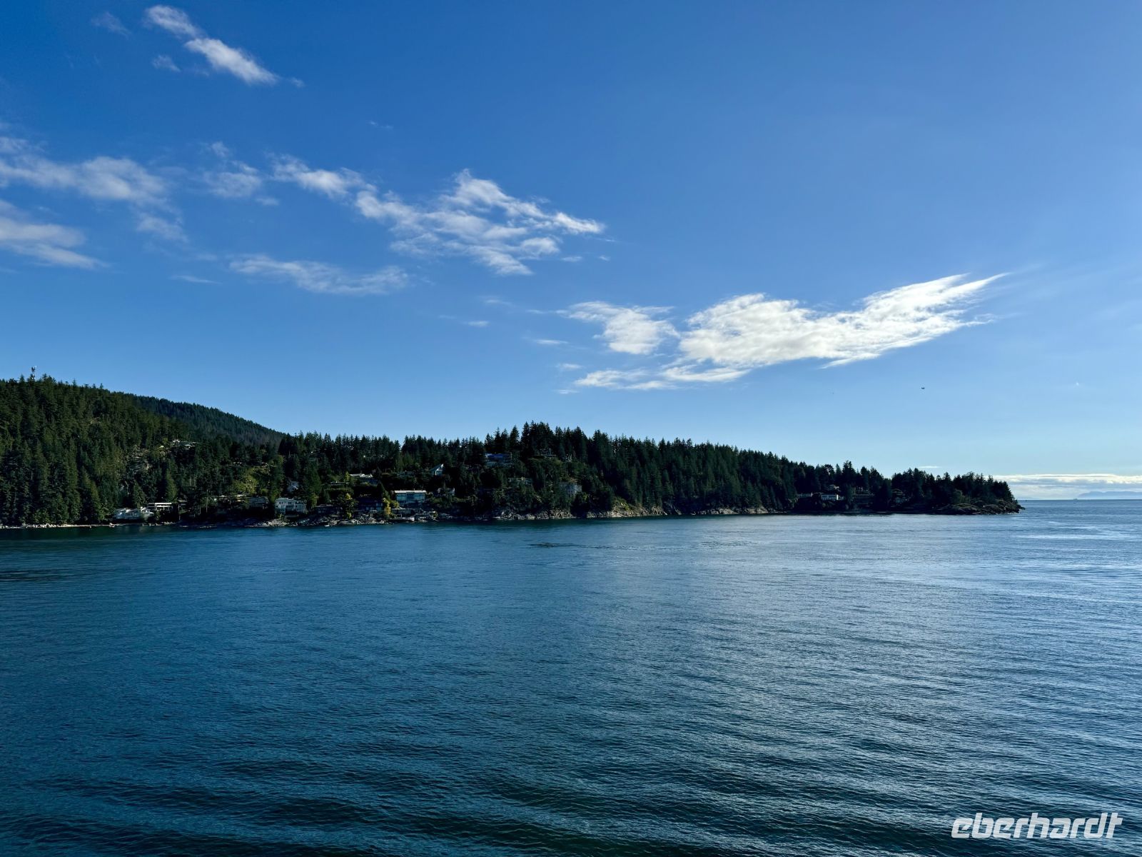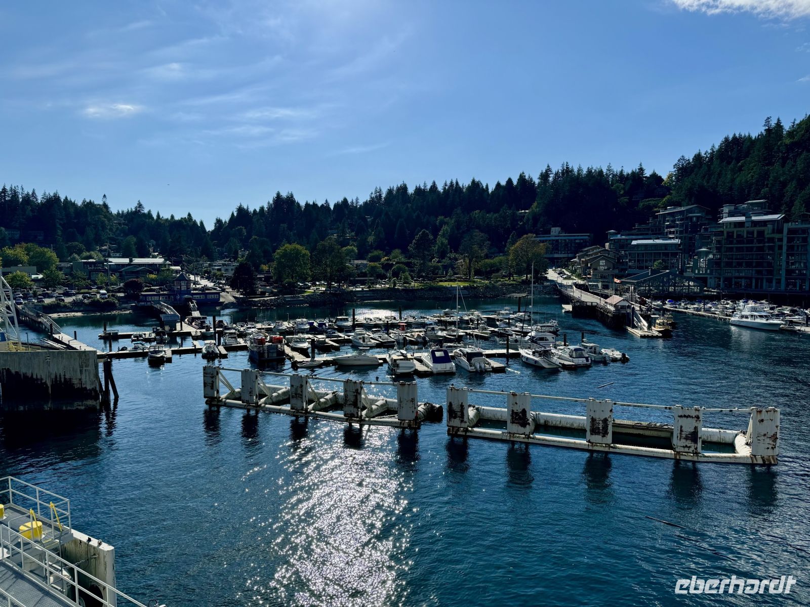 Für unser Frühstück treffen wir uns ausnahmsweise in einem Restaurant gegenüber. Die Fußgängerzone ist ruhig, Whistler schläft noch seinen Rausch von gestern Abend aus. Auch die Angestellten im Restaurant wirken mitunter noch etwas verpeilt. Man möchte ihnen fast einen Kaffee anbieten. Nicht unsere Schuld, wenn sie sich zu ihren Ungunsten verzählen und mehr Portionen zubereiten, als wir Gäste sind. Steve ist wie immer auf Zack und steht mit dem Bus pünktlich bereit. Heute geht es auf dem Sea To Sky Highway von Whistler bis fast nach Vancouver — also für uns umgekehrt: vom Himmel ans Meer. In Horseshoe Bay wollen wir dann am Nachmittag an Bord der Fähre nach Vancouver Island gehen. Für den Vormittag hat sich Eberhardt hingegen ein ganz besonderes Highlight ausgedacht. Und der kanadische Wettergott spielt dafür wieder perfekt mit. Am Tantalus Lookout sind wir noch auf einer Höhe von 320 Metern. Über dem Tal und an den Bergen hängen noch einige Zuckerwattewolken. Ob die sich noch auflösen? An den Shannon Falls sind wir dann schon auf Meeresspiegel-Niveau angekommen. Allzu viel Wasser stürzt nicht mehr den Felsen hinunter; zur Schneeschmelze muss es noch beeindruckender sein. Einen Katzensprung vom Wasserfall entfernt werden wir von Steve an der Sea to Sky Gondola abgesetzt. Wir werden also wieder mit der Seilbahn vom Meer in den Himmel gefahren. Na ja, nicht ganz so hoch, doch paradiesisch schön ist die Aussicht allemal, vor allem der Blick Richtung Howe Sound. Eine Hängebrücke sorgt für Nervenkitzel und einige kleinere Wanderwege laden zu Spaziergängen zu weiteren Aussichtspunkten ein. Oder man lässt sich einfach auf der Terrasse nieder, genießt das Panorama und gönnt sich einen Drink. Ist ja schließlich Urlaub. Zwei Stunden später sind wir nach der obligatorischen Wartezeit am Terminal an Bord der Fähre nach Vancouver Island und verlassen nicht ganz pünktlich den Fährhafen Horseshoe Bay. (BC Ferries erscheint manchmal wie das kanadische Gegenstück zur Deutschen Bahn.) Die Sicht ist so gut, dass hinter uns am Horizont die Skyline von Vancouver klar zu sehen ist, nachdem wir die ersten kleineren vorgelagerten Inseln passiert haben. Meine Glückspilze können während der Überfahrt sogar Buckelwale beobachten, die in einigem Abstand neben der Fähre dahinziehen und ihre Beute jagen. Da gibt es sozusagen ein bisschen Whale Watching schon kostenlos obendrauf. Nach etwa 1,5 Stunden kommt die Durchsage, die uns zur Rückkehr in den Bus auffordert. Zwischen Nanaimo und unserem Tigh-Na-Mara Seaside Spa Resort in Parksville liegen nun noch etwa 30 Minuten Fahrt. Die Gebäude, in denen wir untergebracht sind, stehen am Ende eines Wäldchens direkt am Strand. Beim Abendessen gehen schon die ersten scherzhaften Anfragen nach einer Verlängerung unseres Aufenthalts ein, so schön finden wir es hier.