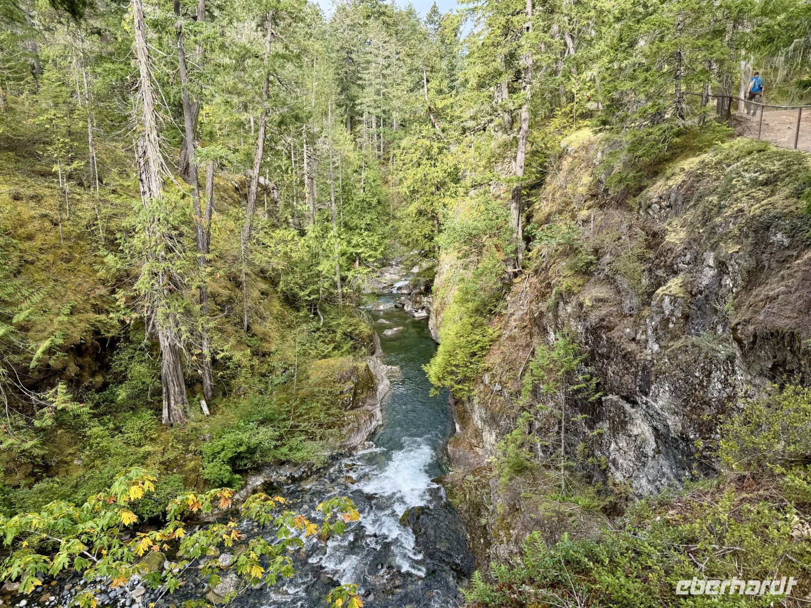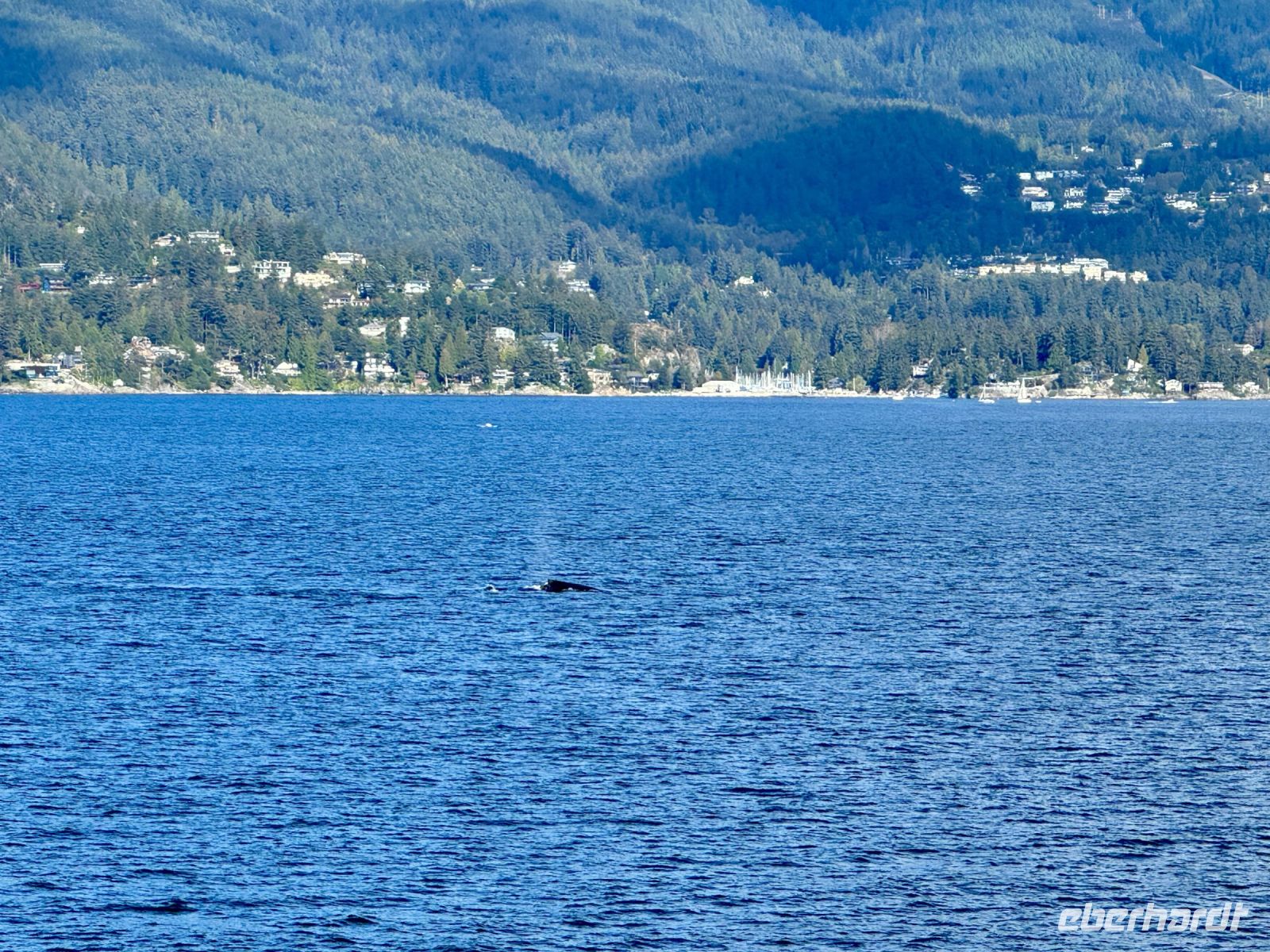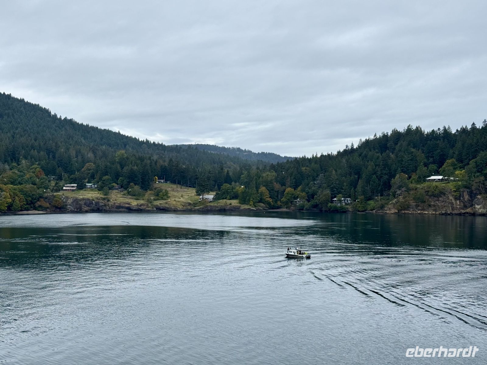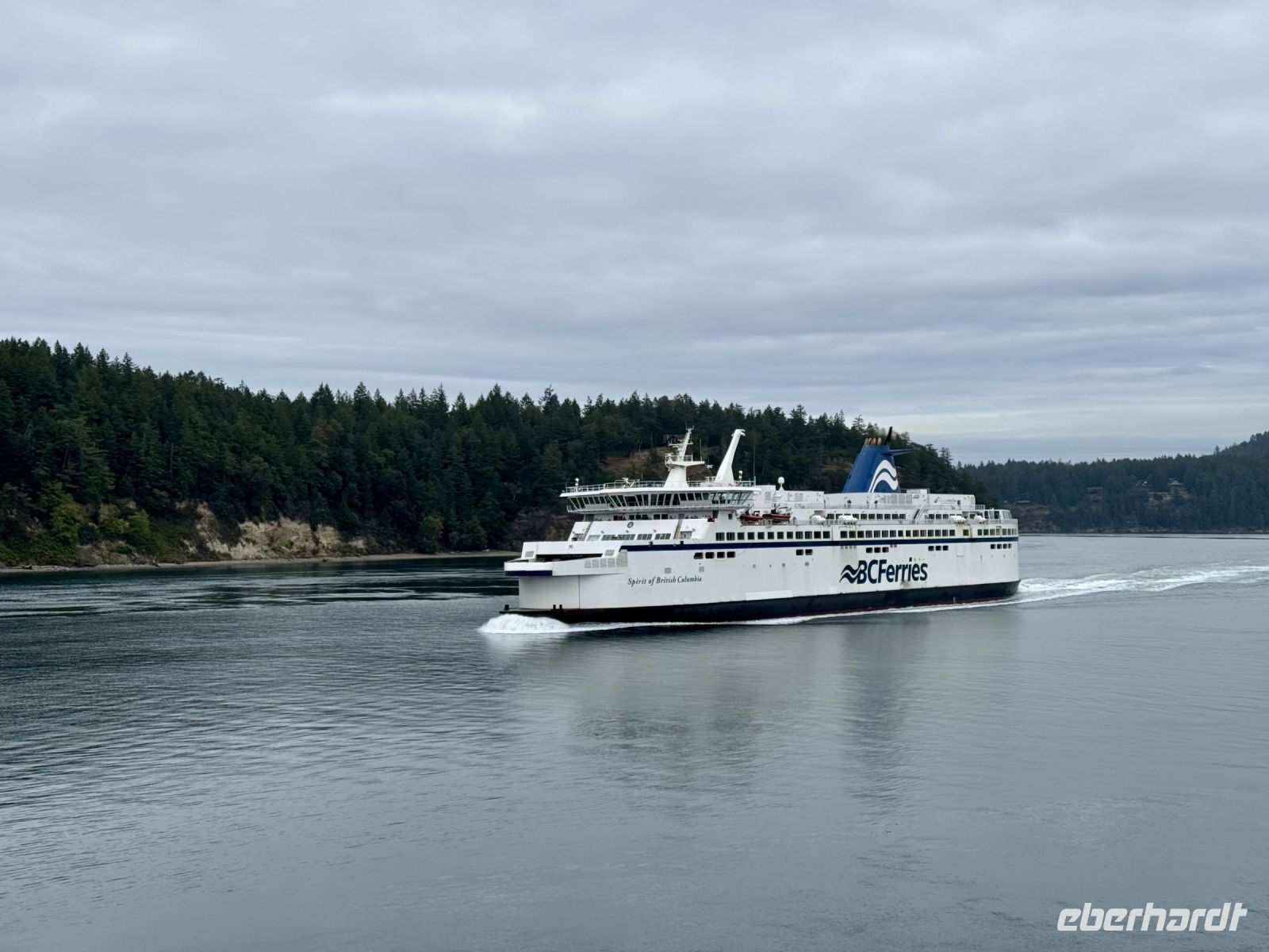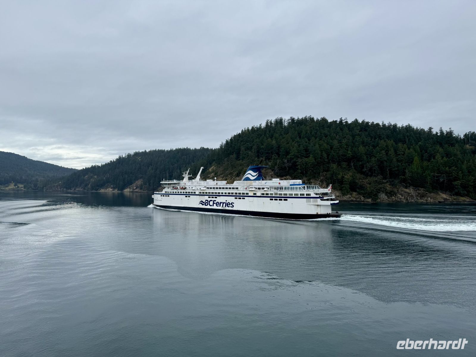 Für unser Frühstück treffen wir uns ausnahmsweise in einem Restaurant gegenüber. Die Fußgängerzone ist ruhig, Whistler schläft noch seinen Rausch von gestern Abend aus. Auch die Angestellten im Restaurant wirken mitunter noch etwas verpeilt. Man möchte ihnen fast einen Kaffee anbieten. Nicht unsere Schuld, wenn sie sich zu ihren Ungunsten verzählen und mehr Portionen zubereiten, als wir Gäste sind. Steve ist wie immer auf Zack und steht mit dem Bus pünktlich bereit. Heute geht es auf dem Sea To Sky Highway von Whistler bis fast nach Vancouver — also für uns umgekehrt: vom Himmel ans Meer. In Horseshoe Bay wollen wir dann am Nachmittag an Bord der Fähre nach Vancouver Island gehen. Für den Vormittag hat sich Eberhardt hingegen ein ganz besonderes Highlight ausgedacht. Und der kanadische Wettergott spielt dafür wieder perfekt mit. Am Tantalus Lookout sind wir noch auf einer Höhe von 320 Metern. Über dem Tal und an den Bergen hängen noch einige Zuckerwattewolken. Ob die sich noch auflösen? An den Shannon Falls sind wir dann schon auf Meeresspiegel-Niveau angekommen. Allzu viel Wasser stürzt nicht mehr den Felsen hinunter; zur Schneeschmelze muss es noch beeindruckender sein. Einen Katzensprung vom Wasserfall entfernt werden wir von Steve an der Sea to Sky Gondola abgesetzt. Wir werden also wieder mit der Seilbahn vom Meer in den Himmel gefahren. Na ja, nicht ganz so hoch, doch paradiesisch schön ist die Aussicht allemal, vor allem der Blick Richtung Howe Sound. Eine Hängebrücke sorgt für Nervenkitzel und einige kleinere Wanderwege laden zu Spaziergängen zu weiteren Aussichtspunkten ein. Oder man lässt sich einfach auf der Terrasse nieder, genießt das Panorama und gönnt sich einen Drink. Ist ja schließlich Urlaub. Zwei Stunden später sind wir nach der obligatorischen Wartezeit am Terminal an Bord der Fähre nach Vancouver Island und verlassen nicht ganz pünktlich den Fährhafen Horseshoe Bay. (BC Ferries erscheint manchmal wie das kanadische Gegenstück zur Deutschen Bahn.) Die Sicht ist so gut, dass hinter uns am Horizont die Skyline von Vancouver klar zu sehen ist, nachdem wir die ersten kleineren vorgelagerten Inseln passiert haben. Meine Glückspilze können während der Überfahrt sogar Buckelwale beobachten, die in einigem Abstand neben der Fähre dahinziehen und ihre Beute jagen. Da gibt es sozusagen ein bisschen Whale Watching schon kostenlos obendrauf. Nach etwa 1,5 Stunden kommt die Durchsage, die uns zur Rückkehr in den Bus auffordert. Zwischen Nanaimo und unserem Tigh-Na-Mara Seaside Spa Resort in Parksville liegen nun noch etwa 30 Minuten Fahrt. Die Gebäude, in denen wir untergebracht sind, stehen am Ende eines Wäldchens direkt am Strand. Beim Abendessen gehen schon die ersten scherzhaften Anfragen nach einer Verlängerung unseres Aufenthalts ein, so schön finden wir es hier.