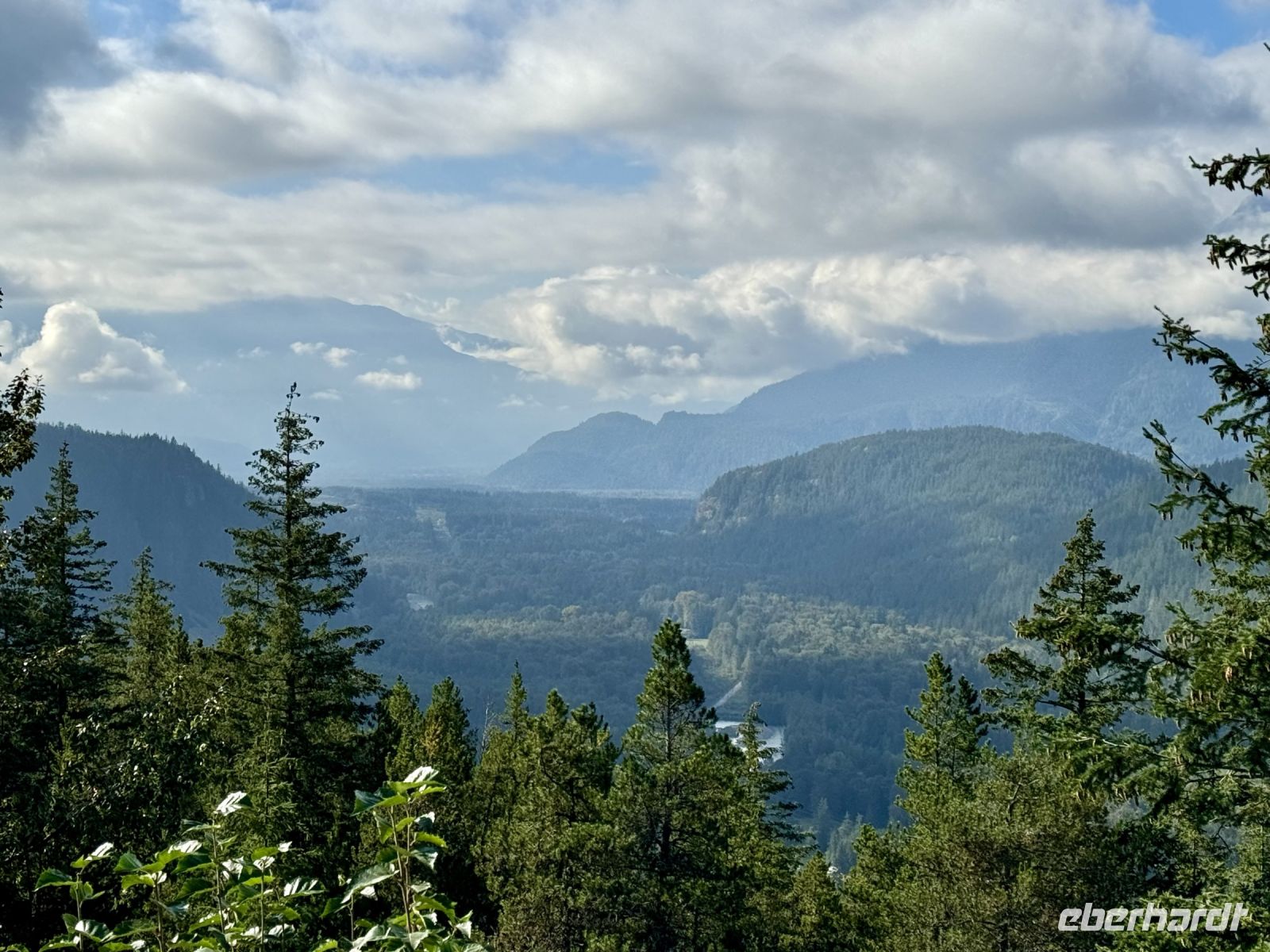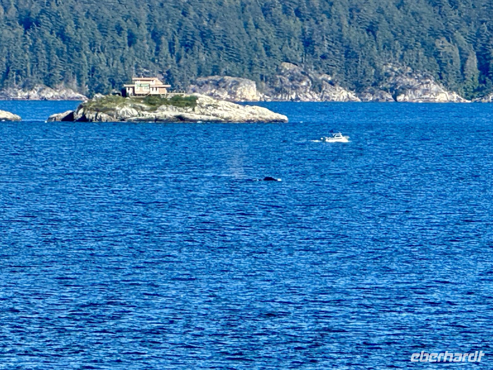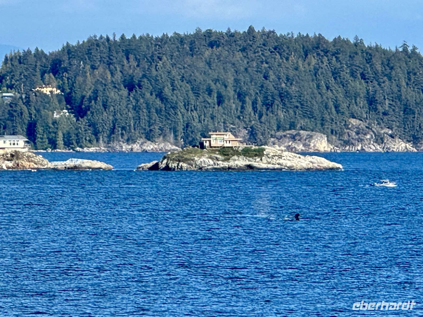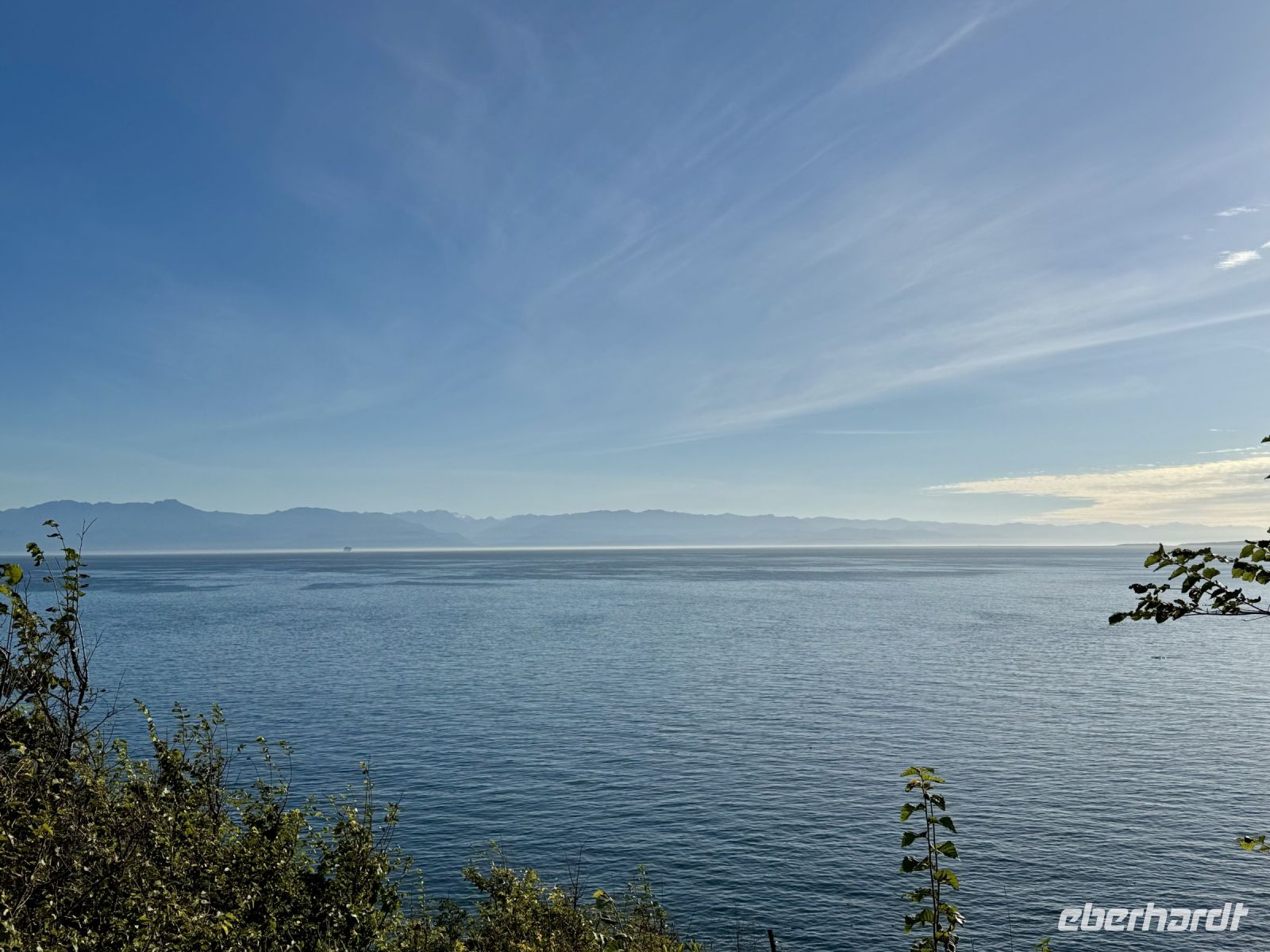 Für unser Frühstück treffen wir uns ausnahmsweise in einem Restaurant gegenüber. Die Fußgängerzone ist ruhig, Whistler schläft noch seinen Rausch von gestern Abend aus. Auch die Angestellten im Restaurant wirken mitunter noch etwas verpeilt. Man möchte ihnen fast einen Kaffee anbieten. Nicht unsere Schuld, wenn sie sich zu ihren Ungunsten verzählen und mehr Portionen zubereiten, als wir Gäste sind. Steve ist wie immer auf Zack und steht mit dem Bus pünktlich bereit. Heute geht es auf dem Sea To Sky Highway von Whistler bis fast nach Vancouver — also für uns umgekehrt: vom Himmel ans Meer. In Horseshoe Bay wollen wir dann am Nachmittag an Bord der Fähre nach Vancouver Island gehen. Für den Vormittag hat sich Eberhardt hingegen ein ganz besonderes Highlight ausgedacht. Und der kanadische Wettergott spielt dafür wieder perfekt mit. Am Tantalus Lookout sind wir noch auf einer Höhe von 320 Metern. Über dem Tal und an den Bergen hängen noch einige Zuckerwattewolken. Ob die sich noch auflösen? An den Shannon Falls sind wir dann schon auf Meeresspiegel-Niveau angekommen. Allzu viel Wasser stürzt nicht mehr den Felsen hinunter; zur Schneeschmelze muss es noch beeindruckender sein. Einen Katzensprung vom Wasserfall entfernt werden wir von Steve an der Sea to Sky Gondola abgesetzt. Wir werden also wieder mit der Seilbahn vom Meer in den Himmel gefahren. Na ja, nicht ganz so hoch, doch paradiesisch schön ist die Aussicht allemal, vor allem der Blick Richtung Howe Sound. Eine Hängebrücke sorgt für Nervenkitzel und einige kleinere Wanderwege laden zu Spaziergängen zu weiteren Aussichtspunkten ein. Oder man lässt sich einfach auf der Terrasse nieder, genießt das Panorama und gönnt sich einen Drink. Ist ja schließlich Urlaub. Zwei Stunden später sind wir nach der obligatorischen Wartezeit am Terminal an Bord der Fähre nach Vancouver Island und verlassen nicht ganz pünktlich den Fährhafen Horseshoe Bay. (BC Ferries erscheint manchmal wie das kanadische Gegenstück zur Deutschen Bahn.) Die Sicht ist so gut, dass hinter uns am Horizont die Skyline von Vancouver klar zu sehen ist, nachdem wir die ersten kleineren vorgelagerten Inseln passiert haben. Meine Glückspilze können während der Überfahrt sogar Buckelwale beobachten, die in einigem Abstand neben der Fähre dahinziehen und ihre Beute jagen. Da gibt es sozusagen ein bisschen Whale Watching schon kostenlos obendrauf. Nach etwa 1,5 Stunden kommt die Durchsage, die uns zur Rückkehr in den Bus auffordert. Zwischen Nanaimo und unserem Tigh-Na-Mara Seaside Spa Resort in Parksville liegen nun noch etwa 30 Minuten Fahrt. Die Gebäude, in denen wir untergebracht sind, stehen am Ende eines Wäldchens direkt am Strand. Beim Abendessen gehen schon die ersten scherzhaften Anfragen nach einer Verlängerung unseres Aufenthalts ein, so schön finden wir es hier.