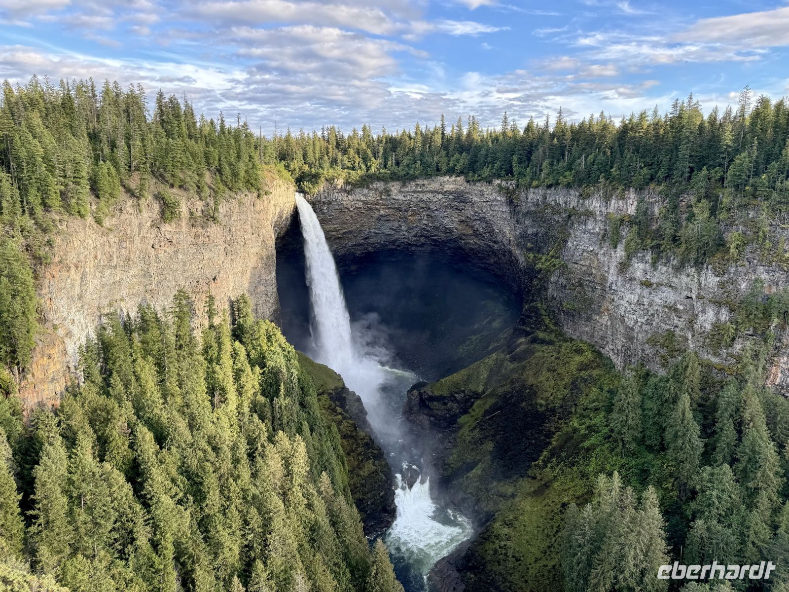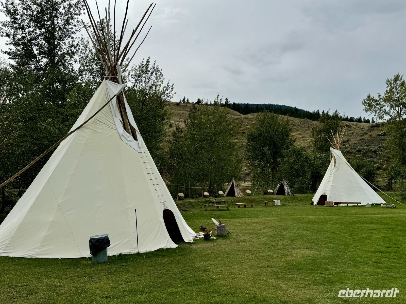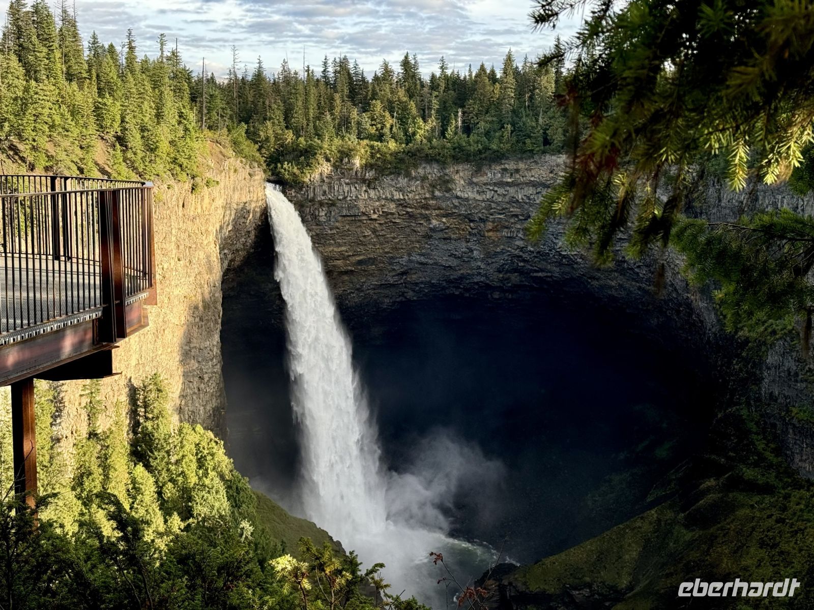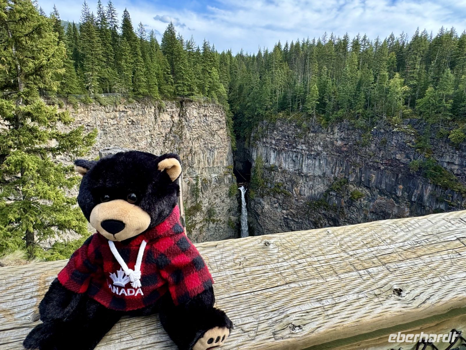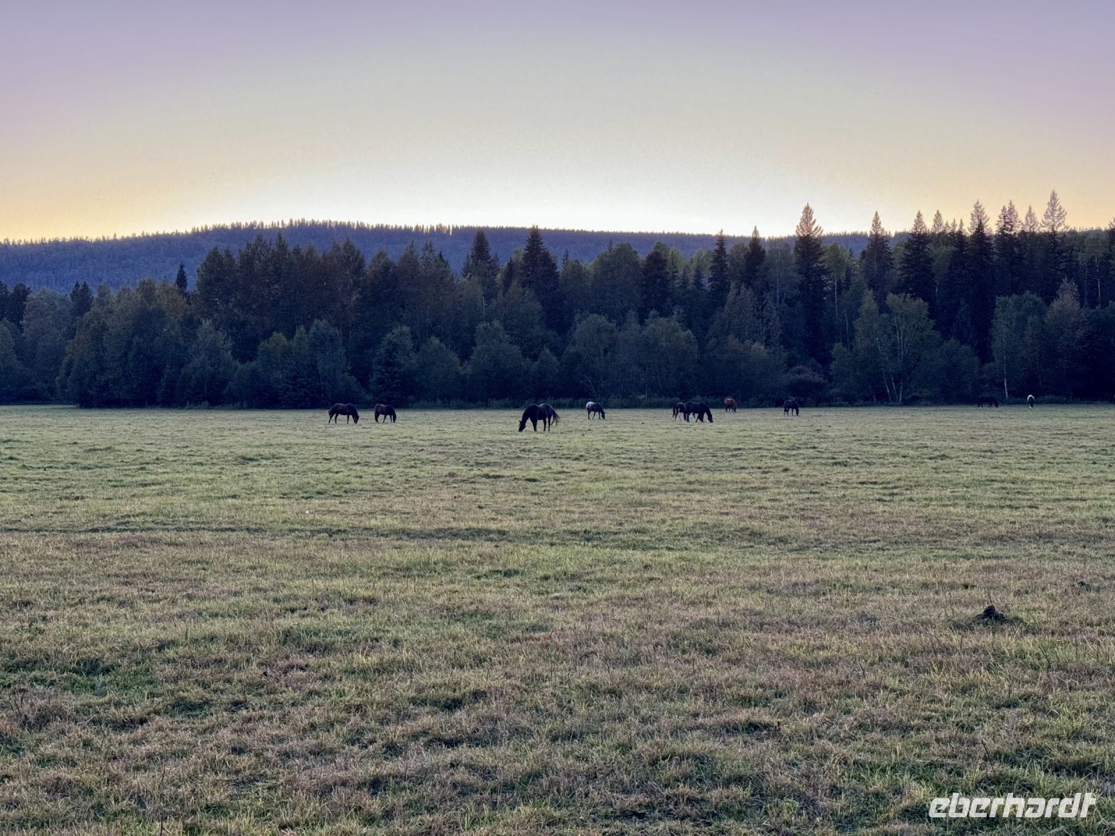 Auch heute wartet wettertechnisch wieder ein schöner Tag auf meine Gäste. Das freut mich ganz besonders, denn ich kenne eine gute Eisdiele auf halber Strecke zwischen Kamloops und Clearwater. Die macht aber erst am Nachmittag auf, weshalb wir am Vormittag zunächst spontan und als zusätzliche Überraschung den BC Wildlife Park besuchen. Ein Tierpark, ja, aber ein Tierpark, der hauptsächlich einheimische Säugetiere aus der Provinz und noch dazu vor allem bedürftige Waisenkinder beherbergt, die hier nach dem Verlust der Eltern aufgezogen wurden und werden. Wir haben auch wieder Glück, dass sich die beiden Grizzlys gerade gut sichtbar im vorderen Teil des Geheges aufhalten. Den seltenen Geisterbären sehe ich leider nicht, da er erst sehr spät, d. h. gegen Ende unseres Besuchs in die Gänge kommt. Einige Gäste machen jedoch tolle Fotos. Wir fahren das kurze Stück hinein nach Kamloops zu einem Supermarkt, wo wir uns für unser anschließendes Picknick im Riverside Park eindecken. Mit dem schönen Park am Thompson River lernen wir nochmals eine andere, grünere Seite von Kamloops kennen. Als nächste Überraschung feiern wir nach der Mittagspause im Bus unser Bergfest nach. Dazu habe ich schon in Banff eine Flasche kanadisches „Zauberwasser“ gekauft — Whisky mit Ahornsirup. Wir verlassen Kamloops in Richtung Norden, denn in Barrière wartet nun das versprochene Eis. Diesmal sind nur Oma und Opa da und Letzterer sorgt wieder mehr für Chaos, als dass er tatsächlich hilfreich wäre. Auch haben die Eisportionen fast die Größe eines Hauptgerichts, sodass ich mir fast schon Sorgen mache, ob die Betreiberfamilie nicht am Ende noch draufzahlt. Aber wir sind ja nicht als Wirtschaftsberater hier, sondern genießen das leckere Eis im herrlichen Sonnenschein. Etwa eine Stunde später beziehen wir schon die Zimmer im Hotel in Clearwater und brechen anschließend nochmals auf, um die Wasserfälle im Wells Gray Park zu erkunden. Es warten derer drei sehr unterschiedliche Exemplare auf uns, und zwar in dieser Reihenfolge: die zierlichen, aber hohen Spahats Falls, die zwischen erkalteter Lava aus einer schmalen Felsspalte schießen; die 90 Meter breiten, dafür nicht sehr hohen Dawson Falls, auch als kleiner Bruder der Niagarafälle bekannt; und am Ende die spektakulären Helmcken Falls. Die schmale Holzbrücke über den Myrtle River meistert Steve sowohl auf dem Hin- als auch auf dem Rückweg zu den Helmcken Falls mit Bravour. Somit hat er sich beim BBQ Dinner auf der Wells Gray Ranch ein extra großes Steak verdient. Ein großer alter Hund bewacht den Grill, während unsere Gastgeber uns stilecht in Cowboy-Kleidung bewirten. Eine tolle Atmosphäre, vor allem später beim Sonnenuntergang. Die Pferde grasen friedlich auf der Wiese, während die Sonne hinter den Hügeln versinkt.