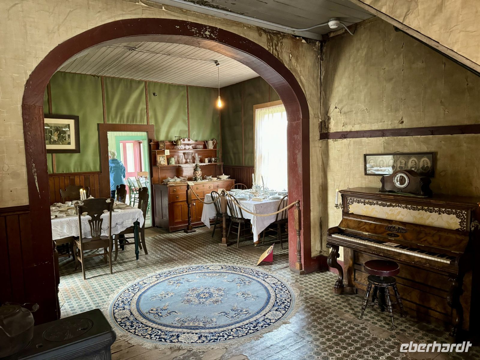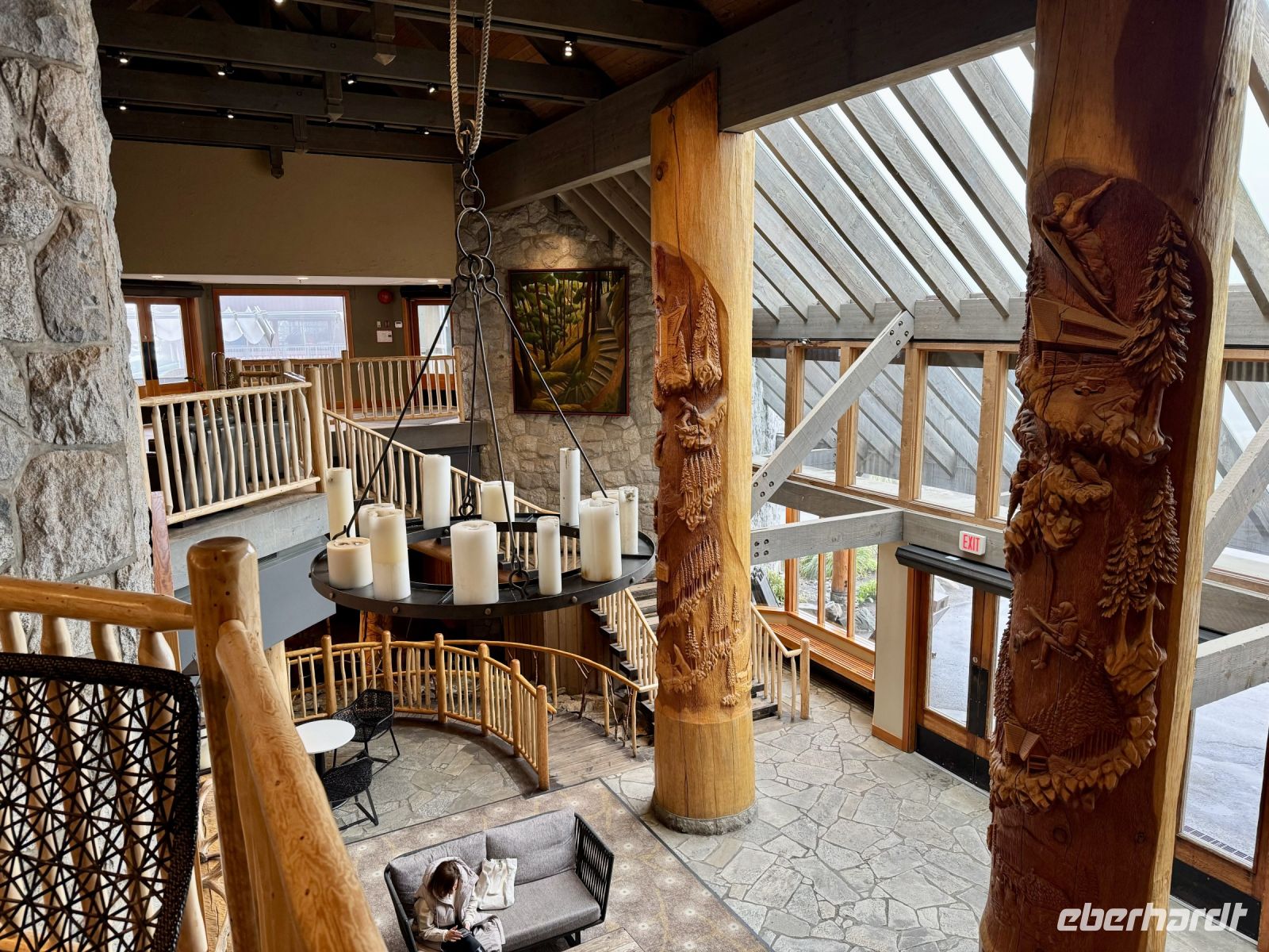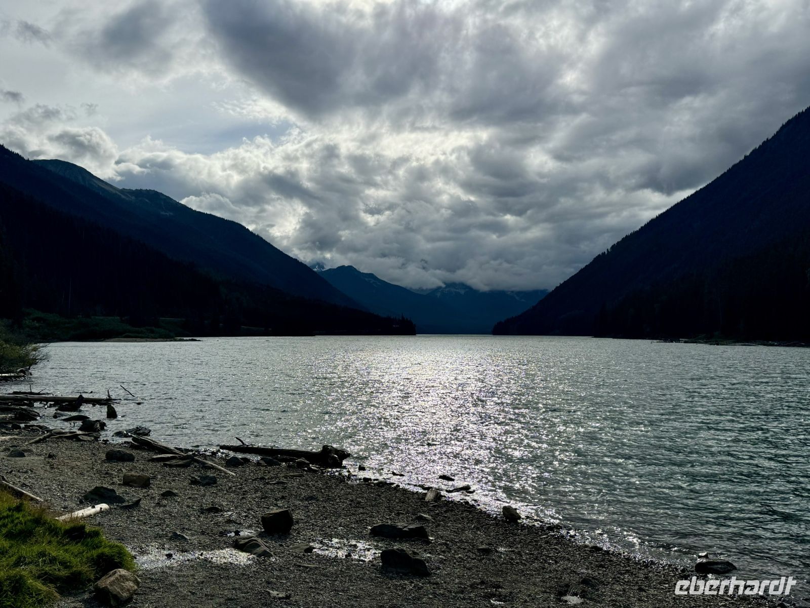 Der Tag beginnt im Gateway Grill mit dem wahrscheinlich besten Frühstücksbuffet auf der ganzen Reise. Meine Gäste sind jedenfalls begeistert. Thematisch bleiben wir uns weiterhin treu und fahren zur nächsten Ranch, nämlich der Hat Creek Ranch. Wir halten nochmals in Kamloops, unter der 88 Jahre alten Holzbrücke „Red Bridge“ im Pioneer Park, die leider wenige Tage später vollständig abbrennt — Brandstiftung. Etwas später erfolgt ein Fotostopp am Kamloops Lake, einem tollen Fotomotiv. Auf der anderen Seeseite fährt gerade einer der endlos langen Güterzüge entlang. Das Schild, das vor Klapperschlangen in der Gegend warnt, nehmen wir zum Glück erst so richtig wahr, als wir wieder in den Bus einsteigen. Bis wir bei der Hat Creek Ranch eintreffen, hat es sich leider etwas zugezogen. Die Landschaft bleibt weiterhin karg. Umso farbenfroher sind die historischen Kostüme der beiden Gästeführerinnen, die uns freudig begrüßen. Zuerst werden wir durch die Räume des alten Hotels geführt — eine wilde Mischung aus Saloon, Spielhölle, feinem Restaurant mit teurem Porzellan und Zahnarztpraxis. Ich kann mich nicht entscheiden, ob ich gern mal per Zeitmaschine in diese Vergangenheit zurückreisen würde oder lieber nicht. Die Sitten und Gebräuche der hiesigen First Nations stehen bei einem Besuch auf der Hat Creek Ranch auch immer mit auf dem Programm und bilden einen interessanten Kontrast. Wir bekommen zum Abschluss noch ein typisch kanadisches Mittagessen — Burger, Salat, Cookie — bevor wir unsere Fahrt in Richtung Fraser Canyon fortsetzen. Mit einem Fotostopp oberhalb des Flusses endet unser Ausflug in die Goldgräberzeit. Es folgt eine schnelle technische Pause in Lillooet, dann geht es auf der kurvenreichen Duffey Lake Road quer durch das Küstengebirge nach Whistler. Das Landschaftsbild hat sich wieder zu grünen Wäldern gewandelt, allerdings mit einigen Regenschauern als Kehrseite. Beim Fotostopp am Duffey Lake selbst und später bei unserem Abendspaziergang durch den Olympiaort Whistler lässt sich die Sonne jedoch wieder blicken, ja sorgt sogar für einen sehr schönen Abendhimmel mit intensiven Rot- und Goldtönen. Obgleich das Abendessen heute in Eigenregie erfolgt, winkt sich später fast die Hälfte der Gruppe in der Old Spaghetti Factory zu.