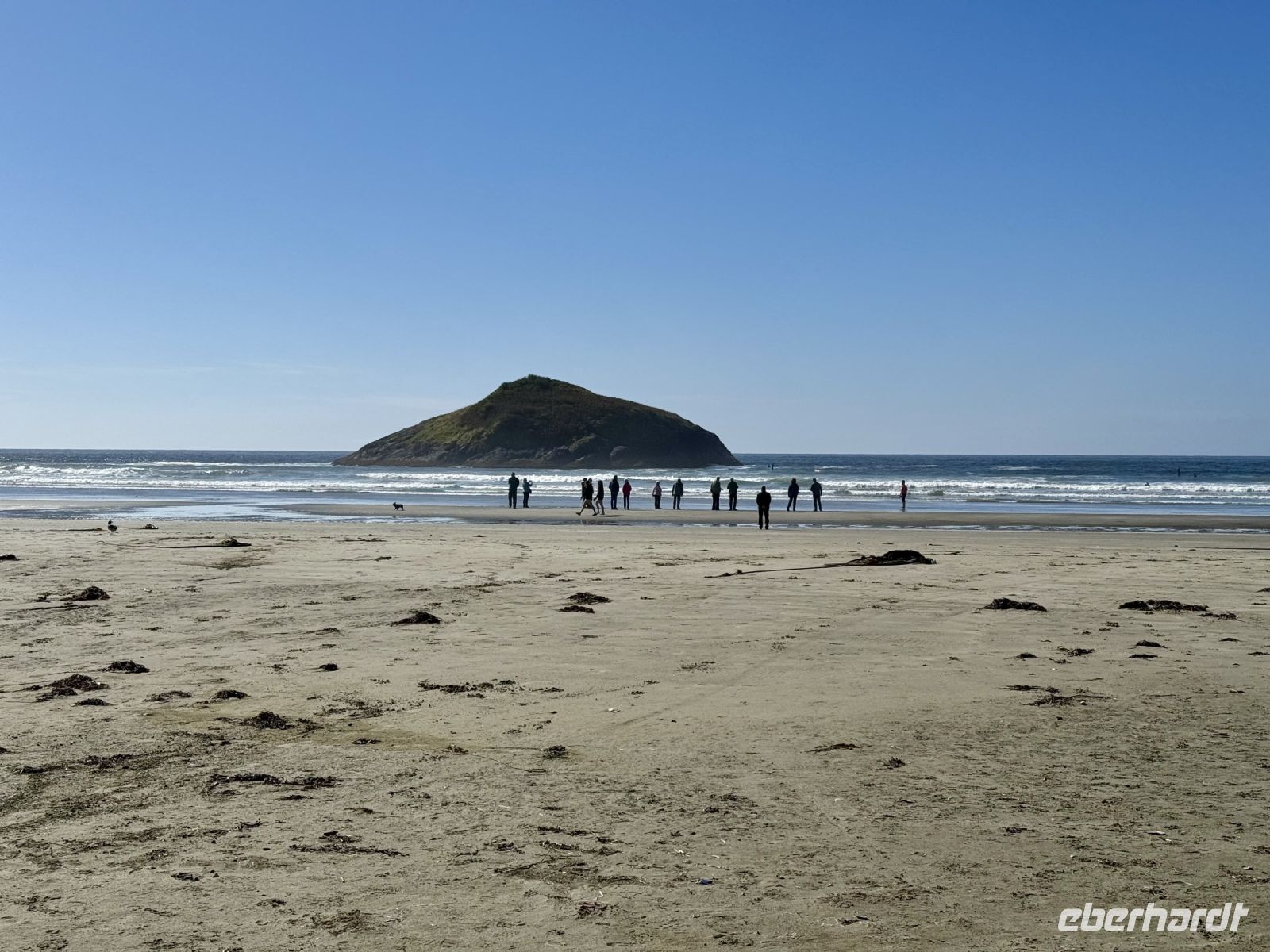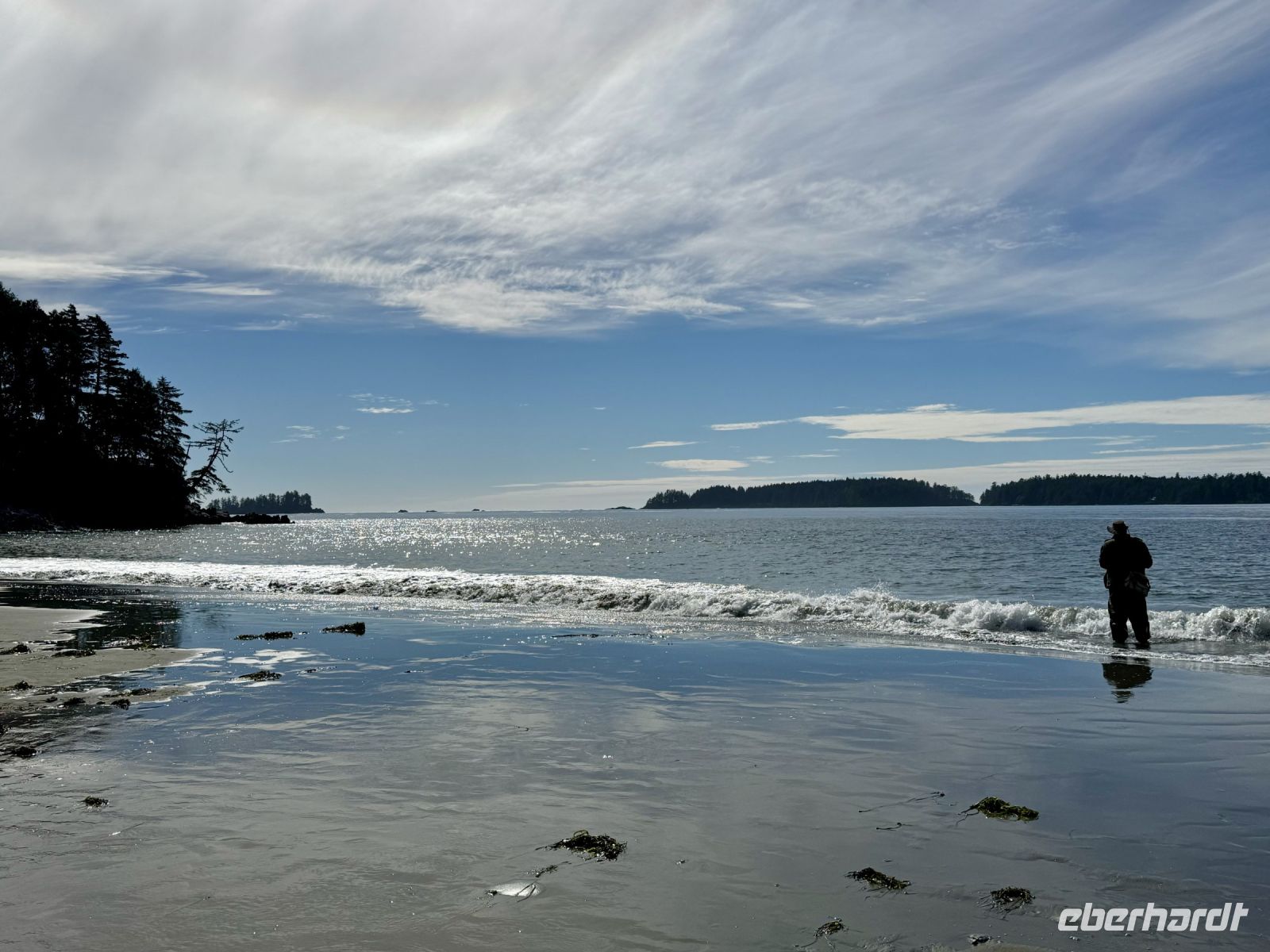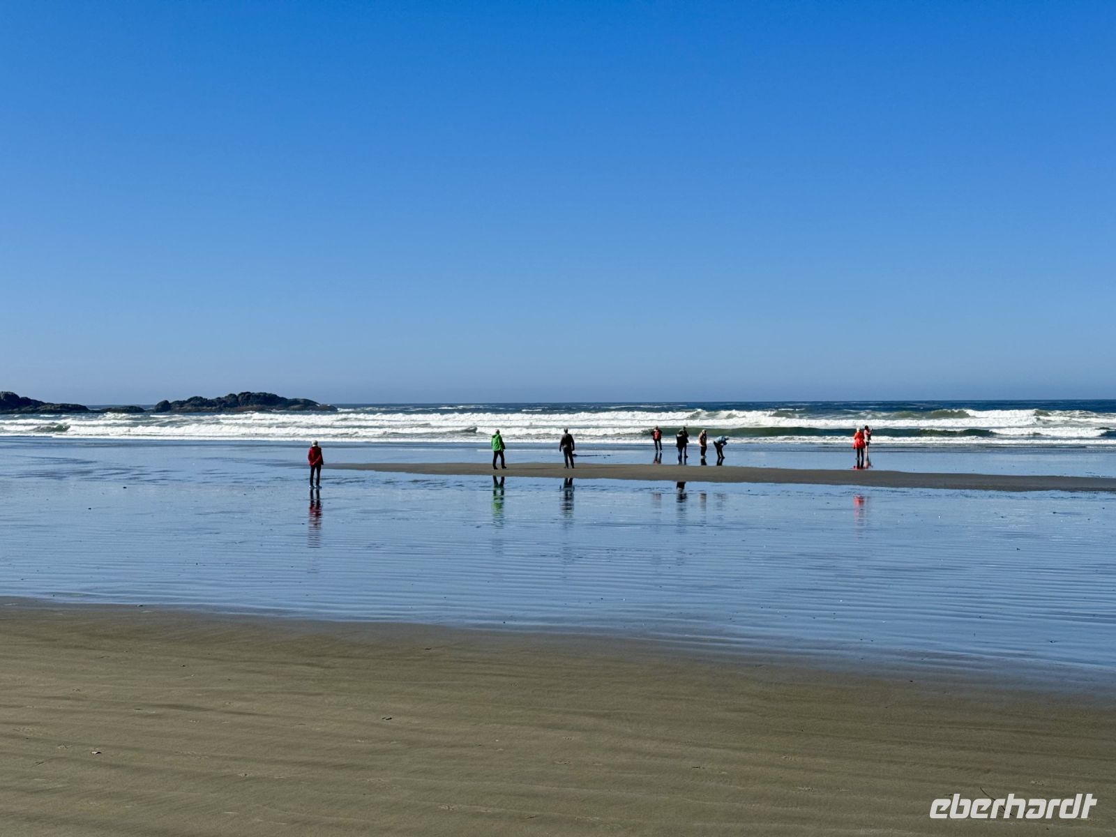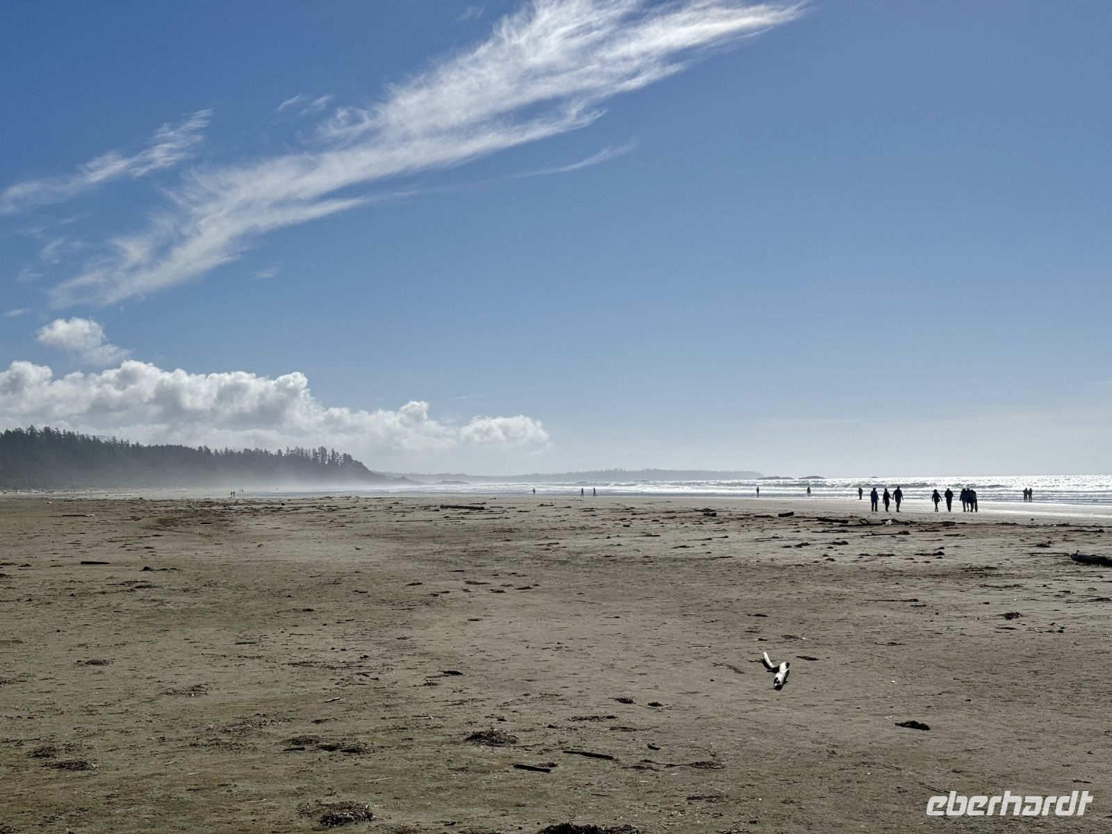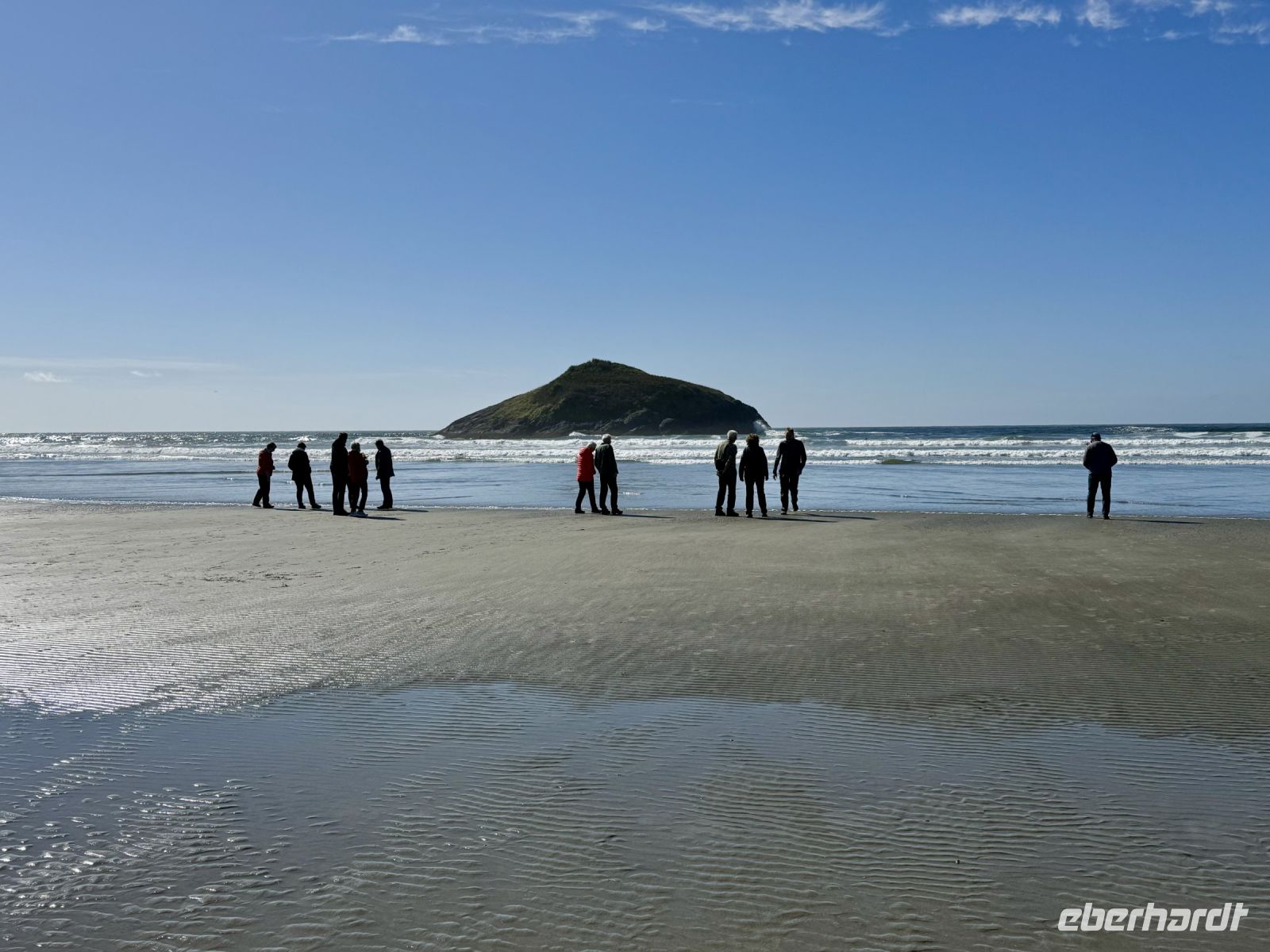 Der heutige Tag an der Westküste von Vancouver Island ist zweigeteilt: Am Vormittag erkunden wir gemeinsam den Pacific-Rim-Nationalpark, am Nachmittag haben meine Gäste wieder einmal Freizeit. Ein paar mutige Gesellen haben sich bereits für eine Walbeobachtung angemeldet; für die anderen werde ich einen zusätzlichen Spaziergang zum Tonquin Beach anbieten. Natürlich sind all diese Aktivitäten wetterabhängig, aber da brauche ich mir mit meiner Sonnenschein-Reisegruppe keine Sorgen zu machen. Also, Aufbruch zum Spaziergang durch den Regenwald! Auf Bretterpfaden laufen wir durch das dichte Unterholz, bestaunen das viele Grün in Form von Bäumen, Sträuchern, Farnen, Flechten und Moosen um uns herum und können sogar beobachten, wie der Morgentau im brennenden Schein der Sonne von den Zweigen regelrecht verdampft. Verrückt! Neben dem gemäßigten Küstenregenwald ist der Long Beach mit seinem kilometerlangen Sandstrand die zweite Attraktion des Nationalparks. Wir besuchen ihn einmal fast am südlichen und später fast am nördlichen Ende. Himmel, Ozean, Wald und Sandstrand fließen hier nahtlos ineinander über. Wir paar Menschen (es sind außer uns noch einige Individualtouristen, Camper und Surfer da) verlieren uns regelrecht auf dem breiten, kilometerlangen Küstenabschnitt. Gerade an einem so herrlichen Tag wie heute fühlt man sich an diesem magischen Ort völlig eins mit der Natur. Alle Ängste und Sorgen haben wir für den Moment am Highway zurückgelassen. Nach der Mittagspause in Tofino nehmen 13 Gäste Aufstellung am Hafen, um sich von mir zum Whale Watching zu verabschieden. Mit einem kleinen Schiff wollen sie einmal um die vorgelagerte Vargas Island fahren und dabei nach den großen Meeressäugern Ausschau halten. In der Hoffnung auf ein Wiedersehen verabschiede ich mich und laufe zurück zum Postamt von Tofino. Es ist der Treffpunkt für unsere kleine zusätzliche Wanderung durch den Regenwald zum Tonquin Beach. Er liegt am Ortsrand von Tofino unterhalb der Klippen. Vom Strand aus können wir mein Traumhaus sehen — Terrasse mit Aussicht auf das Meer, eigene Treppe hinunter zum Wasser. Nur noch 500 Reisen, dann habe ich das Geld vielleicht zusammen, oder so. Wir gehen sogar noch ein Stück weiter durch den Wald zu mehreren tollen Aussichtspunkten und drehen dann am Middle Beach um. Zurück in Tofino haben wir uns nach so viel Bewegung ein Eis mehr als verdient. Beim Abendessen im Shelter Restaurant schwärmen wir uns schließlich gegenseitig von unseren Erlebnissen vor. Während der Walbeobachtung haben meine Gäste nicht nur Grauwale, sondern auch Robben und putzige Seeotter gesehen — und das macht mich nun schon ein bisschen neidisch.