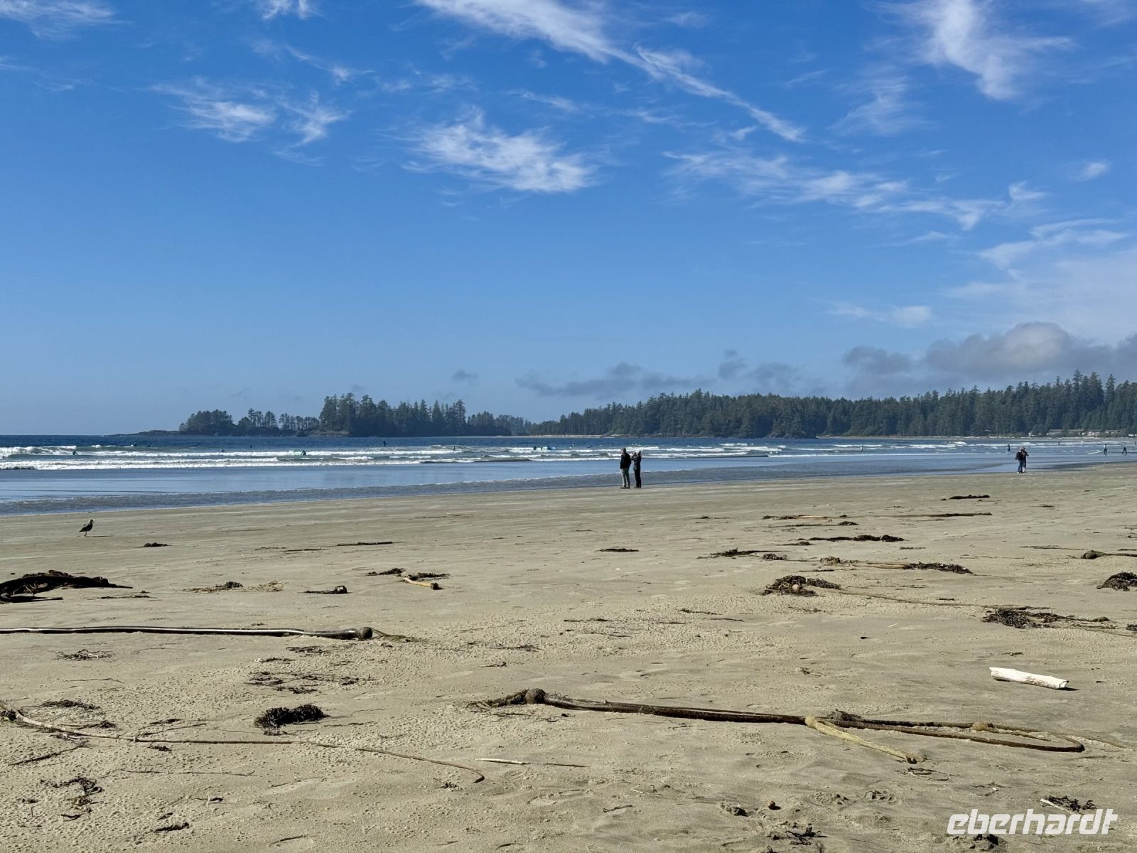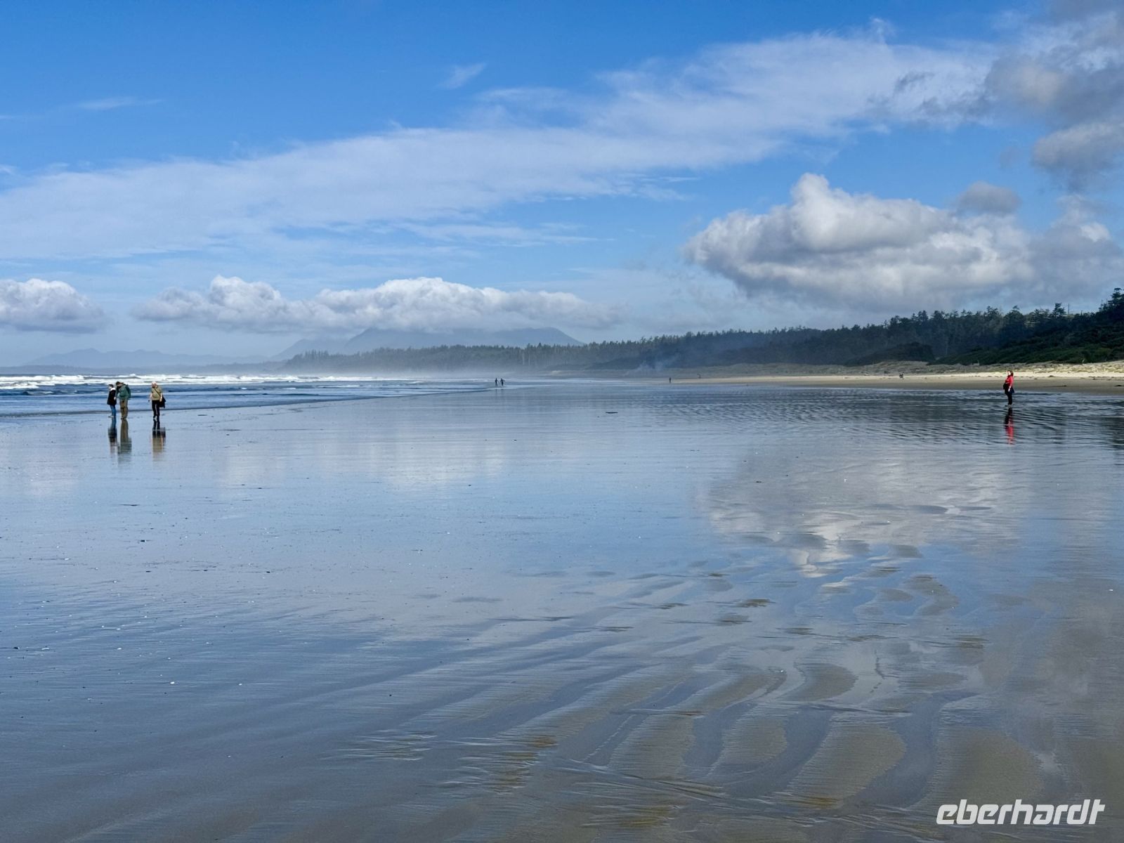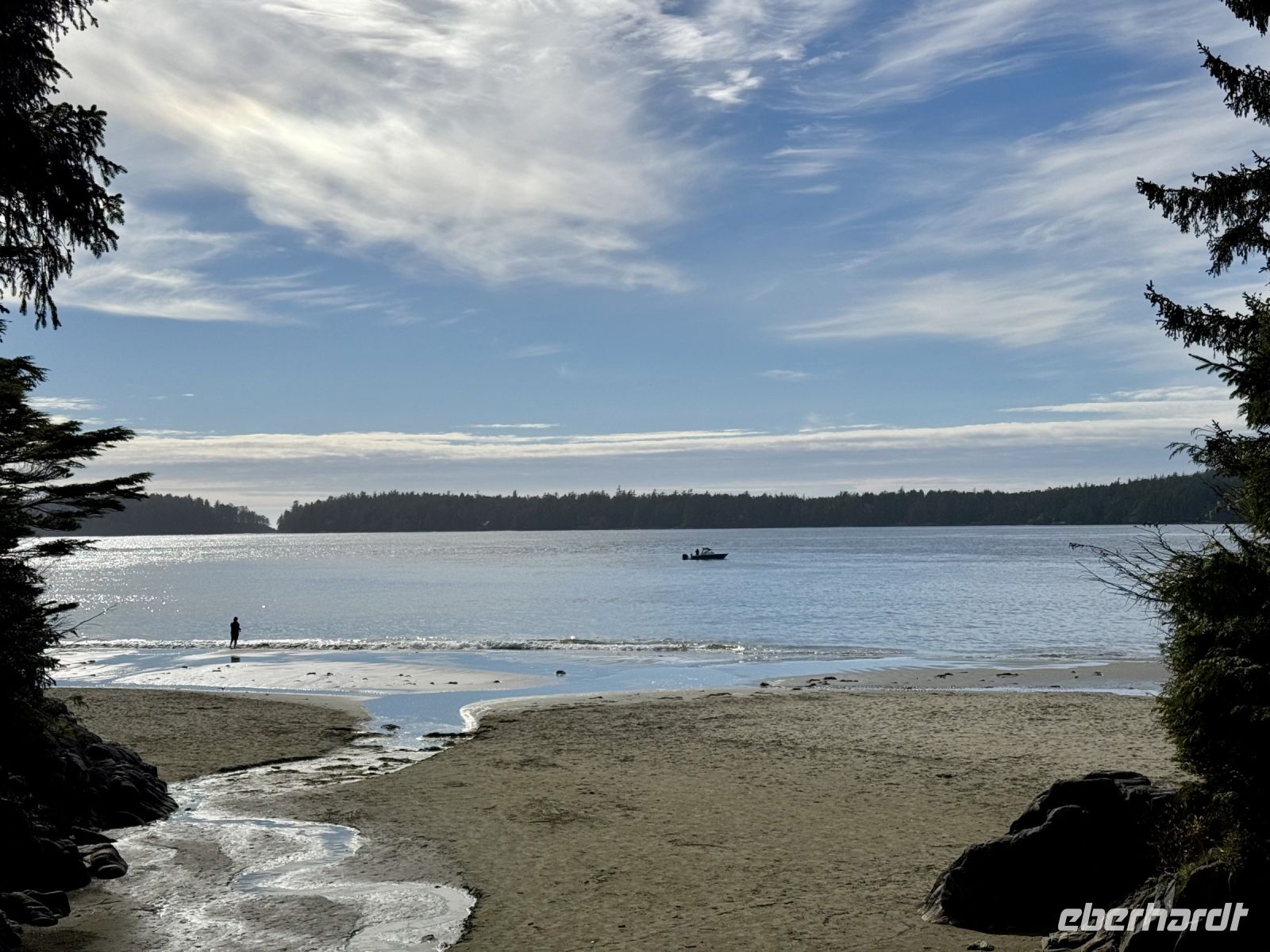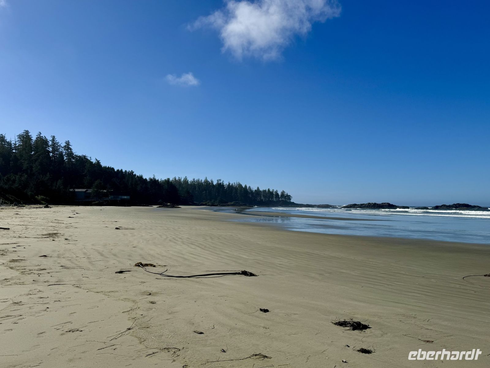 Der heutige Tag an der Westküste von Vancouver Island ist zweigeteilt: Am Vormittag erkunden wir gemeinsam den Pacific-Rim-Nationalpark, am Nachmittag haben meine Gäste wieder einmal Freizeit. Ein paar mutige Gesellen haben sich bereits für eine Walbeobachtung angemeldet; für die anderen werde ich einen zusätzlichen Spaziergang zum Tonquin Beach anbieten. Natürlich sind all diese Aktivitäten wetterabhängig, aber da brauche ich mir mit meiner Sonnenschein-Reisegruppe keine Sorgen zu machen. Also, Aufbruch zum Spaziergang durch den Regenwald! Auf Bretterpfaden laufen wir durch das dichte Unterholz, bestaunen das viele Grün in Form von Bäumen, Sträuchern, Farnen, Flechten und Moosen um uns herum und können sogar beobachten, wie der Morgentau im brennenden Schein der Sonne von den Zweigen regelrecht verdampft. Verrückt! Neben dem gemäßigten Küstenregenwald ist der Long Beach mit seinem kilometerlangen Sandstrand die zweite Attraktion des Nationalparks. Wir besuchen ihn einmal fast am südlichen und später fast am nördlichen Ende. Himmel, Ozean, Wald und Sandstrand fließen hier nahtlos ineinander über. Wir paar Menschen (es sind außer uns noch einige Individualtouristen, Camper und Surfer da) verlieren uns regelrecht auf dem breiten, kilometerlangen Küstenabschnitt. Gerade an einem so herrlichen Tag wie heute fühlt man sich an diesem magischen Ort völlig eins mit der Natur. Alle Ängste und Sorgen haben wir für den Moment am Highway zurückgelassen. Nach der Mittagspause in Tofino nehmen 13 Gäste Aufstellung am Hafen, um sich von mir zum Whale Watching zu verabschieden. Mit einem kleinen Schiff wollen sie einmal um die vorgelagerte Vargas Island fahren und dabei nach den großen Meeressäugern Ausschau halten. In der Hoffnung auf ein Wiedersehen verabschiede ich mich und laufe zurück zum Postamt von Tofino. Es ist der Treffpunkt für unsere kleine zusätzliche Wanderung durch den Regenwald zum Tonquin Beach. Er liegt am Ortsrand von Tofino unterhalb der Klippen. Vom Strand aus können wir mein Traumhaus sehen — Terrasse mit Aussicht auf das Meer, eigene Treppe hinunter zum Wasser. Nur noch 500 Reisen, dann habe ich das Geld vielleicht zusammen, oder so. Wir gehen sogar noch ein Stück weiter durch den Wald zu mehreren tollen Aussichtspunkten und drehen dann am Middle Beach um. Zurück in Tofino haben wir uns nach so viel Bewegung ein Eis mehr als verdient. Beim Abendessen im Shelter Restaurant schwärmen wir uns schließlich gegenseitig von unseren Erlebnissen vor. Während der Walbeobachtung haben meine Gäste nicht nur Grauwale, sondern auch Robben und putzige Seeotter gesehen — und das macht mich nun schon ein bisschen neidisch.