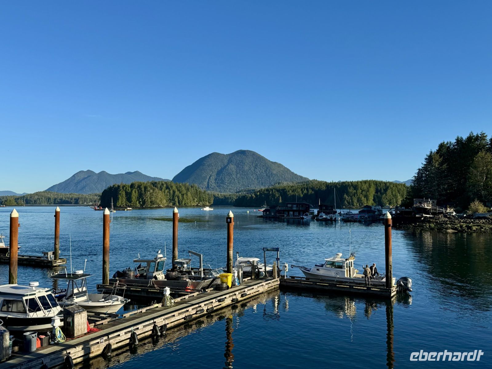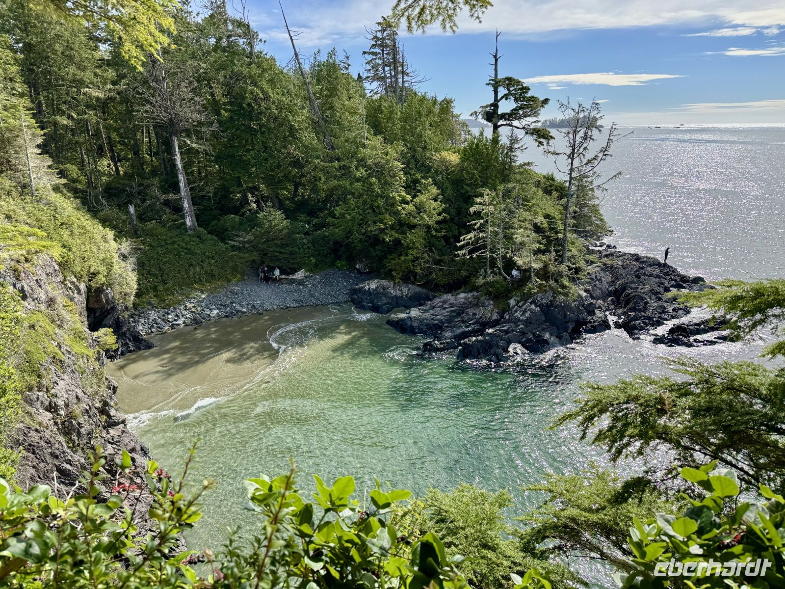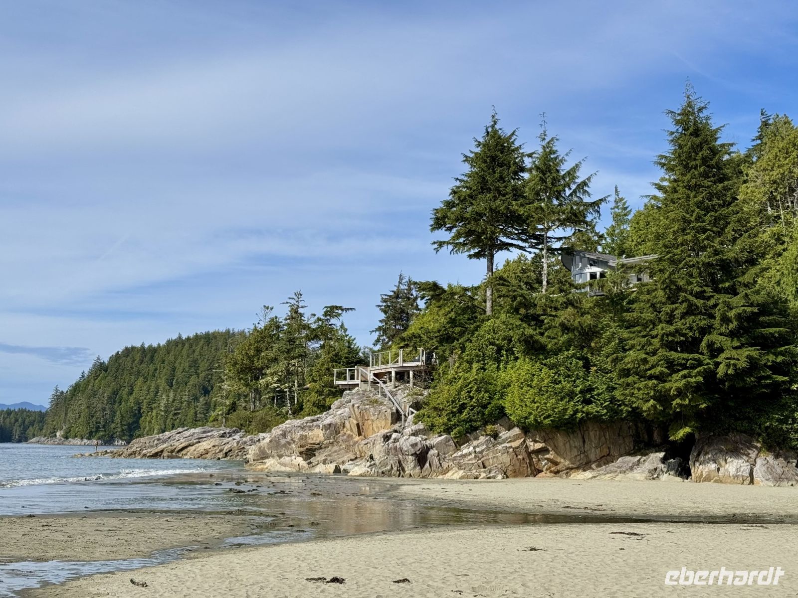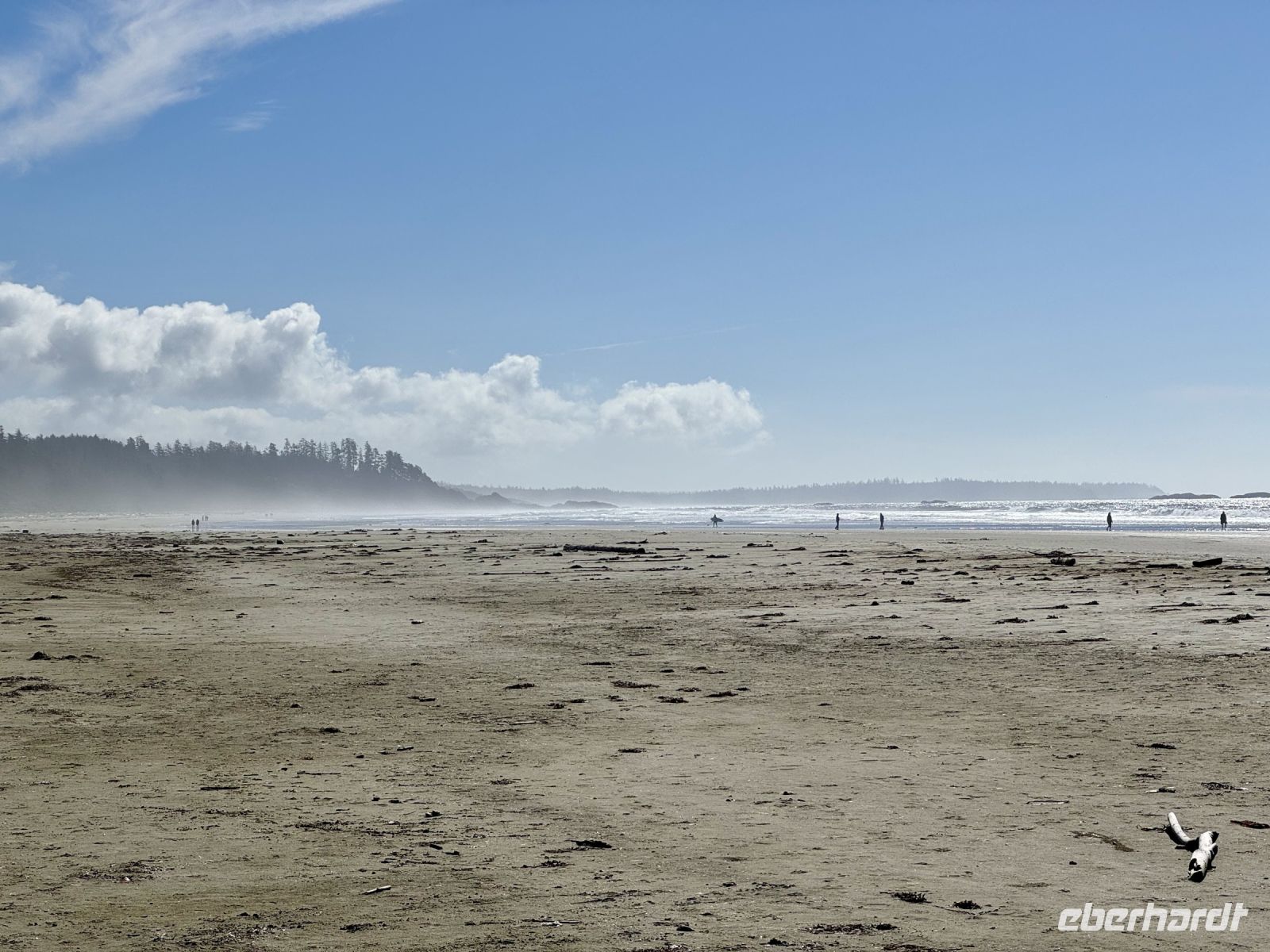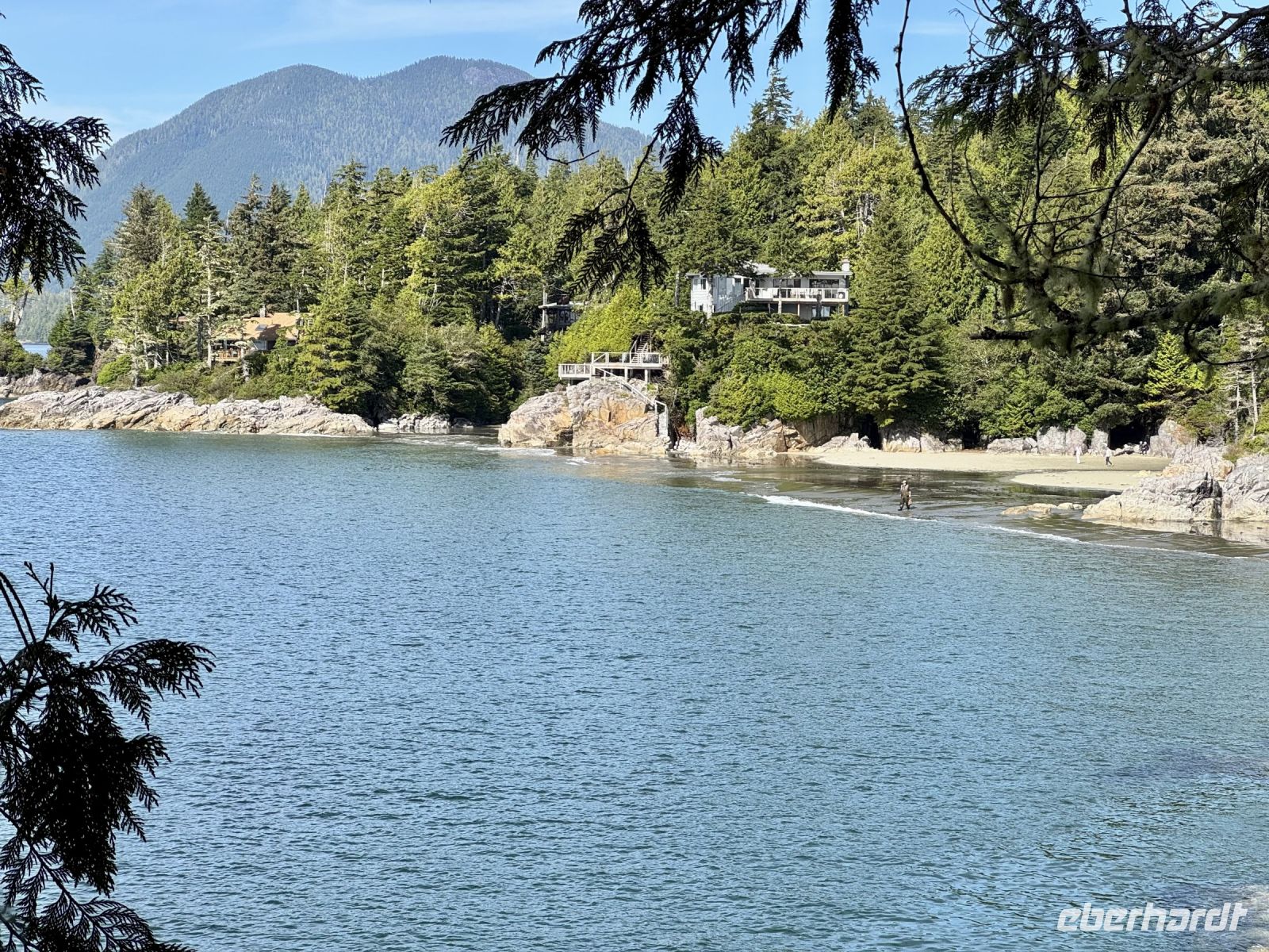 Der heutige Tag an der Westküste von Vancouver Island ist zweigeteilt: Am Vormittag erkunden wir gemeinsam den Pacific-Rim-Nationalpark, am Nachmittag haben meine Gäste wieder einmal Freizeit. Ein paar mutige Gesellen haben sich bereits für eine Walbeobachtung angemeldet; für die anderen werde ich einen zusätzlichen Spaziergang zum Tonquin Beach anbieten. Natürlich sind all diese Aktivitäten wetterabhängig, aber da brauche ich mir mit meiner Sonnenschein-Reisegruppe keine Sorgen zu machen. Also, Aufbruch zum Spaziergang durch den Regenwald! Auf Bretterpfaden laufen wir durch das dichte Unterholz, bestaunen das viele Grün in Form von Bäumen, Sträuchern, Farnen, Flechten und Moosen um uns herum und können sogar beobachten, wie der Morgentau im brennenden Schein der Sonne von den Zweigen regelrecht verdampft. Verrückt! Neben dem gemäßigten Küstenregenwald ist der Long Beach mit seinem kilometerlangen Sandstrand die zweite Attraktion des Nationalparks. Wir besuchen ihn einmal fast am südlichen und später fast am nördlichen Ende. Himmel, Ozean, Wald und Sandstrand fließen hier nahtlos ineinander über. Wir paar Menschen (es sind außer uns noch einige Individualtouristen, Camper und Surfer da) verlieren uns regelrecht auf dem breiten, kilometerlangen Küstenabschnitt. Gerade an einem so herrlichen Tag wie heute fühlt man sich an diesem magischen Ort völlig eins mit der Natur. Alle Ängste und Sorgen haben wir für den Moment am Highway zurückgelassen. Nach der Mittagspause in Tofino nehmen 13 Gäste Aufstellung am Hafen, um sich von mir zum Whale Watching zu verabschieden. Mit einem kleinen Schiff wollen sie einmal um die vorgelagerte Vargas Island fahren und dabei nach den großen Meeressäugern Ausschau halten. In der Hoffnung auf ein Wiedersehen verabschiede ich mich und laufe zurück zum Postamt von Tofino. Es ist der Treffpunkt für unsere kleine zusätzliche Wanderung durch den Regenwald zum Tonquin Beach. Er liegt am Ortsrand von Tofino unterhalb der Klippen. Vom Strand aus können wir mein Traumhaus sehen — Terrasse mit Aussicht auf das Meer, eigene Treppe hinunter zum Wasser. Nur noch 500 Reisen, dann habe ich das Geld vielleicht zusammen, oder so. Wir gehen sogar noch ein Stück weiter durch den Wald zu mehreren tollen Aussichtspunkten und drehen dann am Middle Beach um. Zurück in Tofino haben wir uns nach so viel Bewegung ein Eis mehr als verdient. Beim Abendessen im Shelter Restaurant schwärmen wir uns schließlich gegenseitig von unseren Erlebnissen vor. Während der Walbeobachtung haben meine Gäste nicht nur Grauwale, sondern auch Robben und putzige Seeotter gesehen — und das macht mich nun schon ein bisschen neidisch.