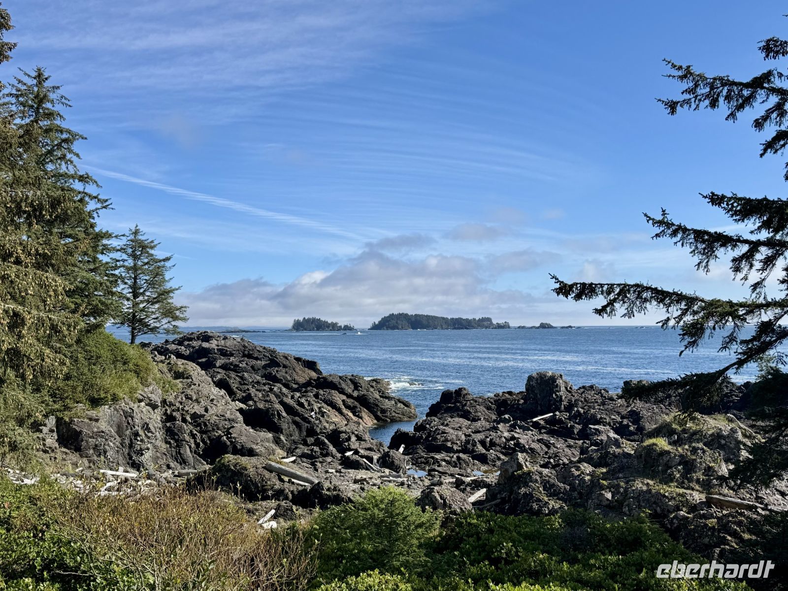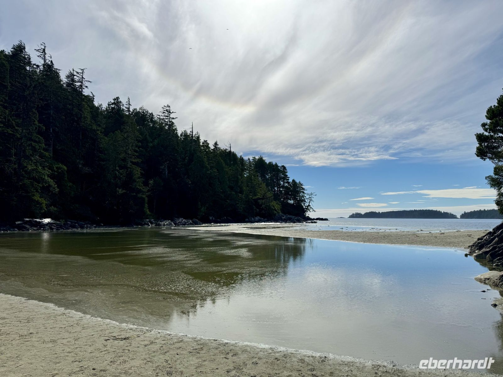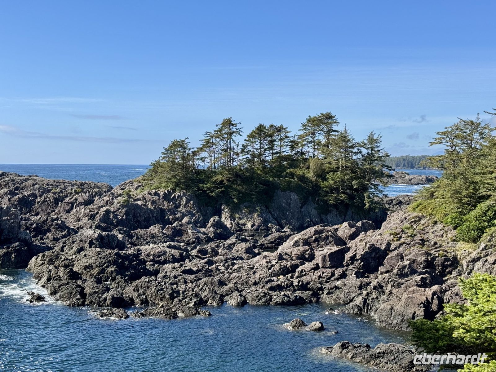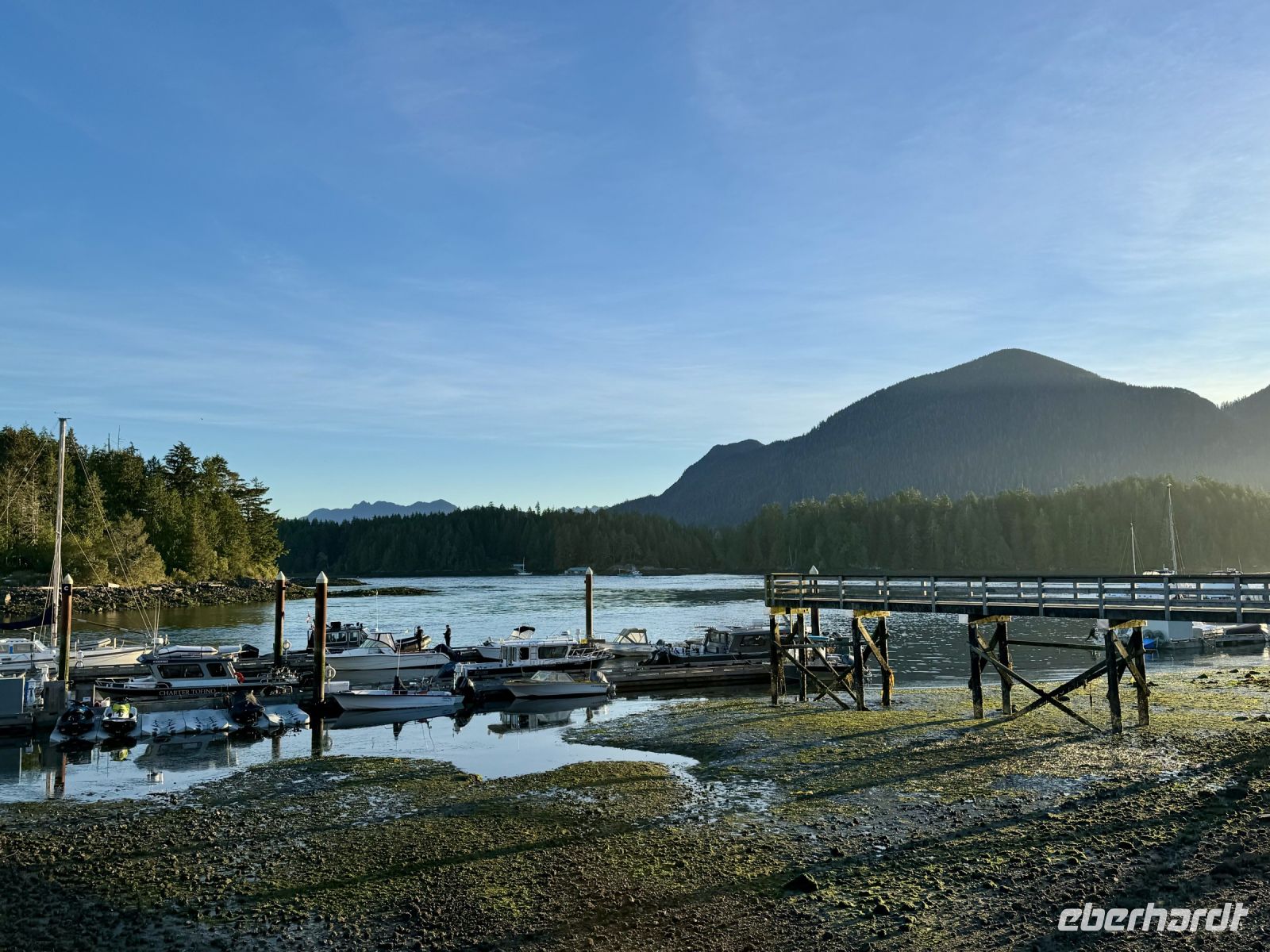 Der heutige Tag an der Westküste von Vancouver Island ist zweigeteilt: Am Vormittag erkunden wir gemeinsam den Pacific-Rim-Nationalpark, am Nachmittag haben meine Gäste wieder einmal Freizeit. Ein paar mutige Gesellen haben sich bereits für eine Walbeobachtung angemeldet; für die anderen werde ich einen zusätzlichen Spaziergang zum Tonquin Beach anbieten. Natürlich sind all diese Aktivitäten wetterabhängig, aber da brauche ich mir mit meiner Sonnenschein-Reisegruppe keine Sorgen zu machen. Also, Aufbruch zum Spaziergang durch den Regenwald! Auf Bretterpfaden laufen wir durch das dichte Unterholz, bestaunen das viele Grün in Form von Bäumen, Sträuchern, Farnen, Flechten und Moosen um uns herum und können sogar beobachten, wie der Morgentau im brennenden Schein der Sonne von den Zweigen regelrecht verdampft. Verrückt! Neben dem gemäßigten Küstenregenwald ist der Long Beach mit seinem kilometerlangen Sandstrand die zweite Attraktion des Nationalparks. Wir besuchen ihn einmal fast am südlichen und später fast am nördlichen Ende. Himmel, Ozean, Wald und Sandstrand fließen hier nahtlos ineinander über. Wir paar Menschen (es sind außer uns noch einige Individualtouristen, Camper und Surfer da) verlieren uns regelrecht auf dem breiten, kilometerlangen Küstenabschnitt. Gerade an einem so herrlichen Tag wie heute fühlt man sich an diesem magischen Ort völlig eins mit der Natur. Alle Ängste und Sorgen haben wir für den Moment am Highway zurückgelassen. Nach der Mittagspause in Tofino nehmen 13 Gäste Aufstellung am Hafen, um sich von mir zum Whale Watching zu verabschieden. Mit einem kleinen Schiff wollen sie einmal um die vorgelagerte Vargas Island fahren und dabei nach den großen Meeressäugern Ausschau halten. In der Hoffnung auf ein Wiedersehen verabschiede ich mich und laufe zurück zum Postamt von Tofino. Es ist der Treffpunkt für unsere kleine zusätzliche Wanderung durch den Regenwald zum Tonquin Beach. Er liegt am Ortsrand von Tofino unterhalb der Klippen. Vom Strand aus können wir mein Traumhaus sehen — Terrasse mit Aussicht auf das Meer, eigene Treppe hinunter zum Wasser. Nur noch 500 Reisen, dann habe ich das Geld vielleicht zusammen, oder so. Wir gehen sogar noch ein Stück weiter durch den Wald zu mehreren tollen Aussichtspunkten und drehen dann am Middle Beach um. Zurück in Tofino haben wir uns nach so viel Bewegung ein Eis mehr als verdient. Beim Abendessen im Shelter Restaurant schwärmen wir uns schließlich gegenseitig von unseren Erlebnissen vor. Während der Walbeobachtung haben meine Gäste nicht nur Grauwale, sondern auch Robben und putzige Seeotter gesehen — und das macht mich nun schon ein bisschen neidisch.